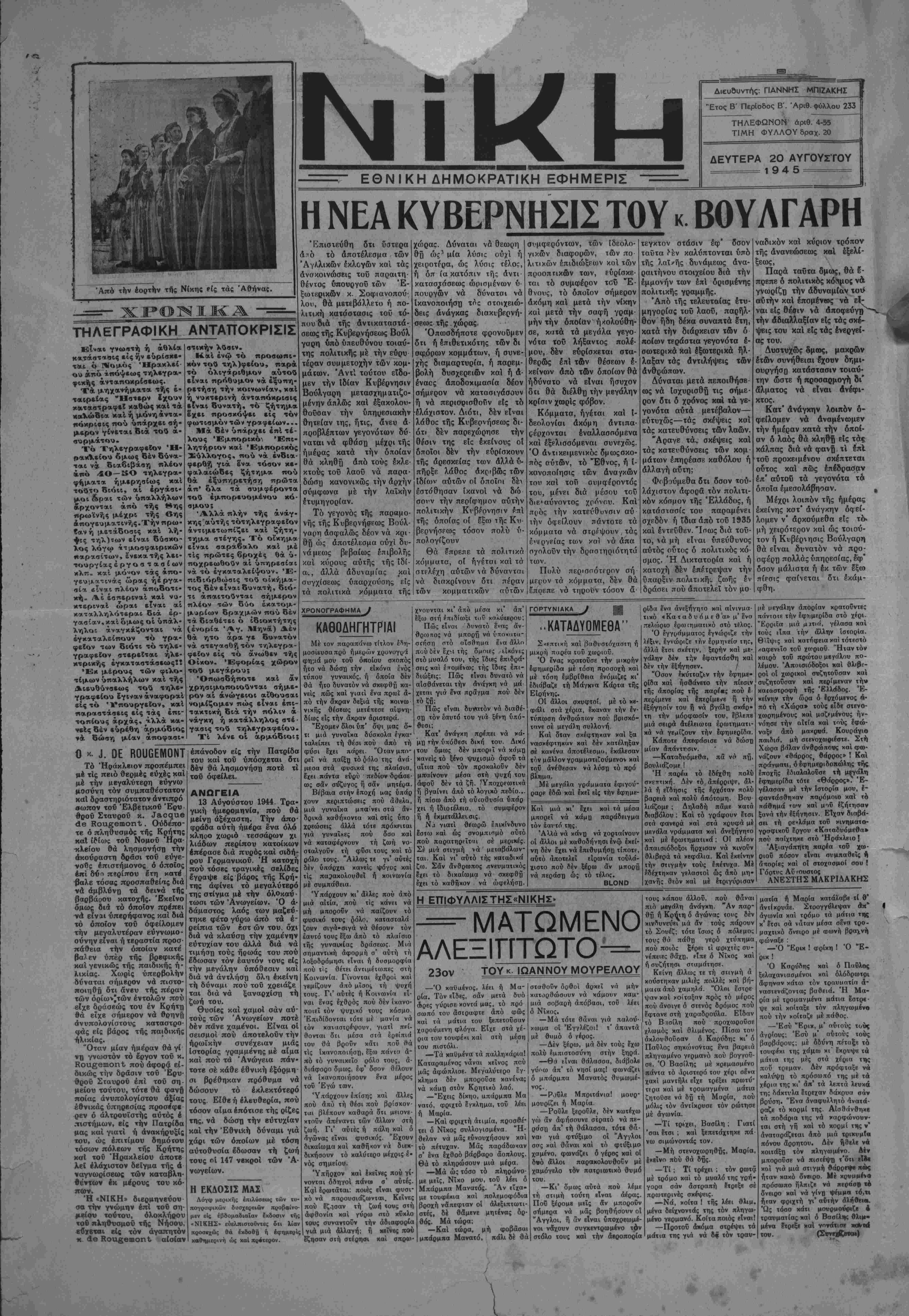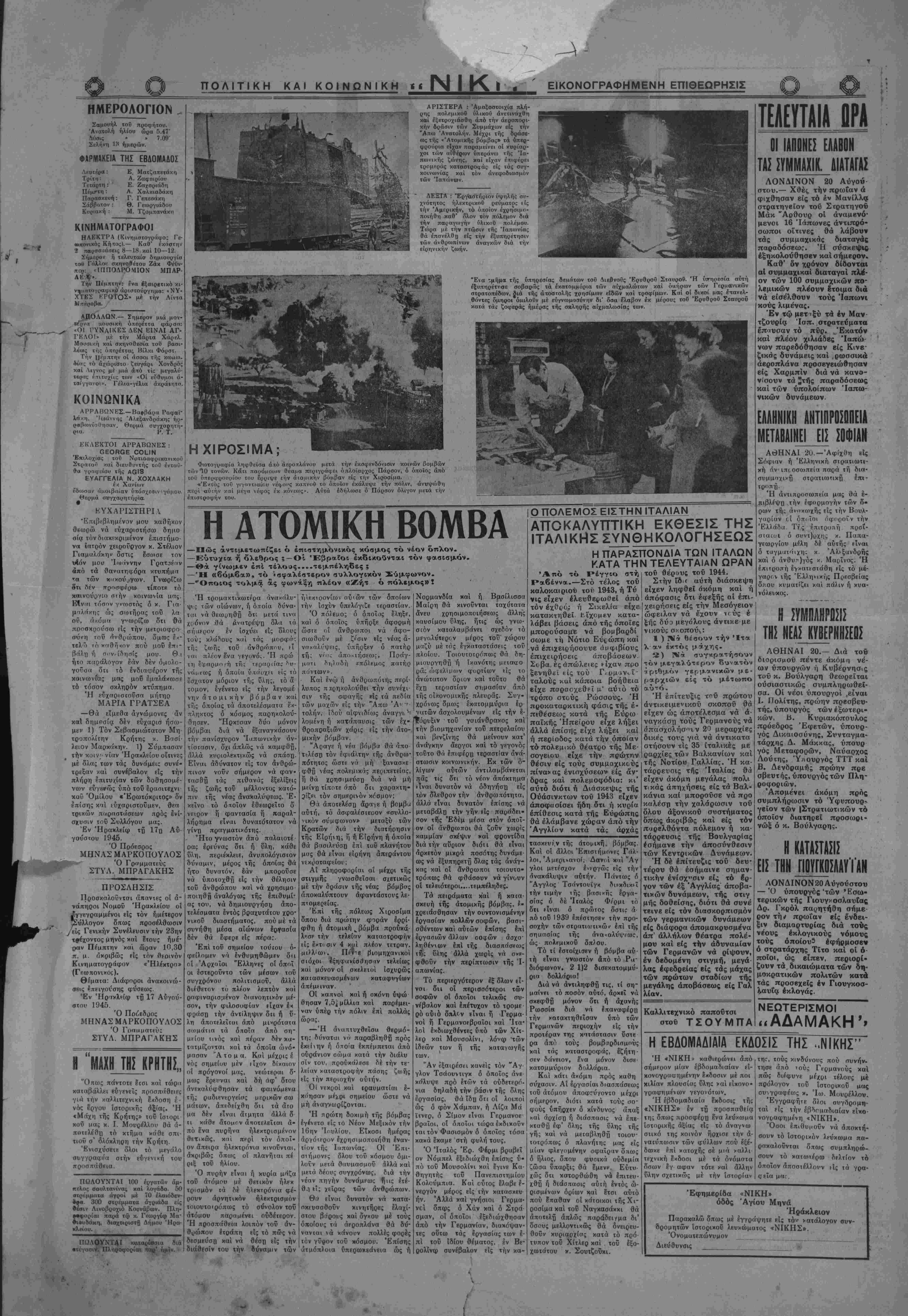 γαρίαν τί όπ< ΐοι Πφοροϊν την Έλλάδα Τίς έπιτρυπή προΐ- σΐαιοι δ συντ)οχης κ. Παπα¬ γεωργίου μέλη δέ αυτής είναι δ ταγματάιχη; κ Άλεξανδρής καί δ άνθυι)γός χ. Μαρΐνος. Ή ΕΛΐτροπή εγχατεστάθη είς τό μέ- γαριν τής Έλληνικής Πρεσβείας δηου κυματίζει καί πάλιν ή χυα- νόλευκος. Η ΣΥΜΠΑΝΡΟΣΙΣ ΤΗΣ ΝΕ1Σ ΚΥΟΕΡΝΗΣΕ1Σ ΑΘΗΝΑΙ 20.- Διά τον διορισμοΰ πέντε άκόμη νέ- ων ύπουργών ή Κυβέρνησις τοΰ κ. Βούλγαρη θεωρεΐται ούσιαστικώς συμπληρωϋεΐ· σα. Οί νέοι ΰπουργοί ,εϊναι Ι. Πολίτης, πρώην πρεσβευ- τής, ύπουργός των εξωτερι¬ κών, Β. Κυριακόπουλος πρόεδρος 'Εφετών, ύπουρ¬ γός Δικαιοσύνης, Σννταγμα- τάρχης Δ. Μάκκας, υπουρ γος Μεταφορών, Ναύαρχος Λούτης, Ύ«ουρνός ΤΤΤ καί Β. Δενόραμης πρώην πρε σβευτης, ύπουργός των Πλη¬ ροφοριών. Άπομένει άκόμη πρός συμπλήρωσιν τό Ύφυπουρ^ γβΐον των ΐΣτρατιωτικών τό οποίον διατηρεΐ προσωρι- νώξ ό κ. Βούλγαρης. Η ΚΑΤΑΣΤΑΣΙΣ ΕΙΣ ΤΗΝ ΠΟΥΓΚΟΣΑΑΥίΑΝ ΛΟΝΔΙ ΝΟΝ 20 Αΰγοί στου — Ό ύπουργός'τών *Εσω· τερικών τής Γιουγκοσλαυΐας Δρ. Γκρόλ παρητήθη σήμε¬ ρον τί)* πρωΐαν είς ένδει¬ ξιν διαμαρτυρίας διά τούς νέους έκλογικούς νόμους τούς οποίον^ εφήρμοσεν ό στρατάρχης Τΐτο καί οί ό ποΐοι, ώς είπεν, περιορί- ζουν τα. δικαιώματα των δη- μοκρατικών πολιτών κατά τάς προσεχεΐς έν Γιουγκοσ¬ λαυία εκλογάς. ΝΕΩΤΕΡΙΣΜΟΙ .,ΑΔΑΜΑΚΗ Η ΕΒΔΟΜΑΔΙΑΙΑ ΕΚΔΟΣΙΣ ΤΗΣ ..ΝΙΚΗΣ" Ή σήμερον μίαν εβδομαδιαίαν εί- κονογραςρημένην Ικδοσιν μέ ποι χιλίαν πλουσίας ΰλης ναί είχονο- γραφημένων γεγονότων. Ή εβδομαδιαία έχδοσις τής «ΝΙΚΗΣ» έν τή προσπαθεία της όπως προσφέρη έ?να λεύχωμα ίστοριχής άξίας είς τό άναγνω σιιχό της κοινόν ήρχισε την ά- νατνπωσιν των ψύλλων πού εξέ¬ δωκε επί καΐοχής σέ μιά *αλλι τεχνική εκδοσι μέ τα όνόμστα δσων εγ αφαν τότε χαί άλλην ύλην σχετικώς μέ την ίστορία καθιερώνει άπό τηΓ, τούς κινδύνους πού συνήν- τησε άπό τούς Γερμανούς καί πώς διέφυγε μέχρι τέλους μέ πρόλογον τού ίστοριχοΰ μας συνγραφέως χ. "Ιω. Μουρέλλον. Έγγραφήτε όλοι συγδρομη- ταί είς την εβοΓμαδιαίαν είκο- νογραφημένη «ΝΙΚΗ». Όσοι επιθυμοΰν νά άποκτή- σουν τό ίστοριχόν λεύκωμα π«- ρπκαλοΰνται όπως συμπληρώ- σουν τό κατωτέρω οελτίον τό οποίον άποστέλλονν είς τα γοα- ςεϊα μα^ Εφημερίδα «ΝΙΚΗ» όδός Άγίου Μηνά ( Ηράκλειον Παρακαλώ δπως μέ έγγράψητε εί; τάν νατάλογον συν- δρομητών ίστυριχοΰ λβυκώματος «ΝΙΚΗΣ». "Ονοματεπώνυμον Διεύθυνσις _