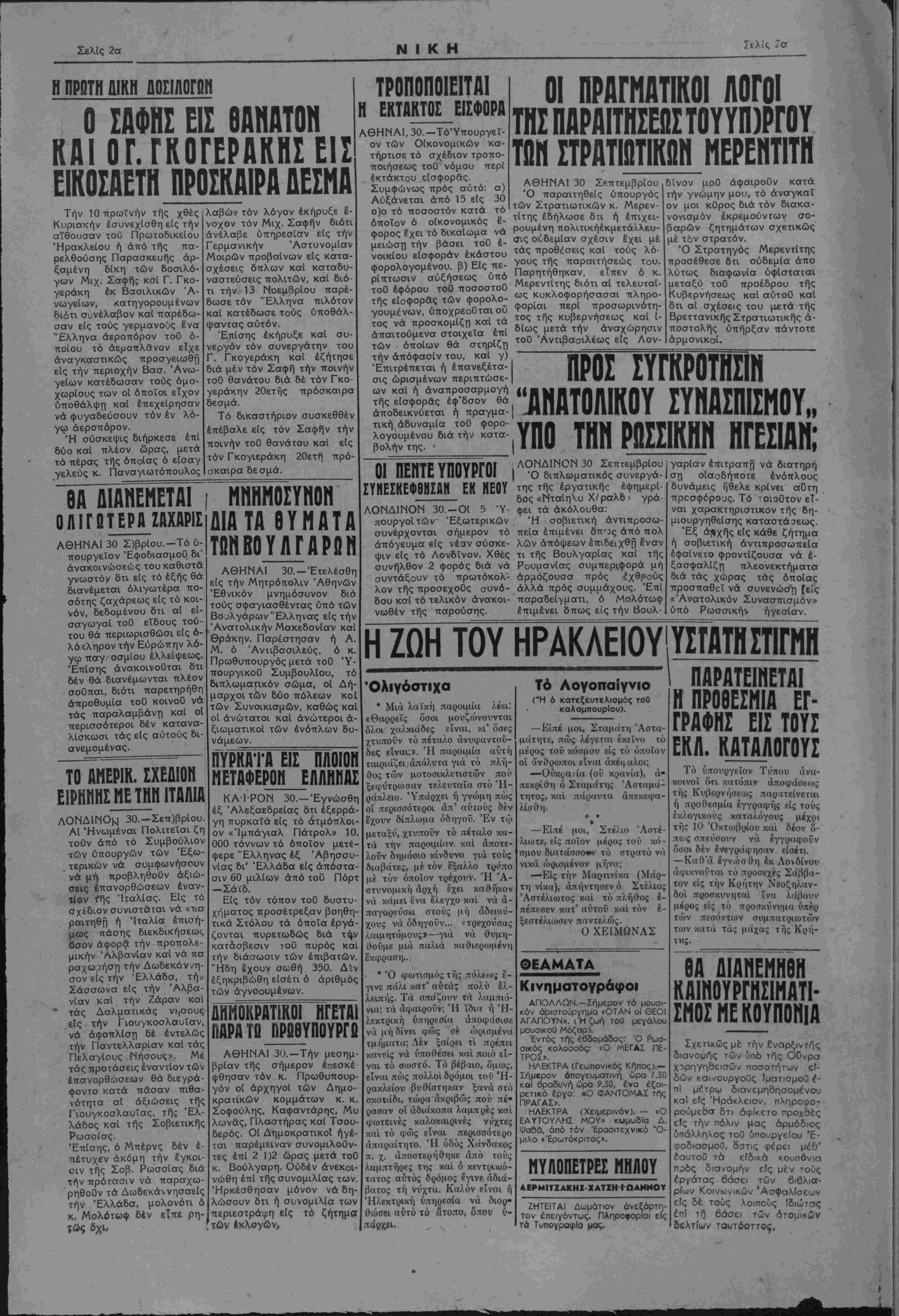 ά<ρικνοΰται τό προσεχές Σάββα¬ τον είς την Κρήτην Νβοζηλαν- δοί προσκυνηταί ίνα λάβουν μέρος είς τό προσκύνυμα υπέρ των πεσόντων συμπατριωτών των κατά τάς μάχας τής Κρή¬ της. ΙαΤΗΙΓ καινουργησιματι- σμοσ μεκουποηια Σχετικώς με την ϊνσρξιντης διανομης των υπό τής ΟΟνρα χορηγησεισών ποσοτήτων εΝ δών καινουργοϋς ίματισμοΰ ε¬ πί μέτρω διανεμηδησομένθυ καΐ είς Ηράκλειον, πληροφο¬ ρούμεθα δτι αφίκετο προχθές είς την πόλιν μας άρμόοιος υπόλληλος τοϋ ύπουργείου Έ- φοδιασμοϋ, δστις φέρει μέ8' έαυτοΰ τα είδικό κουπόνισ πρός διανομήν είς μέν τοΰς εργάτας βάσει των βιβλιατ- ρΐων Κοινωνικών ΆσφαλΙσεων είς δέ τοϋς λοιποϋς ιδιώτας επ! τγ] βάσει των ατομικήν δελτίων ταυτόοττος.