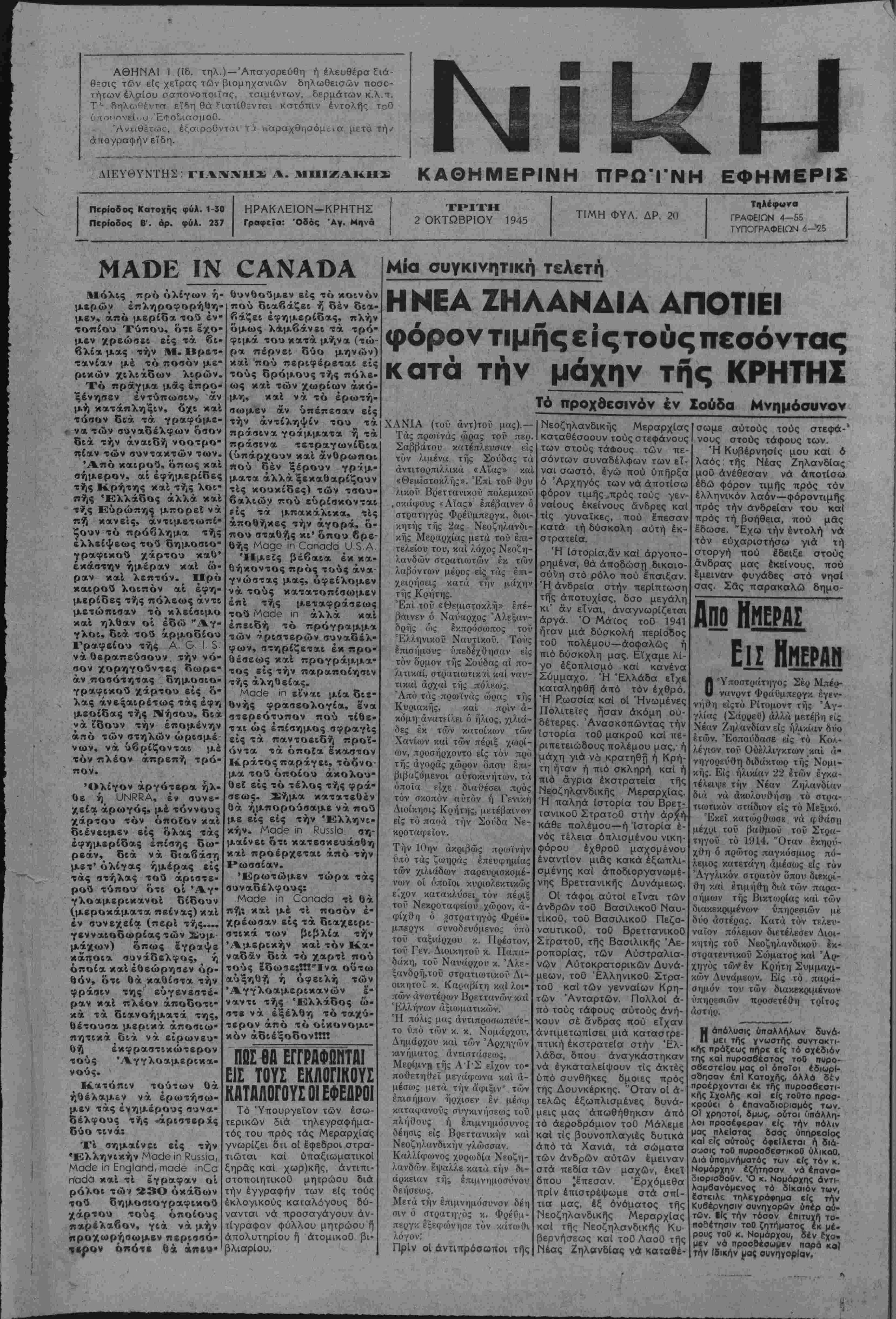 Λ ιοι·ονεΙ<,ο Έτο^ιασμοΟ. Αντιθέτως·, έξαιροΰνται τ'χ ιιαραχθηοόμενα μετά τή./ απογραφήν ειδή. ΔΙΕΥΘΥΝΤΗΣ ΓΙΑΝΝΗΣ Α. ΜΠΙΖΑΚΗΣ ΚΑΘΗΜΕΡΙΝΗ ΠΡΩΊ'ΝΗ ΕΦΗΜΕΡΙΣ Περίοδος Κατοχής φύλ. 1-30 Περίοδος Β'. όρ. φύλ. 237 ΗΡΑΚΛΕΙΟΝ-ΚΡΗΤΗΣ Γραφεϊα: Όδός Αγ. Μηνά ΤΡΙΤΗ 2 ΟΚΤΩΒΡΙΟΥ 1945 ΤΙΜΗ ΦΥΛ. ΔΡ. 20 ΤηΛέφωνα ΓΡΑΦΕΙΩΝ 4-55 ΤΥΠΟΓΡΑΦΕΙΟΝ 6-25 ΜΑΟΕ ΙΝ ΟΑΝΑΌΑ Μόλις ^ πρό ολίγων η¬ μερών επληροφορήθη¬ μεν, άπό μερίδα τού εν¬ τοπίου Τύπου, ότι έχο¬ μεν χρεώσβι είς τα βι· βλία μας την Μ. Βρετ- τανίαν μέ τό ποσόν με- ρικών χιλιάδων λιρών. Τό πράγμα μάς έπρο- ξένηαεν εντύπωσιν, άν μή κατάπληξιν, δχι καί τόσον διά τα γραφόμε¬ να των συναδέλφων όσον διά την άναιδή νοοτρο¬ πίαν των συντακτών των. Άπό καιροΰ, όπως καί σήμερον, αί έφήμερίΠες τής Κρήτης καί τής λοι- πής Ελλάδος άλλά καί τής Εύρώπης μπορεΐ νά πή κανείς, αντιμετωπί- ζουν τό πρόβλημα τής ελλείψεως τού δημοαιο- γραφικοΰ χάρτου καθ' εκάστην ημέραν καί ώ¬ ραν καί λεπτόν. Πρό καιροΰ λοιπόν αί έφη- μερίοες τής πόλεως άντι μετώπισαν τό κλείσιμο καί ηλθαν οί έδώ "Αγ¬ γλοι, διά τού άρμοδέου Γραφείου τής Α 6 Ι. $ νά θεραπεύσουν την νό¬ σον χορηγοΰντες δωρε- άν ποσότητας δημοσιο- γραφικού χάρτου είς ό¬ λας άνεξαιρέτως τάς έφη μεοίδας τής Νήσου, διά νά ίδουν την επομένην άπό των στηλών ωρισμέ¬ νων, νά ύβρίζονται μέ τόν πλέον άπρεπή τρό¬ πον. "Ολίγον άργότερα ήλ¬ θε ή υΝΚΚΑ, έν συνε- χεία άρωγός, μέ τόννους χάρτου τόν οποίον καί διένειμεν είς όλας τάς εφημερίδας έπίσης 5ω- ρεάν, διά νά διαβάση μετ' ολίγας ημέρας είς τάς στήλας τού άριατβ- ρού τύπου ότι οί Άγ· γλοαμβρικανοί δίδουν (μεροκάματα πβίνας) καί έν συνεχεία (περί τής.... γενναιοδωρίας των Συμ- μάχων) όπως έγραψε κάποια συνάδελφος, ή οποίαι καί εθεώρησαν ορ¬ θόν, ότι θά καθέστα την φράσιν της εύγενεστέ- ραν καί πλέον άποδοτι- κά τα διανοήματά της, θέτουσα μερικά άποσιω- πητικά διά νά βίρωνευ- Θή έκφραστικώτερον τούς Άγγλοαμερικα- νούς. Κατόπιν τούτων θά ηθέλαμεν νά ερωτήσω¬ μεν τάς ένημέρους συνα- δέλφους τής «άριστεράς δύο τινά: Τί σημαίνβι είς την •Ελληνικήν Μαάθ ίη Κυ$$ία, Μαάβ ιπ ΕηςΙαηό, ΓπαοΙβ ιπθα παόα καί τί έγραφαν οί ρόλοι των 23Ο οκάδων τού δημοσιογραφικοΰ χάρτου τούς όποίους παρέλαβον, γιά ν ά μην προχωρήσωμβν περισσό¬ τερον όπότε θά άπευ· Ουνθοΰμεν είς τό κοινόν ποϋ διαβάζει ή δέν δια- βάζει εφημερίδας, πλήν όμως λαμβάνει τα τρό- φιμά τού κατά μήνα (τώ- ρα πέρνεΐ δύο μηνών) κ»ί 'πού περιφέρβται είς τούς δρόμους τής πόλε¬ ως καί των χωρίων άκό- μη, καί νά τό ερωτή¬ σωμεν άν ύπέπεσαν είς την αντίληψίν τού τα πράσινα γοάμματα ή τα πράσινα τετραγωνίδια (ύπάρχουν καί άνθρωποι πού δέν ξέρουν γράμ- ματα άλλάξεκαθαρίζουν τίς κουκίδες) των ταου- βαλιών πού ευρίσκονται ?ίς τα μπακάλικα, τίς αποθήκας την άγορά, ό- που σταθής κι' όπου βρε- θής Μαςε ίη Οαηαάα υ.δ.Α. Ημείς βεβαία έκ κα· Θήκοντος πρός τούς ανα¬ γνώστας μας, οφείλομεν νά τούς κατατοπίσωμεν επί τής μεταφράσεως τού ΜαοΙβ ίη άλλά καί έπειδή τό πρόγραμμα των άριστερών συνάδελ¬ φον, στηρίζεται έκ προ- θέσεως καί προγράμμα- τος είς την παραποέησιν τής αληθείας. ΜαοΙθ ίη είναι μία διε- θνής φρααεολογία, ένα στερεότυπον πού τίθε¬ ται ώς έπέσημος σφραγίς είς τα παντοειδή προϊ- όντα τα όποία έ'κ<χστον Κράτος παράγει, τόΰνο μα τού όποίου άκολου- θεΐ είς τό τέλος τής φρά- σεως. Σήμα κατατεθέν θά ήμπορούσαμε νά ποΰ με είς είς την Ελληνι¬ κήν. Μαάθ ιη βυ$$1α ση- μαίνει ότι κατεσκευάσθη καί προέρχεται άπό την Ρωσσίαν. Ερωτώμεν τώρα τάς συναδέλφουςΐ ΜαοΙθ ίη ΟαηαοΙ