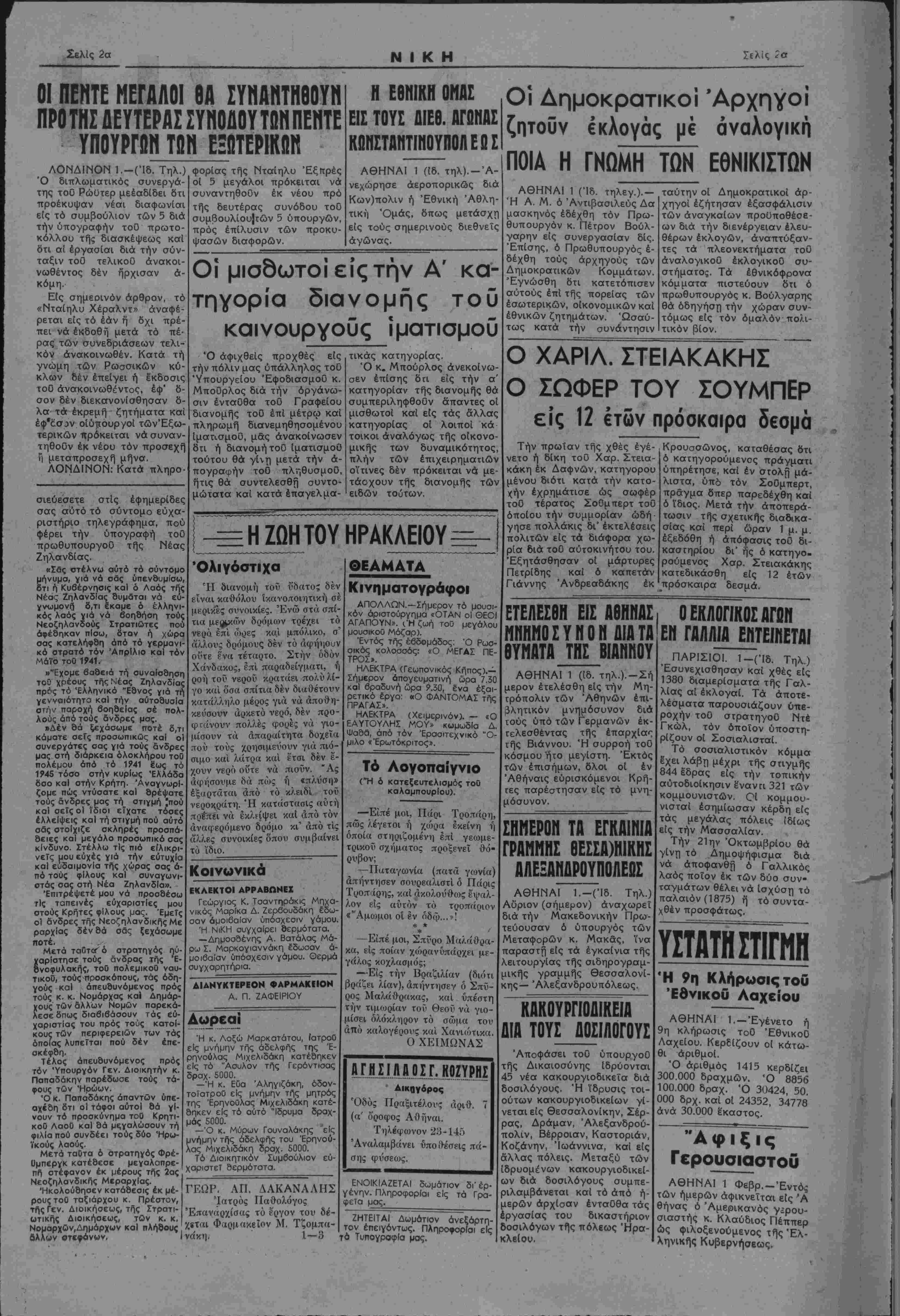 <ης— Άλεξανδρουτΐόλεως. ΚΑΚΟΥΡΓΙΟΑΙΚΕΙΑ ΔΙΑ ΤΟΥΣ ΔΟΣΙΛΟΓΟΥΣ "Αποφάσει τοΰ ύπουργοΟ τής Δικαιοσύνης Εδρύονται 45 νέα κακουργιοδικεΐα διά δοσιλόγους. Ή ίδρυσις τοι¬ ούτων κακουργιοδικεΐων γί- νεταιείς Θεσσαλονίκην, Σέρ- ρας, Δράμαν, Άλεξανδρού- πολιν, Βέρροιαν, Καστοριάν, Κοζάνην, Ίωάννινα, καί είς άλλας πόλεις. Μεταξύ των Ιδρυομένων κακουργιοδικεί- ων διά δοσιλόγους συμπε- ριλαμβάνεται καί τό άπό η¬ μερών άρχΐσαν ένταθθα τάς Εργασίας τού δικαστήριον ^οσιλόγων τής πόλεως Ηρα¬ κλείου. ΟΕΚ/ΙΟΠΚΟΣΑΓΩΝ ΕΝ ΓΑΑΛΙΑ ΕΝΤΕΙΝΕΤΑΙ ΠΑΡΙΣΙΟΙ. 1—(Ίδ. Τηλ.) Έσυνεχισθησαν καί χθές είς 1380 διαμερίσματα τής Γαλ- λίας αί εκλογαί. Τα άποτε- λέσματα παρουσιάζουν ύπε- ροχήν τοϋ στρατηγοϋ Ντέ Γκώλ, τόν οποίον ϋποστη- ρΐζουν οί Σοσιαλισταί. Τό σοσιαλιστικόν κόμμα έ'χει λάβη μέχρι τής στιγμής 844 έ'δρας είς την τοπικήν αυτοδιοίκησιν έναντι 321 των κομμουνιστών. Οί κομμου¬ νισταί έσημίωσαν κέρδη είς τάς μεγάλας πόλεις ιδίως είς την Μασσαλίαν. Την 21 ην "Οκτωμβρίου θά γΐντ) τό Αημοψήφισμα διά νά αποφανθή ό Γαλλικός λαάς ποίον έκ των δύο συν- ταγμάτων θέλει νά Ισχύση τό παλαιόν (1875) τ) τό συντα- χθέν προσφάτως. ΥΣΤΑΤΗ ΣΤΙΓΜΗ Η 9η Κλήρωσις τοΟ ΈθνικοΟ Λαχείου ΑΘΗΝΑΙ 1.-Εγένετο ή 9η κλήρωσις τοΟ ΈθνικοΟ Λαχείου. Κερδίζουν οί κάτω¬ θι άριθμοί. Ό άριθμός 1415 κερδίζει 3ΟΟ.ΟΟΟ δραχμών. Ό 8856 1ΟΟ.ΟΟΟ δρσχ. Ό 30424, 50. ΟΟΟ δρχ. καί οί 24352, 34778 άνά 30.000 Εκαστος. Αφιξις ■ ερουσιαστοθ ΑΘΗΝΑΙ 1 Φεβρ.-'Εντός των ημερών αφικνείται είς Ά θήνας ό Άμερικανός γΐρου- σιαστής κ. Κλαύδιος Πέππερ ώς φιλοξενούμενος τής Έλ- ληνικής Κυβερνήσεως.