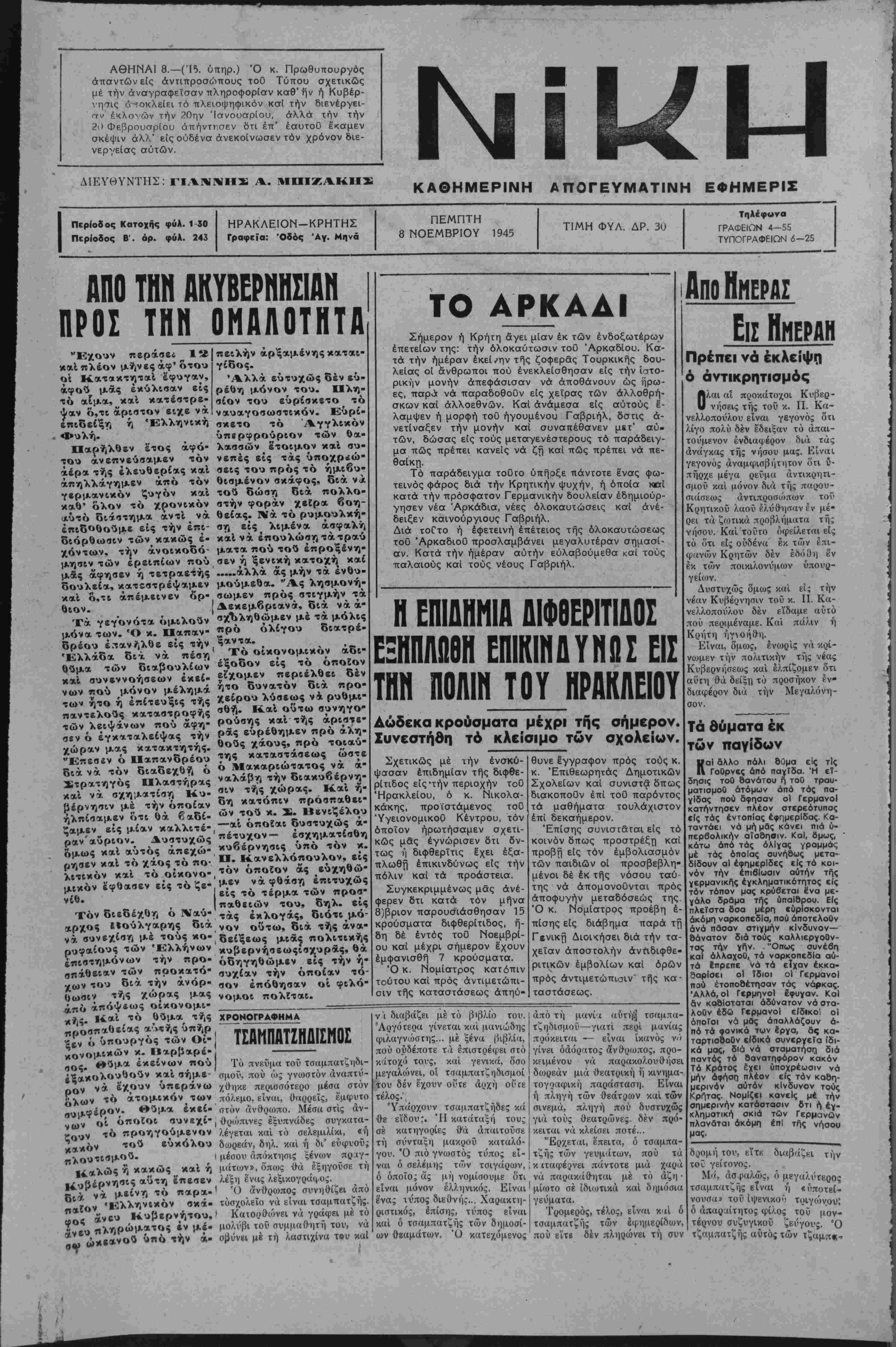 2<ι Φεβρουσρίου απήντησεν δτι έπ' έαυτοθ έκαμεν σκέψιν άλλ' είς ουδένα ανεκοίνωσεν τόν χρόνον διε¬ νεργείας αυτών. ΔΙΕΥΘΥΝΤΗΣ: ΓΙΑΝΝΗΣ Α. ΜΠΙΖΑΚΗΣ ΚΑΘΗΜΕΡΙΝΗ ΑΠΟΓΕΥΜΑΤΙΝΗ ΕΦΗΜΕΡΙΣ ΠερΙοδος Κατοχής φύλ. 1-30 Περίοδος Β'. όρ. φϋλ. 243 ΗΡΑΚΛΕΙΟΝ—ΚΡΗΤΗΣ Γραφεϊα: Όδος Αγ. Μηνά ΠΕΜΠΤΗ 8 ΝΟΕΜΒΡΙΟΥ 1945 ΤΙΜΗ ΦΥΛ. ΔΡ. 30 Τηλίφωνα ΓΡΑΦΕΙΩΝ 4—55 ΤΥΠΟΓΡΑΦΕΙΟΝ 6-25 ΑΠΟ ΤΗΝ ΑΚΥΒΕΡΝΗΣΙΑΝ ΠΡΟΣ ΤΗΝ ΟΜΑΛΟΤΗΤΑ "Εχουν περάσε* 12 καί πλέον μήνες άφ' ότου οί Κατακτηταί Ιφυγαν, άφοΰ μάς έκύλισαν είς τό αΕμα, καί κατέατρε- ψαν ό,τι άριστον ειχε νά επιδείξη ή Έλληνική Φυλή. Παρήλθεν έτος άφό- τού ανεπνεύσαμεν τόν άέρατής ελευθερίας καί άπηλλάγημεν άπό τόν γερμανικόν ζυγόν καί καθ' όλον τό χρονικόν υιύτό διάστημα άντί ^ νά έπιδοθοΰμε είς τήν έπι- διόρθωσιν των κακώς ε¬ χόντων, τήν άνοικοδό- μησιν των έρεΐπίων πού μάς άφησεν ή τετραετής δουλεία, κατεστρέψαμεν καί ό,τι άπέμεινεν δρ- θιον. Τα γεγονότα όμιλοΰν μόνα των. Ό κ. Παπαν¬ δρέου έ.-τανε',λθε είς τήν Έλλάδα διά νά πέση θύμα των διαβουλίων καί συνεννοήσεων έκεί- νων πού μόνον μέλημά των ήτο ή επίτευξις τής παντελούς καταατροφής των λειψάνων πού άφη¬ σεν ό έγκαταλείψας τήν χώραν μας κατακτητής. "Επεσεν ό Παπανδρέου διά νά τόν διαδεχθή ό Στρατηγός Πλαστήρας καί νά σχηματίση Κυ¬ βέρνησιν μέ τήν οποίαν ήλπίσαμεν ότι θά €αδί- ζαμεν είς μίαν καλλιτέ- ραν'αΰριον. Δυστυχώς όμως καί αύτός απεχώ¬ ρησεν καί τό χάος τό πο¬ λιτικόν καί τό οικονο¬ μικόν έφθασεν είς τό ζε- νέθ. Χον διεδέχθη ό Ναύ- αρχος ««ούλγαρης διά νά συνεχίση μέ τούς κο- ρυφαίους των Έλλην ών έπιστημόνων τήν προ- αηάθειαν των προκατό- χων τού διά τήν άνόρ- «ωσιν τής χώρας μας ,ά,τίό απόψεως οικονομι- *ής. Καί τό θΰμα τής προσπαθείας αυτής ύπήρ ¥βν ό υπουργός των Οί- £ονομι*ών κ. Ιίαρβαρέ- οος. θΰμα έκείνων πού ίξακολουθοΰν καί σήμε¬ ρον νά έχρυν υπεράνω ολων τό ατομικόν των συμφέρον. Θΰμα έκεί- νων οί οποϊοι συνεχί- ζουν τό προηγούμενον κακόν -ού ευκόλου «λουτισμοΰ. Καλώς ή κακώς καί η Ι4υβέρνη<«ς αυτή έπεσεν Κς* νά μείνη τό παρα¬ παίον «Ελληνικόν οκά- «ος άνευ Κυβερνήτου, |νευ «ληρώμχτος εν μέ- ,« ώκβ*νού υπό την α- |πειλήν αρξαμένης καται- γίδος. Άλλά εύτυχώς δέν ευ¬ ρέθη μόνον τού. Πλη¬ σίον τού ευρίσκετο τό ναυαγοσωστικόν. Ευρί¬ σκετο τό Αγγλικόν ύπβρφρούριον των θα- λασσών έτοιμον καί συ- νεπές είς τάς ύποχρίώ- α&ις τού πρός τό ήμιβυ- Θισμένον σκάφος, διά νά τού δώση διά πολλο- ατήν φοράν χείρα βοη¬ θείας. Νά τό ρυμουλκή- ση είς λιμένα άσφαλή καίνά έπουλώσητάτραύ ματα πού τού έπροξένη- σεν ή ξενική κατοχή καί .....άλλά άς μην τα ενθυ¬ μούμεθα. "Ας λησμονή- σωμεν πρός στιγμήν τα [Δεκεμβριανά, διά νά α¬ σχοληθώμεν μέ τα μόλις πρό όλίγου διατρέ- ξαντα. 1 Τό οικονομικόν άδι- έξοδον είς τό οποίον είχομεν πβριέλθει δέν ήτο δυνατόν διά προ- χείρου λύσεως νά ρυθμι- σθή. Καί ούτω συνηγο- ρούσης καί τής άριστε- ράς εύρέθημεν πρό άλη- θούς χάους, πρό τοιαύ¬ της καταστάσεως ώστε ό Μακαριώτατος νά α¬ ναλάβη τήν διακυβέρνη¬ σιν τής χώρας. Καί ή¬ δη κατόπιν πρόσπαθει- ών τού κ. Σ. Βενιζέλου —αί οποίαι δυστυχώς ά- 'πέτυχον— εσχηματίσθη κυβέρνησις υπό τόν κ. Π. Κανελλόπουλον, είς τόν οποίον άς εύχηθώ- 'μβν νά φθάση επιτυχώς είς τό τέρμα των προα- παθειών τού, δηλ. είς τάς εκλογάς, διότι μό- ,νον οΰτω, διά τής άνα- , δείξεως μι*ς πολιτικάς κυβερνήσεωςισχυράς, θά όδηγηθώμεν ^ είς τήν η¬ συχίαν τήν οποίαν τό¬ σον έπόθησαν οί φιλό- νομοι πολίται. ΤΟ ΑΡΚΑΔΙ Σήμερον ή Κρήτη άγει μίαν έκ των ένδοξωτέρων έπετεΐων της: τήν όλοκσυτωσιν
