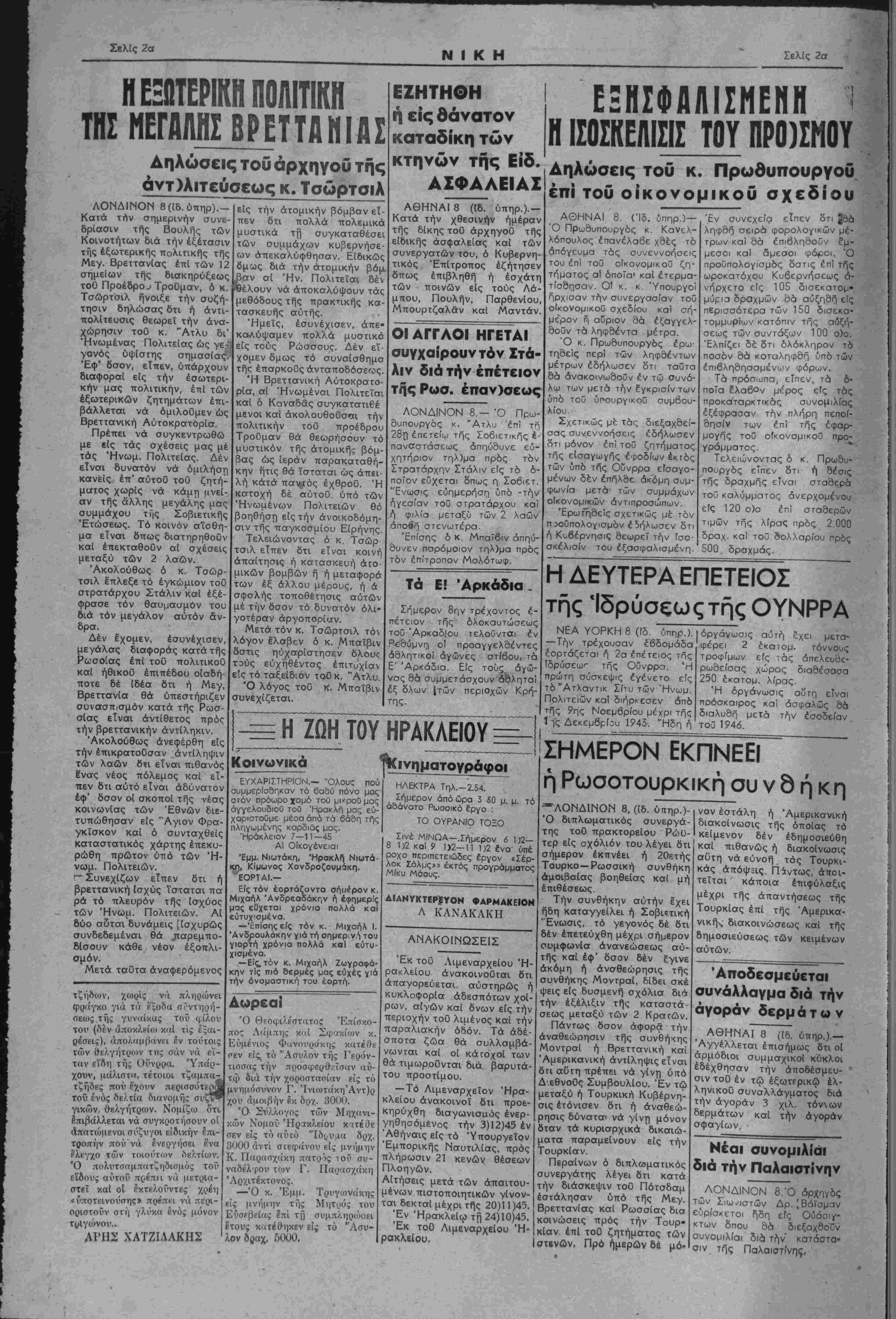Τα πρόσ<οπα, είπεν, τα δ- ποία έλαβον μέρος είς τάς προκαταρκτικάς συνομιλίας εξέφρασαν την πλήρη πεπο(- δησίν των επ! τής έφαρ- μογής τού οίκονομικοΰ προ¬ γράμματος Τελειώνοντας δ κ. Πρωθυ¬ πουργός εΤπεν δτι ή θέσις τής δραχμής είναι σταθερά τοΰ καλύμματος άνερχομένου είς 120 ο)ο επ! σταθερών τιμών τής λίρας πρός 2 000 δραχ. καΐ τοΰ δολλαρίου πρός 500 δραχμάς. Η ΔΕΥΤΕΡΑ ΕΠΕΤΕΙΟΣ τής ΊδρύσςωςτήςΟΥΝΡΡΑ ΝΕΑ ΥΟΡΚΗ 8 (ίδ ύπηρ.). —Την τρέχουσαν έβδομάδα έορτάζεται ή 2α έπέτειος της Ιδρΰσεω'- τής Οΰνρρα. 'Η πρώτη σύσκεψις εγένετο είς τό"Ατλαντικ Σίτυ των Ήνωμ. Πολιτειών κα! διήρκεσεν άπό τής ?ης Νοεμβρίου μέχρι τής 1 ις Δεκεμβριού 1943. "Ηδη ή οργάνωσις αυτή εχει μετα- φέρει 2 έκαιομ. τόννους τροφίμων είς ι άς άπελευΒε- ρωδείσας χώρας διαδέσασα 250 έκατομ. λίρας Ή οργάνωσις αυτή είναι πρόσκαιρος κα! ασφαλώς δα διαλυθή μετά την εσοδείαν τού 194ό. ΣΗΜΕΡΟΝ ΕΚΠΝΕΕΙ ή Ρωσοτουρκική συ ν 8 ή κ η "ΛΟΝΔΙΝΟΝ 8, (ίδ. ύττηρ.)- Ό διπλωματικάς συνεργά- της τοθ πρακτορείου Ρώυ¬ τερ είς σχόλιόν τού λέγει δτι σήμερον έκπνέει ή 20ετής Τουρκο —Ρωσσική συνθήκη άμοιβαίας βοηθείας καί μή έπιθέσεως. Την συνθήκην αυτήν £χει ήδη καταγγείλει ή Σοβΐίτική "Ενωσις, τό γεγονός δέ δτι δέν επετεύχθη μέχρι σήμερον συμφωνΐα άνανεώσεως αϋ- τής καί έφ' δσον δέν έγινε άκόμη ή άνσθεώρησις τής συνθήκης Μοντραί, δίδει σκέ ψεις είς δυσμενή σχόλια διά την εξέλιξιν τής καταστά¬ σεως μεταξϋ των 2 Κραυών. Πάντως δσον άφορά την αναθεώρησιν τής συνθήκης Μοντραί ή Βρεττανική καί Άμερικανική αντίληψις είναι δτι αυτή πρέπει νά γίνη υπό Δ'εθνοθς Συμβουλίου. Έν τώ μεταξύ ή Τουρκική Κυβέρνη¬ σις ετόνισεν δτι ή άναθεώ- ρησις δύναται νά γίντ) μόνον δταν τα κυρισρχικά δικαιώ- ματα παραμεΐνουν είς την Τουρκίαν. Περαίνων ό διπλωματικάς συνεργάτης λέγει δτι κατά την διάσκεψιν τού Πότσδαμ έστάλησαν υπό τής Μεγ. Βρεττανίας καΐ Ρωσσίας δια κοινώσεις πρός την Τουρ¬ κίαν επί τοθ ζητήματος των Ιστενών. Πρό ημερών δέ μό* νόν έστάλη ή Άμερικανική διακοίνωσις τής οποίας τό κείμενον δέν εδημοσιεύθη καί πιθανώς ή διακοίνωσις αυτή νά ειόνοή τάς Τουρκι- κάς άπόψΕΐς. Πάντως, άκοι- τεΐται κάποια έπιφΰλαξις μέχρι τής απαντήσεως τής Τουρκίας επί της Αμερικα¬ νικόν, διακοινώσεως καί τη"ς δημοσιεύσεως των κειμένων αυτών. Δποδεσμεύεται συνάλλαγμα διά την αγοράν δερμάτω ν ΑΘΗΝΑΙ 8 (ίδ. ύπηρ.).— Αγγέλλεται επισήμως δτι οί άρμόδιοι συμμαχικοί κιόκλοι έδέχθησαν την άποδέσμευ- σιν τοθ έν τώ εξωτερικώ έλ- ληνικοϋ συναλλάγματος διά την αγοράν 3 χιλ. τόννων δερμάτων καί την αγοράν σφαγίων. Νέαι συνομιλίάι διά την Παλαιστίνην ΛΟΝΔΙΝΟΝ 8. Ό άρχηγός των Σιω^ιστών Δρ. [Βάϊσμαν εύρίσκετοι ήδη είς Οΰάσιγ- κτων οπου θά διεξαχδοϋν συνομιλίάι διά την κατάστα* σιν τής Παλαιστινης,
