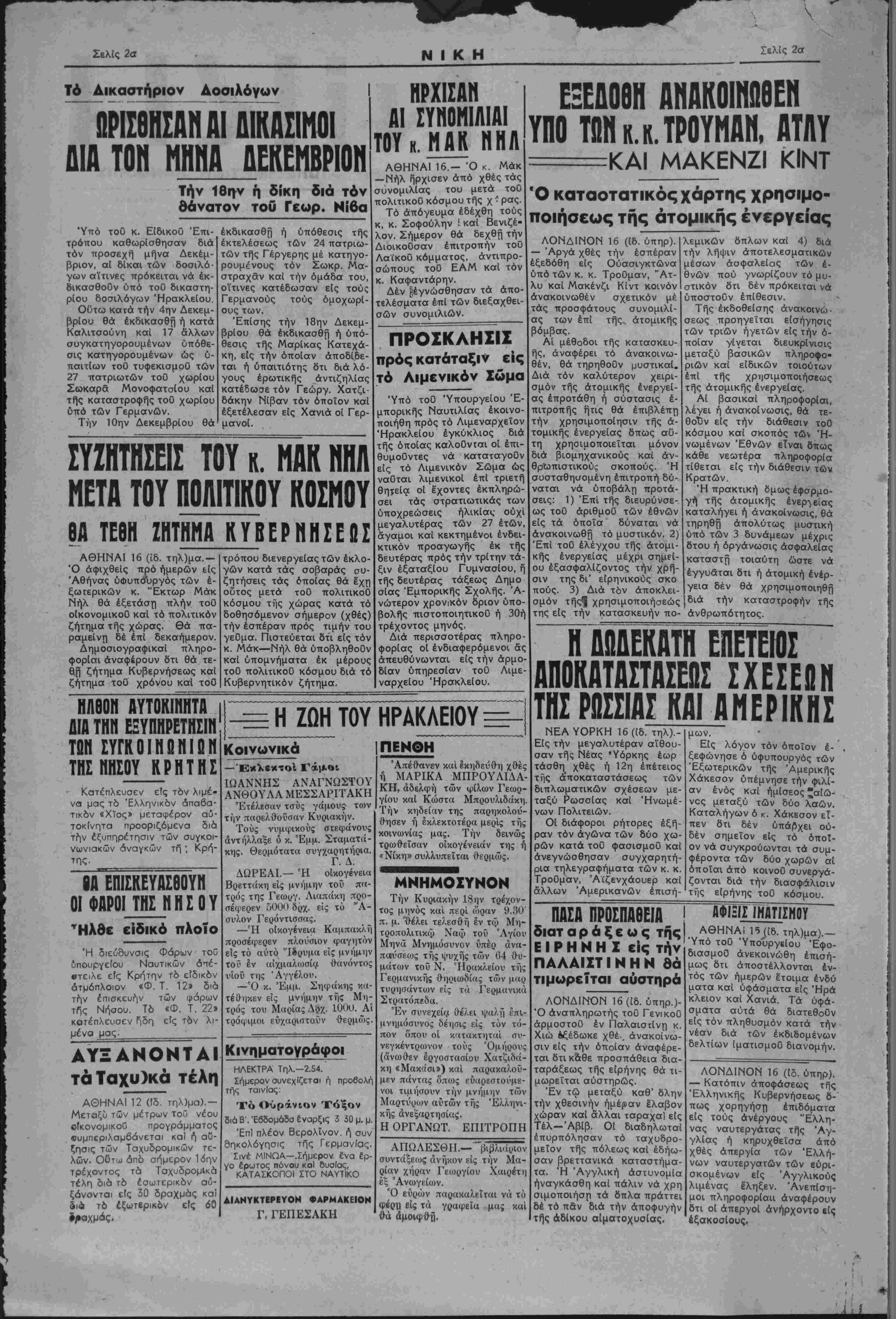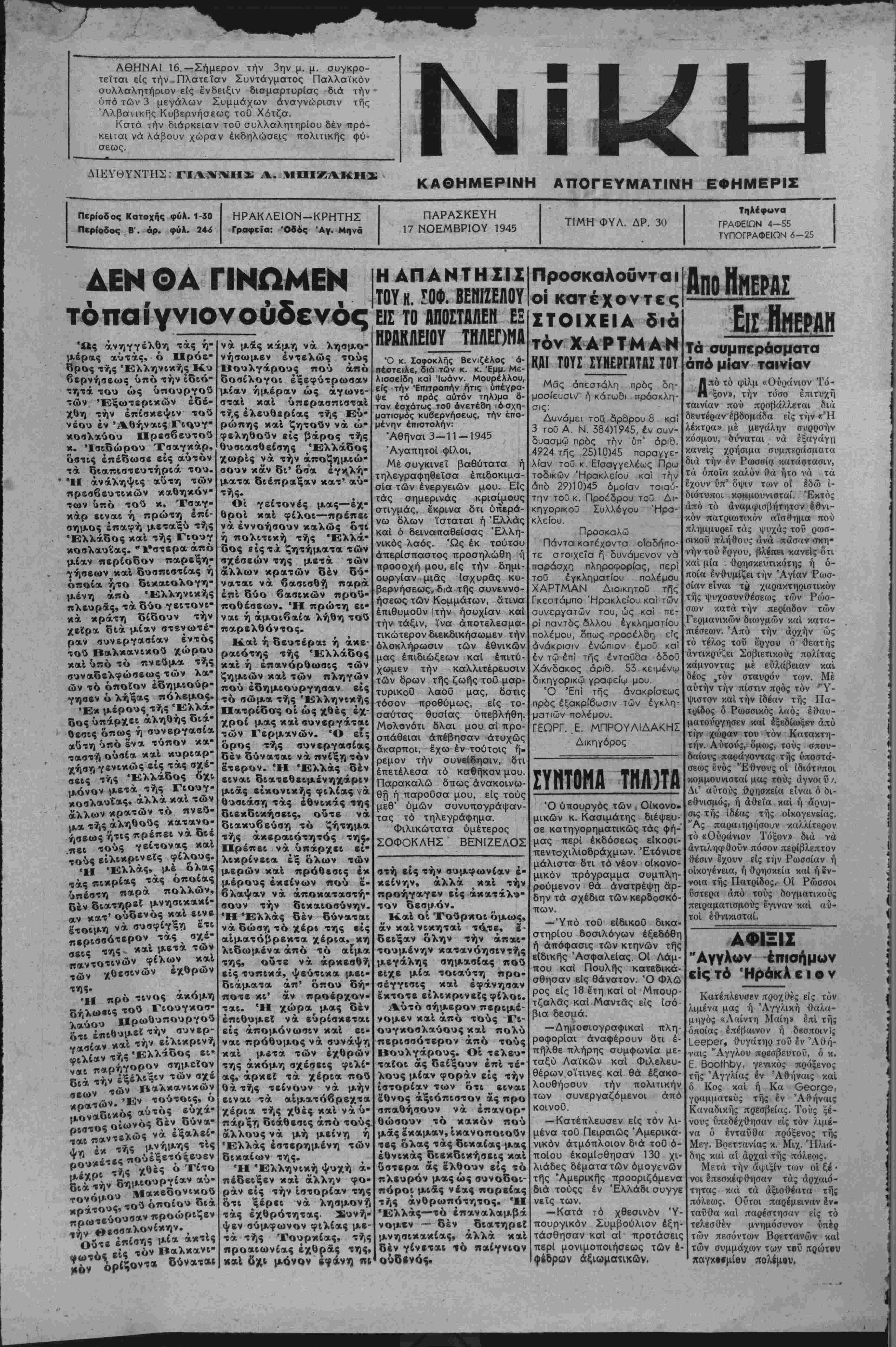 ς *<Λ μετα των ^ φίλων καί έχθρών της» , , «-Ι ,,ρό τινος ακόμη τού Γιουγκοσ- «?ίΗρ^πουργοΰ £„ έπιθυμεϊ την συνερ¬ γασίαν καί την ειλικρινή ΙΓλίαν τής «Ελλάδος ει· φ Ιλν σημείον σχέ ?τ«ν δημιρ ΐ Λΐακεδονικού όποίου διά *ν θεσσα ΰε έ«ίϊς ίς τόν Βαλκανι- ν ά μάς κάμη ν ά λησμο- νήσωμεν εντελώς τούς Βουλγάρους πού άπό οΌσέλογοι έξεφύτρωσαν μίαν ημέραν ώς αγωνι- σταί καί ύπερασπισταί τής ελευθερίας τής Ευ- ρώπης καί ζητούν νά ώ" φεληθοΰν είς βάρος τής θυσιασθείσης Ελλάδος χωρίς νά την άποζημιώ- σουν κάν δι' δσα εγκ,λή- ματα διέπραξαν κατ' αύ- τής. Οί γείτονές μας—εχ- θροί καί φίλοι—πρέπει νά έννοήσουν καλώς ότι ή πολιτική τής Ελλά¬ δος είς τα ζητήματα των σχέσεων της μετά των άλλων κρατών δέν δύ¬ ναται νά βασισθή παρά επί δύο βασικών προΰ- ποθέσεων. Ή πρώτη εί¬ ναι ή άμοιβαία ληθή τού παρελθόντος. Καί ή δευτέρα: ή άκε· ραιότης τής Ελλάδος καί ή έπανόρθωσις των ζημιών καί των πληγών πού εδημιούργησαν είς τό σώμα τής Έλληνικής Πατρίδνς οί ώς χθές έχ- χροί μας καί συν εργάται των Γερμανών. Ό εΣς όρος τής συν εργασίας δέν δύναται νά πνίξη τόν έτερον. Ή Ελλάς δέν είναι διατεθειμένηχάριν μιάς εΐκονικης φιλίας νά θυσιάση τάς εθνικάς της διεκδικήσεις, οΰτε νά οΊακυβεύση τό ζήτημα τής άκεραιότητός της. Πρέπει νά ύπάρχει εί- λικρίνεια έξ όλων των μερών καί πρόθεσις έκ μέρους έκβίνων πού έ- βλαψαν νά άποκαταστή- σουν την δικαιοσύνην Ή Ελλάς δέν δύναται νά δώση τό χέρί της είς αίματόβρεκτα χέρια, χη λιδωμένα άπό τό αίμα της, οΰτε νά αρκεσθή είς τυπικά, ψεύτικα μει- διάματα άπ' όπου δή- ποτε κι' άν προέρχον- ται. Ή χώρα^ μας δέν έπιθυμεΐ νά ευρίσκεται είς άπομόνωσιν καί εί¬ ναι πρόθυμος νά συνάψη καί μ*τα των έχθρών της άκόμη σχέσεις φιλί- άς, άρκεΐ τα χέρια πού θά τής τείνουν νά μην είναι τα αίματόβρεχτα χέρια τής χθές καί νά υ¬ πάρξη διάθεσις άπό τούς άλλουςνά μή μείνη ή •Ελλάς εστερημένη των δικαίων της. Ή Έλληνική ψυχή ά πέδειξεν καί άλλην φο ράν είς την ιστορίαν της ότι ξέρει νά λησμονή τάς έχθρότητας. Συνή- ψεν σύμφωνον φί,λίας με¬ τά τής Τουρκίας, τής προαιωνίας εχθράς της, καί δχι μόνον εφάνη πι Η ΑΠΑΝΤΗΣΙΣ ΤΟΥκ. !ΟΦ. ΒΕΝΙΖΕΛΟΥ ΕΙΣ ΤΟ ΑΠΟΣΤΑΛΕΝ ΕΞ ΗΡΑΚΛΕΙΟΥ ΤΗΛΕΠΪ1Λ Ό κ. Σοφοκλής Βενιζέλος α¬ πέστειλε, διά των κ. κ. Έμμ. Με- λισσεΐδη κα) Ίωάνν. Μουρέλλου, είς την Επιτροπήν ήτις υπέγρα¬ ψε τό πρός αυτόν τηλ)μα 8- ταν εσχάτως τοθ ανετέθη 'όσχη- ματισμός κυβερνήσεως, την επο¬ μένην επιστολήν: Αθήναι 3-11-1945 Άγαπητοί φίλοι, Μέ συγκινεΐ βαθύτατα ή τηλεγραφηθεΐσα έπιδοκιμα- σία των ένεργειών μου. Είς τάς σημερινάς κρισίμους στιγμάς, εκρινα δτι υπερά¬ νω δλων "ίσταται ή Ελλάς καί ό δειναπαθείσας Έλλη- νικός λαός. Ώς έκ τούτου άπερΐσπαστος προσηλώθη ή προοοχή μου, είς την δημι¬ ουργίαν μιάς Ισχυράς κυ¬ βερνήσεως, διά τής συνεννο¬ ήσεως των Κομμάτων, άτινα έπιθυμοθν την ησυχίαν καί την τάξιν, ίνα αποτελεσμα¬ τικωτέραν διεκδικήσωμεν την όλοκλήρωσιν των έθνικών μας έπιδιώξεων καί επιτύ¬ χωμεν την καλλιτέρευσιν των δρων τής ζωής τοϋ μαρ- τυρικοθ λαοΰ μας, όστις τόσον προθύμως, είς το- σαύτας θυσίας υπεβλήθη. Μολονότι δλαι μου αί προ¬ σπάθειαι απέβησαν ατυχώς άκαρποΐ, £χω έν τούτοις ή- ρεμον την συνεί&ησιν, δτι έπετέλεσα τό καθήκον μου. Παρακαλώ δπως άνακοινω- θή ή παροΰσα μου, είς τούς μεθ' υμών συνυπογράψαν- τας τό τηλεγράφημα. Φιλικώτατα ύμέτερος ΣΟΦΟΚΛΗΣ ΒΕΝΙΖΕΛΟΣ στή είς την συμφωνίαν ε¬ κείνην, άλλά καί την προήγαγεν είς άκατάλν- τον θεσμόν. Καί οί Τούρχοι όμως, άνκαίνικηταί τό,τε, έ- δειξαν 