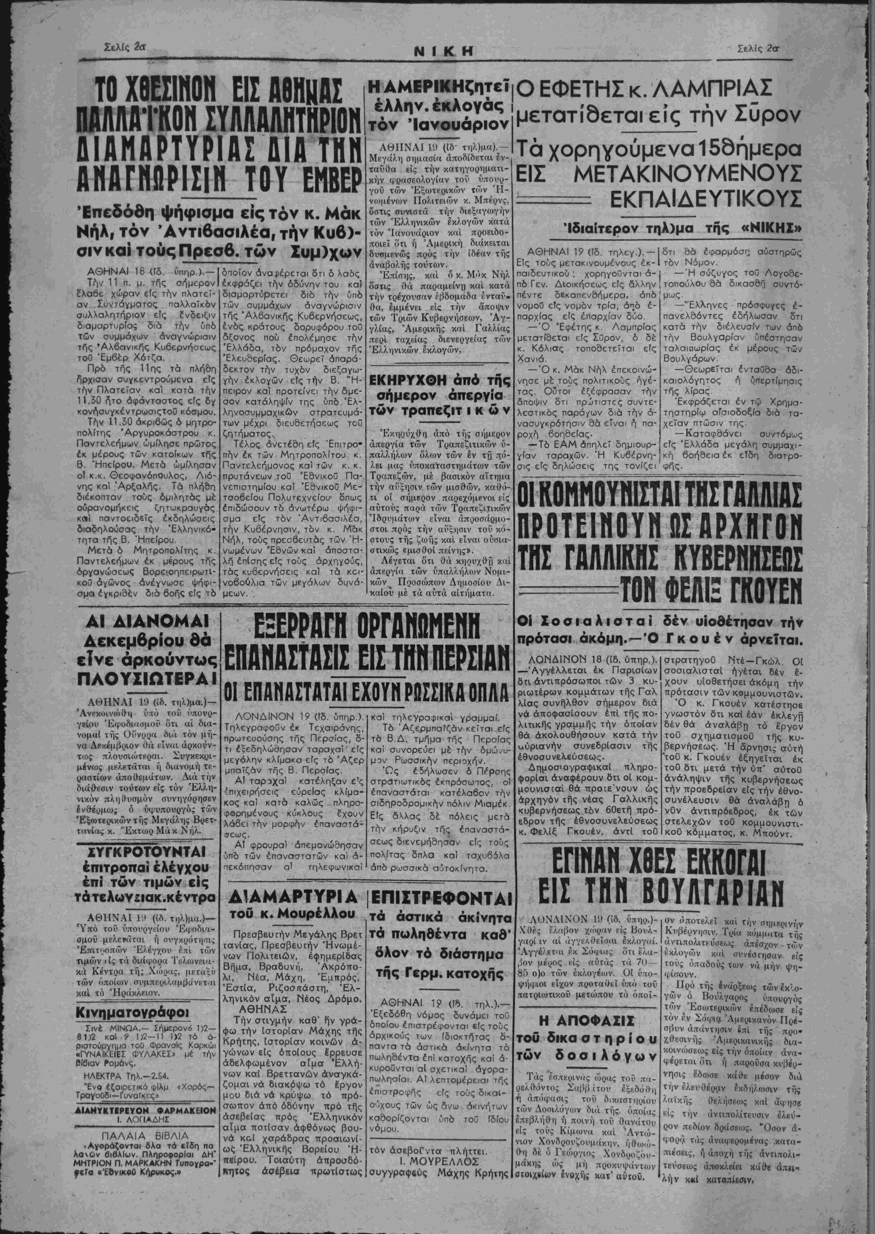 πωλη<7ίαι. Αί λεπτομέρειαι τής έπιστροφής είς τούς δικαι- ούχους των ώς δνω άκινήτων καδορίζονται υπό τού ίδίου νόμου. τόν άσεβοΓντα πλήττει. 1. ΜΟΥΡΕΛΛΟΣ συγγραφεύς Μάχης Κρήτης Ο ΕΦΕΤΗΣ κ. ΛΑΜΠΡΙΑΣ μετατίδεται είς την Σϋρον Τα χορηγοΰμενα158ήμερα ΕΙΣ ΜΕΤΑΚΙΝΟΥΜΕΝΟΥΣ -------- ΕΚΠΑΙΔΕΥΤΙΚΟΥΣ Ιδιαίτερον τηλ)μα τής «ΝΙΚΗΣ» ΑΘΗΝΑΙ 19 (ϊδ. τηλεγ.).— Είς τους μετακινουμένους έκ- παιδευτικοΰ ς χορηγοϋνται ά¬ πό Γεν. Διοικήσεως είς άλλην πέντε δεκαπενδήμερα, άπό νομοΰ είς νομόν τρία, άηό ε¬ παρχίας είς επαρχίαν δύο. — Ό 'Εφέτης κ. Λαμπρίας μετατίδεται είς Σΰρον, ό δέ κ. Κόλιας τοποδετεϊται είς Χανιά. — Ό κ. Μάκ Νήλ έπεκοινώ- νησε μέ τους πολιτικοϋς ηγέ¬ τας. Ούτοι εξέφρασαν την άποψιν δτι πρΐιτιστςς συντε- λεστικός παρά/ων διά την ά- νασυγκρότησιν 8ά εΤναι ή πα- ροχή βοηθείας. — Τό ΕΑΜ άπηλεΤ δημιουρ¬ γίαν ταραχών. Ή Κυβέρνη¬ σις είς δηλώσεις της τονίζει δτι 9ά εφαρμόση, αυστηρώς τόν Νόμον. ( —Ή σύζυγος τού Λογο8ε- |τοπούλθυ 8ά δικασθή συντό¬ μως —"Ελληνες πρόσφυγες έ- πανελδόντες εδήλωσαν δτι κατά την διέλευσιν των άπό την Βουλγαρίαν ΰπέστησαν ταλαιπωρίας έκ μέρους των Βουλγάρων —Θεωρεϊται ένταϋδα αδι¬ καιολόγητος ή υπερτίμησις τής λίρας. 'Εκφράζεται έν τω Χρημα- τηστηρίω αίσιοδοξία διά τα- χεϊαν πτώσιν της —Καταφδάνει συντόμως είς Έλλάδα μεγάλη συμμαχι- κή βοήδεια έκ είδη διατρο- φής. ΟΙ ΚΟΜΜΟΥΝΙΣΤΑΙ ΤΗΣ ΓΑΛΛΙΑΣ ΠΡΟΤΕ1ΝΟΥΝ ΩΣ ΑΡΧΗΓΟΝ ΤΗΣ ΓΑΛΛΙΚΗΣ ΚΥΒΕΡΝΗΣΕΩΣ ===ΤΟΜ ΦΕΛΙΞ ΓΚΟΥΕΝ Οί Σοσιαλισταί δέν υΐοθέτησαν την πρότασι άκόμη.—Ό Γ κ ο υ έ ν άρνείται. ΛΟΝΔΙΝΟΝ 18 (ίδ. ύπηρ.). —Αγγέλλεται έκ Παρισίων δτι άντιπρόσωποι των 3 κυ¬ ριωτέρων κομμάτων τής Γαλ λΐας συνήλθον σήμερον διά νά άποφασΐσουν επί τής πο- λιτικής γραμμάς την οποίαν θά άκολουθήσουν κατά την ■Αυριανήν συνεδρίασιν τής εθνοσυνελεύσεως. Δημοσιογραψικαί πληρο¬ φορίαι άναφέρουν δτι οί κομ¬ μουνισταί θά προΐε'νουν ώς αρχηγόν τής νέας Γαλλικής κυβερνήσεως τόν 6Οετή πρό¬ εδρον τής εθνοσυνελεύσεως κ. Φελίξ Γκουέν, άντί τού στρατηγοϋ Ντέ—Γκώλ. Οί σοσιαλισταί ηγέται δέν ε- χουν υίοθετήσει άκόμη την πρότασιν των κομμουνιστών. Ό κ. Γκουέν κατέστησε γνωστόν δτι καί εάν εκλεγή δέν θά άναλάβτ) τό έργον τού σχηματισμοϋ τής κυ¬ βερνήσεως. Ή άρνησις αυτή 'τοΰ κ. Γκουέν έξηγεΐται έκ τοΟ δτι μετά την ύπ' αΰτοθ ανάληψιν τής κυβερνήσεως την προεδρείον είς την εθνο¬ συνέλευσιν θά αναλάβη ό νυν άντιπρόεδρος, έκ των στελεχών τοΟ κομμουνιστι- κοΰ κόμματος, κ. Μπούντ. Ε ΐΓΙΙΙΑΝ Χ ΣΤΗΝ ΕΣΕΚί ΟΥΛΓ ΟΓΑΙ ΙΡ ΑΝ ΛΟΝΔΙΝΟΝ 1!) (ίδ. ύπηο.)- Χθές έλαβον χΐόρην είς Βούλ¬ γαρι ιν αί άγγελι^εΐσιιι εκλογαί. Αγγέλεται έκ Σόφιας ότι έλα¬ βον μέρος είς αυτάς τα 70 — 85 ο)ο των έκλογέιον. ΟΙ ί'πο- ψήφιοι είχον προταθεΐ υπό τοϋ πατριωτικόν μετώπου τό ήποΐ- Η ΑΠΟΦΑΣΙΣ τού δικα σ τ η ρ ί ο υ των δοσιλόγων Τάς εσπερινάς ώρας τοϋ πα- λΜντος Σαββίτου ΙξεδόίΗι ή απόφασις τοϋ δικαστηοίου των Δοσιλόγων <δκί τής οποίας επεβλήθη ή ποινή τοΰ θανάτου είς τούς Κίμωνα κα'ι Αντώ¬ νιον Χονδρουζουμάκιιν, ή^ωαΊ- θη δέ ό Γεώργιος Χονδοοζου- μάκης ώς μή προκυψάντων σΐοιχβίίον ένοχής κατ' αύτοΰ. όν αποτελεί καί την σΐ|μρρ1νί|ν Κυβέρνησιν. Τρία κόμματα της αντιπολιτεύσεως άπέσχον των έκλογών καί συνέστησαν είς τοΰς δπαδοΰς των νά μην ψη- φίσουν. _Πρό τής ενάρξεως των έκ'.ο- γων ο^ Βουλγαοος ύπουργός των Έσωτερικών έπέδωσε είς τον έν Σόφια Αμερικανόν ΙΙρε- σβυν απάντησιν ίπί τής προ· χθ-εσινής Άμερικανικής δια¬ κοινώσεως είς την οποίαν άνα- φέρεται ότι ή πηροΰσα κυβέρ¬ νησις έδωσ