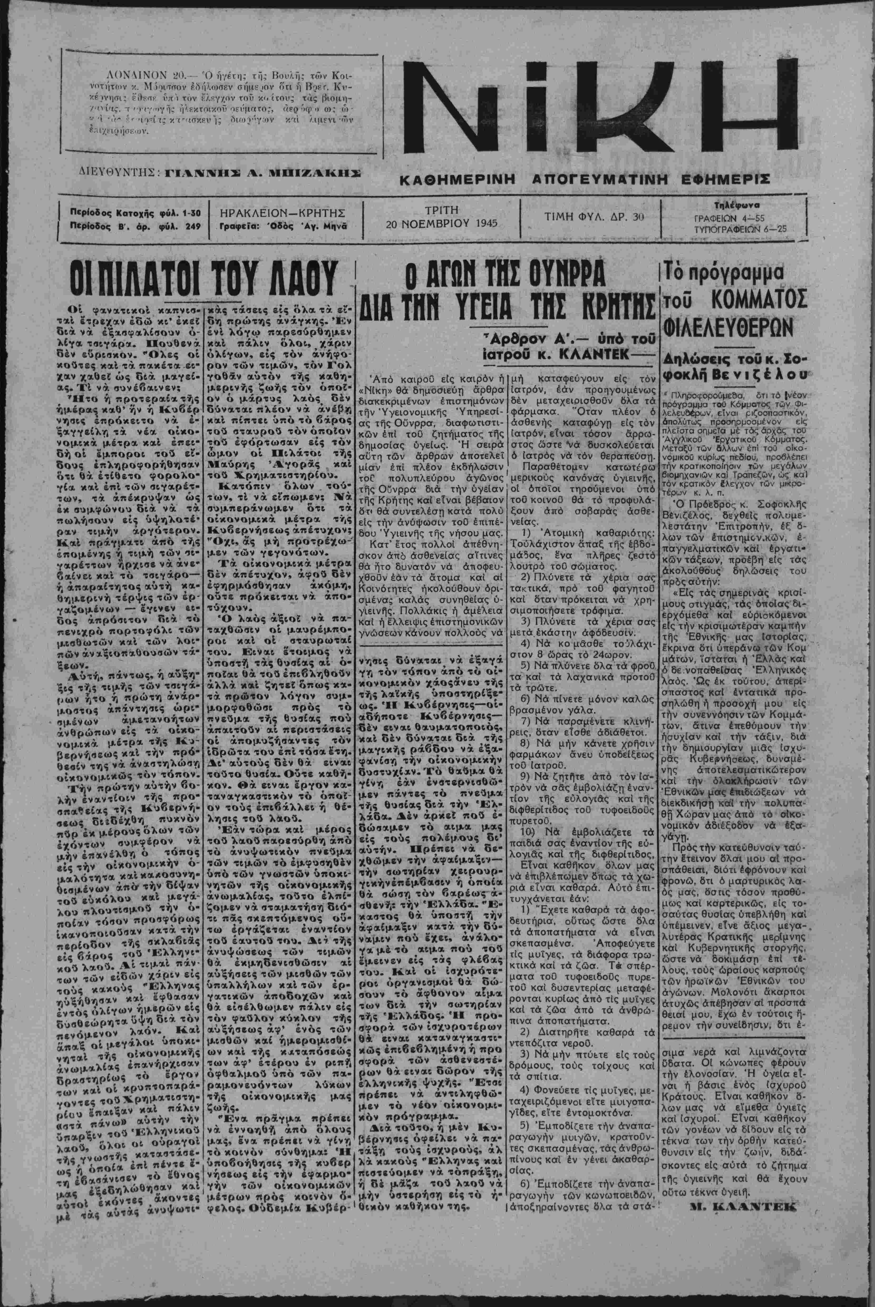 μισθωτών κ<*1 των λοι- πών άναξιοπαθουσών τά· ξεων. Αυτή, πάντως, ή αύξη- ξις τής τιμής των τσιγά- ρων ήτο ή πρώτη άνάρ- μοστος απάντησις ωρι¬ σμένων άμετανοήτων άνθρωπον είς τα οίκο- νομικά μέτρα τής Κυ¬ βερνήσεως καί την πρό¬ θεσιν της νά αναστηλώση οίκονομικώς τόν τόπον. Την πρώτην αυτήν βο- λήν εναντίοιν τής προ¬ σπαθείας τής Κυβερνή¬ σεως δΐίδέχθη πυκνόν πύρ έκμέρουςόλων των εχόντων συμφέρον νά μην επανέλθη ό τόπος είς την οικονομικήν ό- μαλότητα καίκακοαυνη- θισμένων άπό· την δίψαν τού ευκόλου καί μεγά- λου πλουτισμοΰ την ό- «θίαν τόσον προσφόρως ίκανοποιοΰσαν κατά την περίοδον τής ακλαβιάς είς βάρος τού Έλληνι- κοΰ λαοΰ. Αί τιμαί πάν¬ των των είδών χάριν είς τούς κακούς "Ελληνας ηυξήθησαν καί έφθασαν έντός ολίγων ημερών είς δυσθεώρητ* ϋψη διά τόν πενόμενον λαόν. Καί άπαξ οί μεγάλοι υποκι- νηταί τής οΐκονομικής άνωμαλίας έπανήρχιααν δραστηρίως τό έργο* των καί οί κρυπτοπαρά- γοντες τούΧρημ·*'«<"η- ρίου έπαιξαν καί πάλιν «στά πάνω» αυτήν την ύπαρξιν τοΰ 'Ελληνικοΰ λαού, όλοι οί ουραγοί -ής γνωστής καταστάσε¬ ως ή όποία επί πέντε έ- τ» έβασάνισεν το εθνος μας έξεδηλώθησαν καί ϊύτοί έκόντες ακοντες μ* τάς αύτάς ανυψωτι- κάς τάσβις είς όλα τα βΐ* δή πρώτης άνάγκης. Έν ένί λόγω παρεαύρθημεν καί πάλιν όλοι, χάριν ολίγων, είς τόν άνήφο- ρον των τιμών, τόν Γολ γοθάν αυτόν τής καθη- μερινής ζωής τόν οποί¬ ον ό μάρτυς λαός δέν δύναται πλέον νά άνέβη καί πίπτει υπό τό βάρος τοΰ σταυροΰ τόνοποίον τοΰ έφόρτωσαν είς τόν ωμον οί Πιλάτοι τής Μαύρης Άγοράς καί τού Χρηματιστηρίου. Κατόπιν όλων τού¬ των, τί ν ά είπωμεν; Νά συμπεράνωμεν ότι τα οίκονομικά μέτρα τής Κυβερνήσεως απέτυχον; "Οχι, άς μή προτρέχω- μεν των γεγονότων. Ύά οίκονομικά μέτρα δέν απέτυχον, άφού δέν έφηρμόσθησαν άκόμη, ούτε πρόκειται νά άπο- τύχουν. Ό λαός αξιοί νά πα- τ αχθώσι ν οί μαυρέμπο- ροι καί οί αταυρωταί τού. Είναι έτοιμος νά υποστή τάς θυσίας αί ο¬ ποίαι θά τού έπιβληθούν άλλά καί ζητεί όπως κα¬ τά πρώτον λόγον συμ- μορφοθώσι πρός τό πνεΰμα τής θυσίας πού άπαιτούν αί περιστάσεις οί άπομυζήσαντες τόν ίδρώτα τού επί τόσα έτη. Δι' αύτούς δέν θά είναι τούτο θυαία. Οΰτε καθή¬ κον. Θά είναι έργον κα- ταναγκαστικόν τό οποί¬ ον τούς επιβάλλει ή θέ¬ λησις τού λαού. Εάν τώρα χαί μέρος τού λαού παρεσύρθη άπό τό άνυψωτικόν πνεΰμα των τιμών τό έμφυσηθέν υπό των γνωστών ύποκι- νητών τής οικονομικάς άνωμαλίας, τούτο ελπί¬ ζομεν νά σταματήση διό¬ τι πάς σκεπτόμενος ού¬ τω έργάζεται εναντίον τού έαυτού τού. Αι ι τής άνυψώαεως των τιμών θά έκμηδενισθώσιν αί αύξήσεις των μισθών των ύπαλλήλων καί των έρ· γατικών άποδοχών καί θά είσέλθωμεν πάλιν είς τόν φαύλον κύκλον τής αυξήσεως άφ' ενός των μισθών καί ήμερομισθί- ων καί τής κχταπόσβώς των άφ' ετέρου έν ριπή οφθαλμού υπό των πά» ραμονευόντων λύκων τής οικονομικάς μας ζωής. "Εν* πράγμα πρέπει νά εννοηθή άπό όλους μας, ένα πρέπει νά γίνη τό κοινόν σύνθημα: Ή ύποβοήθησις τής κυβερ νήαεως είς την εφαρμο¬ γήν των οίκονομικών μέτρων πρός κοινόν ο- φελος. Ούδεμία Κυβέρ- Ο ΑΓΩΝ ΤΗΣ ΟΥΝΡΡΑ ΔΙΑ ΤΗΝ ΥΓΕΙΑ ΤΗΣ ΚΡΗΤΗΣ ΤΑρθρον Α.— υπό τοϋ ίατροθ κ. ΚΛΑΝΤΕΚ----- Άπό καιροΰ είς καιρόν ή «Νίκη» θά δημοσιεύτ] αρθρα διακεκριμένων έπιστημόνων την 'Υγειονομικής "Υπηρεσί¬ ας τής Οϋνρρα, διαφωτιστι- κών επί τοό ζητήματος τής δημοσίας ύγείας. Ή σειρά αυτή των άρθρων αποτελεί μίαν επί πλέον εκδήλωσιν τοΓ πολυπλεύρου αγώνος τής Οΰνρρα διά την υγείαν τής Κρήτης καΐ είναι βέβαιον δτ< θά συντελέση 