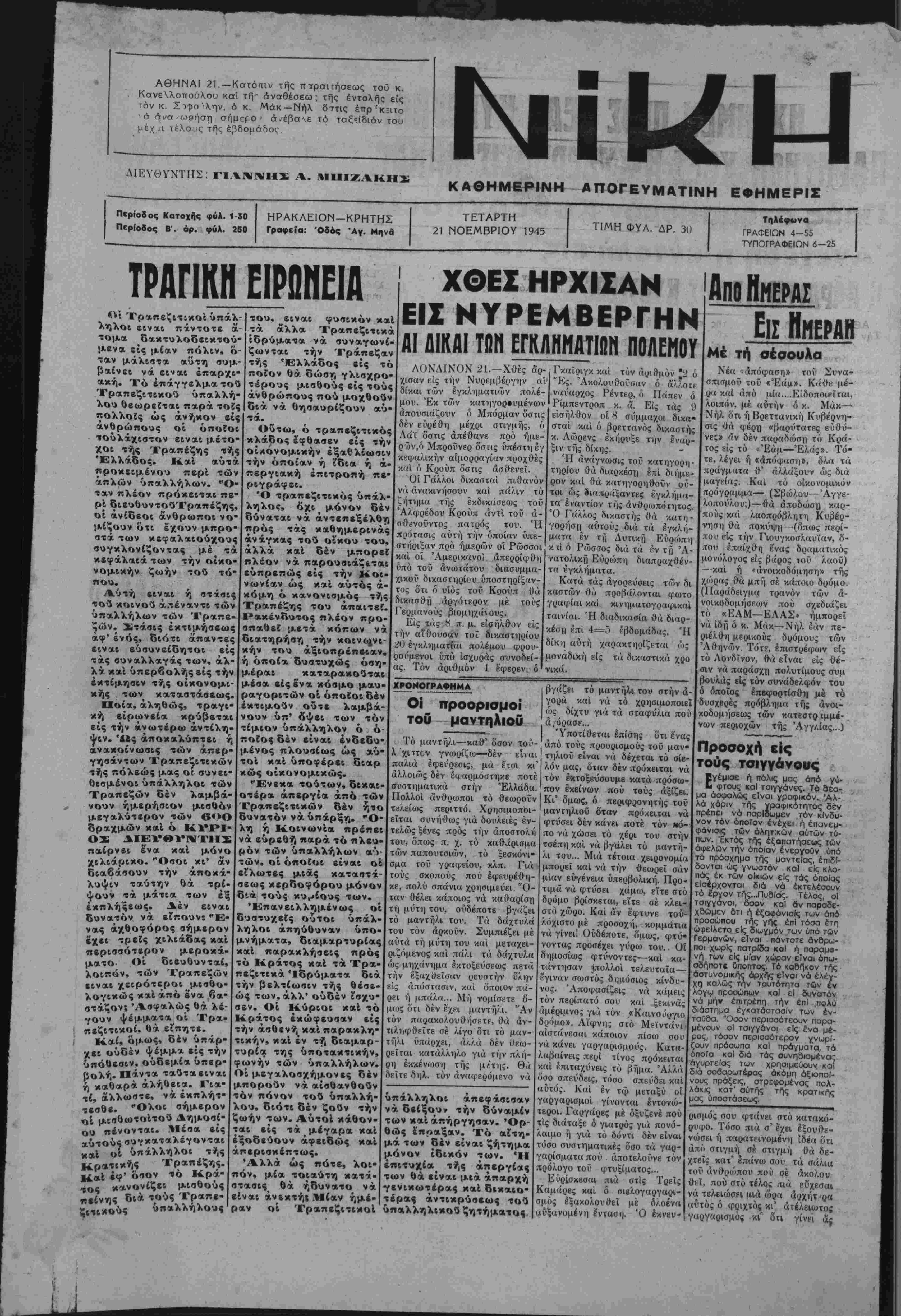 Ά ίτνσ'ί.νρήση σήμερο' άνέβσε τό τοξ<:ίδιόν τού μεχ λ τελο ς τί)ς εβδομάδος ΔΙΕΥΘΥΝΤΗΣ: ΓΙΑΝΝΗΣ Α. ΜΠΙΖΑΚΗΧ ΚΑΘΗΜΕΡΙΝΗ ΑΠΟΓΕΥΜΑΤΙΝΗ ΕΦΗΜΕΡΙΣ Περίοδος Κατοχής φύλ. 1-30 ΠερίοοΌς Β. όρ. φύλ. 250 ΗΡΑΚΛΕΙΟΝ-ΚΡΗΤΗΣ Γραφεια: Οδός Αγ. Μηνά ΤΕΤΑΡΤΗ 21 ΝΟΕΜΒΡΙΟΥ 1945 ΤΙΜΗ ΦΥΛ. ΔΡ. 30 ΤηλέφΜνα ΓΡΑΦΕΙΩΝ 4-55 ΤΥΠΟΓΡΑΦΕΙΟΝ 6-25 ΤΡΑΓΙΚΗ ΕΙΡΟΗΕΙΑ <*ί Τραπεζιτικοίύπάλ- ληλοι είναι πάντοτε ά- τομα δακτυλοδεικτού- μβνα είς μίαν πόλιν, ό- ταν μάλιστα αυτή συμ- βαίνει νά είναι έπαρχι- ακή. Τό έπάγγελμα τού Τραπεζιτικοΰ ύπαλλή- λου θεωρείται παρά τοίς πολλαίς ώς άνήκον είς άνθρώπους οί όποΐοι τουλάχιστον είναι μετο- χοι τής Τραπέζης τής Ελλάδος. Καί αύτά προκ&ιμένου περί των άπλών ύπαλλήλων. "Ο- ταν πλέον πρόκειται πε ρί διευθυντοΰΤραπέζης, οί άνίδεοι άνθρωποι νο μέζουν ότι έχουν μπρο στά των κεφαλαιούχους συγκλονίζοντας μέ τα κεφάλαιά των την οίκο νομικήν ζωήν τού τό που. Αυτή είναι ή στάσις τού κοινοΰ ά.τέναντι των ύπαλλήλων των Τραπβ- ζών. Στάσις εκτιμήσεως άφ' ενός, διότι άπαντες είναι εύσυνείδητοι είς τάς συναλλαγάς των, άλ- λά καί ύπερβολής είς την εκτίμησιν τής οίκονομι- κής των καταστάσεως. Ποία, άληθώς, τραγι- κή είρωνεία κρύβεται είς την ανωτέρω αντίλη¬ ψιν. Ώς άποκαλύπτει ή ανακοίνωσις των άπερ- γησάντων Τραπεζιτικών τής πόλεώς μας οί συνβι- θεβμένοι ύπάλληλοι των Τραπεζών Βέν λαμβά- νουν ήμερήσιον μισθόν μεγαλύτερον των β«>Ο