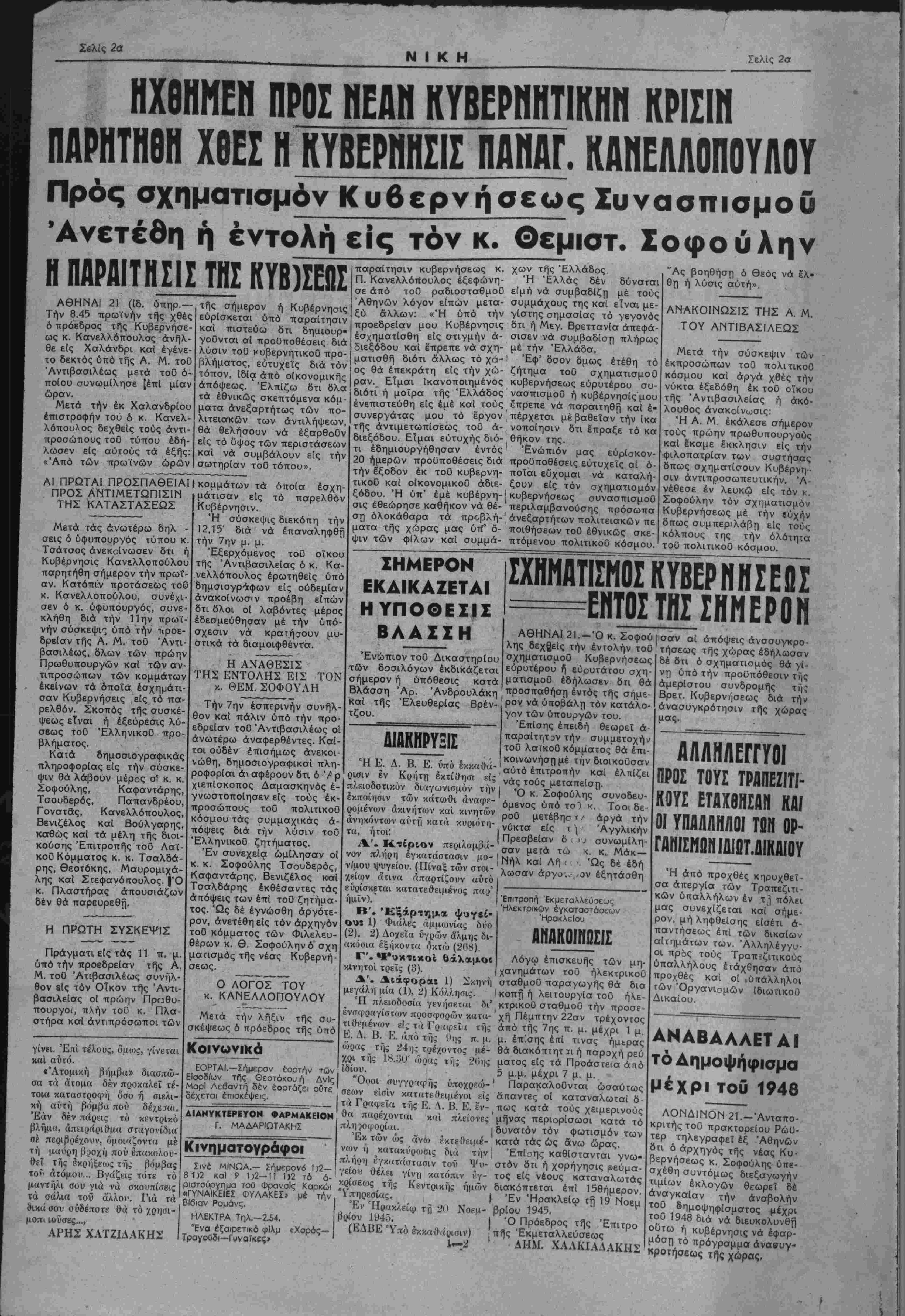 σαν μετά τω ·<:. κ. Μάκ — Νήλ καί Δή γ · Ώς δέ έδή λωσαν άργο.. ,/ον εξητάσθη 'ΕπιτροπιΊ Εκμεταλλεύσεως ΉλεκτρΐΜΐιν έγ;καταστάσεων Ηρακλείου ΑΗΑΚΟΙΗΟΣ.Σ Λόγω έπισκευής των μη- χανημάτων τοθ ήλεκτρικοϋ σταθμοθ παραγωγής θά δια κοπή ή λειτουργία τοθ ήλε¬ κτρικοϋ σταθμοθ την προσέ¬ χη Πέμπτην 22αν τρέχοντος άπό τής 7ης π. μ. μέχρι 1 μ μ. έπίσης επί τινάς ήμε,ρας θά διακόπτητϊΐ ή παροχή ρεύ ματος είς τα Προάστεια άπό 5 μ.μ. μέχρι 7 μ. μ. Παρακαλοθνται ωσαύτως άπαντες οί καταναλωταί δ ι πως κατά τούς χειμερινούς ' μήνας περΐορίσωσι κατά τό | δυνατόν τόν φωτισμόν των κατά τάς ώς άνω ώρας. Ι Έπίσης καθίστανται γνω¬ στόν δτι ή χορήγησις ρεύμα- τος είς νέους καταναλωτάς διακόπτεται επί 15θήμερον. Ι Έν Ηρακλείω τή 19 Νοεμ βρίου 1945. | Ό Πρόεδρος τής Έπιτρο πής Εκμεταλλεύσεως ! ΔΗΜ. ΧΑΛΚΙΑΔΑΚΗΣ σαν αί άπόψεις ανασυγκρο¬ τήσεως τής χώρας εδήλωσαν δέ δτι ό σχηματισμός θά γί¬ νη υπό την προϋπόθεσιν τής άμερίστου συνδρομάς τής Βρετ. Κυβερνήσεως διά την άνασυγκρότησιν τής χώρας μας. ΠΡΟΣ ΤΟΥΣ ΤΡΔΠΕΖΙΠ- ΚΟΥΣ ΕΤΑΧΘΗΣΑΝ ΚΑΙ ΟΙ ΥΠΑ/1/1Η/10Ι ΤΟΝ 0Ρ- ΓΑΗΙΣΜΡίΙΙ/ΙΙΟΤ,ΑΙΚΑΙΟΥ 'Η άπό προχθές κηρυχθεί¬ σα άπεργία των Τραπεζιτι¬ κήν ύπαλλήλων έν τ-] πόλει μας συνεχίζεται καί' σήμε¬ ρον, μή ληφθείσης εισέτι α¬ παντήσεως επί των δικαίων αίτημάτων των. Άλληλέγγυ- οί πρδς τούς Τραπ=ζιτικούς ϋπαλλήλους έτάχθησαν άπό προχθές καί οί ,ύτΐάλληλοι των Όργανισμών (διωπκοθ Δικαίου. ΑΝΑΒΑΑΛΕΤΑΙ τόΑημοψήφισμα μέχρι τού 1948 ΛΟΝΔΙΝΟΝ 21. — Άνταπο- κριτής τοθ πρακτορείου Ρώυ¬ τερ τηλεγραφεΐ έξ Αθηνών δτι ό άρχηγός τής νέας Κυ¬ βερνήσεως κ. Σοφούλης υπε¬ σχέθη συντόμως διεξαγωγήν τιμίων έκλογών θεωρεΐ δέ αναγκαίαν την άνσβολήν τού δημοψηφίσματος μέχρι τοϋ 1948 διά νά διευκολυνθβ ούτω ή κυβέρνησις νά εφαρ¬ μόση, τό πρόγραμμα άναβυγ- κροτήσεως τής χώρας,