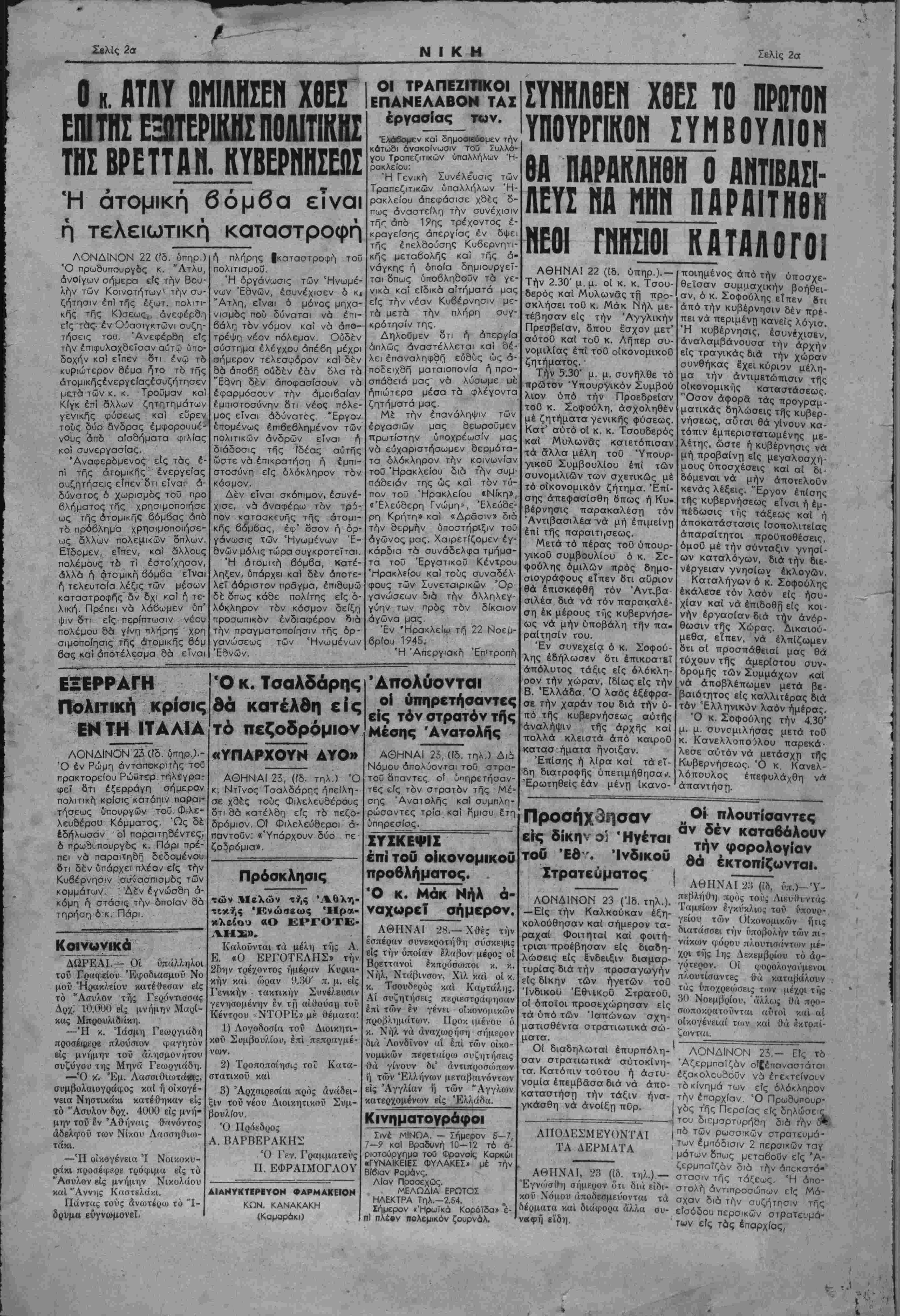 Αί συζητήσεως περιεστρά<ίΐησαν επί των έν γένει οικονομικήν προβλιιμάτοον. Προκ ιμένου ό κ. Νήλ νά αναχωρήση σήμερον διά Λονδίνον αί επί των οίκο- νομικών περεταίοω συζΐ|τήσεις θά γίνουν δι' άντιπροσώπων ή των Έλλήνων μεταβαινόντων είς Αγγλίαν ή των "Αγγλων κατερχομένων είς 'Ελλάδα. Κινηματογράφοι Ιινέ ΜΙΝΩΑ. — Σήμερον 5—7, 7—9 καΐ Βραδύνη 10—12 τό ά- ριστούργημα τοΟ Φρανοϊς Καρκώι «ΓΥΝΑΙΚΕΙΕΣ ΦΥΛΑΚΕΣ» μέ την ΒΙβιαν Ρομάνς. Λίαν Προσεχώς. ΜΕΛΩΔΙΑ ΕΡΩΤΟΣ ΗΛΕΚΤΡΑ Τηλ.-2.54. Σήμερον «Ήρωίκά Κορόιδα» έ- πΙ πλέον πολεμικόν ζουρνόλ. Προσήχθπσαν είς δίκην οί ' Ηγέται τού 'Εθ'. Ίνδικοϋ Στρατεύματος ΛΟΝΔΙΝΟΝ 23 ('.Ιδ. τηλ.). — Είς την Καλκούκαν έξη- κολούθησαν καί σήμερον τα¬ ραχαί Φοπηταί καί φοιτή- τριαι προέβησαν είς διαδη- λώσεις είς ένδειξιν διαμαρ¬ τυρίας διά την προσαγωγήν είς δίκην των ήγετών τοΟ ΊνδικοΟ 'ΕΘμκοΟ ΣτρατοΟ, οί όποΐοι προσεχώρησαν είς τα υπό των Ίαπώνων σχη- ματισθέντα στρατιωτικά σώ- ματα. Οί διαδηλωταί έπυρπόλη- σαν στρατιωτικά αύτοκίνη- τα. Κατόπιν τούτου ή άστυ- νομία επεμβάσα διά νά απο¬ καταστήση την τάξιν ηνα¬ γκάσθη νά ανοίξη πθρ. ( Οί πλουτίσαντες αν δέν καταβάλουν την φορολογίαν θά έκτοπίζωνται. ΑΘΗΝΑΙ 2:ί (ϊδ. υπ.)—Υ¬ πεβλήθη πρός τούς Λιε,υίΗιντας Ταμείον έγκύκλιος τοΰ υπουρ- γείου των Οίκονομικών ήτις δΐατάσσει την υποβολήν των πι- νάκων φόοου πλουτισιίντιιιν (ΐέ- ΧΟΐ τής 1ης Δεκεμβριού τό αρ¬ γότερον. Οί ψορολογοΐ'μενοι πλουτίσαντες θά καταβάλουν τάς ΰποχρεοισεις των μέχρι τής :$Ο Νοεμβριού, άλλως ί>ά προ-