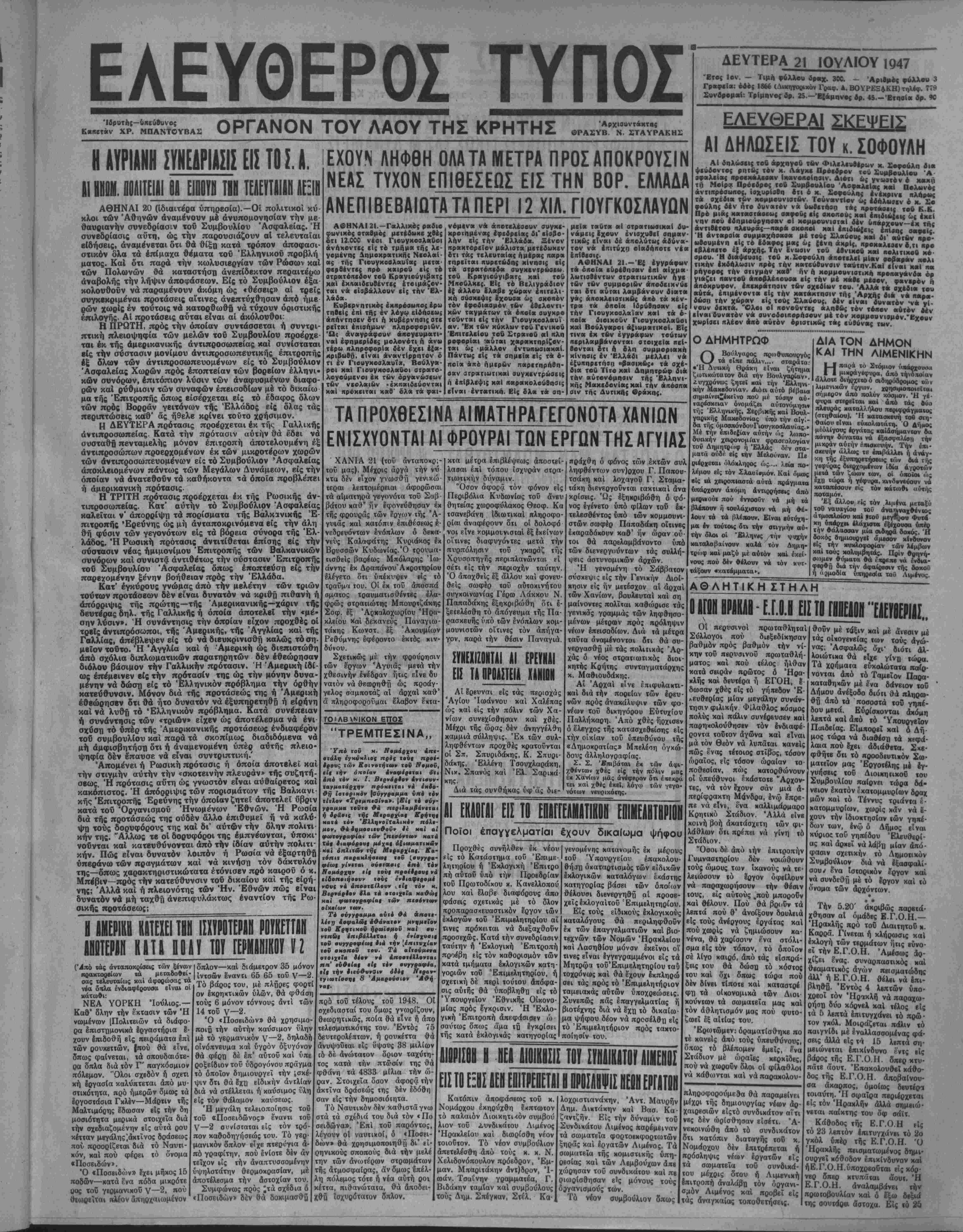 'Υκβ τοδ κ. 'ΒηιΤΒ«<ιου τ·0 Ι χτέΐΜτβυ στρβττ·βΐΜΐΙ·ν ηετρκπέμ ιτβνται ν» δικοιβββθν τίιν ηρ· βεχίί Π«ρ«ακεαίιν 1) «Ι π«ρ. Σνρος Ί«ειν. Λειβηβιντάκης κβιΐ Νικ«/λ. Λ«βπβΐΝΤ*χιις κάτοικβι Κρητοβτς Μ«τηγ·ρούμ«ν οί βι« ηαρβχίιν βυνδρομί)ς είς τ«ς συμ μβρΐτεις. 2) Ό Κννα. ΒΑρβκς χ* τοιχβς Κροβατκς διότι έβοήβη- σ·ν τβθς ανμμβρΚτας δίβειν βυμ 0ο»λβΐ{ χαΐ ένιβχόβεις «Ις βύ τβος διβτ τίιν έκτέλεβιν κακβυρ νημάτειν. 3) ΟΙ ΕΑρ. βημερης Λιικβυρνος Χ«ιρ|τη: κβτοικβι 'ΑνΜγείΜν χ«1 ΣτρΜΤιΊγης Έμμ. χάτοιχβς 'ΑβτυρβΐΜίου διότι έ- βχημβτιαβν Ινοκλον ομάδκ χ«Ι την 11 Ιούνιον ί.ϊ. «Ις τί,ν η· ριβχην £κηνβς τβδ Μ«ρ*βου έ{·τίλϊββν κραι(εις β(βτς έναντι •ν χρατιχδν όργάνΜν. ΑΕΡΜΑΐ» - ΚΑΤΗΡΓΑΣΜΕΝΑ ΕΥΡΩΠΑΙΚΑ-ΕΛΛΗΜΊΚΑ Γιά κάθε Γοΰστο καί κάθε Ύπόδηαπ ΔΕΡΜΑΤΟΠΩΛΕΙΟΝ ΙΟλΝΝΟΥ ΕΜΜ. ΜΠΑΝΤΟΥΒΑ Όός 1866 (Κρεοπωλεϊα) Α. Π. ΚΟΡΠΗΣ & Σ'Α Τηλέφ. 5-51 ΕΒΔΟΜΛΔΙΑΙΑΙΑΝΑΧΒΡΗΣΕΙΙ Μ)Σ «ΛΑΜΦΙΣ»—Τετάρτη Βράδυ ΚΑΤ' ΕΥΘΕΙΑΝ Πειραια—Βόλον—θεσσαλονίκην ΝΕΑΙ ΠΑΡΑΛΑΒΑΙ ΟΟΝΟΟΜΒΠΕ Κρέμΐς προαώηου ημέρας χ«1 νυκτός ««β χυμόν ΑΓΓΟΥΡΙΟΥ διά καθ· έκιδβρμίδα ϋΕυΝΕδδΕ 46.081 Όχι ηλέον μαλλια λιυκάΠ Μόνβ μέ τό 46 081 β* δικτηρησετ» καί Βά έπαναικτή. οετε τβ φυσιχο χρ&μ« τβν μαλλιΑν σας. Άρώματα Καλλυντικά Νειάτα Δροσιά ϊ«μΡουλϊυβήτ« μ«ς (Ις ότι βφβρκ την Όμθρψΐά λλονΑν ο«ς ο«ς. λλοΑ ς ΕΥΑΓΓ. ΓΚΙΚΑΚΠρώπν Γεωργαντά) ΑΙΑΗΟΜΗ ΤΡΟΦΙΜΟΗ ΜΗΝΟΣ ΙΟΥΝΙΟΥ Τ· ίνπιθθ· γρ«φε·ον φ βμον ανεκοίνωαεν ίτι ή «Ίανομή τώ» ΐροφίμαν ΐον Μ·ν«ε ΊβυνΙον θά «ρχίβη την 25 τρέχοντος μβ- ν·| καί θ4 ·ιαρΝέ«]/ μέχρι την 15 Λΰγούβχου. *Ί7χα·τον άτομον θά ΐαβάλ^ ·ί| μίν την πόλιν ίραχ. 2400 είς δέ τα» Καινότητας ίραχ. 2150. Οί ίποροι τή» πόλεως ώς καϊ α! οίκογένιιαι τίν οτραΤια) των θά πληράνενν εί| τ» άκέραι- ραιον τα τρόφΐμά των Ι·'βμϊν·ν {τι ή Ιιανομή περιλβμβόνει μό¬ νον βΐτ·ν ΜαΙ καλαμπόκι. ΟΙ & π·ροι τβν Κβινοτήταν θά κατα- βάλλ·υν μόνον τα ίξοδα μεΐαφ·- ράς τ«8ν τροφίμαν άπαλλανόμενοι τή| Ματαβελήι τή| αξίαε των. ΕΔΟΛΟΦΟΝΗΘΗΣΑΝ ΠΡΟΧ6ΕΣ 6 ΥΠΟΥΡΙΟΙ ΕΙΣ ΤΗΝ ΠΡΩΤΕΥΟΥΣΑΝ ΤΗΣ ΒΙΡΜΑΝΙΑΣ ΛΟΝΔΙΝΟΝ 21.—Μεταδίδεται άπό τό Ραγκούν δτι συνελήφθη ό τέως πρωθυπουργός τής Βιρμανικης κυβερ¬ νήσεως Ή σύλληψις εγένετο κατόπιν τής δολοφονίας 6 ύπουργών βίς την αίθουσαν τοΰ υπουργικον συμβουλίου καί τόν τραυματισμόν δύο αλλων οΐτινες έν τφ μβταξύ ύπέκυψαν είς τα τραύματά των. Διβνβργήθησαν έπίσης καί 170 άλλαι συλλήψεις. Κατά την διάρκειαν των συλλή· ψεων ή άστυνομία έκαμε χρήσιν των δπλων δβδομένου δτι προββλήθη άντίστασις άπό μέρους των συλληφθέν¬ των. Ή Κυβέρνησις είς ήν άνήκον οί δολοφονηθέντες ύ· πουργοί άπετβλείτο έξ έθνικιστών καί κομμουνιστήν. "Ήδη εσχηματίσθη νέα κυβέρνησις ήτ ς καί άνεγνωρίσθη υπό τοΰ "Αγγλου Διοικητοί1. Η ΕΛΛΑΣ ΚΑΙ Ο ΚΟΓΥΙΜΟΥΝΙΣΓτΙΟΣ ΔΗΛΟΣΕΙΣ ΤΟΥ ΣΤΡΑΤ. ΟΛΙΒΕΡ ΑΘΗΝΑΙ 21,—ΜΒταδίδβται έξ Άγκυρας δτι ή δεξίωσις ή γε¬ νομένη §ν Κων)ΐτόΧΒΐ πρός τιμήν τοθ άρχηγοϋ τή: Ιν Τουρ<ί Άμερικανικής στρατιωτικής άποστοής στρατοΰ Όλ'ββο, δ Ά μερικανός στρατηγός ώμιλήσας ετόνισεν δτι δ Τ'·υο<ικός σ^ραΐός Ιξωπλισμένος ώς είναι μέ τα τβλειότερα όπλα θά άπυβ^ είς ι* των καλυιέρων στρατών τού κόσμον. Ό "Ολιβερ' προσέθβσεν διι ή Ελλάς ουδέποτε θά υποκύψη είς τόν κομμουνισμόν. Συνεχίζων δ Άμβριχανός σΐρατηγός εί πεν δτι την θέσιν την οποίαν καιήχεν προηγουμένως είς την Εδ ρώΐτην ή Γερμανία κατέλαβε σήιιβρον ή Ρα>σία ήτις καί άπβι-