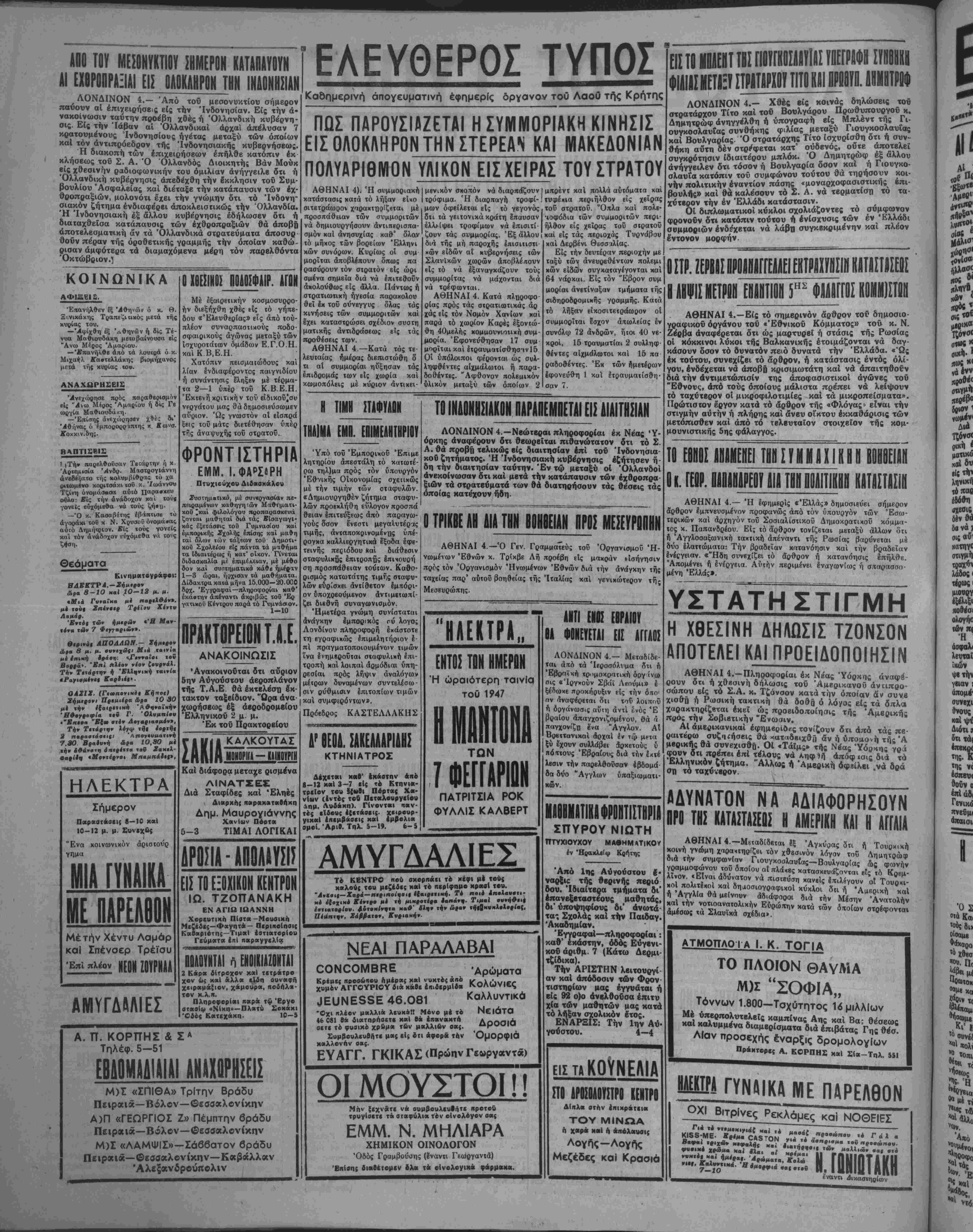 Κ«η<τάν ΧΡ. ΜΟΑΝΤΟΥΒΑΣ ΟΡΓΑΝΟΝ ΤΟΥ ΛΑΟΥ ΤΗΣ ΚΡΗΤΗΣ Άρχισυντάχτης ΟΡΛΣΥΒ. Ν. ΣΤΑΥΡΑΚΗΣ ΤΟ ΕΝΔΕΧΟΜΕΝΟΝ ΜΙΑΣ ΓΕΝΙΚΗΣ ΕΙΙΙΟΕΣΕΩΣ ΕΙΣ ΤΗΝ ΒΟΡ ΙΟΝ ΕΛΛΑΔΛ ΑΘΗΝΑΙ 3 (ίδ. ύπηρ.)— 'Εξετάζοντες την δράσιν των συμμοριών τάς τελευταίας ημέρας οί πολιτικοί κσϊ στρατιωτικοί κύκλοι συμφω νοΰν δτι αυτή έν τφ συνό- λφ τηςπαροΐσιάζβι δύο τι¬ νά: Α) "Οτι αί κινήσεις των συμμοριών γίνονται βάσει σχβδίου καί Β) δτι έν συν- δυασμφ μέ τούς κυρίους άν τικειμενικούς σκοπούς των αί συμμορίαι άποβλέπουν καΐ είς δβυτερεύοντας. "Ο σον άφορό; τάς κινήσβις των συμμοριών παρατηρείται δ¬ τι αύται παρουσιάζουν την μορφήν κροΰσβων. Ύποστη- ρίζβται σχετικώς δτι αί συμ μοοίαι άποβλέπουν είς την διαπίστωσιν των μάλλον α¬ σθενών καί των μάλλον ί σχνρών σημείον προκειμέ νόν νά κανονίσονν βάσει τής διαπιστώσεως ταύτης την μελλοντικήν των στρα τηγικήν. "Οσον άφορό; τούς δβυτερεύοντας σκοπούς των συμμοριών ούτοι οχβτίζον- ται μέ καταστροφάς έργων στρατιωτικής καί κοινής ω¬ φελείας, μέ έκτβλέσεις έ θνικοφρόνων καί γενικώτε ρον μέ την πρόκλησιν πά νικοΰ μεταξύ τοΰ πληθυ σμοΰ. Τα συμπεράσματα τα ό ποία έξάγονται άπό τα άνω τέρω δέν άφήνουν άμφιβο λίαν δτι οί συμμορΐται προ ετοιμάζουν τό έδαφος διά την διενέργειαν την κατάλ¬ ληλον στιγμήν μβγάλης επι θέσεως. Είναι άγνωστον ά- κάμη πώς ακριβώς θά εκ¬ δηλωθή ή επίθεσις αυτή. Βέβαιον δμως θεωρβίται δτι τα έπιτελεΐα των Σλαυϊκών κρατών θά δώσουν τάς άν αγ καίας κατευθύνσεις, θά όρ γανώσουν καί θά ένισχύ σονν πάλιν διά νέον τύπου δπλων καί μέσον τας συμ μορίας. Θά μετάσχουν άκό μη καί μέ ίδικά των στβλέ- χη είς τόν άγώνα. Επί τοΰ σημβίου τούτου οί στρατιω τικοί κύκλοι έχουν στρέψτ. δλην την προσοχήν των. Δι ότι τουτο σημαίνβι ότι τα Σλαυΐκά κράτη ένδιαφέρον- ται την στιγμήν ταύτην ζω τικώς διά την επιτυχίαν τής έπιθέσβως διά τής οποίας θά εξασφαλισθή ή περίφη μος ελευθέρα περιοχή διά την «κυβέρνησιν των βου νών». Τολμηραί προβλέψεις άλλά καί δχι άπίθανοι κα¬ τόπιν τής τροπής την όποί αν έλαβον τελευταίως τα πράγματα δέν άποκλβίουν την συμμετοχήν είς την έ πίθεσιν καί στρατιωτικών καθαρώς τμημάτων των Σλαυϊκών κρατών. Άπέναντι τής καταστά¬ σεως ή όποια δημιθυργείται κατόπιν των τελευταίων τού των συντονισμένων ένβρ- Υβιών των συμμοριών ή κυ¬ βέρνησις καί τό επιτελείον λαμβάνουν ήδη τα κατάληλ- λα στρατιωτικά μέτρα Τα μέτρα ταύτα τονίζβται δτι θά δυνηθούν νά ματαίω· σουν συντριπτικώς τους σκο πούς των κομμουνιστάς. Νά διατηρήσουν δηλ. καθ* δλην την γραμμήν την πρωτοβου λίαν την οποίαν κατέχει μέ· χρι τής στιγμής ταύτης ό στρατός, καταφέροντα καί νέα άποφασιστικά πλήγμα- τα εναντίον τοΰ κυρίου σώ ματος των συμμοριών "Αν ή ενίσχυσις των συμμοριών υπό των Σλαυϊκών κρατών καταστή τοιαύτη ώστε νά ύπερβαίντι τα μέχρι τοΰδε δρια, πάλιν ό στρατός θά δυνηθή διά των νε'ων έφο δίων τού βάσει τής Άμβρι- χανικής οίκβνομικής βοη¬ θείας νά αντιδράση αποτε¬ λεσματικώς. Είς την περί¬ πτωσιν άλλως τε ταύτην πραγματοποιοΰνται αί προϋ ποθέσεις έκεΐναι συμφώνως πρός τάς οποίας ή στρατιω τική επέμβασις τοΰ Όργανι- σμοΰ Ήν. Εθνών καθίστα· ται άναπόφευκτος. Δυνάμει τοΰ άρθρου 51 τοΰ καταστα- τικοΰ ή επέμβασις αυτή θά πραγματοποιηθή όπωσδήπο τε «διά των φιλικών πρός την 'Ελλάδα κρατών»—Ά- μβρικής καί Αγγλίας—καί διά των καταλλήλων πολε μικών μέσων. Δέν πρέπει συνεπώς νά ύπάρχουν άνη συχίαι καί νά έχδηλοΰνται φόβοι. Ή Σλαυΐκή έπίθε σις!καί είς την περίπτωσιν που θ