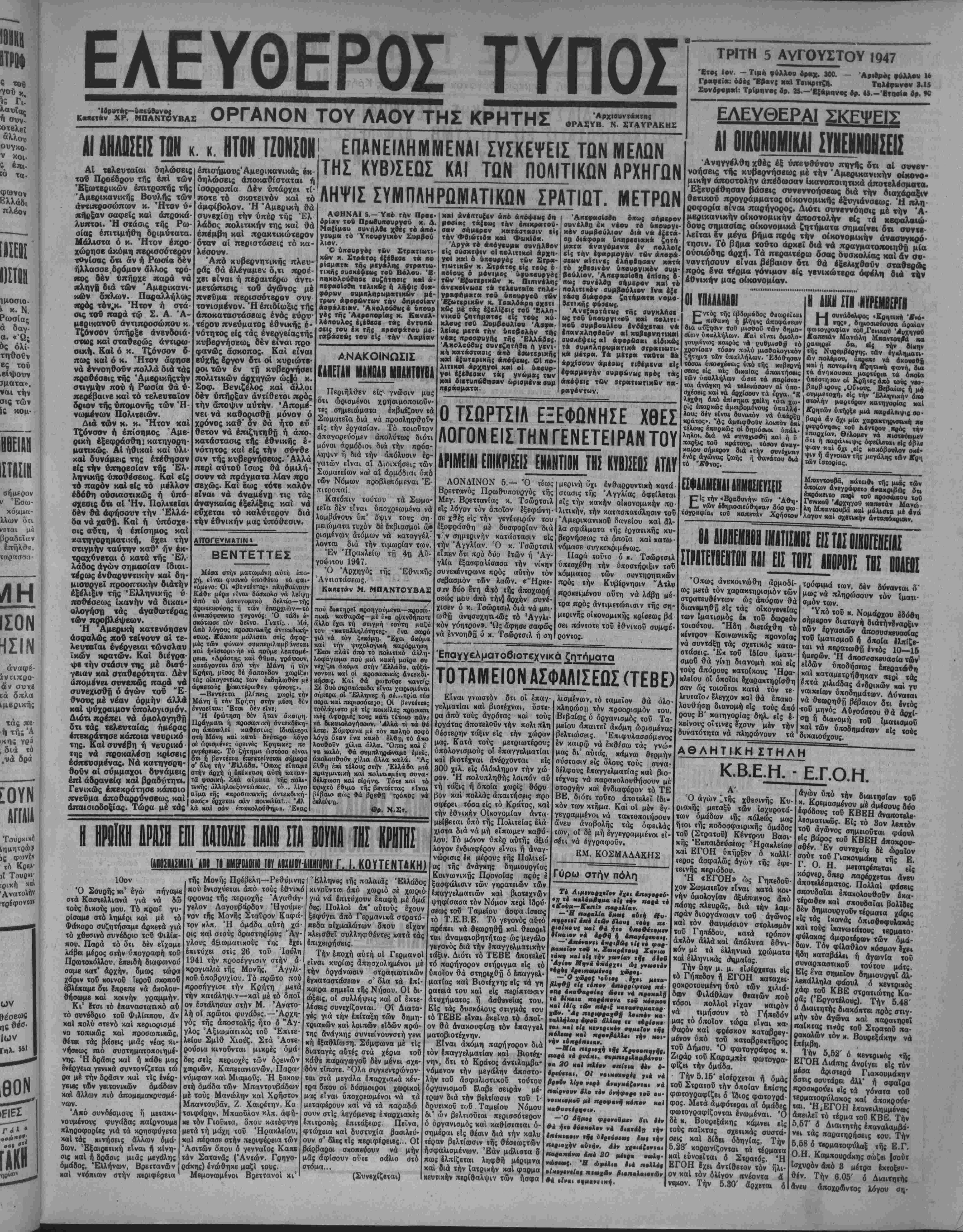 ν<υμ« τό 'Υκονρνικον Συμβού λιον. Ό αηουρρος των Στρατιωτι¬ κών χ. £τρ*τος έϊέβιοι τ« πό ρίαματα τή* μεγάλας ατρατΐΜ- τιπής συακέφινς τβθ Βόλου. 'Β- ηηχολουθηαι ονζάτηβις καί «- ηΐφ«ο(αθη τελικές Α λήφις διβ- φόρνν συμιτληρνμβιτικ&ν μβ- τρ*»ν άφβρώντνν την βημοβϊκν άβφάλειαν. 'Ακβλούβιις * όηουρ γβς τήί Άιρο<βρ(«{ κ. Κανελ- λβηουλος έ^έβεβε τ«ς εντνηε» βεις το» έκ της πρββφάτβυ μι· ταβάβεύς τού είς την Λαμίαν ΑΝΑΚΟΙΝΩΣΙΣ ΚΑΙΊΕΤΑΝ ΜΑΝΟΑΗ ΜΠΑΗΤΟΥΒΑ Περιήλθεν εΐς^ γνώσιν μας ότι ώοισμένοι χρησιμοποιοϋν- τες σημειώματα έκβιάζουν τα Σωματεΐα διά νά ποοσληφθούν είς την εργασίαν. Τό τοιούτον άπαγοοεΰο'μεν απολύτως διότι μόνοι άρμόδιοι διά την πρόσ- ληψιν ή διά την απόλυσιν έρ- γατών είναι αί Διοικήσεις των Σωματείων καί α! άρμόδιαι υπό των Νόμων προβλεπόμεναι Έ- πιτοοπαί. Κατόπιν τούτου τα Σωμα¬ τεΐα δέν είναι ύποχρεωμένα νά λαμβάνουν ύπ' όψιν τους ση μειώματα τυχόν δέ Ικβιασμοί ώ* ρισμένων ατόμων νά καταγγέλ- λονται διά την τιμωρίαν «ών. Έν Ηρακλείω τή 4ϊι Αύ- γούιτου 1947. Ό Άρχηγός της Έθνικης Ανιιστάσεως. Κ«η·τ«ν Μ. ΜΠΑΝΤΟΥΒΑ» __________._- -----«ιτβψΐως δή μοσίκς τ*{ε»ς τίιν έιτιχρατοϋ- βαν σήμερον καταστασιν ε>{