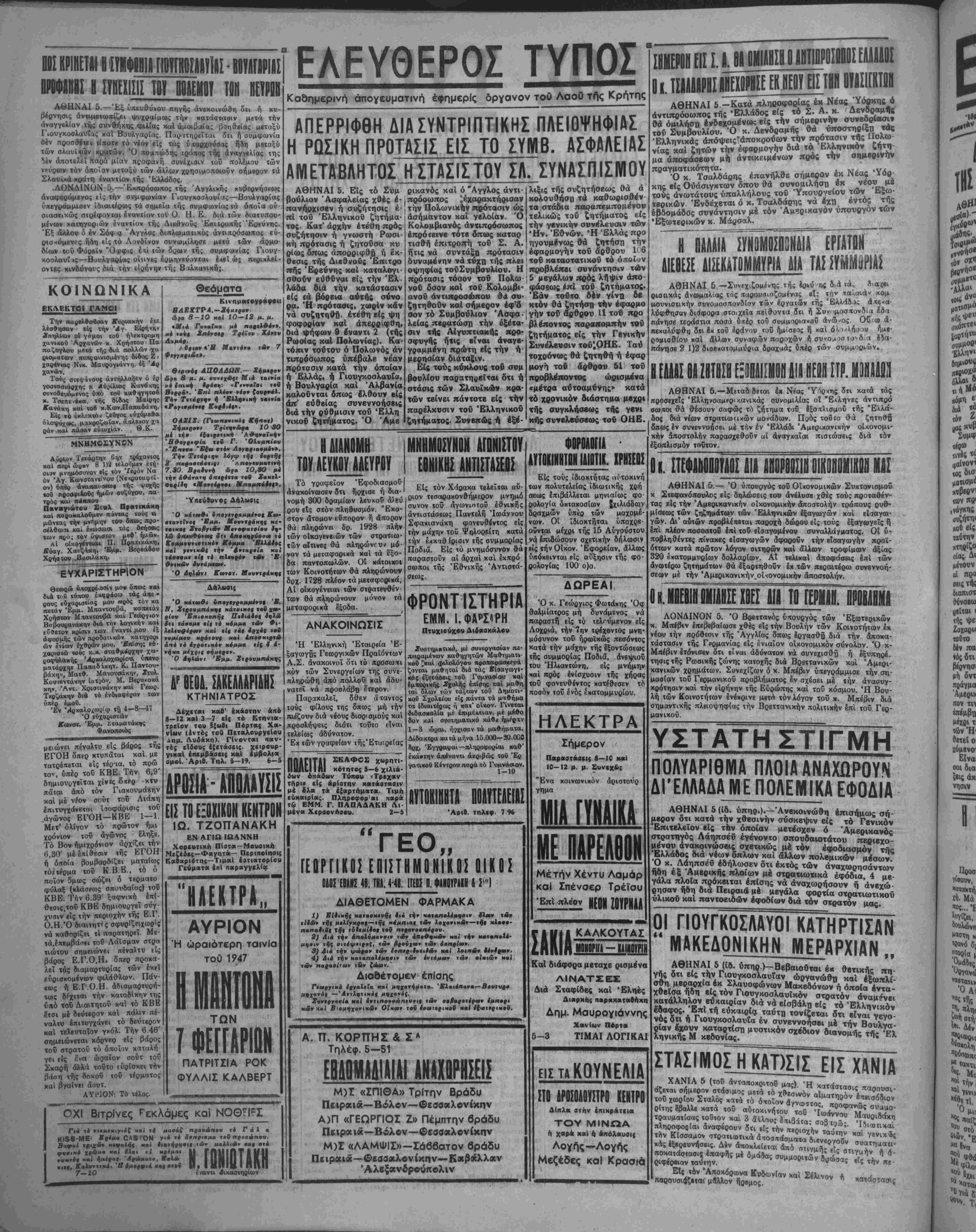 τ<3ν ειαραοίτων ιβν ζάα». Δια&έτομεν έπίσης Γεα,ργΐΜά έργαλεΐα κβί μηχανήμαχα. ΈΙαιάηανα— α Άλέ χι ς μχς 2υνερναοία ΗαΙ 4ν(ΐιτοοοώπευ*ΐ| των οεβαραΐέρων Ιμη»ρι Μ(3ν χαί βιομηχανΐΜτβν ΟΓκον ίβθ έοωτερΐΜβΟ καί έ{(ϋΐερΐΜ·ν. Α. Π. ΚΟΡΠΗΣ & ΣΑ Τηλέφ. 5—51 ΕΒΔΟΙΙΛΔΙΛΙΛΙΑΝΜΟΡΗΣΕΙΣ Μ)Σ «ΣΠΙΘΑ» Τρίτην Βράδυ Πειραια—Βόλον—Θεσσαλονίκην Α)Π «ΓΕΩΡΓΙΟΣ Ζ» Πέμπτην βράδυ Πειραια—Βόλον—Θεσσαλονίκην Μ)Σ «ΛΑΜΦΙΣ»—Σάββατον βράδυ Πϊΐραιά—Θεσσαλονίκην—Καβάλλαν Άλβξανδρούπολιν ΑΪΪΟΚΙΝΗΪΩΝΙΔΙΒΤΙΚ. ΧΡΗΣΕΩΣ Είς τούς ιδιοκτήτας «ϋτοκινή των πολυτελείας ϊδιωτιχής χοή σεως επιβαλλεται μηνιαίως φο- ρολογΐα 5χτακοο(ων (χιλιάδων δραχμών υπέρ των μαχομέ- νων. Οί Ιδιοκτήται υποχρε¬ ούνται μίχοι τής 15 Αύγούστου νά Ιπιδώσουν σχετικήν δήλωσιν Εις την Οίκον. 'Εφορείαν. άλλως ύηόκβινΐαι εις αύξησιν τής φο- ρολογίας 100 ο)ο. ΔΩΡΕΑΙ Ό κ. Γεώργιος Φωτάχης Όφ θαλμίατρος μή δυνάμενος νά παςαστή είς τό τελ^ύμενον είς Λοχριά, την 7ην τρέχοντος μνη¬ μόσυνον τού ήρωϊκώς πεσόντος κατά την μάχην τής εξοντώσεως τής συμμορίας Ποδιά, ανεψιού τού Ήλιαντώνη, είς μνήμην «αί πρός ενίσχυσιν τής χήρας τοϋ φονευθέντος κατέθεσεν τό ποσόν τού ενός έκατομμυρίου. ΗΛΕΚΤΡΑ Σήμερον Π«ρ«στ*αιΐ( 8—10 χαί 10—12 μ. μ. Ευνΐχώς "Ενα κοινωνικόν άριστοΰρ γημα ΜΙΑ ΓΥΝΑΙΚΑ ΜΕ ΠΑΡΕΔΟΘΗ Μέτήν Χέντυ Λαμάρ καί Σπένσερ Τρεϊσυ ___ ΚΟΙ 2ΟΙΡΙΛΛ ΣΑΚΙΑ ΚΔΑΚΟΥΤΑΣ ΜΟΚΟΡΙίΑ — ΜΑΙΜΟΥΡίΗ Καί διάφορα μβταχε ρισμένα ΛΙΝΑΤΣΕε Διά Σταφίδβς καί Εληές Δορκή; η«ρκκαιτ«βήκη Δημ. Μαυρογιάννης 5-3 Π«ρτ« ΤΙΜΑΙ ΛΟΓΙΚΑΙ εισταΚΟΥΝΕΛΙΑ ΠΟ ΑΡΟ2ΟΑΟΪ1ΙΡΙ ΚΕΗΤΡΟ Δ1«λ* οτίιν βπΐΜρατειαε ΤΟΥ ΜΙΝΩΑ ή χ«ρ4 χ«1 4 «πόλαυοΐ( Λογής-Λογής Μεζέδες καί Κρασιά ΑΘΗΝΑΙ 6 —-Συνεχιζομένη* τής βρ»ύ'ης β>.ά ιά,