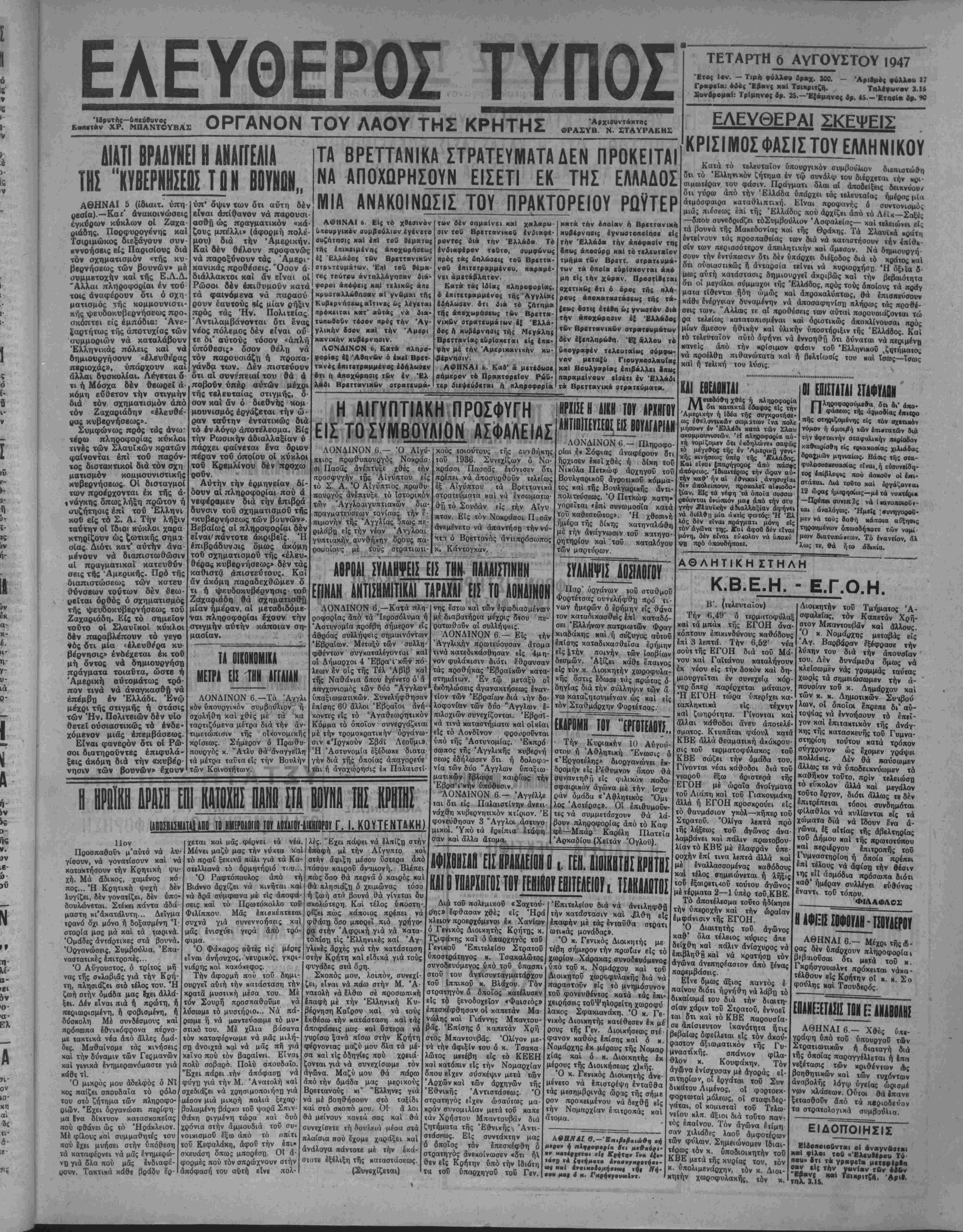 σταΐίίω <.Νίχη»-Πλ«τύ Σ4 Ό Κατεχαχη. ΑΘΗΝΑΙ 6.—Κατάτήν χθεσινήν σύνεσιν-της ως τού Σ. Α. ανεβλήθη μ«»ά την «γόρβτίσιν τοΰ "Αγγλου «ροσώπου κ. Κάντογ«αν ή περαιτέρω συζήτησις^ 4λ1 τοΰ ΑΙγυ ΐΕΤΐακοΰ ζηττΐματος διά την Δβυτέφαν. Μβιά τουτο εΛανβ'ή'φ&ϊΐ ή συζήτησις επί τοΰ Έλλΐ)νΐΗ<)0. Ό άντιποόσοοΛος τής Ελλάδος κ. Δενδραμής λαβών τδν λόγον άιέκοουσε τόν ίσχυρισμόν τοδ Γχρομίκο 8ΐι ή βπιστόλη τοΰ χ. Τσαλδάρη η διατυΐτώνουσα την τελευταίαν προσφυγήν ΟΛοτελβΐ «νέαν πρότασιν». Έν συνίχβ α ο κ. Δενδραμτϊς έζήιηββν δπως ληφ9ο0ν Λμεσα καί άΐτηφ<π·στι- κά μέτρα διά τόν τερματισμόν ττ,ς έν "Ελλιίδι καταστάσεως Ιφαρ- μοζομένου τοΰ άρθρον 39 ιοϋ κβφαλαίου 7 τού κατασταιι-οΰ ΚΙΙΙΤΙΙΙΙΙ ίΗΙΓίίΡΙΖίΙ ΤΟ ΚίΚΟΠΙΠΟΠ ΤΟΪ "ΙΕΤΟ,, ΑΘΗΝΑΙ 6.—Πληροφορίαι 2κ Λέ'ι'χ Σαξές άναφέρουν 9 καί τά τηρουντα έηιφυλακτικήν στάσιν κράΊη ηρχισαν νά χα· τακρίνουν την Ρωσίαν. Οδτω χθές είς τό Σ. Α. ό Γάλλος άντι πρόσωηος χ. Παροντί επέμενε μέν είς τάς συμβιβατικάς ποοτά- σεις κρτέκρινε δμως ώς χαχόπιστον ούσιηστικώς χαί αντίθετον μέ τοΰς σκοηους τοΰ ΟΗΕ τό Ρωσιχόν Βότο. ίΙΙΙΤΟΙΗΤΙΙΙΐΐΕΐΐΕΙΙΙΟ ΙΥΙ81Η. ΑΙΦΙΚΕΙΐί ΑΘΗΝΑΙ 6.— Νεώτεραι πληροφορίαι §χ Νέας Υόρκης άναφέρουν δτι μετά τί|ν αγόρευσιν τοΰ χ. Δενοραμή είς τό Συμ Ιούλιον Ασφαλείας τό 'Ελληνιχδν ζήτημα ουδόλως Βροωθήθη. Έκτης συνεδριίίσεως θά εξαρτηθή" άν ή συζή*τησις θά περιορι¬ σθή" επί «ών προτάσεων Πολωνίας—Κολομβίας τί θά περιλάβη καί την Ελληνικήν προσφαγήν. Έχ των ανωτέρω 2 προτάσεων ή Πολωνικίΐ προβλέπεται διι θά άΛορρΐφ»ή άμέσως. Ή πρότα¬ σις τϊϊς Κολομβίας εξ άλλου χαί ίηιψηφιζομένη θά προκαλέση πιϋανωταϊα νέαν χρησιμοποίησιν τοΰ Ρωσικοΰ Βέτο. Γενικώς οί χυκλοι τοΰ Συμβουλίου Ασφαλείας έξέφραζον χθές την νύκτα την γνώμην δτι τουτο περιήλθεν είς άμιέξοδον. Β ΣΟΤΜΒίΡ ΚΪΚ11ΚΪΪΪΪΪΓΤ7 Φ0Ρ1Σ ΗΣ Β1ΗΙΤ0Β ΑΘΗΝΑΙ 6.—Τό, Είδιχο Δικαστήριον έγκληματιών πολέμου το οποίον Ιξβδίκασε τα έγκλτΐματα τοΰ δημίου ττ,ς Κρήτης λο- χίου Φρίτς Σοΰμπββ» εξέδωκε χθές την νύκτα την απόφασιν τού διά της οποίας ό διαβόηΐος Σοϋμπερ κατεδικάσθη 27 φοοάς είς θανατον διά τούς φόνους, δύο βίς ίσόβια δβσμά διά τούς εμποη σμουςκαι εί; σωρείαν μικροτέρας ποινών δι' άλλα Ιγχληματα πβτεθη χθες αιφνιδιαστικώς εναντίον τής Άραχώβης έξβ βιωχθη εκείθβν μετά σκληράν μάχην υπό προστρεξά °1Υμημ(ίΤ-ω λ αΧ9αΧ0ϋ- «αταδιωκομένη ήδη άν όρβινούς δγκους. Β ΖΤΜΗ0ΡΙΤ1ΙΜΕΤΙ ΤΙΙ ΜΟΕΚΙΙ ΤΟΠ ΙΙΟΙΙΤΙΙ υσΎαΥηΤγϊπϊλη ΔΙΑΨΕΥΔΕΙ ΑΜΕΡΙΚ. ΕΠΙΣΗΜΟΣ ΟΤΙ Η ΑΜΕΡΊΚΗ^ΑΑΔΙΑΦΟΡΗΣΗ Α.??ΝΑΙ 6·(ί6·,«»"ρ.)-Τβλβυταίαι ^Μ1?γΜε1σ ΕΙΣ ΤΑ ΡΟ.ΣΟΤΟΥΡΚΙΚΑ ΣΥΝΟΡΑ ΔΕΝ ΕΓΙΝΕ ΤΜΜΤΓΣΤΝΓΐΝηΉΑ ΑΜΕΡΙΚΗΣ ιΕΛΛΑΔΟΣ- ΤΟΥΡΚΙΑΣ 1^ΤΑΣΗΙΟ]_τΠϊνϊα χ μς τηβοΰν κλήρ-η έπιφυλακτ Ίδιωτικαί πΛηςοφορΙαι φίοοΐ^^ ώ" των συμμοριτων ν '