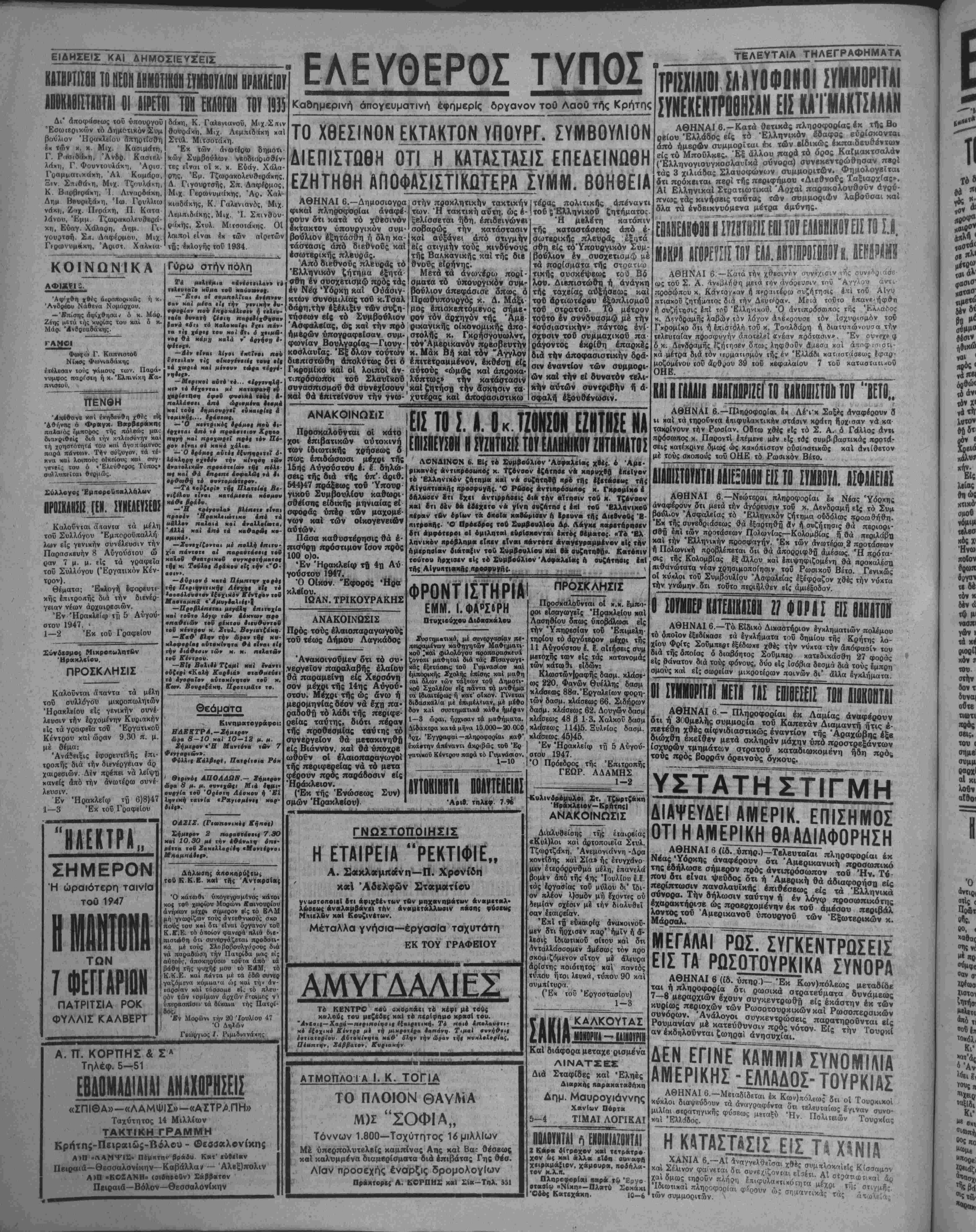 "Αν<αι|—Ζαρά—περιποίι»βΐ| έ{α·ρ·τΐΜΐ). Τό ποιό <π·λαυ·π- ν· ίξβχιηί Κέντρο μΙ τί) μικροτέρα Ιαηάνη. Τιμαί ·»νι)θεΐ| έαπατορίαυ. 4ντ·Νίν«<α Μ·Θ' ο'λ·ν την ώραν ΐήί κυκλελερίοζ, Πέ*. Σάββατον, Κυριακήν ■Κνλινδρβμυλοι £τ. Τς«ρτζ·κη Ηράκλειον—ΚρΛτπςΐ ΑΝΑΚΟΙΝΩΣΙΣ ΑΤΜΟΠΛΟΙ Α Ι. Κ. ΤΟΓΙΑ ΤΟ ΠΛΟΙΟΝ 0ΑΥΛ.Α Μ)Σ "ΣΟΦΙΑ,, Τόννων 1.800—Ταχύτητος ΙίμιλλΙων Μέ ΰπερπολυτβλβΐς καμπίνας Ατις καί Βα: θέσεως καί καλυμμένα διαμβρίσματα διά επιβάτας Γης θεσ. Λίαν προσεχής έναρξις δρομολογΐων ΠρκΜΤορΐ; Α. ΚΟΡΠΗΣ χ«1 £ί«~Τηλ. 351 Διαλυθείσιις τής έΐαψβίας «Κυλ)λοι καί άοτοποιεΐα Στυλ. Τζωρτζάκη, Ανεμογιάννη -Δρα κοντίδης καί Σία» ής έτυγχάνο μέν έτερόορυθμα μέλη, Ιπανελά βομεν άπό τής 4ης Ιουλίου §.ϊ. τάς εργασίας τού ιιύλου δι' ίδι¬ ον πλέον λ)σμόν μή έχοντες ού δεμΐαν σχέσιν με την διαλυθβΐ σαν εταιρείαν. "Επί τ{[ εύκαιρία άνακοινού- μβν δτι τ|ρχισ6ν παρ'ημίν ή 5- λεσις Ιδιωτικοΰ σίτου κοί δτι ανταλλάσσομεν Ιμέσως τόν προ σκομιζομενον σΐτον μέ άλευοα αρίστης ποιότητος καί παντός τύπου ήτοι λβυπά, τύπου 90 καί αυμπίτυοα. (Έκ τού Έργοστασ(ου) 1-3 2ΑΙΙ* ΚΑΛΚΟΥΤΑΣ ΜΒ>Η)ΡΙίΑ — ΙΑΙΜΟΥΡίΗ