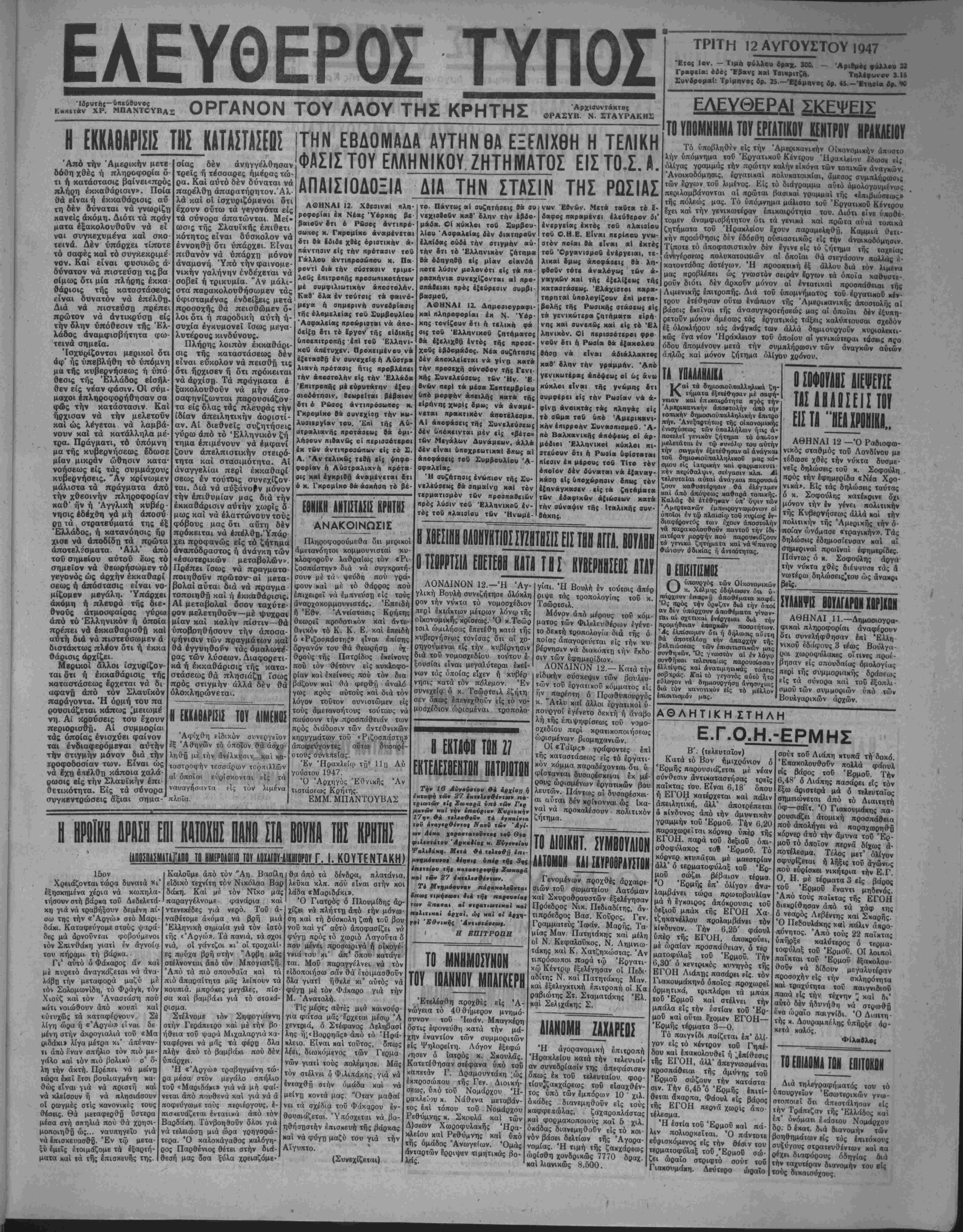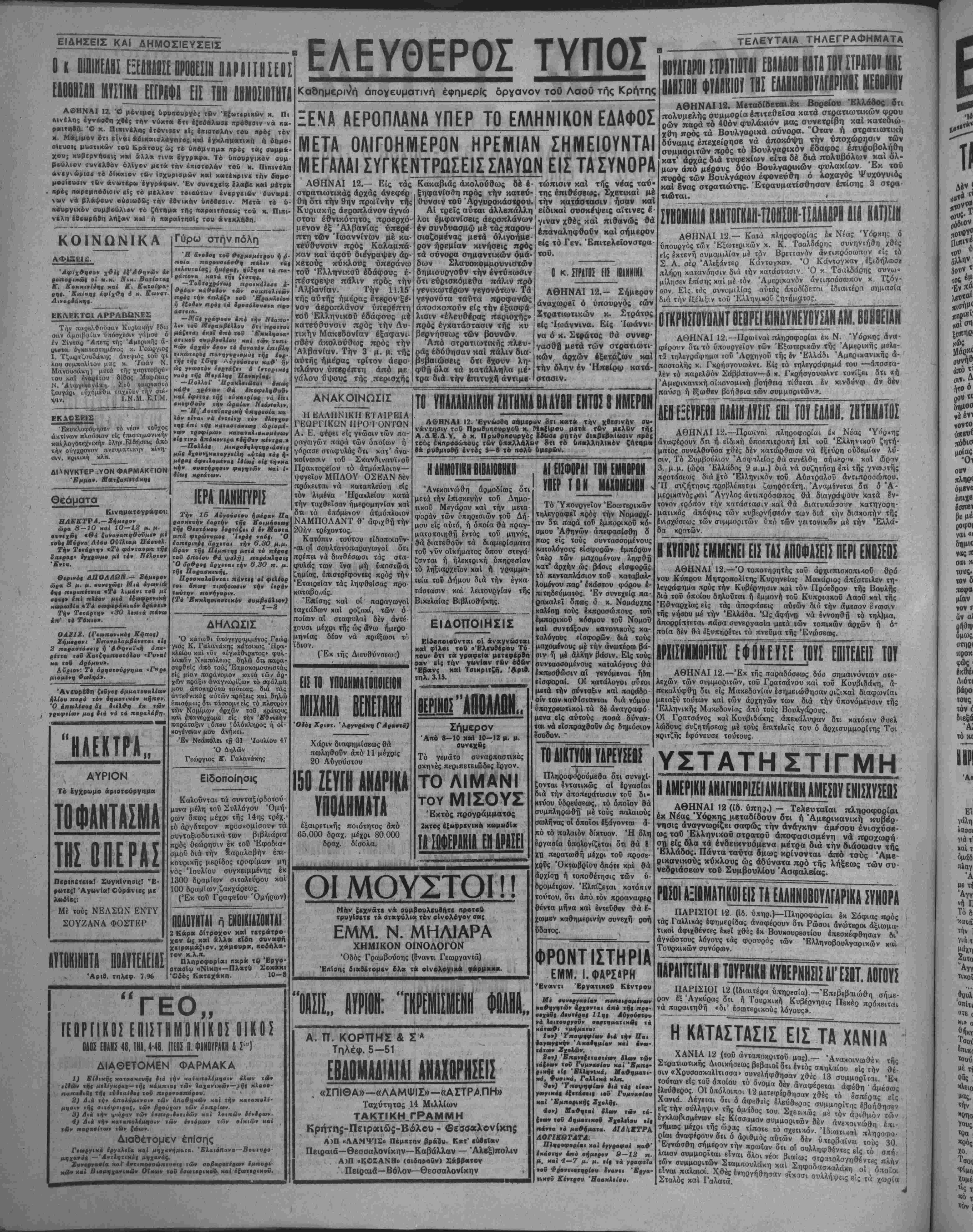 ΥΠΕΡ ΤΩΜΜΧΟΜΕΝΟΝ < Τό Υπουργείον Εσωτερικήν τηλεγραφεϊ πρός την Νομαρχί¬ αν 5τι παρά τοΓι έμπορικοϋ κό- σμου Αθηνών απεφασίσθη δ πως είς τούς συντασσομένους κατολόγους είσφοοών έμπόοων υπέρ των μαχομένων ληφθ^ κατ' αρχήν ώς βάσις εΐσφοράς τό πενταπλάσιον τοΰ καταβαλ- λομένου παρ' εκάστου φόρου ε¬ πιτηδεύματος. Έν αυνεχεία πα- ρακαλεΐ όπως ό χ. Νομαρχης καλέσχι τούς ίκπροσώπους τοΰ ίμηοριχοΰ κόσμου τοΰ Νθμοΰ «αί συντιίξοον κανονικούς κα- ταλόγους εισφορών διά τούς μαχομίνου; μέ την ανωτέρω βά¬ σιν ή μέ άλλην βάσιν. Είς τούς ουνταασομένους καταλόγους θά έκπβσθώσιν αί γενόμεναι ήδη είσφοραί. Οί κατάλογοι ούτοι μετά την σύνταξιν κα'ι παράδο¬ σίν των καθ ίστανται διά νόμου ύποχρβωτικοί τα δέ άναγοαφό μενά είς αύτούς ποσά δύναν¬ ται νά ϊΐσπραχθοϋν ώς δημόσιον Ισοδον. - ΤΟ ΔΙΚΤΥΟΝ ΥΛΡΕΥΣΕΙΙΣ Πληροφορούμεθα δτι συνβχί- ίονται έντατικώς αί εργασίαι διά την αποπεράτωσιν τού δι- κτύου υδρεύσεως, τό οποίον θά συμπληρωθή μέ τούς παλαιούς σωλήνος οί δποΐοι έξάγονται ά¬ πό τό παλαιόν δίκτυον. Ή όλη έργασία ύπολογίζβται ότι θά Ι Χ13 περατωθή μέχρι τοϋ προσε¬ χούς Όκτωβρίου δπότε καί θά αρχίση ή τοποθέιησις των ύ- δρομέτρων. Έλπίζεται κατόπιν τούτου, ότι άπό τόν προαναφερ θέντα μήνα καί εντεύθεν θά ?- χωμεν καθημερινήν συνεχή ροή ΰδατος. Ο ίΚΡΗΣΤΟΥΟΛΝΤ 8ΙΒΡΕΙ ΚΙΝίΥΝΕΥΟΥΣΛΝ <Μ. ΒΟΗΘΕΙΑΝ ΑΘΗΝΑΙ 12.—Πρωιναί πληροφορίαι έκ Ν. Υόρκης 4να· φέρονν 8τπό υπουργείον των "Εξωτερικών τής Άμβρικής μβλβ- χλ τιιλβγράφημα τοϋ Άρχηγοϋ τής έν Ελλάδι Άμερικανικϋς ά- ποστολής κ. Γκρήσγουωλντ. Είς τό τηλεγρα'φημά τού —αποστα¬ λέν το παρελθόν ίάββατον—-4 χ, Γκοήσγουωλντ τονίζβι δτι «ή Άμβρικανική οΐκονομική βοηθεία τίθβται Ιν κινδυνφ άν δέν παύση ή ?ξωί>βν βοή&«ια των συμμοριτών».