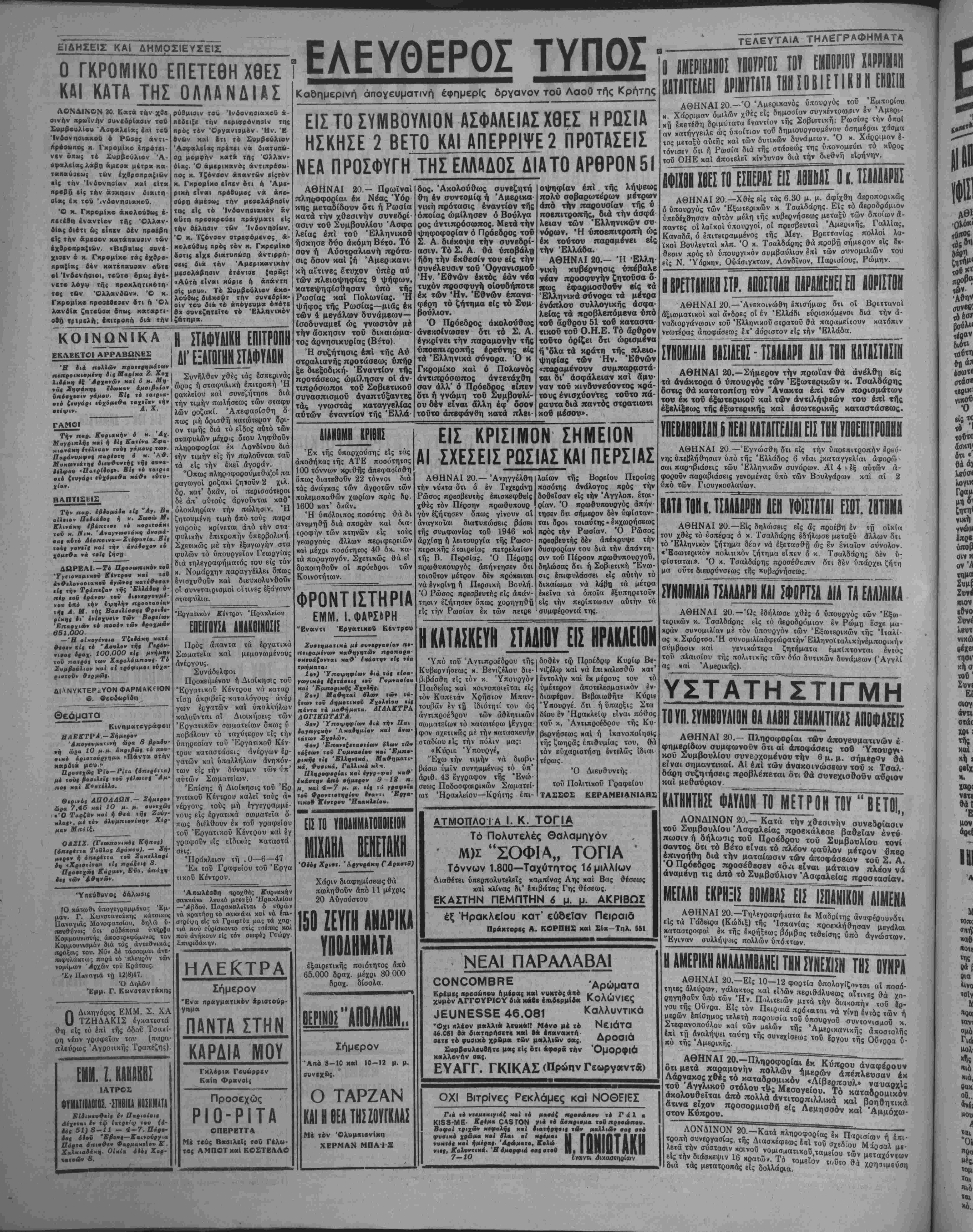 ΑΘΗΝΑΙ 20.— Πληροφορίαι των απογευματινήν ε¬