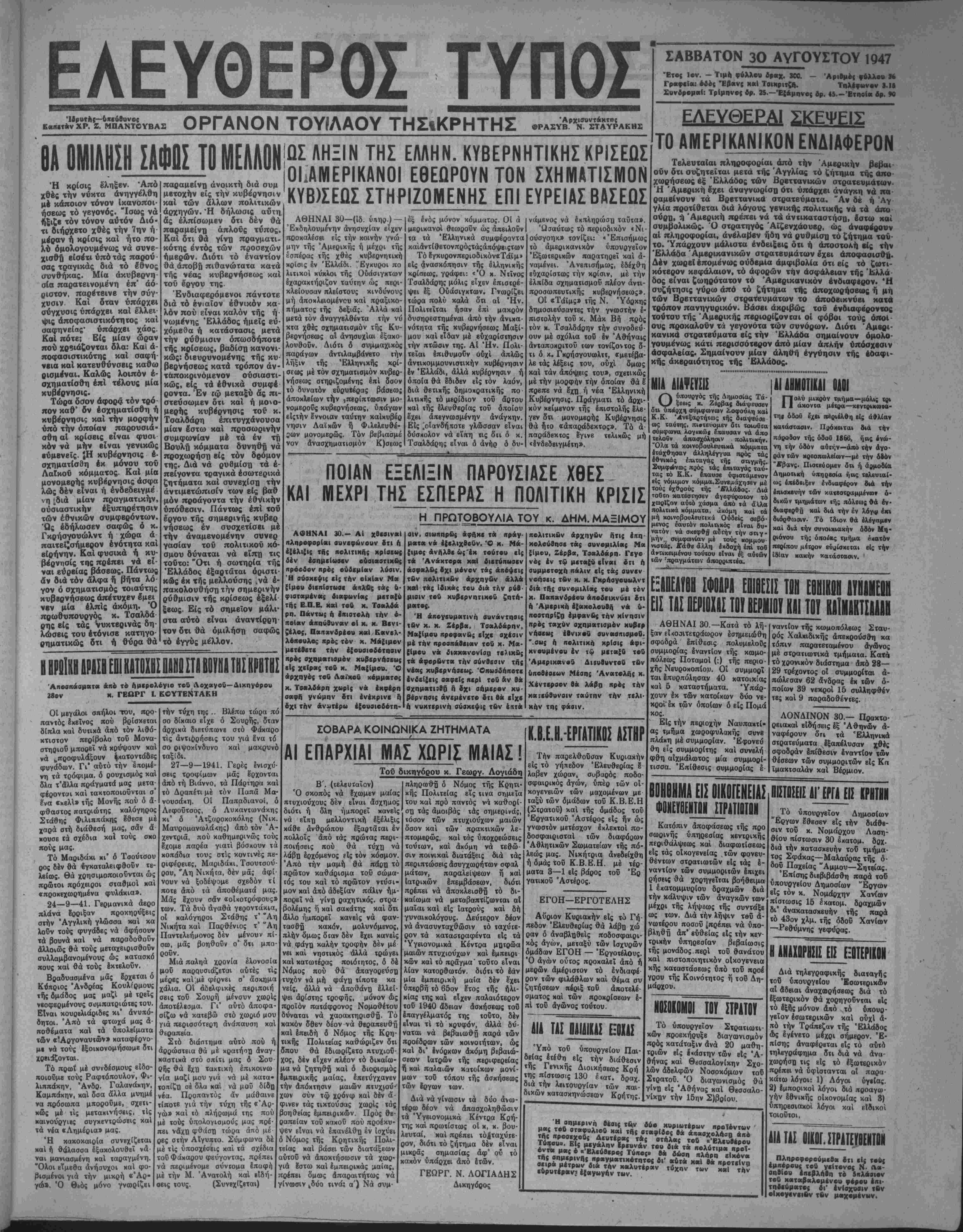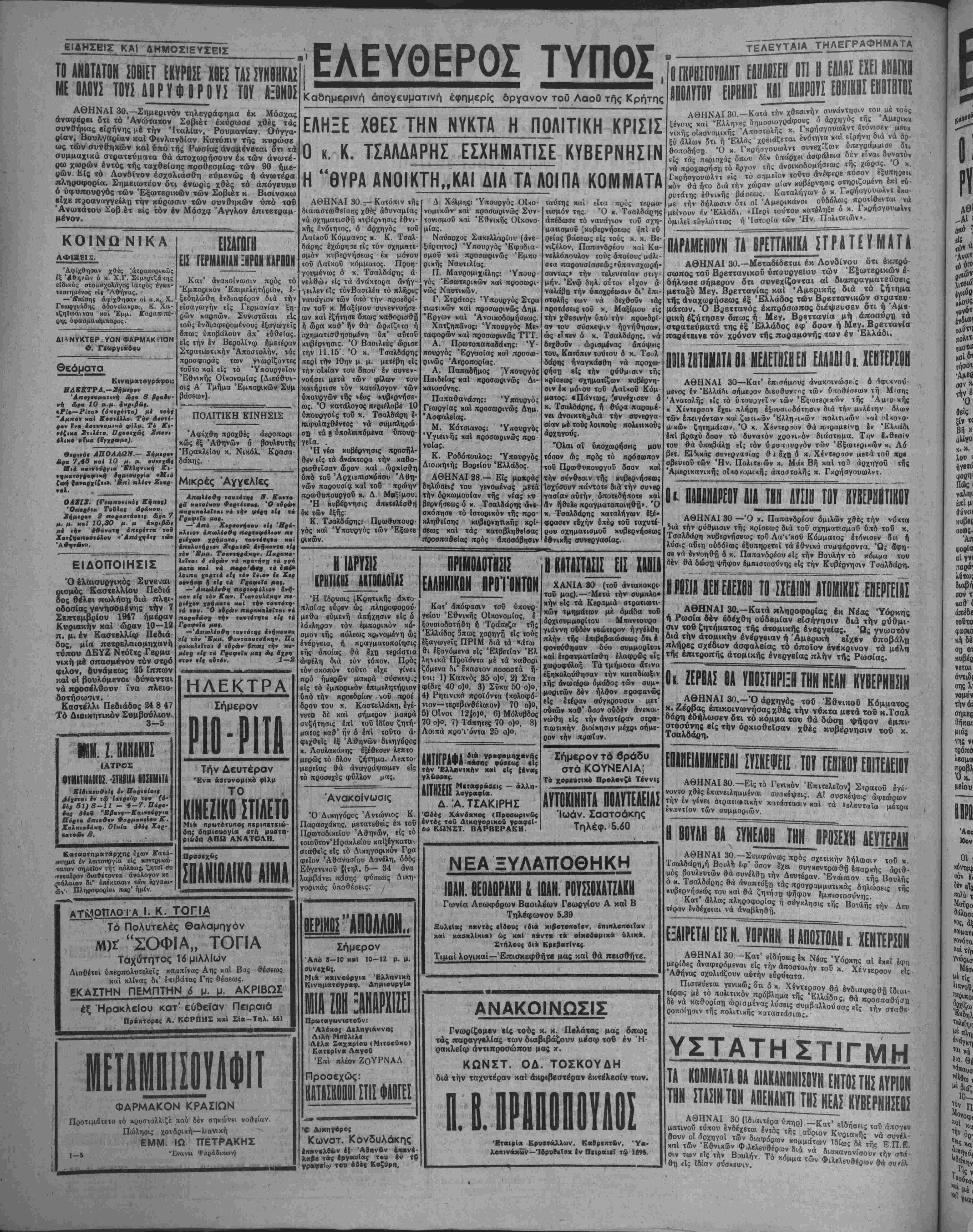 των έπειγόντων κυί ζωτι«<όν ΈλληιΊΗών πολιτικών «αί "1<ονο· μικών ζητημάίων. Ό κ. Χβντβριον θά πιΐραμειν^ Ιν Ελλάδι ίπί βραχύ δσον τό δυνατόν χρονικόν διάστημα. Την 8·θεσίν τού θά ύπαβάλχ) εί; τόν ύρυτιυρ/όν των Έξωιβριχών κ. Λό βετ. ΕΙδιχάς συνβρ/οκτίας ϋι ϊκη ό χ. Χέντβρσον μβτά τοΰ πρε σβευτοϋ των Ήν. Πολιτβών κ. Μάκ Βή χαΐ τού άρχηγοΰ τής Άμεριχανική; οίκονομίζη; αποστολάς χ. Γκρήσγουωλντ. Ο»ΙΤΐΙΐΊΙΙΡΕίΥ III Ι.ΠΤΙΙΒΤΙΥ ΚΥ.ΕΡ8ΙΤΙΙΙΟΥ ΑΘΗΝΑΙ 30 —Ό κ. Παπανδρέου ομιλών χθβς την νύκτα .._ την ρύθμισιν τής κρίσεως διά τοΰ σχηματισμοΰ υπό τοϋ χ. Τσαλδάρη κυβερνήσεως τού Λα'ι'κοΌ Κόμματος ετόνισεν δΊι ή λύσις αΰιη ουδόλως έξυπηρετεΐ τα Ιθνικά συμφέροντα. Ώς βφη· σβ νά Ιννοηθΐ ό κ. Παπανδρέου είς την Βουλήν τό κόμμα τού δέν θά δώση ψήφον βμπιστοσΰνης είς την Κυβέρνησιν Τσαλδάρη. Ι ΡίίΙΙ ΜΒΠίίΠΙΙίΙΙ 1Ι0Ι1ΚΒΙΕΗΕΡΤΕΙΪΙ ΑΘΗΝΑΙ 3Ο.-Κατά πληροφορίας έκ Νέας Υόρκης . 1*ωσία δέν εδέχθη ουδεμίαν είσήγησιν διά την ρύθμι¬ σιν τοΰ ζητήματος τής άτομικής ένβςγείας. Ώς γνωστόν διά την ατομικήν ενέργειαν ή Άμβρική βΐχβν υποβάλη πλήρες σχέδιον ασφαλείας τα οποίον ένέκρινον τα μέλη τής έπιτροπής άτομικής ενεργείας πλήν τής Ρωσίας. Οί. ΖΕΡ1ΛΣ ΟΛ ΥΠΟΣΤΗΡΙΞΗ ΤΗΝ ΝΕΑΝ ΚΥΒΕΡΝΗΣΙΝ ΑΘΗΝΑΙ 30.-Ό άρχηγός τοΰ Έθνικοΰ Κόμματος ΚΛΓΐΓΙΛ 0τΙΊνηΐυι-Λ*ι<η/τη« ..ΑΛ_ ·4|·§ %ί«ί * *— ^— * ΕίΙίΕΙΙΙΜΜΕΙΙΑΙ ΠΙΡΕΙΓ Τί! ΓΕ1ΪΙΚ0Τ ΕΙΙΤΕίΕΐ ΑΘΗΝΑΙ 30-Είς τό Γενικόν Επιτελείον] Στρατοΰ εγέ¬ νοντο χθές έπανειληιιμέναι συσκέψεις. Αί συσχ6ψΒΐς° ά^ώρων την εν γένει θτρατ.αηκήν κατάστασιν χαί τα Κ,λευταια Ζίτοα εναντίον των συμμοριών. βη.β«»αια μετρα ΤΑ ΚΟΜΜΑΤΑ ΟΑ ΑΙΑΚΑΝΟΝΙΣΟΥΝ ΕΝΤΟΣ ΤΗΣ ΑΥΡΙΟΝ ΤΗΝ ΣΤΑΣΙΝ ΤΒΝΑΗΕΝΑΝΠ ΤΗΣ ΝΕΑΣΚΥΒΕΡΝΗΣΕίΣ ΑΘΗΝΑΙ 30 (Ιδιαιτέρα ύπποΐ — οΰ τύπου ένδέχεται ΙΟ ^ σιν των είς την Βουλήν. Τό χόιιαα τΖ Ι1 θΉ είς Ιδίαν σΰσ,βΦΐν. μμ* Των Φι την στά- »ά συνέλ