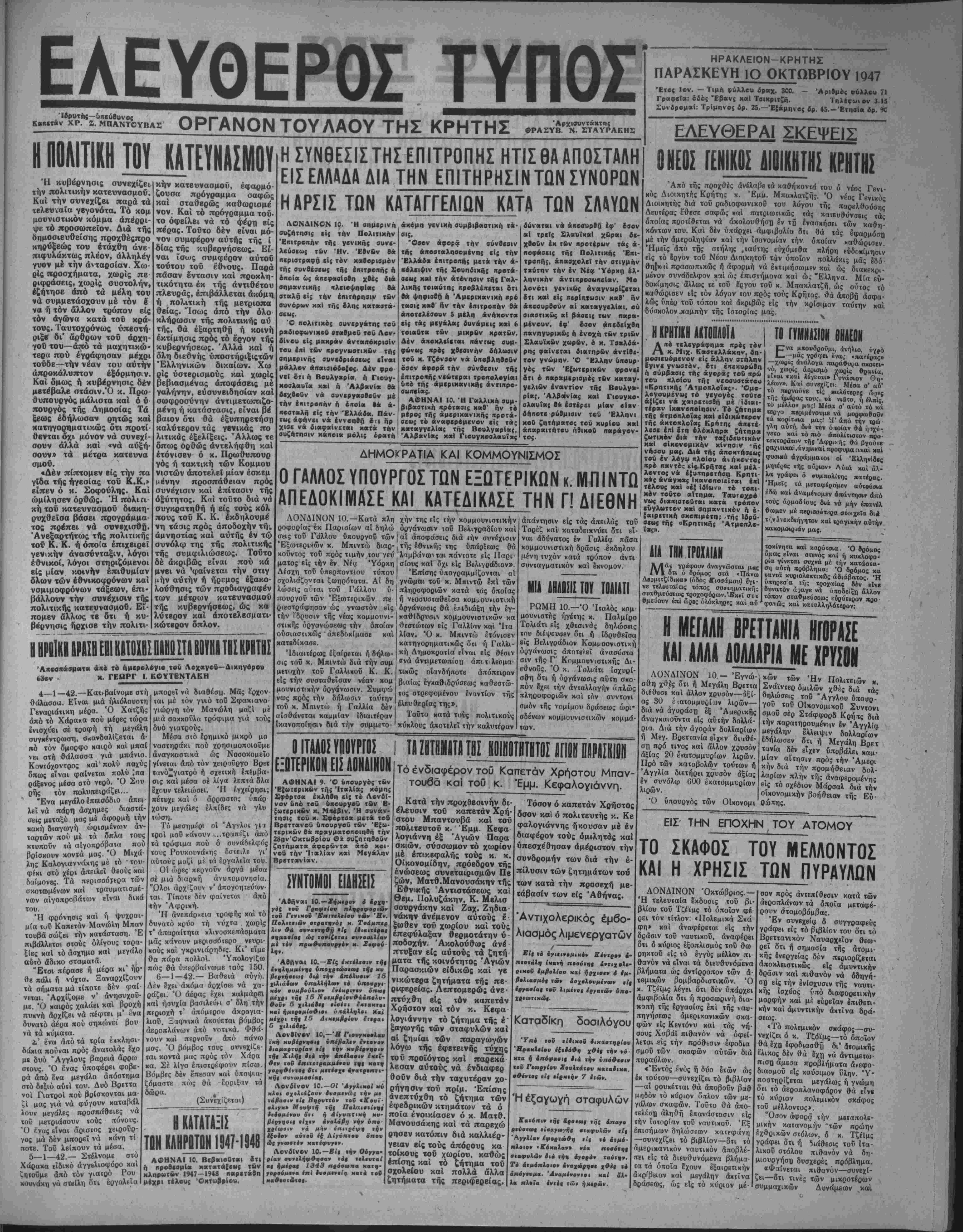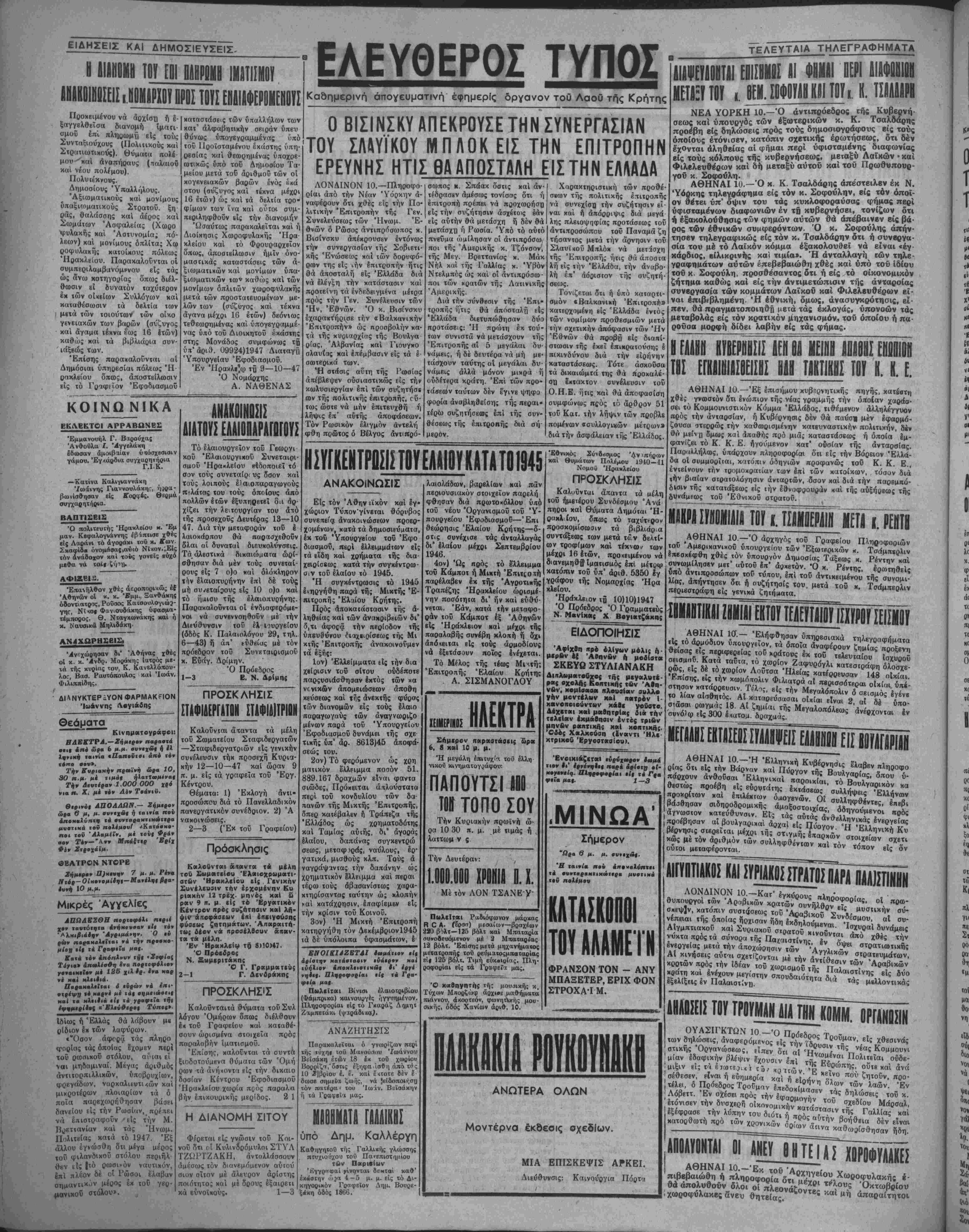 σία τού μέ τό Λαϊκόν κόμμα έξαχολουθβΐ νά είναι <έγ- κάρδιος, βίλικρινής καί τιμία». Ή άνταλλανή των ττιλβ- γραφηματων αυτών έπεβββαιώθη χθές καί υπό τοϋ Ιδίου τοΰ κ. Σοφούλη, προσθέσαντος δτι ή είς τό οικονομικόν ζήτημα καθώς καί είς την αντιμετώπισιν τής άνταρσίας συνβργασία των κομμάτων Λαϊκοΰ καί Φιλελεύθερον εί¬ ναι έπιβεβλημβνη. Ή έθνική, δμως, άνασυγκρότησις, βί- πβν, θά πραγματοποιηθή μβτά τάς εκλογάς, ύπονοών τάς μεταβολάς είς τόν κρατικόν μηχανισμόν, τοΰ όποίθυ ή πά- ρούσα μορφή δίδει λαβήν είς τάς φήμας. 1ΕΛ1ΗΗ ΚΥΙΗΙ.Ι ΛΕΗ ΟΑ ΗΕΙΗΙΙΒΙΟΗΙ ΕΗ.ΗΙΙΗ III ΕΠΙΙΙίΙΙΙΙΙΙΙΙ ΙΑί ΤΙΚΙΙΚΗΙ ΤΟΥ Κ. Κ. Ε. ΑΘΗΝΑΙ 10.—Έξ επισήμου κυβϊρνητικης πηγής, κατέβτη χθές γνωστόν δτι Ινώπιον τής νέας γραμμής την οποίαν χαράσ· σβι τό Κομμουνιστικήν Κόμμα Ελλάδος, τιθέμβνον αλληλέγγυον πρός την άνταρσίαν, ή Κυβέρνησις δέν θά παυσι μέν εφαρμό¬ ζουσα οτερρώς την καθωρισμένην κατβυναστικήν πολιτικήν, δέν θο μΐΙχγ δμως καί άπαθής πρό μια; καταστάσεως ή δποία ίμ- φανΐζει τό Κ. Κ. Ε. ήγουμενον κατ' θυσίαν τής άνταρσίας. Παραλλήλως, ύπάρχουν πληροφορίαι ότι είς την Βόρειον 'Ελλα'· δα οί συμμορΐιαι, κατόπιν όδηγιών προφανώς τοΰ Κ. Κ. Ε., έντείνουν την τρομοκρατίαν των Ιπί των κατοίκων, τόσον διά ιί|ν βιαίαν σΐρατολόγησιν άνταρτών, δσον καί διά την παρβμπό- δισιν τής κατατάξεως είς ιήν έ&νοφρουράν «αί τής αΰξήρβως τής δυνάμεως τοϋ Έθνικοϋ στραΐοΰ. ΐιΐΜ ιυΙΠυΊΠΙπ^ΜΙΙΓι ΑΘΗΝΑΙ 10— Ό άρχηγός τοΰ Γραφείου Πληροφοριών τού Αμερ,κανικου υπουργείον των Εξωτερικών -. Τσάμπβρλιν επεσκέφθη χθες τον υπουργόν Δημοσίας Τάξεως κ Ρβντην -; Έθνικός Σύνδίσμος Άν ηρ καί θυμάτων Πηλέμου 1940—41 Νομπϋ Ήοΐίχλείου ΠΡΟΣΚΛΗΣΙΣ Καλοΰνται άπαντα τα υέλη τοΰ ήμβτέρου Συνδέσμου Άνά πηροι καί θύματα Δημόται Ή- ρακλ ίου, δπως τό ταχύτερον προσκομίσωσιν τα βιβλιάρ.α συντάξεως των μετά τάν δελΐί- ων τροφίμων καί τέκνω.· των μέχρι 16 έτών, προ κειμένου νά, —--■■ *--» --■ ""^«νι^' ίΛ·ιαυι διανεμηθ^Ιματισιιός επί μέτρψ συνωμίλησεν μβτ' αυτού έ«* αρκετόν, κατόπιν τοΰ ύπ' αριθ. 5350 έγ γράφου τής Νομαοχίας Ήρα χλβίου. Ήροίκλειον τδ 10)10)1947 Ό Πρόεδρος Ό Γραμματεύς Ν. Μβνίκβις Χ Βονι«τζ«κης ΕΙΔΟΠΟΙΗΣΙΣ Άφίχβπ κρβ όλίγΜν μόλις ή μερΒν έ{ Άβανβν η μβίίστ* ΣΚΕΥΩ ΣΤΥΛΙΑΝΑΚΗ Διηλα>μοιτ·ΰχβς της μεγαλυτέ¬