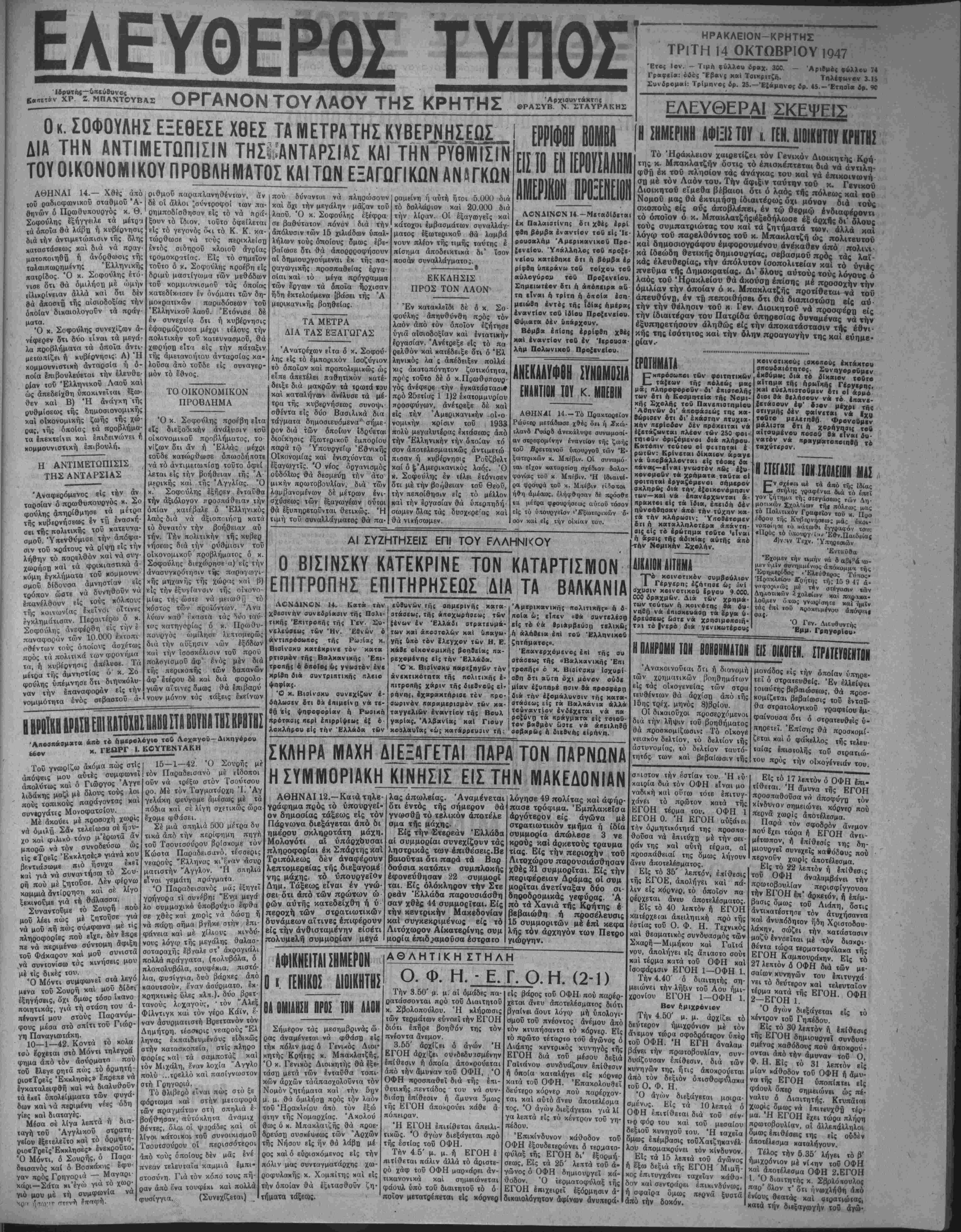 Την ΖΙέμπτβνι <Ό Γυιος ΐ·ΰ Ζ7άθου|». ©ΕΑΤΡΟΝ ΝΤΟΡΕ Σήμερον άπογευματινή 7.45 μ.μ εΐ| την απογευματινήν παράβταοιν θά ·Ίανεμηθάΐ·ιν τα κάτωθι 4ώρα άνευ οΰίΥμιδ· νπερπμήβΐως 1) ζενγοε ύηοΐημά'ων Ταούμηα, 2) έρώματα «Ε'ακ ΓκΓκβ 3) παιίικβ φου·τάνι οίκον Φρανκιαδακη 4) 1 Τούρια Άδαμι, 5) 1 φανέλλα καταατήματοε Χαιζηϊαάννον. Βραδύνη 10 μ,μ, ανευ Λάρα* ίια νανιβμας ώβοΐιιατέοου εταιΐιοθ έπαθλον 100.000 αυριον νέον ηρόγραμμα. ΧΕΙΜΕΡΙΝΟΣ ΗΑΕΚΤΡΑ Σήμερον παραστάοει; ϋρα έ, 8 καί 10 μ. μ. Ένα πρωτοφανές θέαμα; 1.000.000 ΙίΡΟΚΙΑ 0.1 Μέτούς ΒΙΚΤΩΡ ΜΑ- ΤΣΙΟΥΡ ΚΑΡΟΛ ΛΑΝΤΙΣ Την Πέμπτην: Τό άχώριστο ζευγάρι ΧΟΝΔΡΟΣ καί ΛΙΓΝΟΣ ΤΑΚΟΥΤΣΟΥΡΑ III ΟΞΦΟΡΔΗΣ ΙΙΡΪΙΤΕ τβ* *ΡΥ«οΙ"ί τβυ παρά ΠΤΑΙίΧ πϊ(τ·ιρ«μίνης διβαοχα- λίσοης ΦροντιβτΑριβν Γαλλι¬ κής γλώσσης δια μαθητάς Δπ- μοτικνν Σχολϊίων καί Γυμνα- αίων. Μίβοδος /ιρακτικη κ«1 Α- αφαλής διά γενικήν έκμάβπ- βΐν τής Γαλλικής γλώββης. Δι (ύθυναις: Ό66; Σελίνου αριθ. 7 (ίναντι Ίντριίου ίατρβΰ κ. Ζ. Ββνρι(βικη). Μ)3 ΒΕΛΟΣ" ΑΝΑΧΩΡΕΙ ΕΝΤΟΣ ΤΗΣ ΕΒΔΟΜΑΔΟΣ Κατ' ευθείαν: ΠΕΙΡΑΙΑ ΒΟΛΟΝ -ΘΕΣΣΑΛΟΝΙΚΗΝ δεχόμενον έμηορευμαται. ΠΡΑΚΤΟΡΕΣ ΑΥΡ. Γ. ΑΡΓΥΡΗ& Υΐού Τηλίφ. 5.88 ΕΛΑΙΟΥΡΓΕΙΟΝ ΜΑΚΡΑΚΗ (Χανίων Πόρτα) Τβ '£λαι·υργ·Γ·ν Μακράκι; μΐ χά γνωΐια άνγλικα ΰΐρανλι- κό τού έλαιοπιεβτήρια, άνβΐΜοΙαμηθΐν έκ θεμελίων καί πλου ΐιοθέν μέι Νέας μηχανάς, Νέον έλαι-όμυλον ΝΕΑ ΕΛΑΙΟΠΑΝΑ Αποθήκας έλαιων Ιια κιίθ» πελάτην τού. "Δφθονο {εοΐ· νιρό Ίά θέρμιομα. 'ζ έί ό 20 ΟκτωβρΙου Οί παλαιοΐ καί νέαι πελάται τού θα Την παλαιάν πρόθυμον εξυπηρέτησιν, Ταχΰτητα, τιμιότητα καί επί πλέον καλΰτερην απόδοσιν λό¬ γω ουγχρονισμένων έγκαταστάσβων. ΕΛΕΥΘΕΡΟΣ ΤΥΠΟΣ Κα5ημερινή άπογευματινη εφημερίς δρ/ανον τού Λαοϋ τής Κρήτης ΝΕΑ ΔΙΠΛΩΜΑΤΙΚΗ ΗΤΤΑ ΤΗΣ ΡΟΣΙΑΣ ΑΠΕΡΡΙΦΘΗ Η ΡΩΣΙΚΗ ΠΡΟΤΑΣΙΣΔΙΑΤΗΣ ΟΠΟΙΑΣ ΑΠΟΔΙΔΟΝΤΑΙ ΕΥΘΥΝΑΙ ΕΙΣ ΤΗΝ ΕΛΛΑΔΑ ΑΘΗΝΑΙ 14.- Τηλβγρα φοΰν έκ Νεας ΎόρΜης ότι κατά την χθεσινήν συνεδρί ασιν τής Πολιτικής Έπιτρο πής των Ήν. Εθνών ή Ρω σική πρότασις περί έπιρρί ψεως των εΰθυνών διά την έν Ελλάδι κατάστασιν είς την Ελληνικήν κυβέρνησιν καί άποχωρήσεως των έν Ελλάδι ξένων στρατευμά- των απερρίφθη καί είς τό σύνολον της διά ψήφων 40 έναντι 6. Προηγουμένως ή ιδία πρό τάσις ψηφισθεΐσα αρθρον πρός άρθρον απερρίφθη επί σης. Ό Ρώσος άντιπροσω πος εζήτησεν νά εφαρμοσθή ή δι' όνομαστικής κλήσεως ψηφοφορία ήτις καί έφηρ- μόσθη. Διά τοΰ τρόπου τού - τού ό Ρώσος άντιπρόσωπος έπεζήτησε νά έκβιάσχι τα κράτη έκεΐνα τα όποΐα συν- δέονται δι' οικονομ ικώ ν συμφερόντων μέ τάς δυτι- κάς δυνάμεις καί συγχρόνως τελοΰν υπό Σοβιετικόν εκ φοβισμόν. Τούτο επέτυχε έν μέρβι μόνον,άποσχόντων της -ψηφοφορίας των Σκαν δινβυϊκών «ρατών. Ό άντιπρόσωπος τής Μ. Βρεττανίας^ «· Μάκ Νήλ λα¬ βών τόν λόγον ολίγον πρό τής ψηφοφορίας ετόνισεν ό¬ τι ή παρουσία είς την Έλ- λάδα των Βρεττανικών οτρα τευμάτων δέν αποτελεί κίν δ'υνον διά την Βουλγαρίαν Αλβανίαν καί Γιουγκοσλαυ- ΐαν. «Πάντως συνέχισεν ό κ Μάκ Νήλ ή Μεγ. Βρετ τανία είναι πρόθυμος νά συ ζητήσυ οιανδήποτε πρότα σιν τής Ρωσίας επί τού θε- ματος τής όριστικής έξ Έλ λάδος άποχωρήσεως των Βρβττανικών στρατβυμά των». ΑΘΗΝΑΙ 14.- Οί άμβρι- κανικοί δημοσιογραφικοί κύ κλοι κρίνοντες την διά συν- τριπτικής πλειοψηφίας α¬ πόρριψιν τής Ρωσικής προ τάσεως άποφαίνονται δτι ά- |πεδείχθτι διά μίαν φοράν ά- |κόμη ή σταθερά υπέρ τής Ελλάδος πλειοψηφία των Ήν. Εθνών ήτις «αί εση¬ μείωσεν πάλιν διά την Ρω- σίαν καί τόν κ. Βισίνσκυ μί αν νέαν διπλωματικήν καί ηθικήν ήτταν. ΑΡΧλΙΡΕΣΙλΙΣΥΝΔΕΣΜΟΥ 
