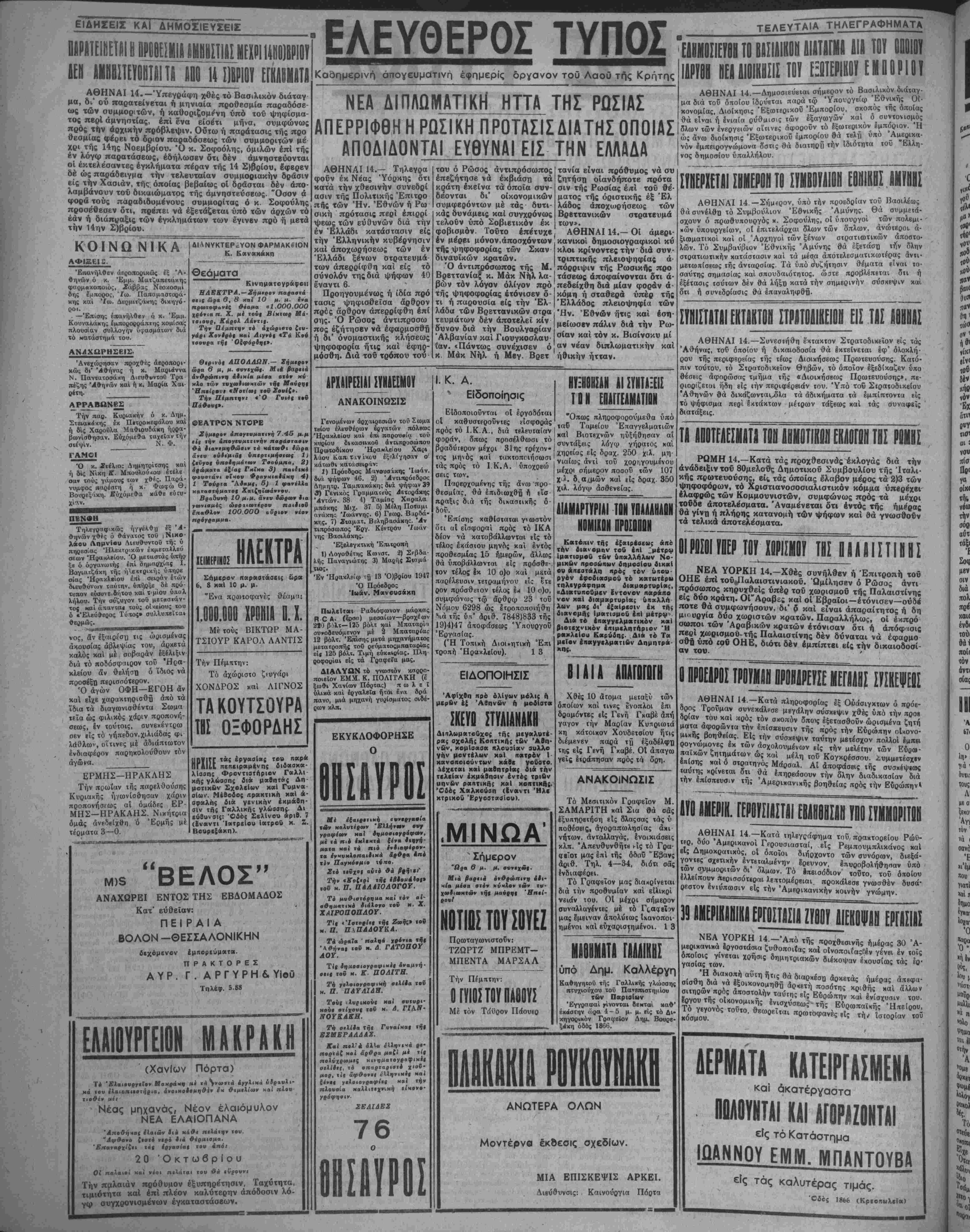χ<λ. δ.αχμών καί είς δραχ 350 χιλ. λόγω ασθενείας. ΔΙΑΜΑΡΤΥΡΙΑΙ ΤΩΝ ΥΠΑΑΛΗΑΟΝ ΝΟΜΙΚΩΝ ΩΡΩΣΟΠΩΝ 'Αφίχβη κρύ όλίγΐίν μβλις η μερ&ν έ£ "Αθηνών (ι μοοίστβ ΣΚΕΥΩ ΣΤΥΛΙΑΝΑΚΗ μχ; της μεγαλυτέ¬ ρας βχολής Κοκτική; των 'ΑΘη- ν&ν, κομΐοβιβα ιτλβυσίαίν ουλλο γήν μοντέλνν καί Λβτρβν Ι καινοιιοιβύντΗν χάΒΐ γβθοτο. Λέχιται κ«1 μαθητρίας διά την τελείαν έκμάβηοιν έντός τρι&ν υην&ν ραητΐΜής κ»1 ΜβκτικΑς. 'Οίές Χαλκοώση (Ιναντι Ήλι χτρικοΰ 'Εργβσταβίου). ΜΙΝΩΑ ^ Σήμερον "Ωρα β μ. μ. Μιά βαρεία ανθρωπίνη «Ιι· χία μέοα ατόν κύκλον ι«όν τιι- χωδιαΐΜΐήίν <ή| μανρηι Ήπεί- ρανΐ ΗΟΤΙΟΣ ΤΟΥΣΟΥΕΖ Πρωταγωνιστοϋν: ΤΖΩΡΤΖ ΜΠΡΕΜΤ- ΜΠΕΝΤΑ ΜΑΡΣΑΛ Την Πέμπτην: Ο.ΥΙΟΣΤ0ΪΗΑΟ0ΥΣ Μέ ΐόν Τάϋρον Πάουερ Κατόπιν τής έ£αιρέαε»ς « τλν ο·««βμπν τοΰ έτΐ '.μέτρφ ίμαιτιομοϋ τ&ν υπαλλήλΜν Νο- μΐΜΜν κρβαώηοιν δημοσίου 4ι«αΙ ου «ηεστάλπ κρός των υπου¬ ργόν έφοοικσμοϋ τό χατΝτέρΜ τηλεγράφημα διαμκρτυρία;, «Δι«τυηοΟμΐν Ιντονον «αρβπο νόν «αί ίιαμαρτυρίας ΰηυιλλή λ«ιν μας ύι' έ£κ!ρεσιν έκ τή; βικνβμής ΙμβτιαμοΟ έηΐ μίτρω< Διά τβ έποιγγιλμβτΐΜον κβΐ βιβτεχνΐΝόν έχιμιλητήριον Ή ρχλείθϋ Καρύδης. Δι* τβ Τα μιΐον 2η«νν*λμκτιβν Δημήτρ» ΗΠί. Ι ΑΙ Λ ΑΠΑΓΟΓΟΓΗ Χθές 10 άτομα μειαξΰ των οποίων καί τίνες ενοπλοι επι δραμέντες είς Γενή Γκαβέ άπή γαγον ιήν Μαρίαν Κυπριωιά κη κάτοικον Χουδετσίου ήτις διέμενεν παρά τϋ έξαδέλφχι της είς Γενή Γκαβέ. ΟΙ άπαγω γεΐς έτράπησαν πρός τιΐ όρη. ΑΝΑΚΟΙΝΩΣΙΣ Τό Μεσιΐικόν Γραφείον Μ. ΣΑΜΑΡΙΤΗ χαί Σία θά σάς εξυπηρετήση είς δλαςσας τάς ύ ποθέσεις, άγοραπωλησίας άχι νήτων. άνταλλαγάς, ένοικιάσεις κλπ. Άπευθυνθήτβ είς τό Γρα- 9β'οτ μας επί τής δδοϋ "Εβανς αριθ. Τηλ. 4—34, διότι σδς ένδιαφέοει. Τό Γραφείον μας διαπρίνεται διά την προθυμίαν καί εΐλΐχρί νβιάν τού. Οί μέχρι σήμερον ουναλλαγέντες μέ τό Γραφείο μας εμβιναν απολύτως Ιχανοποι ημένοι καί εύχαβΐστημένοι. 1 3 ΜΑΒΗΜ1ΤΑ ΓΑΑΑΙΚϋΐ υπό Δημ. Καλλέργη Καθηγητού τής Γαλλικής γλώσσης πτυχιούχου τοΰ Πανεπιστημίου των Παριοίιιν Εγγραφαί γίνονται Βεκταί καθ' έχάστην ώρα 4-5 μ. μ. είς τό Δι- κηγορΐΜΟν Γοπφβϊον Δημ. Βουρε ξάχη όδός 1866. ΑΝΩΤΕΡΑ ΟΛΩΝ Μοντέρνβ έκθεσις σχεδίων. ΜΙΑ ΕΠΙΣΚΕΨΙΣ ΑΡΚΕΙ. Διεύθυνσις: Καινούργια Πόρτα ___________ΤΕΛΕΥΤΑΙΑ ΤΗΛΕΓΡΑΦΗΜΑΤΑ Ε11ΙΊΟΙΙΕΥΒ110 ΒΛΣΙΛ1Κ0Π1Ι1Τ1ΤΜΙ III ΤΟΥ 00010! ΠΕΙ1ΑΙΒΙΚΗΣ1Σ Τ01Γ ΕΞΟΤΕΡΙΗΟΤ Ε Μ Ο Ο ΡΙΟ Τ ΑΘΗΝΑΙ 14 - σήμερον όν διάταγ- ώ; άνω διοίκησις Έξρ μρ νόν έμπειρογνωμονα δσττς θά διατηρΐι την νος δημοσίου ύπαλλήλου. ΑΘΗΝΑΙ 14 —Σήμερον, υπό τί|ν προεδρίαν τοΰ Βασιλέως θάσυνέλθθ τό Συμβούλιον Έθνικης "Αμύνης. Θά_ συμμετά- σχουν ό πρωθυπουργός μ. Σοφούλης, ο! υ/,ουργοι των πολεμι- «ών υπουργείων, οί επιτελάρχαι δλων των όπλων, α_νωτεροι. α- ξιοοματτκοί καί οί Άρχηγοί των ξένων στρατιωτικών άποστο· λών. Τό Συμβαύβιον Έθνικής Αμύνης θα εξετάση τίιν όλην στρατιωτικήν κατάστασιν καί τα μέαα άποτελεσματικωτέρας αντι- μετωπίσεως τής άνταρσίας. Τα υπό συζήτησιν θέματα είναι το¬ σαύτης σημασίας καί σηουδαιότητος. ώστε πθθβλέπεται δτι ή έξέτασις τούτων δέν θά λήξτι κατά_τήν σημερινήν σύσκεψιν και ότι ή συνεδρίασις θά επαναληφθή- ΙΤΗΙΠΙΤΙΙΕΚΤΜΤΟΗΙΐΡΙΤίΜΙίΗΕΙΠΙΙΙίΙίΣ ΑΘΗΝΑΙ 14.—Συνεστήθη έκτακτον ΣτρατοδικΕΪον εις τάς Αθήνας, τοϋ όποίου ή δικαιοδοσία θά βκτείνεται Ιφ' ολοκλή¬ ρου τής περιφερείας τής τέως Διοικήσεως Πρωτευούσης. Κατό¬ πιν τούτου, τό Στρατοδικείον Θηβών, τό οποίον έξεδίκαζεν υπο θέσβις άφορώσας τμήμα τής «ΔιοικήσΒως Πρωτευούσης», πε- ριοριζεται ήδη είς ιήν περιφέρειαν τού. Υπό τοϋ Σιρατοδικείου "Αθηνών θά δικά