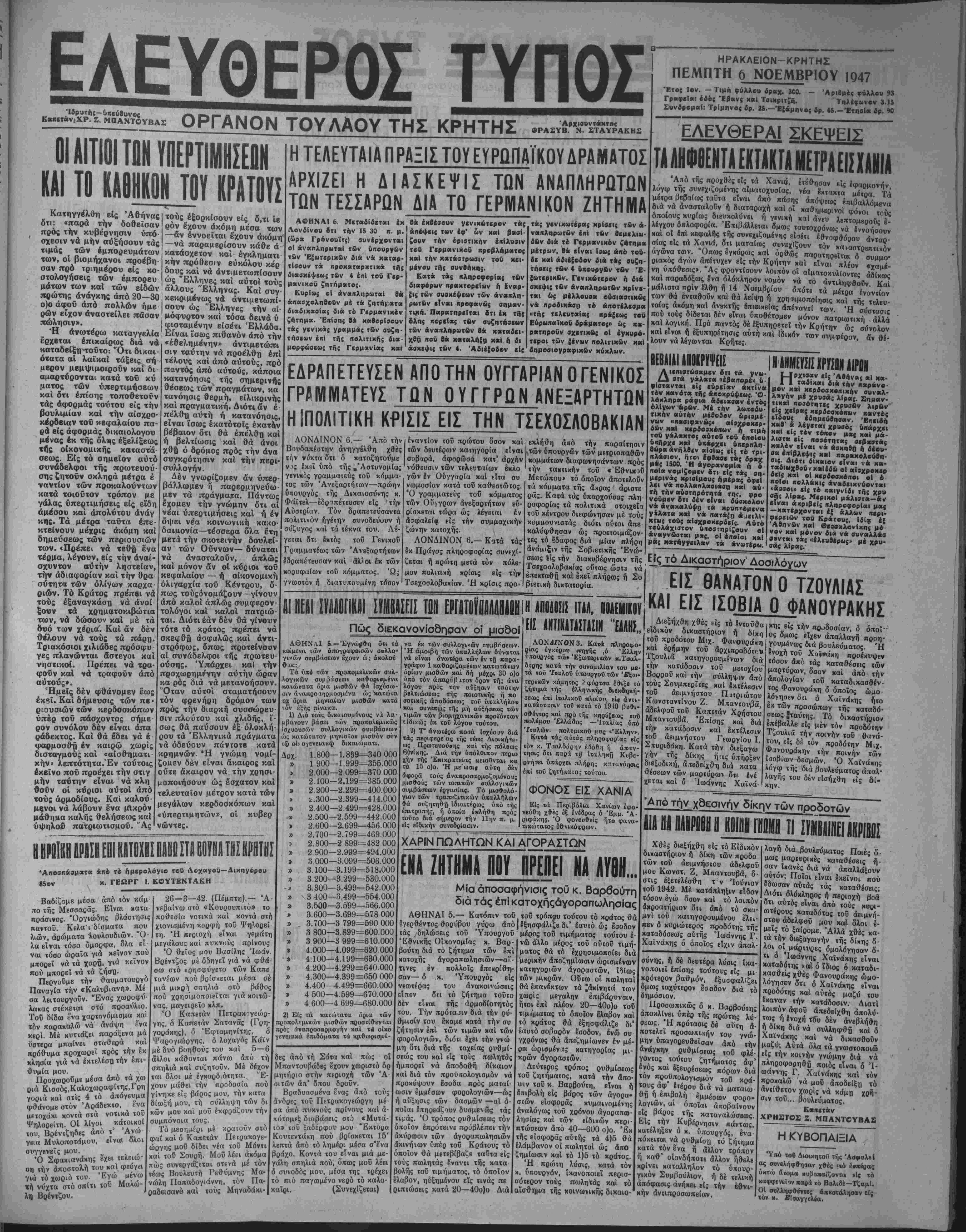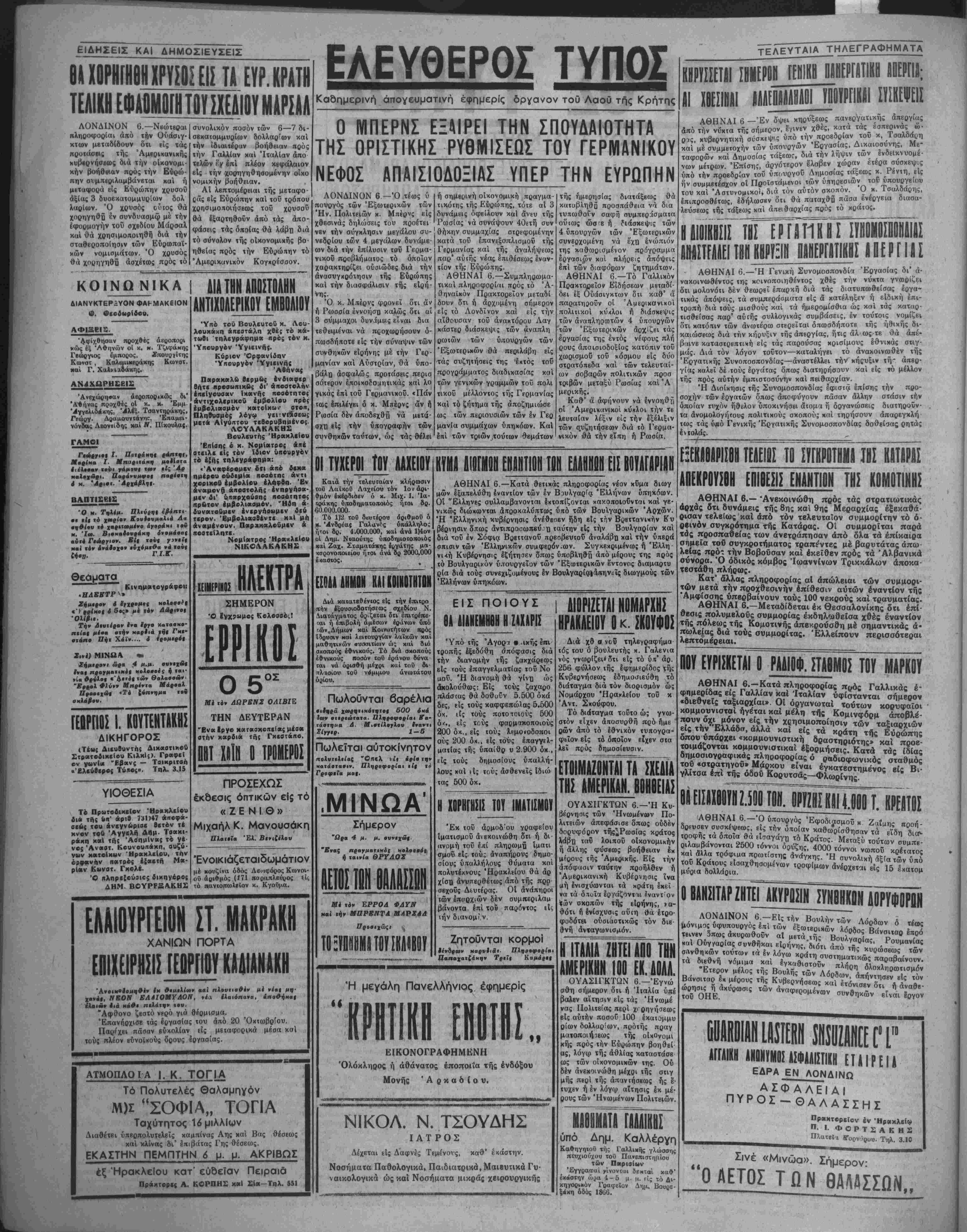 πολυτελείας "θη«λ είι <ρί· την κατάοτανιν. Πληροφορίαι ·ί| τό Γραφεΐα μα|. Σήμερον "βρα 4 μ. μ. ουνεχοϊι ργ·ΜΟ( Μθλοοοόι ή ταινία ΘΡΥΑΟΣ Μέ τόν ΕΡΡΟΔ ΦΛΥΝ καί «ήν ΜΠΡΚΝΤΑ ΜΑΡΣΑΛ ΚΙΝ1ΔΙΙΟΗ ΕΙΙΙΙΙΤΙίΗ 1ΕΑΛΙΙΗΙ ΕΙΙ ΙΟΙΑΠΡΙΙΗ ΑΘΗΝΑΙ 6.—Κατά θβτιχάς πληροφορίας νέον χΰμα διωγ μών έξαπελύθη εναντίον των έν Βουλγαρία Έλλήνων δπηκόων. Οί "Ελληνες συλλαμβανονται Ιχτοιτίζονται χακοποιού'νται καί γε¬ νικώς διώκωνται απροκαλύπτως υπό των Βουλγαοιχών Άρχών. 'Η Έλληνική κυβέρνησις ανέθεσεν ήδη είς την Βρβττανικήν Κυ βέονησιν όπως άντιπροοωπεύ1^) ταύτην είς την Βουλγαρίαν καί διά τοΰ έν Σόφια Βρβττανοίί πρεσβευτού αναλάβη καί την ύπερά σπισιν των Έλλη.νικών συμφέρον.ών. Συγκεκριμένως ή Έλλη νι<ή Κυβέρνησις εζήτησεν δπως ύποβλη9{ί άΐτό μέρους της πρός τό Βουλγαρικόν υπουργείον των Εξωτερικών εντονος διαμαρτυ ρία διά τούς συνεχιζυμένους έν Βουλγαβίαιάπηνίϊς διωγμούς των Έλλήνων ύπηκόων. ΕΙΣ ΠΟΙΟΥΣ Θλ ΑΙΑΝΕΜΗ6Η Η ΖΑΧΑΡΙΣ Υπό τής Άγορι · ιΐκής επι τροπής εξεδόθη απόφασις διά την διανομήν ιής ζακχάρεως είς τούς έπαγγελματίας τοΰ Νο ιιοΰ. Ή διανομή θά γίνχ) ώς ακολούθως: Είς τούς ζαχαρο πλάσΐας θά δοθυύν 5.500 οκά δες, είς τούς καφφεπώλας 5.500 όχ. ιΐς τούς ποτοιοιούς 500 ό<·, είς τούς φαρμαχοποιούς 200 δκ., είς τούς λεμονοδοηοι ούς 200 όχ., είς τούς έπαγγελ- ματ(ας τής ύπαίθρ υ 2.900 δκ , είς τούς δημοσίους ύπαλλή- λους χαΐ ιίς τού; άσθενεΐς Ιδιώ τας 500 δκ. Η ΧΟΡΗΓΗ-ΙΣ ΤΟΥ ΙΜΑΤΙΣΜΟΥ Έκ τού άβμοδ'ου γραφείου ίματισμοΰ ανεκοινώθη δτι ή δι ιινομή τοϋ έ^τί πληρωμχ) ίματι σμοϋ είς τούς αναπήρους δημο¬ σίους ύπαλλήλους θύματα καί πολυτέχνους "Ηρακλείου θά άρ χίσΰ ανυπερθέτως άπό τής προ σεχοΰς Δίυτέρας. Οί άνάπηροι των Ιπαρχιών δέν συμπεριλαμ βάνοντα επί τοδ παρόντος είς την διανομί ν. Ζητοϋνται κορμοί ρ καρυΐιβι. Πληροφορίαι Παπαχατζάχην Τρ·ΐ| Καμάρει Ή μεγάλη ΠανεΑλήνιος εφημερίς Ι.. ΕΙΚΟΝΟΓΡΑΦΗΜΕΝΗ Όλόκληρος ή άθάνατος έποποιΐα τής ενδόξου Μονής 'Αρκαδίου, ΝΙΚΟΛ. Ν. ΤΣΟΥΔΗΣ Ι ΑΤ ΡΟΣ Δέχεται είς Δαφνές Τεμένους, καθ* εκάστην. Νοσήματα Παθολογικά, Παιδιατρικά,Μαιβυτικά Γυ- ναικολογικά ώς καί Νοσήματα μικράς χειρουργικής ΑΙΟΡΙΖΕΤΑΙ ΝΟΜΑΡΧΗΝ ΗΡΑΚΛΕΙΟΥ Ο κ. ΣΚΟΥΦΟΣ Διά χθ Ο νοΰ τηλεγραφήμα τος τού ό βουλευτής χ. Γαλενια νός γνωρΐζει» δτι είς τό ύ/ι' άρ. 256 φύλλον τής εφημερίδος τή; Κυβερνήσεως έδηαθιΐιεύθη τό διάταγμα διά τόν διορισμόν ώς Νομάρχου Ηρακλείου τού κ Άντ. Σχούφου. Τό διάταγμα τουτο ώ; γνω¬ στόν είχεν άποαυρθη πρό ήμε αών άπό τό εθνικόν τυπογρα¬ φείον είς τα οποίον είχεν σία λεΐ πρός δημοσίευσιν. ΕΤΟΙΜΑΖΟΝΤΑΙ ΤΑ ΣΧΕΔΙΑ ΤΗΣ ΑΜΕΡΙΚΑΝ. ΒΟΗΘΕΙΑ! ΟΥΑΣΙΓΚΤΩΝ 6.-Ή Κυ¬ βέρνησις των Ήνωμένων Πο- λιτειών απεφάσισε όπως ουδέν δορυφόρον τής^Ρωσίας κράτος λάβχι ταΰ λοιπού οικονομικήν ή άλλης φυσβως βοήθειαν έχ μέρους τής 'Αμερΐκής. Είς την απόφασιν ταύτην προήλθεν ή Άμερικανική Κυβέρνησις ινα ιχή Ινισχύωνται τα χράτιι έκεϊ να τα ότοϊαι έργάζονιαι ?ναντ όν «ών σκοπών τής είρήνης, κα¬ θότι ή ενίσχυσις αΰιη *ά έΐρο- φοδότει οΰσιαοτικώς τόν διε θνή άνταγωνισμόν. ηΊτΙαΤηΙΙΓΙ ΑΜΕΡΙΚΗΝ 100 ΕΚ.ΛΟΛΑ. ΟΥΑΣΙΓΚΤΩΝ 6 —Έγνώ σθη σήμερον ότι ή Ιταλία ύπέ βαλβν αίτησιν είς τάς Ήνωμέ νας Πολιτείας περί χι ρηγήσεως είς αυτήν ποσοϋ 100 εκαΐομμυ ρίων δολλαρίων, πρόιής πραγ ματοποιιι-ΐβως τής οίχθνομι κης πρός την Ευρώπην βοηθεί άς, λόγω τή; άθλίας καταστάσε ως των οίχονομικών της. Ού δέν ανεκοινώθη μέχρι τής στιγ μής πβρί τής άπαντήσϊως ής ε- τυχεν ή έν λόγφ αίτησις έκ μέ· ρους των Ήνωμένων Πολιτβιών. ΙΙΒ8ΜΙΤΙ ΓΑ