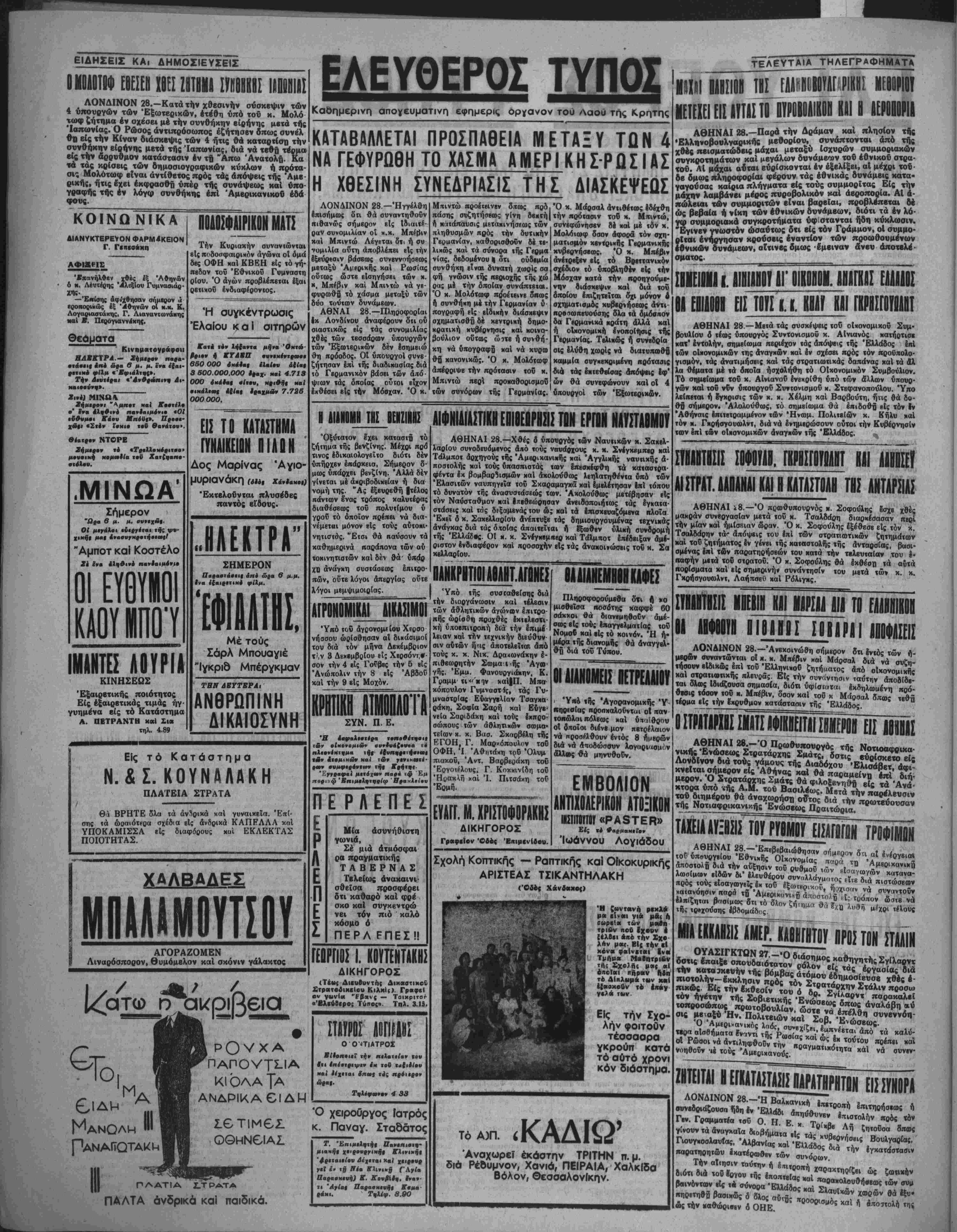 μυριανάκη «<., ΙΜΑΝΤΕΣ ΑΟΥΡΙΑ ΚΙΝΗΣΕΩΣ 'Εξαιρβτικής ποιότητος Είς έξαιρβτικάς τιμάς ήγ γυημένα βίς τό Κατάστημα Α. ΠΕΤΡΑΝΤΗ κ«1 Χι« τηλ. 4.89 ΕΛΕΥΘΕΡΟΣ ΤΥΠΟΣ Καδημερινη απονευμαπνη εφημερίς όργανον τού Λαου τής ιΧρητης ΚΑΤΑΒΑΛΛΕΤΑΙ ΠΡΟΣΠΑΘΕΙΑ ΜΕΤΑΞΥ ΤΩΝ 4 ΝΑ ΓΕΦΥΡΟΘΗ ΤΟ ΧΑΣΜΑ ΑΜΕΡΙ ΚΗΣΡΟΣΙΑΣ Η ΧΘΕΣΙΝΗ ΣΥΝΕΔΡΙΑΣΙΣ ΤΗΣ ΔΙΑΣΚΕΨΕΩΣ "Εκτβλοΰνται πλυσέδες παντός βϊδους. ΣΗΜΕΡΟΝ Ι7α(α·(ά·εΐ| απ· <5ρα β μ.μ. Ινα εξαιρετικόν φίλμ. Μέ τούς Σάρλ Μπουαγιέ Ίγκριθ Μπέργκμαν ΤΗΝ ΔΕΥΤΕΡΑ, ΑΝΘΡΩΠΙΝΗ ΔΙΚΑΙΟΣΥΝΗ Είς τό Κατάστημα Ν. & Σ. ΚΟΥΝΑΛΑΚΗ ΠΛΑΤΕΙΑ ΣΤΡΑΤΑ Θά ΒΡΗΤΕ δλα τα άνδρικά χαί γυναιχβϊα. "Επί- σης τα ώοαιότερα σχέδια είς άνδρικά ΚΑΠΕΛΛΑ καί ΥΠΟΚΑΜΙΣΣΑ είς διαφόρους κυί ΕΚΛΕΚΤΑΣ ΠΟΣΟΤΗΤΑΣ. ΜΠΑΛΪΜΟΥΤΣΘΥ ΑΓΟΡΑΖΟΜΕΝ Λιναρόσπορον, θυμόμβλ,ον καί σκόνιν γάλακτος ρ άκ,οιβθΐα Ά Μανοαμ «Ι ΛΟΝΔΙΝΟΝ 28—Ήγγέλθη επισήμως δ τι θά συναντηθοΰν πιθανώς σήμερον είς Ιδιαιτέ¬ ραν συνομιλίαν οί κ.χ. Μπέβιν χαί Μπιντώ Λέγβται δτι ή συ νομιλία οΰτη αποβλέπει είς την εξεύρεσιν βάσεως συνεννπήσεως μεταξύ Άμεριχής καί Ρωσίας ούτως ώστε είσηγήσει των χ. κ, Μπέβιν χαί Μ αι ν τώ νά γε- φνρωθά τό χάσμα μεταξύ των δύο τούτων δυνάμεων. ΑΘΝΑΙ 28.—Πληροφορίαι χ Λονδίνον άναφέρουν ότι ού ιαστικώς είς τάς συνομιλίας θές των τεσσάοων ύπουργών ών Εξωτερικών δέν ίσημειώ 9η ποόοδος. ΟΙ νπουργοί συνε- ,ήτησαν επί τής διαδικασίας διά Γερμανικόν βάσει των άπό· ψεων τάς οποίας ούτοι είχον κθέσει είς την Μόσχαν. Ό χ. ΗΑΕΚΤΡΙ Μπιντώ αροέτεινεν διτως ποό. πάσης συζητήσεως γίνη δεχτή! ή χάτάπανσις αετακινήτηως των πληθυσμών πρός την δυτικήν Γεραανίαν, καθοοισθοΰν δέ τε- λικώς χαί τα σύνορα τής Γΐρμα νίας, δεδομένου | ότι ούσεμία ουνθήκη είναι δυνατή χωοίς σα φή γνώσιν τής περιοχής της χώ οα; με την οποίαν συνάπτβται. Ό χ. Μολότωφ ποΌέτεινε όπως ή συνθήκη μέ την Γερμανίαν υ πογοαφή είς ειδικήν διάσκεψιν σχηματισθή δέ κενΐοική δημο· κοατική κυβέρνησις καί κοινο¬ βούλιον ούτως ώΐτε ή συνθή¬ κη νά υπογραφή χαί νά κυραο θϋ κανονικώς. Ό χ. Μολότωφ απερριψε την πρότασιν τοΰ χ. Μπιντώ ηερί προκαθορισμοΰ των συνόρων τής ΓβομανΙας. Ό χ. Μαρσάλ αντιθέτως εδέχθη την πρότασιν τον χ. Μπιντώ, συνεφώνησεν δέ καί μέ τόν χ. Μολότωφ δσον άφοοά τόν σχη¬ ματισμόν κεντρικάς Γβρμανικης κυβερνήσεως. Ό χ. Μπέβιν άνέτρεξεν είς τό Βρεττανικόν σχέδιον τό υποβληθέν είς την Μόσχαν κατά την προηγούμε¬ νην διάσκεψιν χαί διά τοΰ οποίον έπιζητεΐται δχι μόνον δ σχηματισμόν κυβερνήσεως άντι προσωπευούΌης δλα τα δμόσπον δα Γερμανΐχά κράτη άλλά χαί ή οΐκονομιχή ένοποίήσις τής Γεομανίας. Τελΐχώς ή συνεδρΙΌ σις ελύθη χωρίς νά διατυποθό χαμμία σνγκεκριμένη πρότασις διά τάς έχιεθυίσας άκόψεις Ιφ' ών θά συνΐφώνουν χαί οί 4 νπουογοί των Εξωτερικών. ΤΕΛΕΥΤΑΙΑ ΤΗΛΕΓΡΑΦΗΜΑΤΑ 1)111 ΟΙΙΠΟΗ ΤΪΙ ΕΪϋΚΙΟΥΑΓίΡΙΚΚΙ ΜίΘΟΡΙΟΤ ΙΕΤΕΙΕΙΕΙΙ ΙΤΤΐίΤΟ ΟΤΡΰΙϋΑΙΚΟΠ ΚΑΙ 11ΕΜΙ1 ΑΘΗΝΑΙ 28.—Παρά την Δράμαν καί πλησίον τής •Ελληνοβουλγαρικτΐς μβθορίου, συνάπτονται άπό τής χθές πβισματώδβις μαχαι μβταξυ Ισχυρών συμμοριακών συγκροτημάτων καί μβγάλων δυνάμβων τοβ έθνικοΰ στρα¬ τόν. ΑΙ μαχαι αύται ευρίσκονται έν έξβλίξβι, αί μέχρι τοΰ· δέ δμως πληροφορίαι φέρσυν τάς έθνικάς δυνάμεις κατα- γαγούσας καίρια πλήγματα βίς τούς συμμορϊτας Είς την μάχην λαμβάνβι μέρος πνροβολιχόν παΐ άβροπορία. ΑΙ ά- πώλβιαι τον συμμοριτών βΐναι βαρβΐαι, προβλέπβται δέ ώς βεβαία ή ν(χη «ών έθνικών δυνάμβων, διότι τα έν λό· ΥΦ συμμοριακά συγκροτήματα ύφ ίστανται ήδη κύκλωσιν. "Εγινεν γνωστ