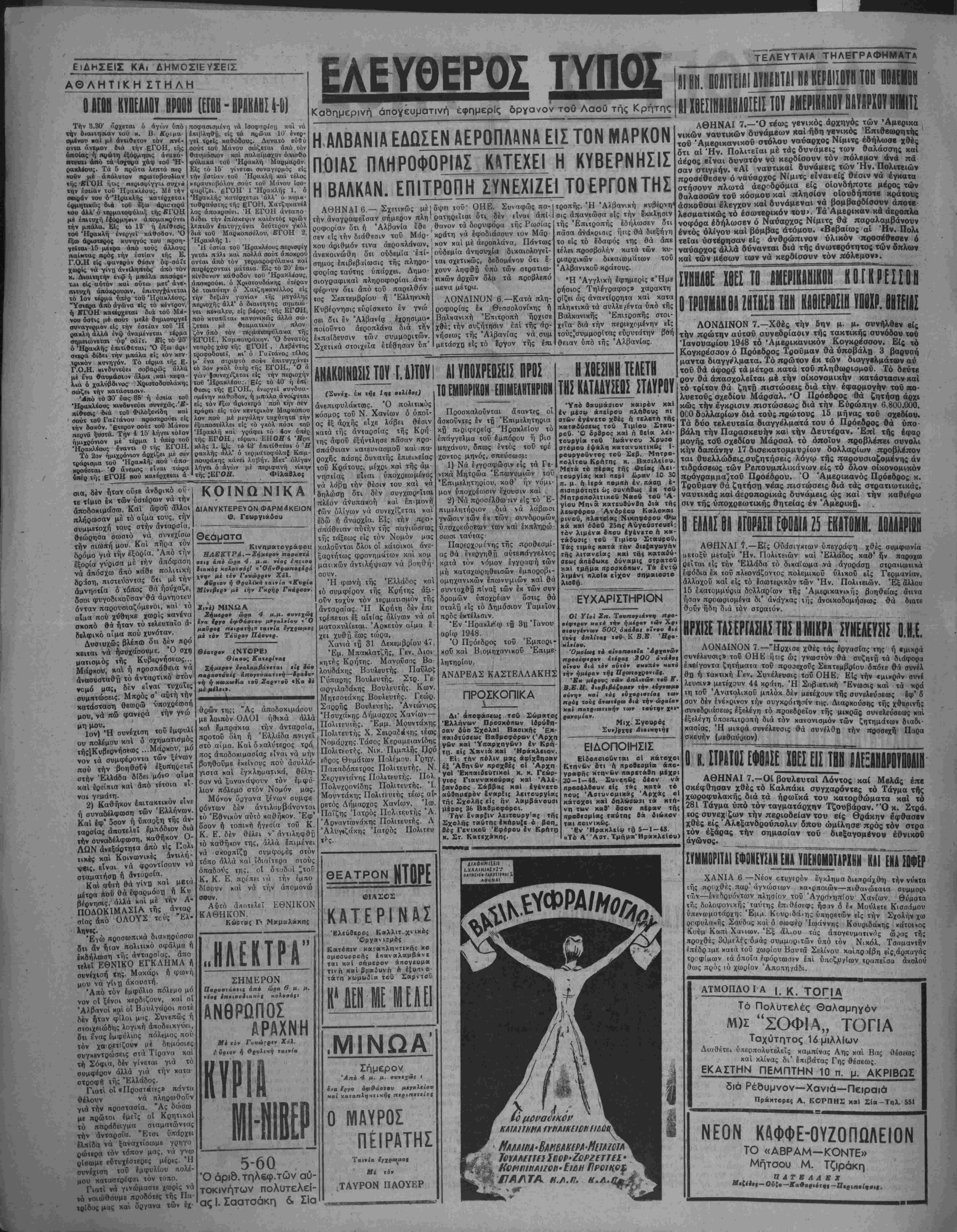 ΙΗΛΙΙ8ΙΙίίΡ1ΣΙΕΦίίΙΙ»ΕΙΙΙΤί«ΙΙ.Ιί1<ΙΡΐΙ ΑΘΗΝΑΙ 1.—Είς Ούάσιγκτων υπεγράφη χθές συμφωνία μεταξύ μεταξύ Ήν. Πολιτειών καί Ελλάδος καθ* ήν παραχω ρεΐται είς την Έλλάδα τό διχαΐωμα .νά άγοράσχι στραηωτικά έφόδια εκ τοϋ πλεονάζοντος πολεμικον ύλικοΰ είς Γερμανίαν, αλλαχού καί είς τό Ισωτερικόν των Ήν. Πολιτειών. Έξ άλλου 15 έκατομμύρια δολλαρίων τής Άμερικανι*ή; βοηθείας άτινα ήσαν προωρισμένα δι" ανάγκας τής ανοικοδομήσεως θά διατε θούν ηδη διά τόν στρατόν. ΗΡΚΙΣΕΤΑΣΕΡΤΛΣΙΑΣΤΗΣΗΜΙΚΡΑΐΥΝΕΛΕΥΣΙΣ ΟΗΕ. ΛΟΝΔΙΝΟΝ 7.—"Ηρχισε χθές τάς εργασίας της ή εμικρά συνέλευσις» τοϋ ΟΗΕ ί'ιΐις ώς γνωστόν θά συζητϋ τα διάφορα έΐτείγοντα ζητήματα τοϋ προοβχοΰς Σεπτεμβρίου όπότε θά συνέλ θΒ ή τακτική Γεν. Συνέλίυσις τοΰ ΟΗΕ. Είς την «μικράν ουνέ λευσιν>μΒτέχουν 44 κράτη. 'Η Σ(»β»ετική "Ένωσις καί τα κρά