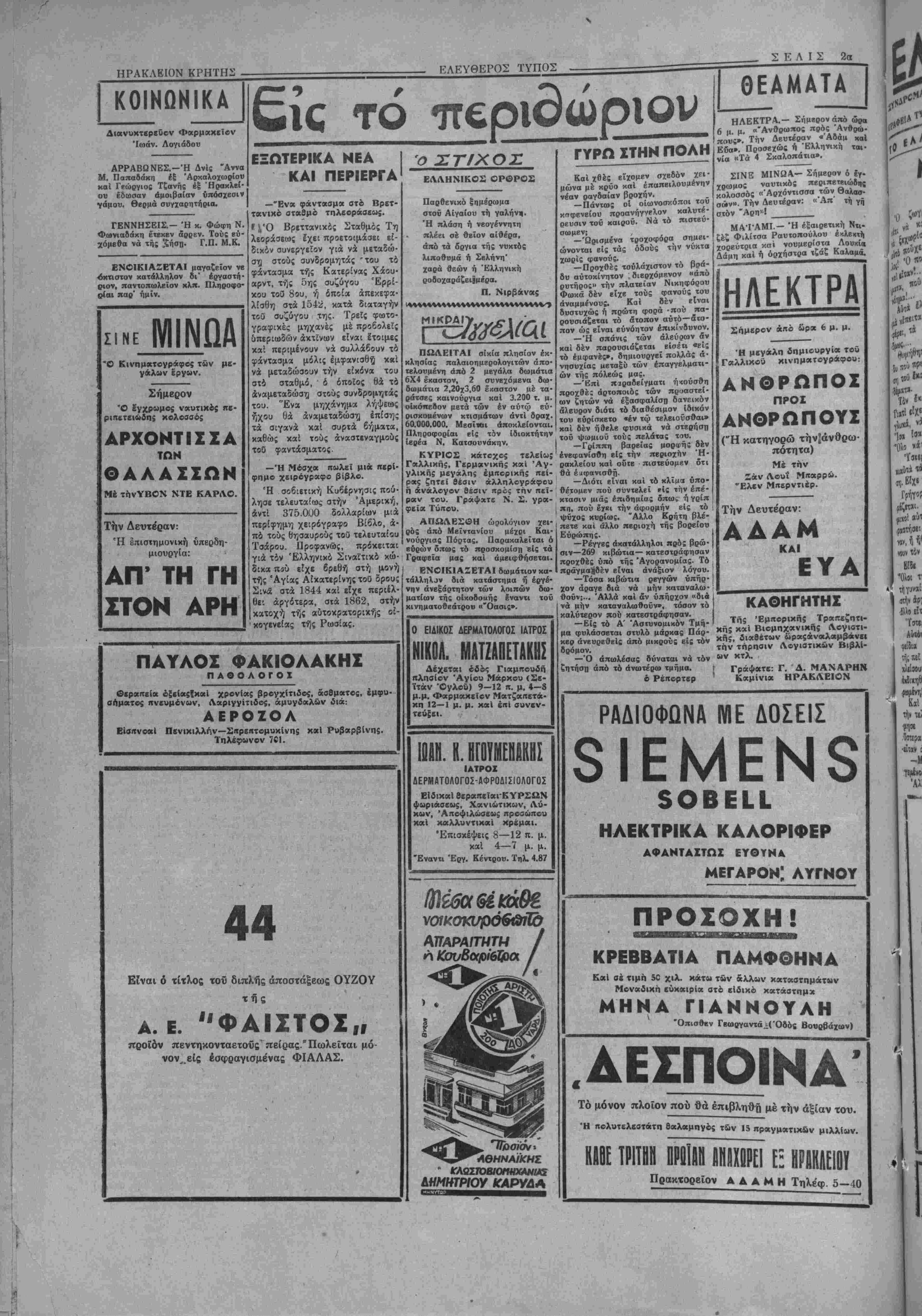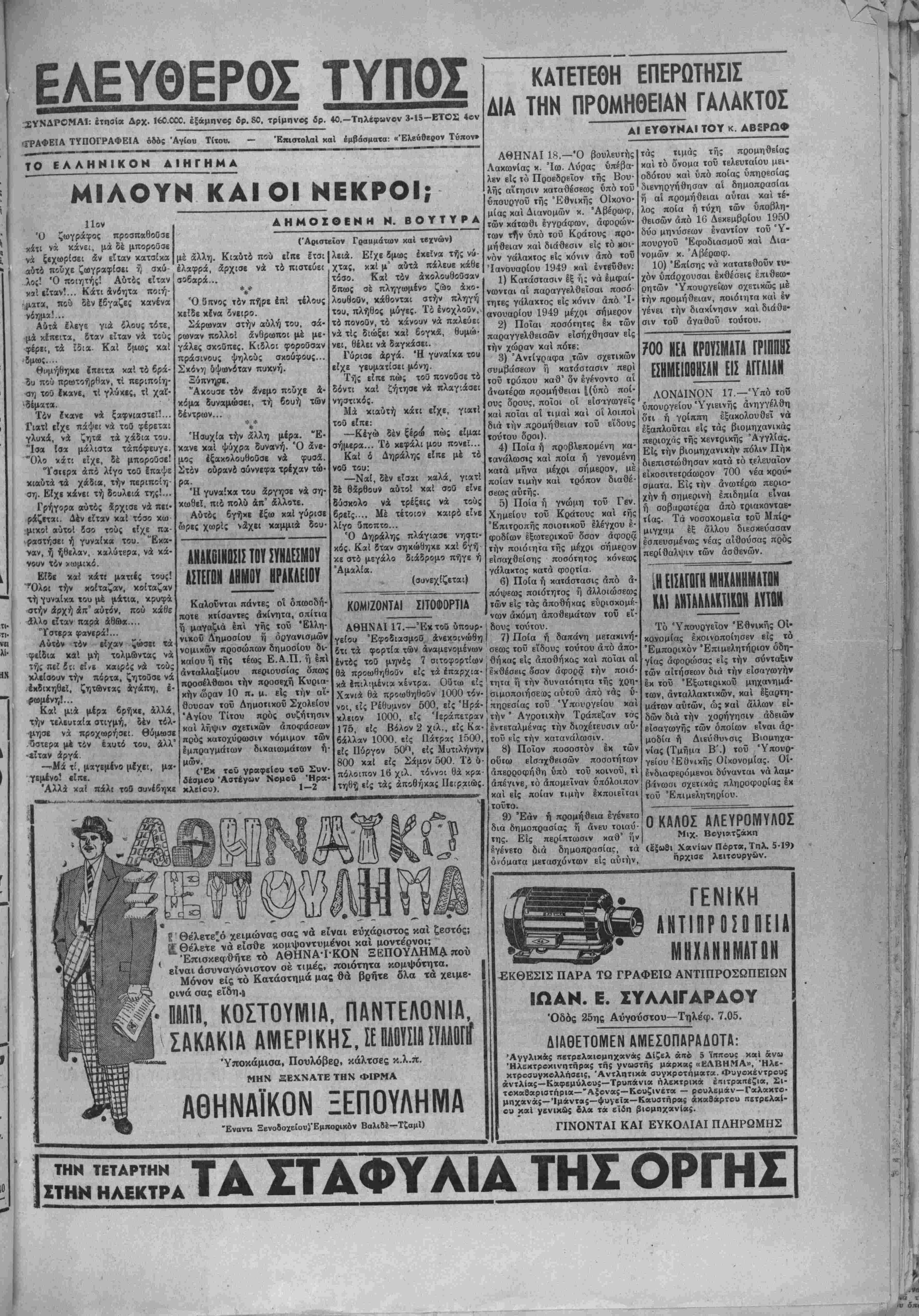 <ί Αγ: 226.500 ΑΘΗΝΑΙ 19.— ΟΙ Βασιλείς ένεκαινίαααν χθές πολλα σχο- λεϊα καί οΐτίτια τσϋ παιδιοΰ ά- νεγβρθεντα διά χρημάτων τού έράνου βορείων επαρχιών είς διαφορα άΐτομεμακρυσμενα χω¬ ρία της Μακεύονίας. ΑΘΗΝΑΙ 19.—Ό «ρωθυπουρ- γός κ. Βενιζέλος ωμίλησε χθίς είς Γρεβενα αυστηοας δπω; οί κάτοικοι έπιδοθοΰν με.ά ζήλου είς τα έργα ανασυγκροτήσεως. ΑΘΗΝΑΙ 19.—Ό αντιπροσω· πό; τής Κυβερνήσεως κ. Παπαν¬ δρέου ανεκοίνωσε χθές ότι ή Δυτική Γερμανία ήλαττωσβ τόν φόρον των καπνών καί ώς έκ τ-ώτου έξασφαλίζεται οριστικώς ή τοποθέτησι; Ελληνικήν κα¬ πνών είς την Γερμανικήν αγο¬ ράν. ΑΘΗΝΑΙ 18.—Ή συνεδρίασις τοθ ΕίδικοΟ Δικαστηρίου διά τχ δγρά καύσιμα θά συνεχισθή ι4 άπόγευμα. ΦΟΡΟΛΟΓΙΚΑΙ ΕΦΕΣΕΙΣ Εκ τής Οΐκονομικής 'Εφο- ρίας ανεκοινώθη ίδη δυνά¬ μει νόμβυ, έφβοεις επι φορολο- γικών ζητηματων άπορριφθεϊοαι ελλείψει καταβολής παραβόλου, έπανασυζητοϋνται έφ' δσον ό- ποβληθουν αϊτήβει; μέχρι τής 4ης Φεβρουαρίου 1951. ΠΡΟΣΚΛΗΣΙΣ δεήσεις των. (Τό Διοικητικόν τοϋ Συλλόγου). Συμβούλιον . ΔΕΝ ΥΠΑΡΧΕΙ ΚΑΜΜΙΑ ΕΠΙΣΗΜΟΣ ΒΕΒΑΙΟΣΙΣ ΟΤΙ ΘΔ ΠΕΡΙΚΟΠΗ Η ΠΡΟΣ ΤΗΝ ΕΛΛΑΑΑ ΒΟΗΘΕΙΑ ΑΝΑΚΟΙΗΟΣΕΙΣ ΤΟΥ ΕΙΣ ΟΥΑΙΙΓΚΤΟΝ ΠΡΕΣΒΕΥΤΟΥ ΤΗΣ ΕΛΛΑΔΟΣ ΑΘΗΝΑΙ 19. — τιωτική βοηθεία, εδήλωσεν ότι — Ι — - · Ψ Ρ ^ρ^ --- ^ ■ ^^ V VI ■ χθές Ικ Νέας Υόρκης ότι ό^ εις μολονότι χθές συνωμίλησε με τόν Ούάσιγκτων πρεσβευτής τής Έλ- κ. Πόρτερ καί σήμερον λάδος κ. Πολίτης, ερωτηθείς επί τής δημοσιευθείσης ε'ιδήσεως ότι θά πεοικοπΉ επ περισσότερον ή οίκονομική βοηθεία διά την ά- νασυγκρότησιν τής "Ελλάδος, πρός τόν σκοπόν δπως αύξηθβ ή παρεχομένη. ήδη. εις αυτήν στοα· συ· ναντηθΰ μέ τούς διευθύνοντας τό Ελληνικόν τμήμα ϊοϋ Σταίητ Νΐηπάοΐμεντ ουδέν τοΰ ανεκοι¬ νώθη επί τού ΰέματος τούτου. «Άπό καιροϋ δμως— Ιΐόνι· σεν—«ιχα ενημερώσβι τάς Άθή,· νας ότι δέν πρέπει νά Ικπλήξα ε¬ άν ή επιδείνωσις ττΐς διεθνοΰς καταστάσεως δώσϊ) τό προβάδ»· σμα είς την στρατιωτικήν ΙνΙ- καί επιβοαδύνχι προσιορι· νως, διά λόγους πρακτικούς, άλ- λά καίψυχολογικούς έναντι τού Κογκρέσσου, τό έργον τής ανα¬ συγκροτήσεως». ^ Αυριον Σάββατον 20ην τρεχ. τό Διοικητικόν Συμβούλιον τοΰ εν Μασταμπά Θρησκευτικοϋ Συλ λόγου «Οί Άπόστολοι οί 12» τέλει την κατά μήνα θείαν λει¬ τουργίαν έν τώ 'Ιερω Ναώ τής Παναγίας καί παραχαλοϋνται τα μέλη ώς καί πας βουλόμενος δ¬ πως προσέλθωσιν καί ένώσωσιν μεθ' ημών τάς πρός τόν"Υψιστον ί