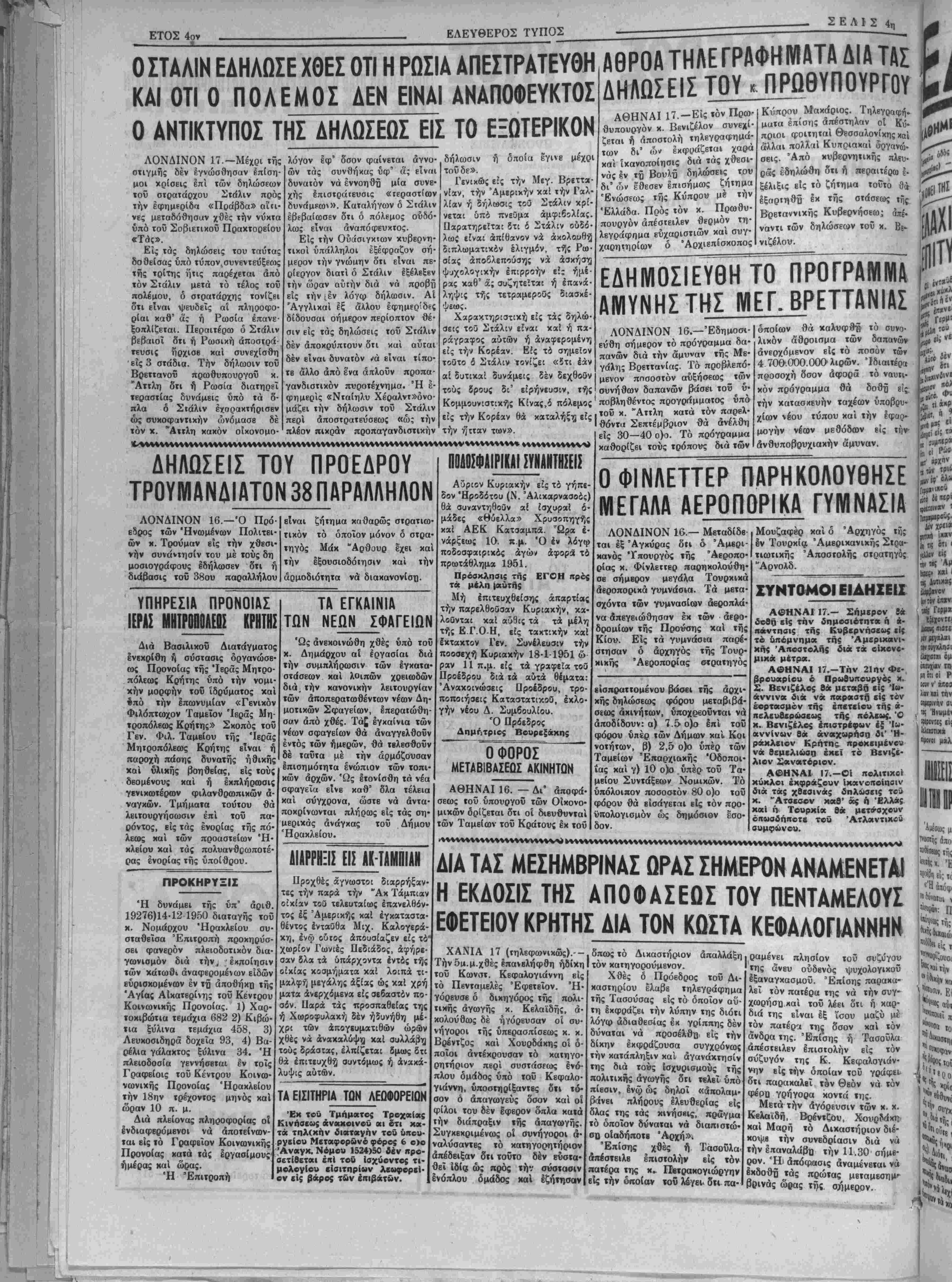 μολογίου (ίσιτπρίων λ<«ιφ αν είς βάρος των έπιβάτών. ΜΕΤΑΒΙΒΑΣΕΩΣ ΑΚΙΝΗΤΩΝ ΑΘΗΝΑΙ 16. — Δι' αποφά¬ σεως τού ύπουογοϋ των Οίχονο· μιχών δριζεται δτι οί διβυθυνταΐ των Ταμείων τοϋ Κράτους έκ τοΰ είς 30—40 ο)ο. Τό προγραμμα καθορίζει τούς τοόπους διά των ΟΦΙΝΛΕΤΤΕΡ ΠΑΡΗΚΟΛΟΥΘΗΣΕ ΜΕΓΑΛΑ ΑΕΡΟΠΟΡΙΚΑ ΓΥΜΝΑΣΙΑ ΛΟΝΔΙΝΟΝ 16— Μεταδίδβ ται έξ Άγκύβας ότι δ· Άμερι- κανός 'Γπουργός τής 'Αεροπο· ρίας κ. Φίνλετΐβο παρτικολούθη· σβ σήμερον μεγάλα Τούρκικα άεροπορικά γυμνάσια. Τα μετα- σχόντα των γυμνασίων α€θοπλά· να απεγειώθησαν έκ των άερο- δοομίων τής Προνσης καί τής Κίον. Είς τα γυμνάσία παρέ¬ στησαν ό άρχηγός τής Τουρ- κικής Άεροπορίας «κοατηγός είσπραττομένου βάσει της άοχτ- κης δηλώσεως φόρου μεταβιβά¬ σεως άκινήτων, ύποχρεοϋνται νά άποδίδουν: α) 7 5 ο)ο επί τοϋ φόρον υπέρ των Δήμων καί Κοι νοτήτων, β) 2,5 ο)ο υπέρ των Ταμείων Επαρχιακάς Όδοποι· ΐας καί γ) 10 ο)ο υπέρ τοΰ Τα- μείου Συντάξεως Νοιιικών. Τό υπόλοιπον ποσοστόν 80 ο)ο τοΰ φόρου θά εϊσάγετ.ιι είς τόν προ- νΐτολογισμόν ώς δημόσιον έσο- δόν. Μουζαφέρ καί δ 'Αρχηγός της Ιν Τουρκία Άμερικανικής Στρα- τιωτικής Άποστολτις στρατηγός Άονολδ. ΣΥΝΤΟΜΟΙΕΙΑΗΣΕΙΙ ΑΟΗΝΑΙ 17.— Σήμερον 6* δοθή αίς την δημοσιότητ» ή α¬ πάντησις τής Κυβερνήσεως είς τέ ίιπομνημα τής 'Αμερικβνι- κης Άποστολής διά τα οικονο¬ μ ικά μίτρ*. Α&ΗΝΛΙ 17.-Τήν 21«νΦί- βρουαρίου ο Πρωβυπουργός ". £. Βενιζέλος Θα μεταβή είς Ίμ- άννινα δι» να παραστή είς τον έορτασμον τής έπβτείου τής κ- πελβυβίρωοεως τής πολϊΐ»ί. Ό χ. Βενιζβλος έπιστρέφων έξ Ιω¬ αννίνων βα αναχωρήση δι' "Η¬ ρακλειον Κρήτης, πρβκβιμένβω να θεμβλΐΜση έκεϊ τό Ββνιζκ- λιον Σανοιτβριον. Α ©ΗΝ ΑΙ 17.—ΟΙ πολιτικαί κύκλοι έκςρραζουν Ικανοποίησιν διά τοις χββσινας δηλωβεις τού κ. "Ατσίσον καθ' άς ή Ελλάς και ά Τουρκία θά μβτασχουν όπΜβδήποτε τοϋ Ατλαντικόν συμςρωνου. ΔΙΑ ΤΑΣ ΜΕΣΗΜΒΡΙΝΑΣ ΩΡΑΣ ΣΗΜΕΡΟΝ ΑΝΑΜΕΝΕΤΑ1 Η ΕΚΔΟΣΙΣ ΤΗΣ ΑΠΟΦΑΣΕΩΣ ΤΟΥ ΠΕΝΤΑΜΕΛΟΥΣ ΕΦΕΤΕΙΟΥ ΚΡΗΤΗΣ ΔΙΑ ΤΟΝ ΚΩΣΤΑ ΚΕΦΑΛΟΓΙΑΝΝΗΝ ΧΑΝΙΑ 17 (τηλεφωνικώς).- — Τήνδμ.μ χθές επανελήφθη ήδίκη τού Κωνστ. Κβφαλογιάννη είς τό Πβνταμελές Έφετεΐον. Ή- γόρβυσε ό δικηγόρος της πολι- τικής άγωγής κ. Κελαιδής, α¬ κολούθως δέ ήγόρευσαν οί συ- νήγοροι τής ύπερασπίσεως κ. κ. Βρέντζος καί Χουρδάχης οί ό- ποΐοι άντέκρουσαν τό κατηγο- ρητήριον περί συστάσεως Ινό- πλου ομάδος υπό τοΰ Κεφαλο- γιάννη, ύποστηρίξαντβς δτι τό¬ σον ό άπαγωγεύς όσον καί οί φίλοι τού δέν έφερον δπλα καιά την διάπραξιν τής άπαγωγής. Συγκεκριμένως οί συνήγοροι ά- ναλύσαντες τό κατηγορητήριον άπέδειξαν δτι τουτο δέν εύστα- θεΐ ιδία ώ; πρός την σύστασιν ενόπλου ομάδος χαί εζήτησαν . δπως τό Δικαστήριον απαλλάξη Ι τόν χαΐηγορούμενον. Χθές δ Πρόεδρος τοΰ £- χασΐηρίου έλαβε τηλεγράφημα τής Τασούσας είς τό δποΐον αύ¬ τη Ικφράζει την λύπην της διότι λόγω άδιαθεσίας έκ γρίππης δέν δύναται νά προσέλθϊ} είς την δίκην έκφράζουσα συγχρόνως την κατάπληξιν καί αγανάκτησίν της διά τούς ίσχυρισμούς τής πολιτικάς άγωγής δτι τέλει υπό πίεσιν^ §νφ ώς δηλοί «άπολαμ- βάνει πλήρους ελευθερίας είς δλας της τάς χινήσβις, πρανμα τό οποίον δύναται νά διαπιστώ- ου οίαδήποτε Άρχή». Έπίσης χθές ή Τασοϋλα. άπέστειλβ επιστολήν είς τόν πατέρα της χ. Πβτρακογιώργην βίς την οποίαν τού λέγει, δΐι πά- ■ ραμένει πλησίον τού συζύγου της άνευ ουδενός ψυχολογικοϋ Ιξαναγκασμοΰ. Έπίσης παρακα- λεΐ τόν πατέρα της νά την συγ- χωρήσχ) «αί τοΰ λέει ότι ή καρ- διά της είναι έξ ΐοου μαζύ μέ τόν παΐέρα της^ δσον καΐ ΐόν ανδρα της. Έπίσης ή 