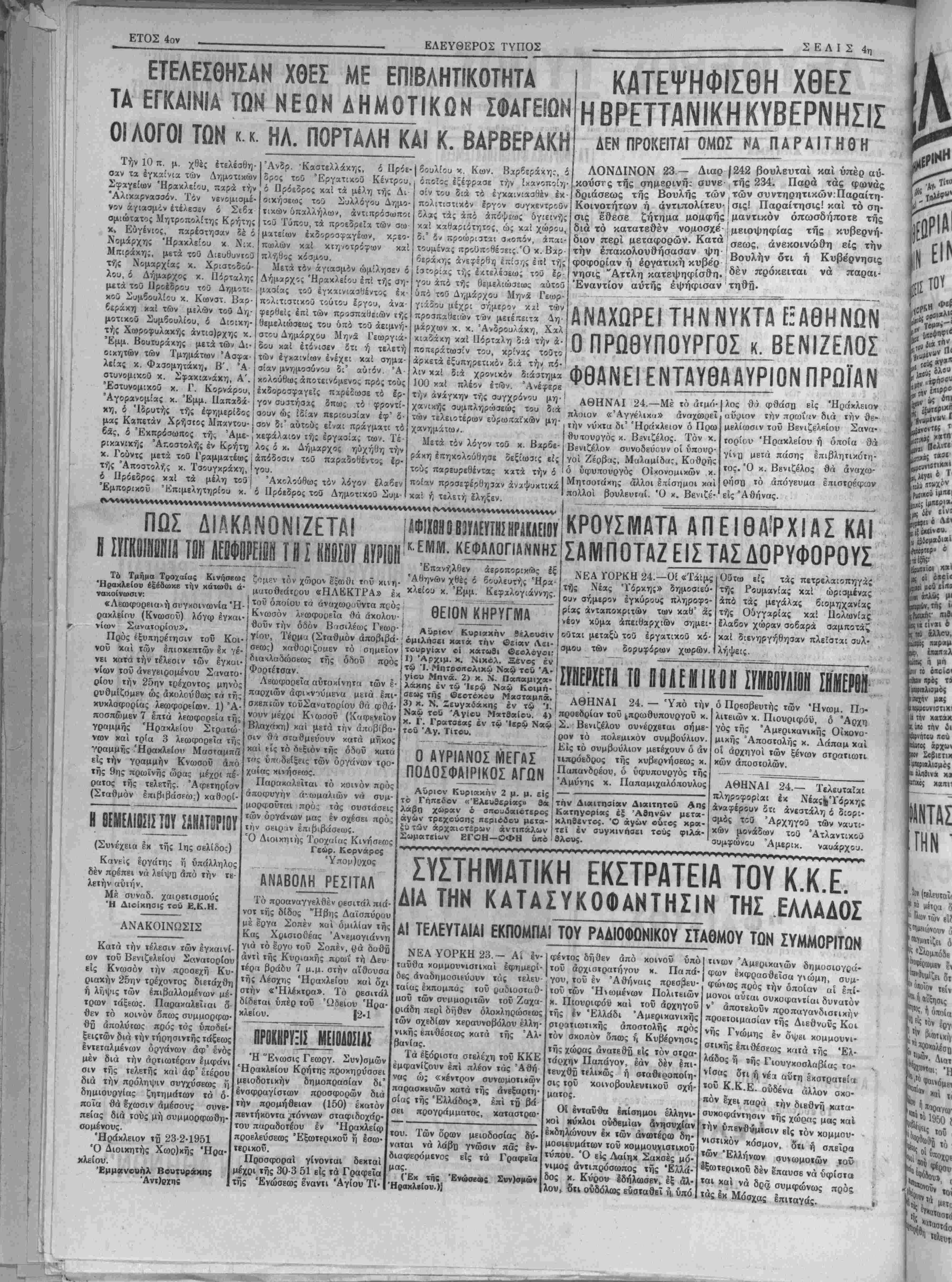 Κανείς εργάτης ή ύπάλληλο< δέν πρέπει νά λείψη άπό την τε λειήν αύτην. ΜΑ συναδ. χαιρετισμούς Ή Διοίκησις τοΰ Ε.Κ.Η. ΑΝΑΚΟΙΝΩΣΙΣ Κατά την τέλεσιν των έγκαινί ών τού Βενιζελείου Σονατορίου ίίς Κνωσόν ιήν προσέχη Κυ ριακήν 25ην τρέχοντος διετάχθη ή λίιψις των επιβαλλομένας μέ τρών τάξεως. Παρακαλεΐΐαι ό θεν τό κοινόν όπως συμμορφω θ·β άπολύιως πρός τάς ύποδεί· ξειςτών διά την τήρησιντής τάξεως εντεταλμένα» όργάνων άφ' ενός μέν διά την άρτιωτέραν έμφάνι σιν τής τελετής καί άφ' ετέρου διά την πρόληψιν συγχύσεως η δημιουργίας ζητημάτων τα δ- ποία θά έχωσιν άμέσους συνε¬ πείας διά τούς μή συμμορφωθή1 σομένους. Ηράκλειον τί 23-2-1951 Ό Διοικηΐής Χωρ)κής 'Ηοα· κλείου. Εμμανουήλ Βουτυράκης Άντ)ρχης Φοριέισαν. Λεωφορεΐα αύτοκίνητα των έ παρχιών άφικνούμενα μετά επι σκβπΐών τοϋΣανατορίου θά φθά νούν μέχρι Κνωσού (Καφ^νεΐο Βλαχαχτι) χαί μετά την άποβιβα σιν θοι σταθμεύουν κατά μήκο καί είς τό δεξιόν τήε όδυϋ κατα τος ύπί.δείξεις των όογάνων τρο χαίας κινήσεως. ΓΙαρακολΕΪται τό κοινόν πρό αποφυγήν ά-ωμαλιών νά συμ μορφθϋται πρός τάς συστάσει των όργάνων μας έν σχέσει πρό ιήν σειράν έπφιβάθϊως. Ό Διοιχητής Τροχίχίας Κινήσεω Γεώρ. Κορνάρος Ύ) ΑΝΑΒΟΛΗ ΡΕΣΙΤΑΛ Τό προαναγγελθέν ρεσιτάλ πιά νοτ της δίδος "Ηβης Δαίσπύρου μέ έργα Σοπέν χαί όμιλίαν τής Κάς Χςιΐσιοθέας Ανεμογιάννη γιά τό έργο τοΰ Σοπέν, (,ιά άί Κ άντί τής Κυριαχτϊς πρωί τή Δευ τέρηι βράδυ 7 μ.μ. στήν αΐθουσα τής Λέσχης Ηρακλείου κοι όχι στήν «Ήλέχτρα». Τό ρεσιτάλ δίδεται υπέρ τοϋ Ώδειου Ήρα κλβίου. |2·1 ΠΡΟΚΗΡΥΞΙΣ ΜΕΙΟΔΟΣΙΑΣ "Η Ένωσις Γεωργ. Συν)σμών Ηρακλείου Κρήτης προχηρύσσει μβιοδοτιχήν δημοπρασίαν δι' ένσφραγίστων προσφορών διά την προμήθειαν (150) εκατόν πεντήκοντα ^τόννων σταφιδοχάρ- τού παραδοτέου έν Ήραχλείψ προελεύσεως Έξωτερικοΰ ή έσω- ερικοΰ. Προσφοραί γίνονται δεκταί μέχρι τής 30-3 51 είς τα Γραφεΐα τής Ενώσεως έναντι Άγίου Τί· τω Ί. Μητροπολίτα Ναώ τοΰ Ά· γίου Μηνα. 2) κ. Ν. Παπαμιχα- λάκης έν τω Ίερω Ναώ Κοιμή- σεως της θεοτόκου Μασταμπά. ΚΡΟΥΣΜΑΤΑ ΑΠΕΙΘΑ^ΧΙΑΣΚΑΙ ΣΑΜΠΟΤΑΖ ΕΙΣΤΑΣ ΔΟΡΥΦΟΡΟΥΣ ΝΕΑ ΥΟΡΚΗ 24.—Ο£ «Τάϊμς τής Νέας Υόρκης» δημοσιεύ- ουν σήμερον έγκύροος πληροφο¬ ρίας ανταποκριτήν των καθ5 άς νέον κθμα άπειθαρχιων σημει- οθται μεταξυ τού έργατικοΰ κό- σμου των δορυφόρων χιορών. Οΰτω είς τάς πετρελαιοπηγά£ τής Ρουμανίας καί ωρισμένας άπό τάς μεγάλας βιομηχανίας τής Ουγγαρίας χαί Ιΐολωνίας. έλαβον χώραν σοβαρά σαμποτάζ χαί διενηργήθησαν πλείστα: συλ· λήψεις. Μηιη το πολεμικον ι 3) κ. Ν. Ζευγαδάχης έν τώ Ναώ τοΰ Άγίου Ματθαίου. Ί. ΑΘΗΝΑΙ 24. — Υπό την κ. Γ. Γρατβεας έν τώ Ίβρώ Ναώ τοΰ Αγ. Τιτου. Ί. 4) προεδρΐαν τού 4πρωσυπουργου κ. Ο ΑΥΡΙΑΝΟΣ ΜΕΓΑΣ ΠΟΔΟΣΦΑΙΡΙΚΟΣ ΑΓΩΝ Σ. Βενιζέλου ουνέρχεΐαι σήμε¬ ρον τό πολεμικον συμβούλιον. Είς τό συμβούλιον μετέχουν ό άν τιπρόεδρος τής κυβερνήσεως κ. Παπανδρέου, ό ύφυπουργός τής Αμύνης κ. Παπαμιχαλόπουλυς Αύριον Κυριακήν 2 μ. μ. είς το Γηπβδον κ Ελευθερίας» θα ' την Διαιτησίαν Διαιτητοΰ λάβη χώραν ο οπουίοχιοτεροί Κατηγορίας έξ Αθηνών μετατ- άγών τρεχούσης περιόιίου μετα- κληθέντος. Ό αγών ούτος κρα- ξυ των άρχαιοτερων «ντιπαλων Ιτεΐ έν συγκινπβει τούς φιλα- Σωματΐίων ΕΓΟΗ—ΟΦΗ ύιτό'θλους. ό Πρεσβευτής των Ήνωμ. Πό- λιΐειών κ. Πιουριφόϋ, ό Άρχη γός τής Άμερικανικής Οικονο¬ μικάς Άποστολής κ. Αάπαμ καί οί άρχηγοί των ξένων σΐραΐιωτι κων άποσιολών. ΑΘΗΝΑΙ 24.- Τελευταίαι πληροφορίαι έκ Νέας|'Υόρκης άναφέρουν 8« ανεστάλη & διορι- ομάς τοθ ΆρχηγοΟ των ναυτι- κών μονάδων τοθ