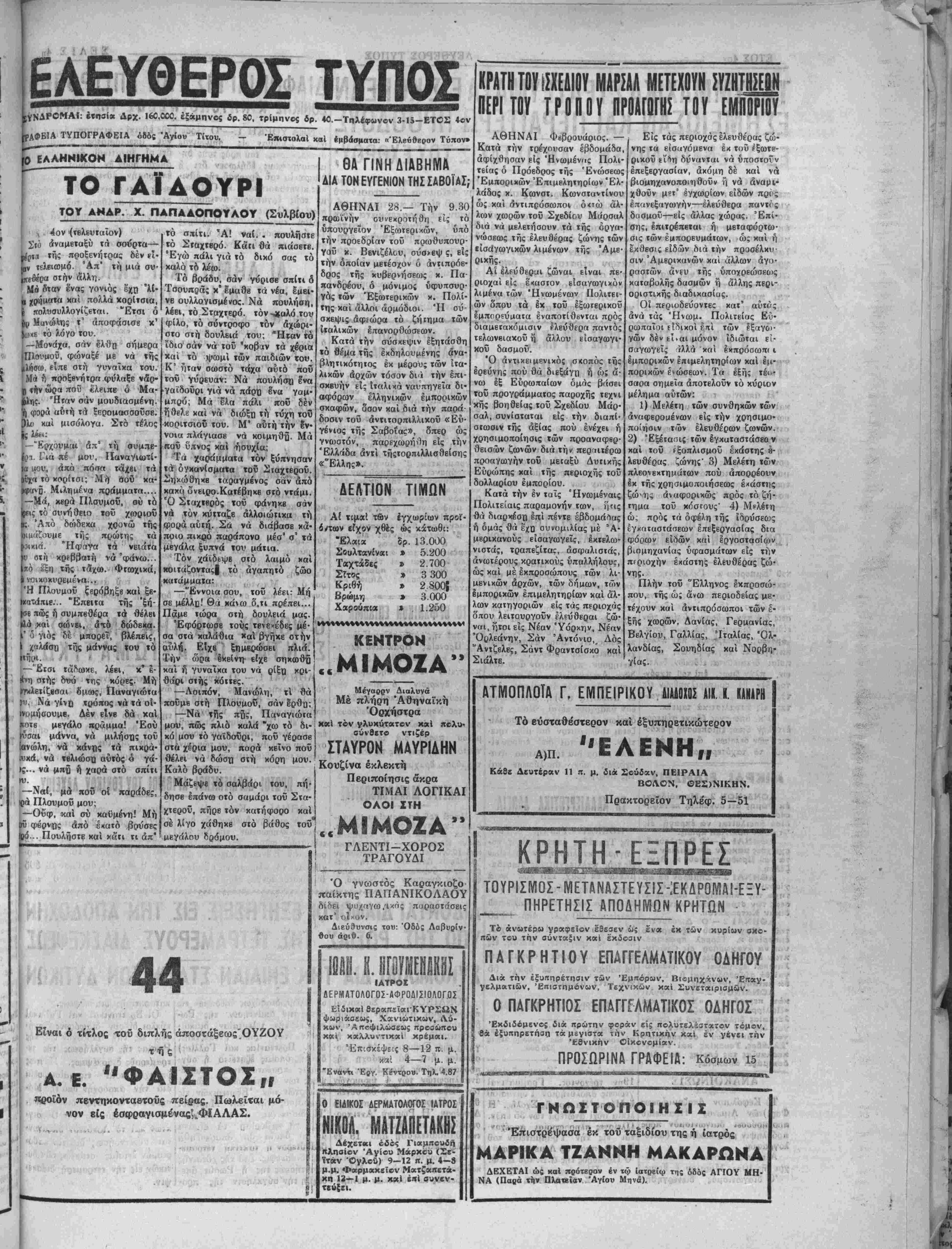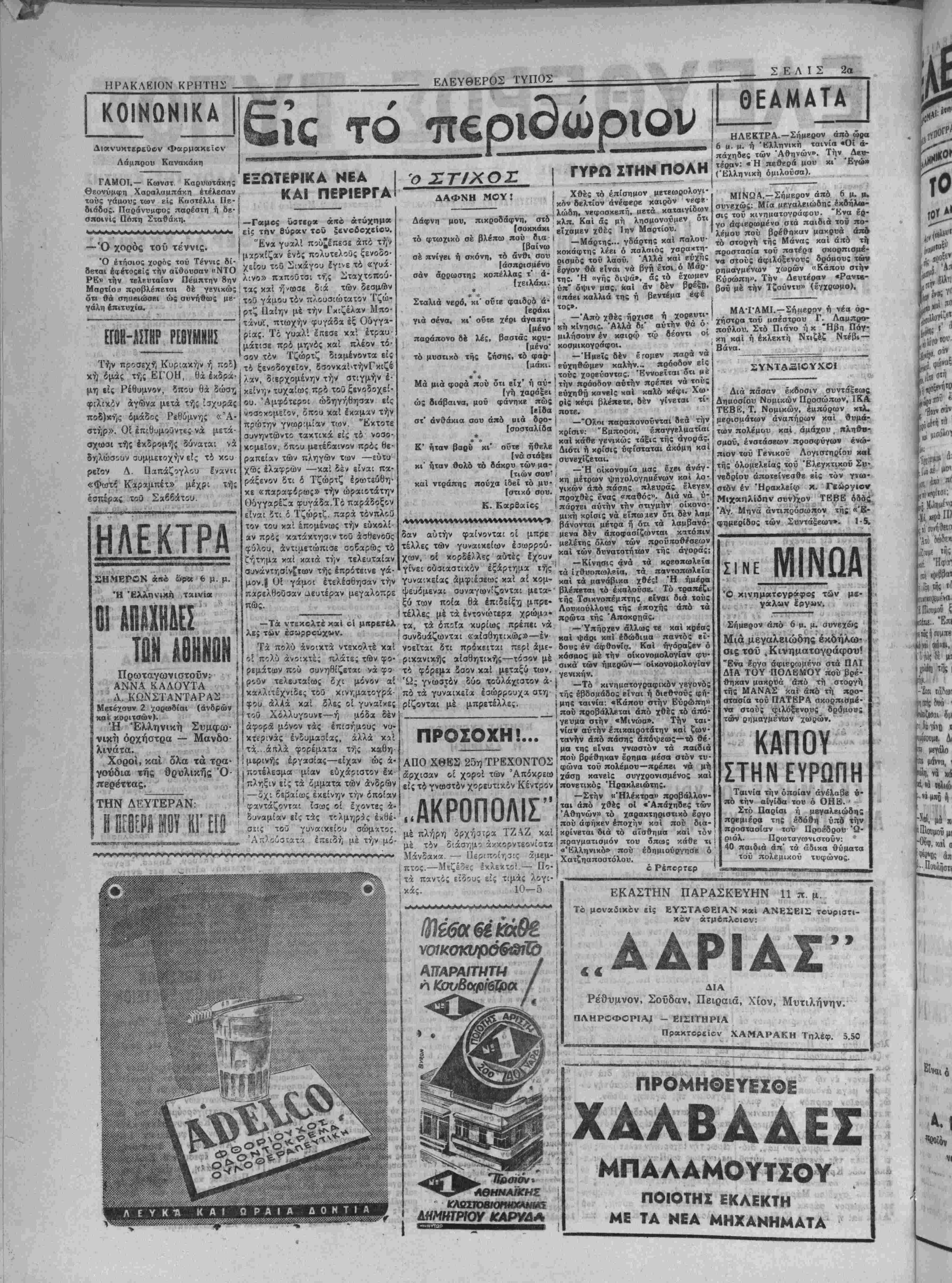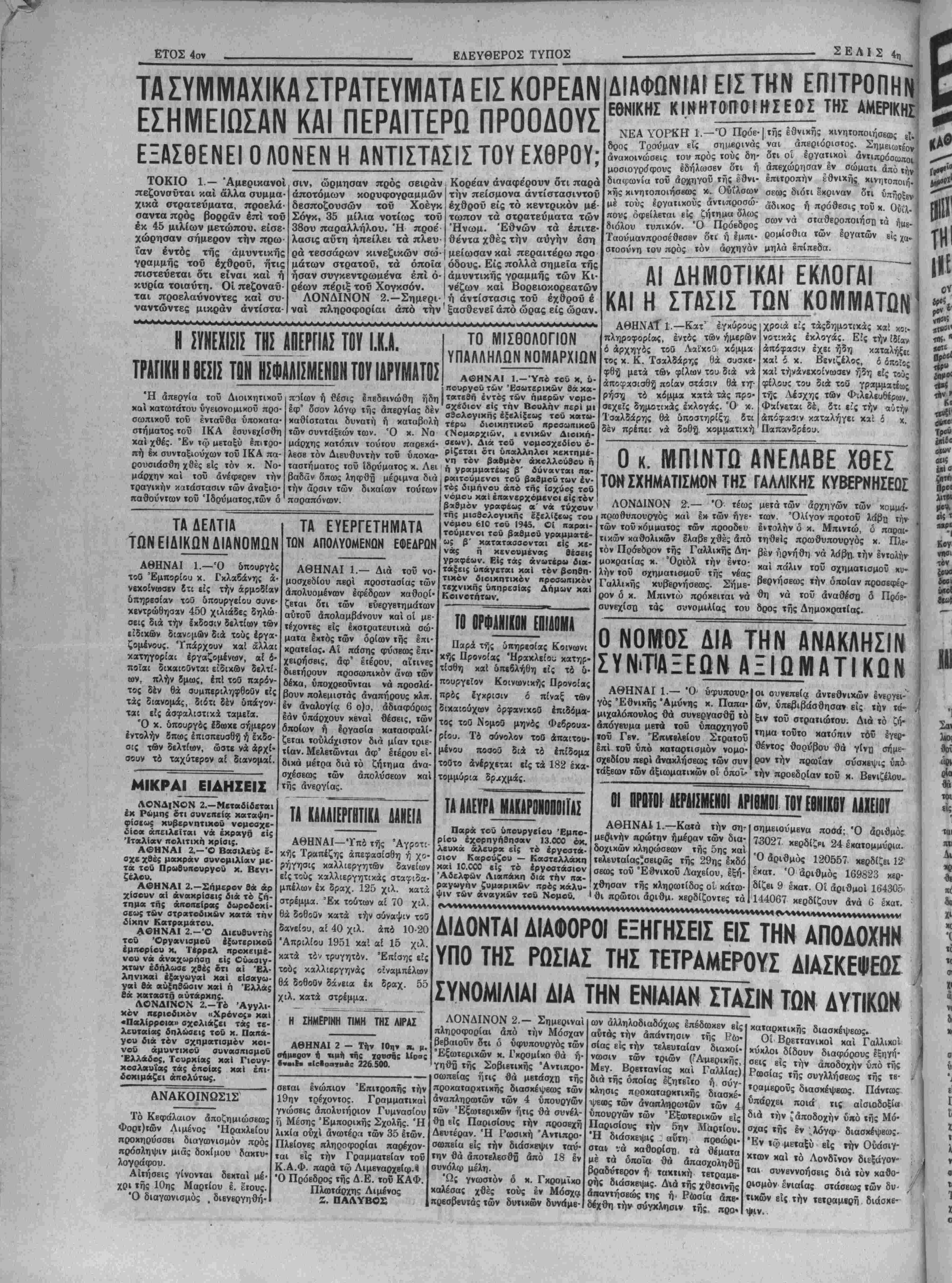 ω; β' χαταταοσονται είς χ<- νάς ϋ χενονμένας θέσεις γραφέων. Είς τάς ανωτέρω δια- τάξει; ύαάγΐται χαί τόν βοπθη- τιχόν διοικητικόν προσωπικόν τβχνικης υπηρεσίας Δήμων χαί Κοινοτήτων. ΔΙΑΦΩΝΙΑΙ ΕΙΣ ΤΗΝ ΕΠΙΤΡΟΠΗΝ, ΕΘΝΙΚΗΣ ΚΙ.ΚΗΤαΠ0Ι»ΙΕ&Σ ΤΗΣ ΑΜΕΡΙΚΗΙ ΝΕΑ ΥΟΡΚΗ 1.—Ό Πρόε·|της εθνιχής^ χινητοποιήσεως ,·.' δρος Τρούμαν είς σημερινάς ναι άπεριόριστος. —ΐΊμειωτέον^ άνακοινώσεις το« πρός τούς δή- ό« οί έργατικοί αντιπρόσωπον μοσιογρόφους εδήλωσεν ότι τ) άπεχωρησαν έν σώματι άπύ τή* διαφωνία τοϋ άρχηγοϋ τής^έθνι- επιτροπήν έθνικής χινητοποιή. χής χινητοποιήΌβως *. Ουΐλσων σεως διότι έκριναν ότι ύπήοξβν μέ τούς έργατιχούς άντιπροσώ- ^ίδικος τ) πρόθεσις τοΰ κ. Οδίλ- πους όφείλεται είς ζή"Η*« δλως γά αχαβΐΰοποι^ χά . διόλου τυπικόν. Ο Προβδρος _ , ." 1«· Ταούμανπροσέθεσεν ότι ή ίμπι- Οομ*σθια των εργατων «ς χα. στοσύνη τού πρός τόν απχηγόν μηλά Ιπίπβδα. ~ ~Α Γ Δ II ΜΟΤΤΚΑΤΕΚΛΰ Γ Αί ΚΑΙ Η ΣΤΑΣΙΣ ΤΟΝ ΚΟΜΜΑΤΩΝ ΑΘΗΝΑίΐ.—Κατ' έγκύρους πληροφορίας, έντός των ημερών ό άρχηγός τοθ ΛαΙ'χοΰ. χόμμα τος χ. Κ. Τσαλδάρης Θα συσκε¬ φθή μετά τβν φίλων τού διά νά αποφασισθή ποίαν στάσιν θά τη-· ρήση τό χόμμα χατά τάς προ· σεχεϊς δημοτικάς εκλογάς. Ό1 κ. Ισαλδάρης θά δποστηρίξη δτι δέν πρέπει νά δοθ^ κομματιχή χροιόί είς τάςδημοτιχάς χαί χοι· νοτικάς εκλογάς. Είς χήν ιδίαν απόφασιν έχει ήδη καταλήξ(ί χαί δ χ. Βενιζέλος, ό οποίος καί τήνάνεχοίνωσεν ή5η βίς τούς φίλους τού διά τού γραμμακως τής λένχης των Φιλελευ6έρων. Φαίνεται δέ, βτι είς την «ύφ απόφασιν καταλήγει καί δ χ. Παπανδρέου. ΤΟ ΟΡΦΑΝΙΑΝ ΕΟ1ΔΟΜΑ Παρά τής υπηρεσίας Κοινωνι χής Προνοίας Ηρακλείου κατηρ- τίσθη καί υπεβλήθη είς τό υ¬ πουργείον Κοινωνικάς Προνοίας πρός έγκρισιν ό πίναξ των δικαιούχων όρφανικοθ έπιδόμα- τος τοθ ΝομοΟ μηνός Φεβρουα- ρίου. Τό σύνολον τοθ άπαιτου- μένου ποσοθ διά τό έπίδομα τοθτο άνέρχεται είς τα 182 έχα· τομμύρια δραχμάς. ΤΑ ΑΑΕΥΡΑ ιΜΑΚΑΡΟΗΟΠΟίΓΑΙ Παρά τοϋ ΰπουργϊίου 'Εμπο- ρίου έχορηνήθησαν 13.000 οχ. λκυχά άλευρα είς τό εργοστά¬ σιον Καρούζου — Κασταλλάχη χαί 10.000 βίς τό εργοστάσιον την παραι Ο κ. ΜΠ1ΝΤΟ ΑΝΕΛΑΒΕ ΧΘΕΣ ΤΟΚ ΣΧΗΜΑΤΙΣΜΟΝ ΤΗΣ ΓΑΛΛΙΚΗΣ ΚΥΒΕΡΝΗΣΕΟΣ ΛΟΝΔΙΝΟΝ 2.— Ό τέως μετά των άρχηγών των πρωθυπουργός κα'ι έκ- των ήγε· των. Όλίγον προτοϋ των τοΰ χόμματος των προοδευ εντολήν ό κ. Μπιντώ, ό τικών καθολικών έλαβε χθές άπό τηθβΐς πρωθυπουργός κ. Πλβ- τόν Πρόεδρον τής Γαλλικής Δή- βέν ήρνήθτι νά λάβη την εντολήν μοκρα,_ίας χ. Όριόλ_ την έντο· καί ^λιν τοΰ ατισ ΰ λην τού σχτιμαΐισμου της νεας , « , , Γαλλιχης κυβερνήσεως. Σήμε- β6θνησεως την οποίαν προσεφέρ- ρον δ κ. Μπιντώ πρόκειται νά θη νά τοΰ αναθέση δ Πρόβ· συνεχίση τάς συνομιλίας τού δρος τής Δημοκρατίας. Ο ΝΟΓΥΙΟΣ ΔΙΑ ΤΗΝ ΑΝΑΚΛΗΣΙΣ ΣΪΝΤΙΑΞΕΟΓΗ ΑΞΙΩΜΑΤΙΚΟΝ ΑΘΗΝΑΙ 1.— Ό- ΰφυπουρ- γός Έθνικης 'Αμύντις κ. Παπά· μιχαλόπουλος θά συνεργασθή τό άπόγευμα μετά τοΰ υπάρχηγοΰ τοΰ Γεν. ΈπΐνΤβλβίου Στρατοΰ επί τοΰ υπό καταρτισμόν νομο· σχεδίου περΐ άνακλησεως των συν τάξβων των αξιωματικών οί οποί¬ οι ουνβπβία άντεθνικών ργ ών, ίπεβιβάσθησα» εις την τιί- ξιν τοΰ στρατιώτου. τημα τουτο κατόπιν θέντος θορύβου θά ρον την πρωΐαν σύσκεψις υπό την προεδρίαν τοϋ χ. Βενιζέλου- Διά τό τόΰ σημε¬ ΟΙ ΠΡΙ1Ϊ0Ι Α£ΡΑΪ.Μ£ΗΟΙ ΑΡΙΟΜΟΙΤ0ΥΕ8ΝΙΚ0Υ ΑΑΧΕΙΟΥ ΑΘΗΝΑΙ 1.—Κα«ά την σηΓ μεβινήν πρώτην ημέραν των δια- δοχικών κληρώσβων τής 5ης καί τελευταίας'σειρά'ς τής 29ης έκδό σεως τού Έθνικοΰ Λαχείου, εξή¬ Άδελςρών Λιαπάχη δια την πα¬ ραγωγήν ζυμαρικών πρός χάλυ- - ψιν των άναγκων τού Νομοΰ. Ι θι πρώτοι