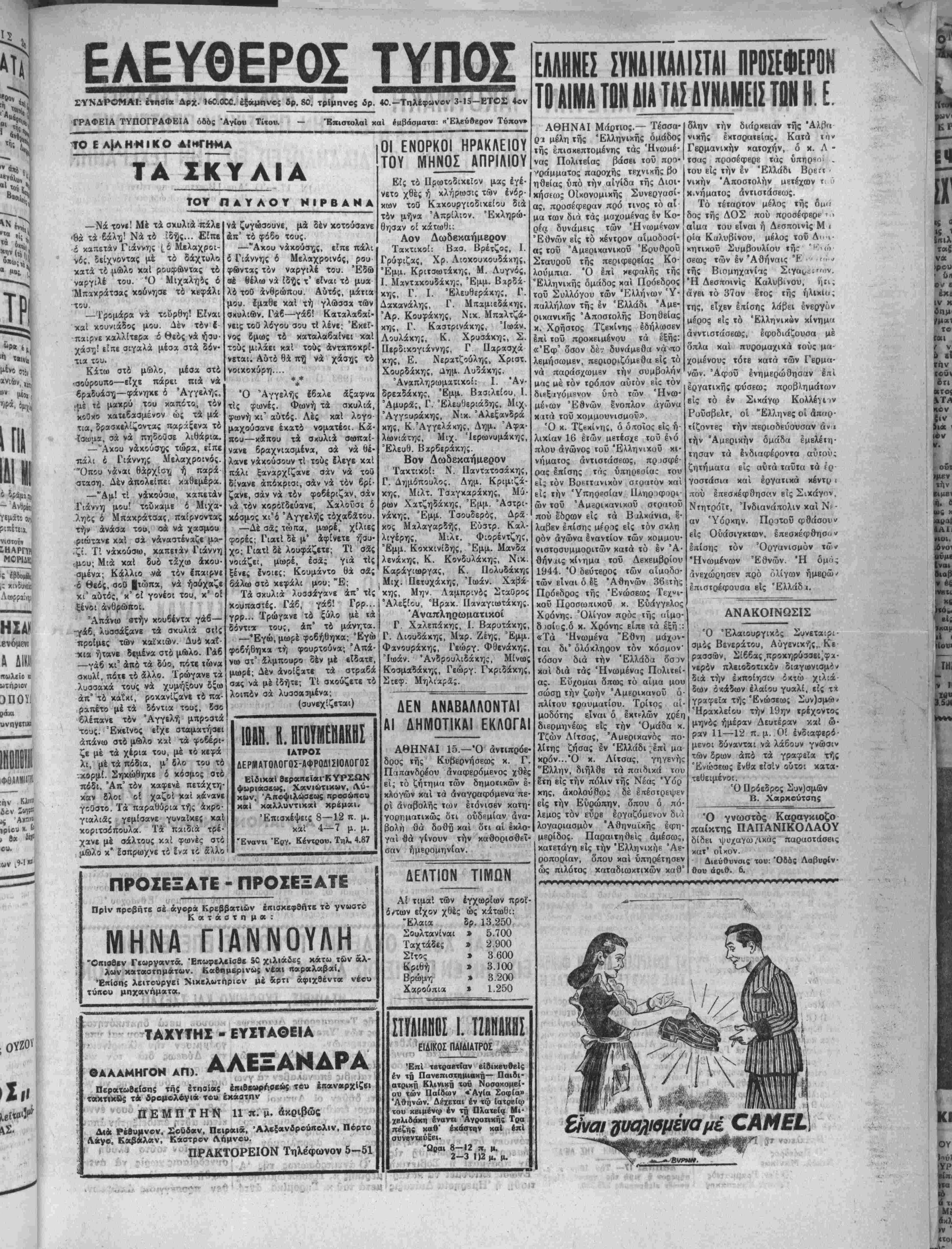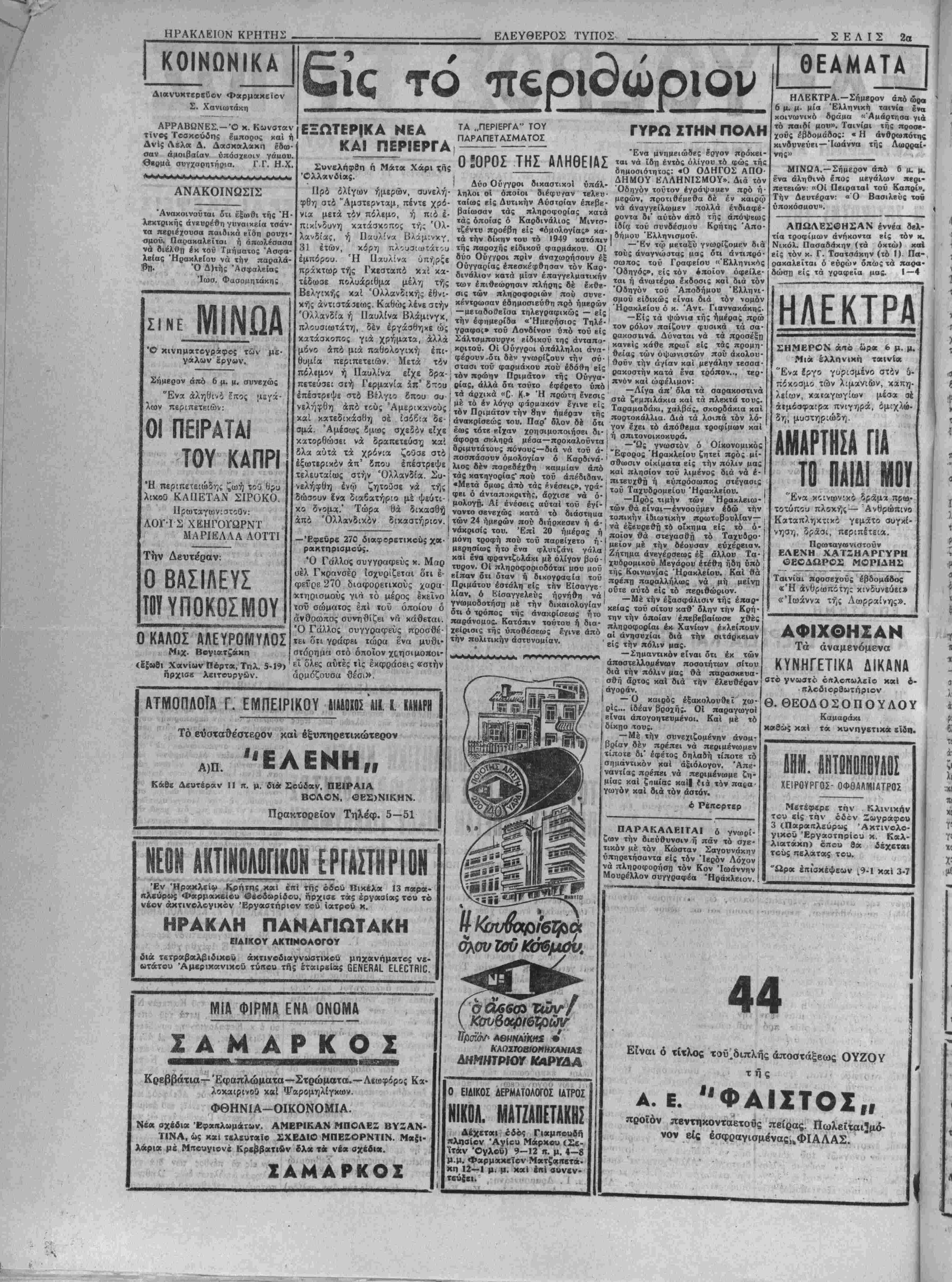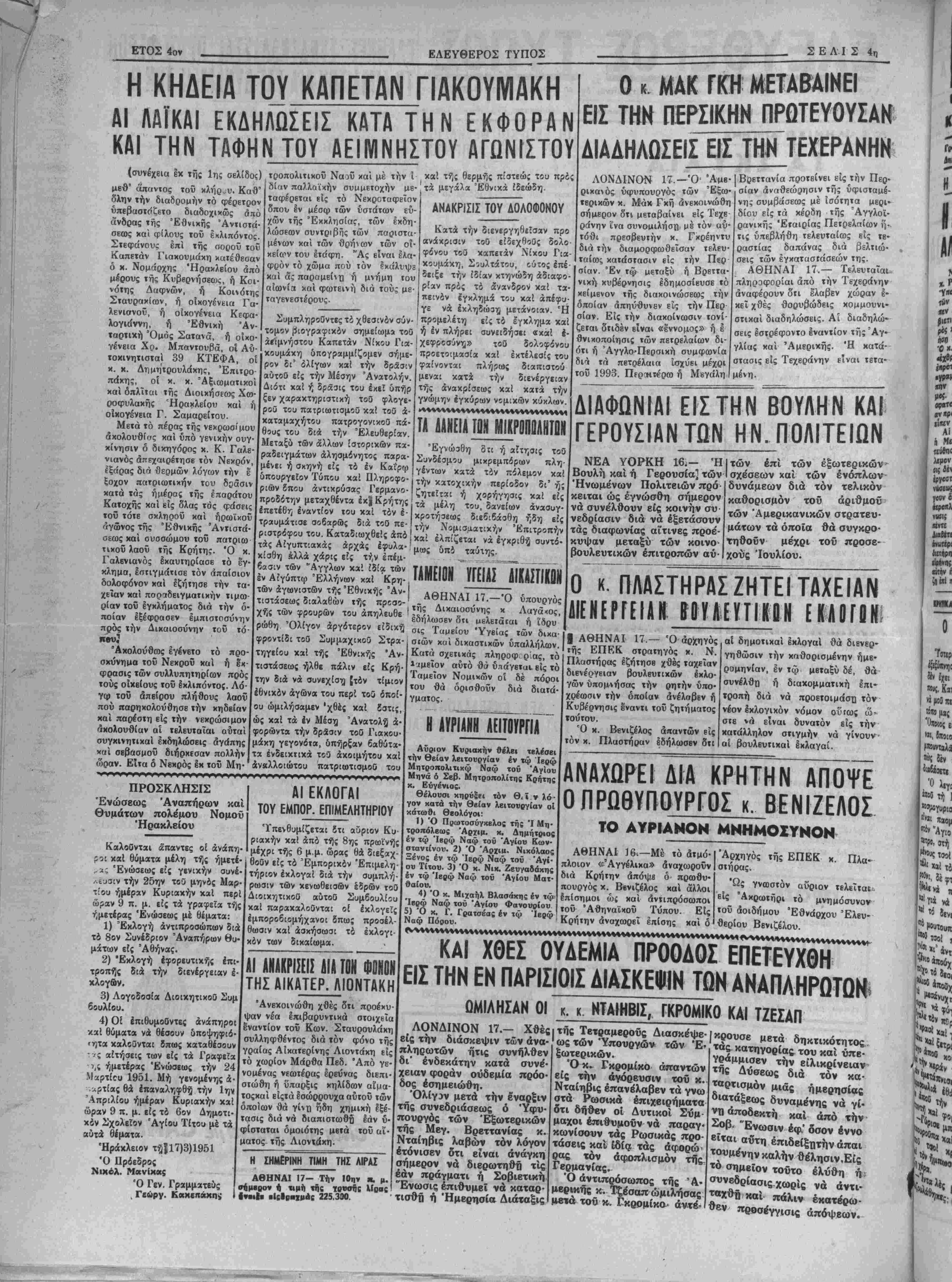 <Μαρτί<:υ 1951. Μή γενομένης ά .^ρτίας θά επαναληφθή την 1ην. Απριλίου ημέραν Κυριακήν καί ώραν 9 π. μ. είς τό 6ον Δημοτι¬ κόν Σχολείον Άγίου Τίτου μέ τα αύτά θέματα. Ηράκλειον τ^ϊ17)3)1951 Ό Πρίεδρος Νικολ. Μανίκας Ό Γεν. Γραμματεύς , Γεώργ. Κά ΑΙ ΕΚΛΟΓΑΙ ΤΟΥ ΕΜΠΟΡ. ΕΠΙΜΕΛΗΤΗΡΙΟΥ 'Υπενθυμίζεται δτι οϋριον Κυ¬ ριακήν χαί άπό τής 8ης πρωϊνής μέχρι τής 6 μ.μ. ώρας θά διεξαχ- θοθν είς τό Εμπορικόν Έπιμελη τήριον εκλογαί διά την συμπλή¬ ρωσιν των χενωθεισων έϊρών τοθ Διοικητικοθ αύτοθ Συμβουλίου καί παραχαλοθνται οί Ικλογεϊς Ιμποροβιομήχανοι δπως προσέλ¬ θωσιν καί άσκήσωσι τό έκλογι- χόν των δικαίωμα. ΑΘΗΝΑΙ 17.—Ό Δικαιοσύνης κ ωσεν ότι ιιελετάται ή 'ίδρυ σις Ταμείου 'Υγείας των δικα- σ»ών καί δικαστικών ύπαλλήλων. Κατά σχετικάς πληροφ ρ άς, τό ΐιμεΐον αύτό θά ύπάγετοι είς τό Ταμείον Νομιχών οί δέ πόροι τού θά όρισθοΰν διά διατά- γματος. βΐχανος υφυπουρΥος των τερικών κ. Μάκ Γκή ανεκοινώθη σήμερον ότι μεταβαίνει είς Τεχε ράνην ίνα συνομίλησε μέ τόν αυ¬ τόθι πρεσβευτήν χ. Γχρέηντυ διά την διαμορφωθεΐσαν τελευ¬ ταίως κατάστασιν είς την Περ σίαν. Έν τώ μεταξύ ή Βρεττα- νίκη κυβέρνησις έδημοσίευσε τό κείμενον τής διακοινώσεως την οποίαν απηύθυνεν εις την Περ σίαν. Είς την διακοίνωσιν τονί- ζεται δΐιδέν είναι «έννομος» ή ε θνιχοποίησις των πετρελαίων δι¬ ότι ή Άγγλο-Περσική συμφωνία διά τα πετςέλαια ΊσχυΕΐ μέχοι τοΰ 1993. Περ»ιτέρω ή Μεγάλη νης συμβάσεως μέ Ίσότητα μερι· δίου είς τα χέρδη τής Άγγλοί- ρανικής Έταιρίας Πετρελαίων ή¬ τις υπεβλήθη τελευταίως είς τε¬ ραστίας δαπάνας διά βελτιώ· σεις των έγκατασΐάσεών της. ΑΘΗΝΑΙ 17.— Τελευταίαι* πληροφορίαι άπό την Τέχεράνην άναφέρουν ότι έλαβεν χώραν έ- κεΐ χθές θορυβώδεις χομμουνι» στικαί διαδηλώσεις. Αί διαδηλώ· σεις έστρέφοντο εναντίον τής Αγ¬ γλίας χαί Άμερικής. Ή χατά-- στασις είς Τεχεράνην είναι ΐετα- μένη. ΔΙΛΦΩΝΙΛΙ ΕΙΣ ΤΗΝ ΒΟΥΛΗΝ ΚΑΙ ΓΕΡΟΥΣΙΑΝ ΤΩΝ ΗΝ. ΠΟΛΙΤΕΙΩΝ ΝΕΑ ΥΟΡΚΗ 16,— 'ΗΙτών επί των εξωτερικών Βουλή καί ή Γερουσία] των Ι σχέσεων χαί των ένόπλων Ήνωμένων Πολιτβιών προ κείται ώς εγνώσθη σήμερον νά συνέλθουν είς κοινήν συ¬ νεδρίασιν διά νά έξετάσουν τάς διαφωνίας αΐτινες προε'- κυψαν μεταξύ των κοινο- βουλευτικών επιτροπών αύ- δυνάμεων διά τόν τβλικόν καθορισμόν τοΰ άριθμοΰ' των Άμερικανικών στρατευ- μάτων τα όποϊα θά συγκρο· τηθοΰν μέχρι τοΰ προσε¬ χούς Ιουλίου. Ο κ. ΠΛΑΣΤΗΡΑΣ ΖΗΤΕΙ ΤΑΧΕΙΑΝ ΔΙΕΝΕΡΓΕΙΑΝ ΒΊΥΛΕΥΤΙΧΟΝ Ε Κ Α Ο Γ Ο Ν Η πΪΡΙΑΗγ! ΑΕΙΤΟΥΡΠΑ Αύριον Κυριακήν Θέλει τελέσει την Θείαν λειτουργίαν έν τω Ιερφ Μητροπολιτικώ Ναφ τοΰ Άγίου Μηνά ό Σεβ. Μητροπολίτης Κρήτης κ. Εύγένιος. Θέλουσι κηρύ£ει τόν Θ,ϊ ν λό¬ γον κατά την θείαν λειτουργίαν οί κάτωθι θβολόγοι: Ι) Ό Πρωτοσύγχελος τής Ί Μη¬ τροπόλεως Άρχιμ. κ. Δημήτριος έν τώ Ίβρφ Ναφ τοΰ Άγίου Κων¬ σταντίνου. 2) Ό Άρχιιι. Νικόλαος Ξένος έν τφ Ίβρφ Ναφ τού Άγί- ου Τίτου. 3) Ό κ. Νικ. Ζευγαδάκης έν τφ Ίβρφ Ναφ τού Άγ£ου Ματ¬ θαίου. ΑΙ ΑΝΑΚΡΙΣΕΙΣ ΔΙΑ ΤΩΝ ΦΟΝΟΝ ΤΗΣ ΑΙΚΑΤΕΡ. ΛΙΟΝΤΑΚΗ "Ανεκοινώθη χθές ότι προέκυ- ψαν νέα επιβαρυντικά στοιχκα εναντίον τοΰ Κων. Σταυρουλάκη συλληφθέντος διά τόν φόνο τής γραίας Αικατερίνης Λιοντάκη είς ΐό χωρίον Μάρθα Πεδ. Άπό γε- Όμένας νεωτέρας ερεύνας διεπι¬ στώθη ή ύπαρξις χηλίδων αϊμα- τοςχαί ειςτά εσώρρουχα αυτού των οποίων θά γίνη ηδη χημική έξέ- τασις διά νά διαπιστωθ'ό εάν υ¬ φίσταται όμοιότης μβτά τοΰ αί- ματος τής Λιοντάκη. Η ΣΗΜΕΡΙΝΗ ΤΙΜΗ ΤΗΣ ΑΙΡΑΙ ΑΘΗΝΑΙ 17- Την ΙΟην κ. μ. σήμερον ή ΐιμή τής γοβσής λΐρας ν·ι|ε ιΙςΙβΒΐμας 225,390. | ΑΘΗΝΑΙ 1