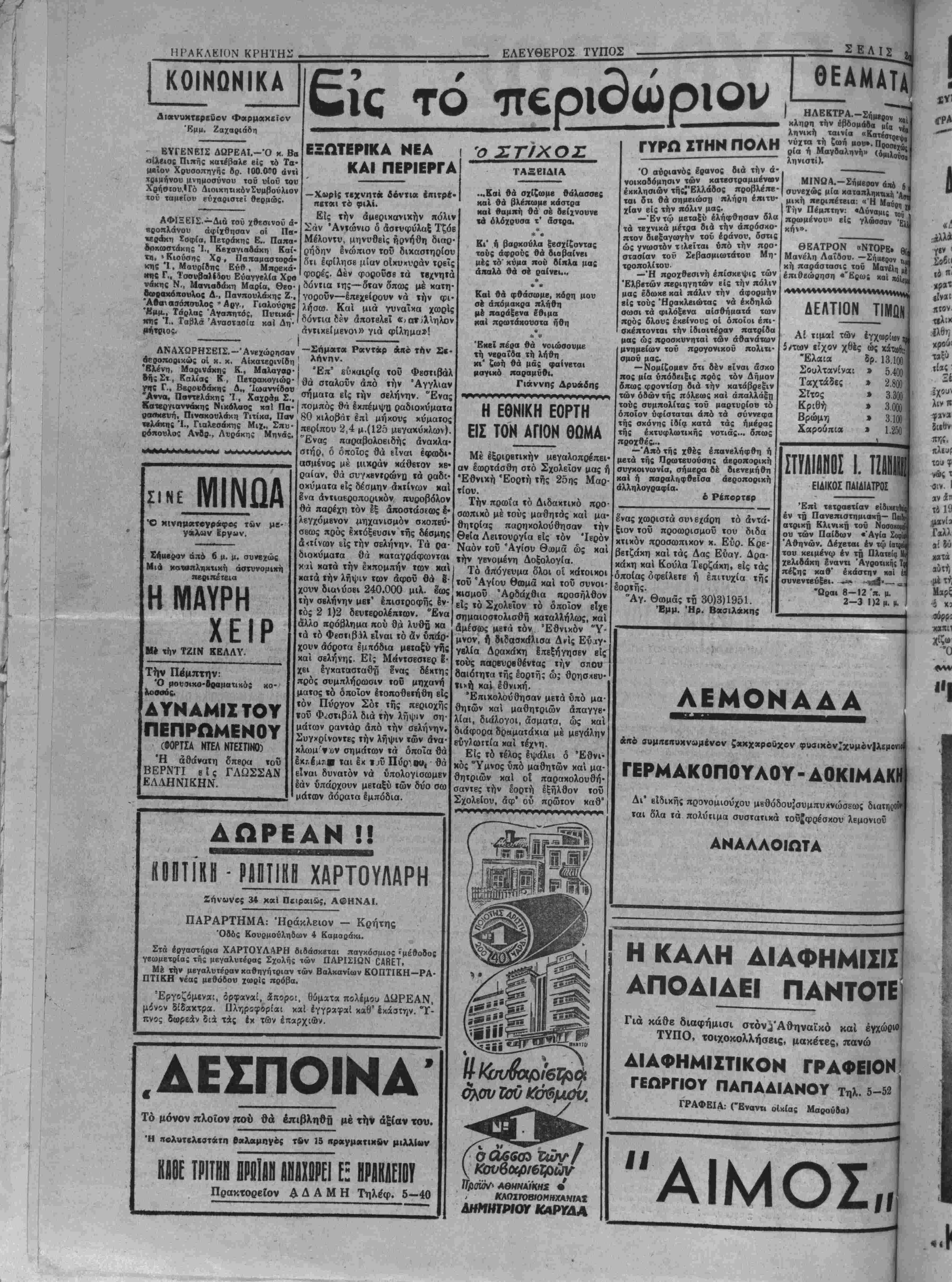 Γ [ι||ΐηΐ|||η|,*<Ρ'ουσιον καί εύλογημένον Ι ΐΨΑΓΜΙΙ τέ ν κόσμον λαόν τοϋ Κυ- 9 Η ϊΰαΐσθητος Ελλην ικη ία ένηγχαλίσθη τόν άδιχη- θεόν τού Γολγοβά καί τα; έθνικας περιπετείας ή Ψυλη ηκολούθησε ^ ν ·1ς την μαρτυ- ϋ ι,ν τού πορείαν. Καί δτ* ή ΐκονομιχοι ι"λι5 ΤΜν «όλβων έηικτε είς οΰν την κ Πύλην τοΰ Ρυμανοδ «ή * επι τή: *β έδά καστικο « τβχήί «ν»»1 τ- ςινκτ,« ία€ ώέοεΐί ' ^ '' Δια πουργδν Ναών θά διενεργηθή τανελλή νιο; ερανος. Ό λαός μας ό πι στός χαί μαρτυρικος λαός, αΰ τος ιτου έδωκε τα παιδία τού, δ,τι εΐχε καί δέν εϊχε είς τον εθνικον άγωνα, ό λαός πού γνω ρίζβι να ώακρύζη μαζί μέ την χαράν τής Ελλάδος καί νά θλίβεται δια τόν πόνον της, ό εύσεβής λαός μα; θα στηρίξη μέ τό ύατερημα τού τίς Έκκλησίες. Θά γραψη μέ την αυριανήν προαφοραν τού ό καθ' ενας τό ονομα τού είς τα Δίπτυχα των 'Εκκλησιών καί θά στηρί{η μίαν Αγίαν Τράπεζαν δια νά μνη· μονεύβται τό ονομά τού είς αί· ώνα τόν άπαντα ώ; οΐχοδόμος τοΰ ναού τοϋ ©εοϋ καΐ τοΰ να¬ ού τής άγίας Ελλάδος. ΟΣΟΙ ΠΙΣΤΟΙ είς τόν Χρι- στόν καί την 'Ελλαδα ά; στερε- ώσωμε αυριον τα θεμέλια τοΰ έ- θνου; κτίζοντε; την εκκλησίαν τοΰ χωρίου, γιατΐ ίπω; διακη· ρΰττΕΐ ή ίστορία: Όταν τό "Βθνος κι' ό Χριστός [θάναι άγκαλιασμένο» τότε καί θα γυρίσουνκ ο! χρόνοι [οί δοξασμένοι. ΙΩΑΝ. ΕΜΜ. ΤΣΑΤΣΑΡΩΝΑΚΗΣ ΜΙΑ ΑΜΕΡΙΚΑΝΙΚΚ ΣΥΓΚΡΙΣΙΣ Η ΕΝΩΣΙΣ ΤΗΣ ΚΥΠΡΟΥ! ι Ό έν Αθήναις παρεπιξημών Έ'ίνάρχη; καί Άρχΐεπίσκοπος Κύπρου Μακάριος θά έπ'σκεφθή σήμερον την Βχσίλισσαν, αφοδ προηγουμένως ένημερωθή 6πό τού ΙΙροέ5ρου τής Έλληνικής Κυβερνήσεως επί τής προωθήσεως τοΰ ΚυπρΐακοΟ ζητήμχιος 6πά τής .Κυβερνήσεως, συμφώνως πρός την εσχάτως ληφθείσαν απόφασιν των ήγεΐων το3 πολιΐικοθ μας ν.όσμου. "Επ* εύ· κχιρ'α των σημερινών συνχντήσεων καί σ-ΐνομΐλιων τ ο 0 Έθνάρχου τής Κύπρου δέ^ θεωροΰμεν ^3<οπον ϊπως διά μίαν εισέτι φοράν διερμηνεύσωμεν την συμπαράσταοιν των Κρη- τών πρός τούς άδελφούς Κυπρίουί είς τόν διεξαγόμενον αυτών ιερόν άγώ/α τή; έθνικής άΐτοκαταστάσεως. Καί πιστεύΐμεν, μαζί μέ δλον τόν πεπολιτισμένον κόσμον 5τι ή ήμέρα τής Ενώσεως τής πολυπαθοθς Μεγαλονήσου μετά τή{Μητρδς Ελλάδος πλησιάζει. Εί¬ ναι απαράγραπτον τδ φυσικόν δικαίωμα τής αύΐοδιαθέσεω; τοθ άνθρώπου. Καί πιστεύομεν δτι ή φίλη καί σύμμαχος Μ Βρετταν- νία δέν θά παρατείνη επί πλέον την αγωνίαν ένάς Λχοΰ ζη· τοΰντος τό δικαίωμα νά ζήση ελευθέρας. ΓΕΩΡΓΙΟΣ Β'. Είς τάς Αθήνας καΐ τάς έπαρ χίος έτβλέσθη μετ" έηιβλητικότητος τό μνημόσυνον τοΰ αειμνήστου Βα¬ σιλέως Γεωργίου Β'. Ή έλληνικη σκέψις μετά πολλής εΰλαβείας άν&· μιμνήσθη τού Βασιλέως των δύο ιι'Οχι» ό οποίος συνέββσβν άνα ΤΟ ΜΑΛΕΒΥΖΙ χθέ(. «ρο{ ι ς τού; ,ιν μαί ταράχθηκε χι' έδάκρυ Ίβτε ή «τονε- λιμμένη διά τόν κα· τής μοΐρας Φυλή έ- ό δράμα τή; Ετ&υρωΐεω; Μοναστήρι». Εγνώρισε τεριχότητα τοΰς έμπαιγ- ~ |_|Τ11/ Α , τα ραπίσματ», τού; έμητι- ΠΙ ΙΙΗ ^ την λόγχην τού τυράν- —~" τό απέραντον μΐσος, τόν χβέ{ ιι$ ΐΜτόν ' Αδη τής δουλείας, άλλ' αμενέμειβι *ντλητος εί; δύναμιν και τ ,,βνιιν ήντλησε θαρρος άπό ίγηται. Ι«^ϋ9ιβν τβύ ©€βνβρωπβυ καί ιος, μΐτι «ν προσδοχίαν τής «πολύ¬ ς τά{ κρ)[»*Μς ««Ι τής χαράς τού βρι- - μαρτυρική χαί αίμοφυρ· Οί χρονια άπεραντου ά- „. κατω άιτό τό παρήγορο Ήίώμα τή; Έχχλησίας. «Λταν τό αΐματωμίνο [β»! βϊόδβτον εβνο; μας εΰρί ^ψ άσπαϊρον υπό τα δεσμά /Ασιατου καταχτητοϋ χά '"ά πυχνα σχότη τής δου :ιϊ ϊβλεπε έαυτό νά έγχατα τα ι άπο τ^ΰς λογάδες χά κολιτικοϋ; τού εστρεψε ρακλητιχόν βλέμμα τού ου; εναπομείναντας άπό ληρβν διωγμόν ρασοςρο και εζήτησε στοργήν θ