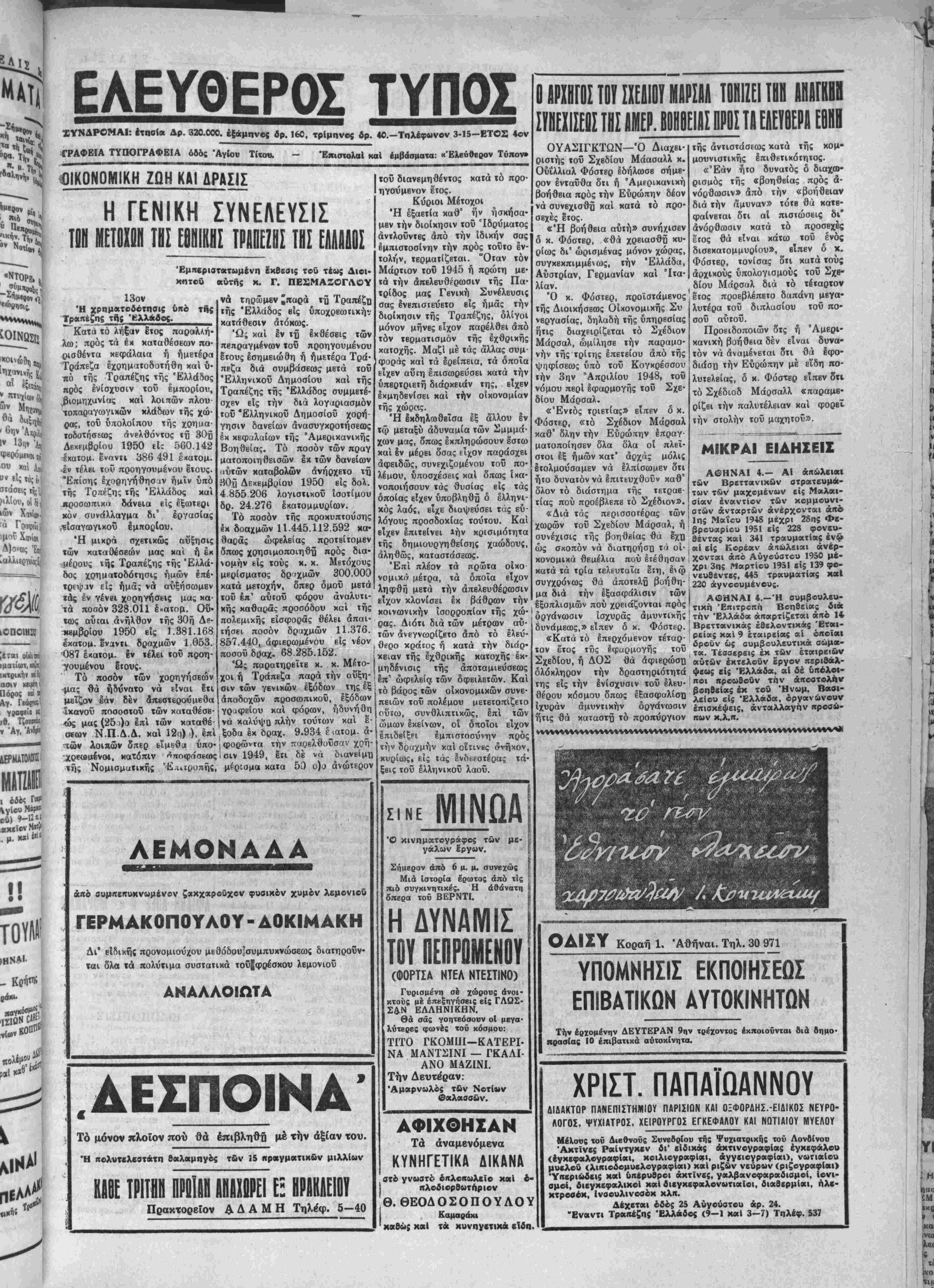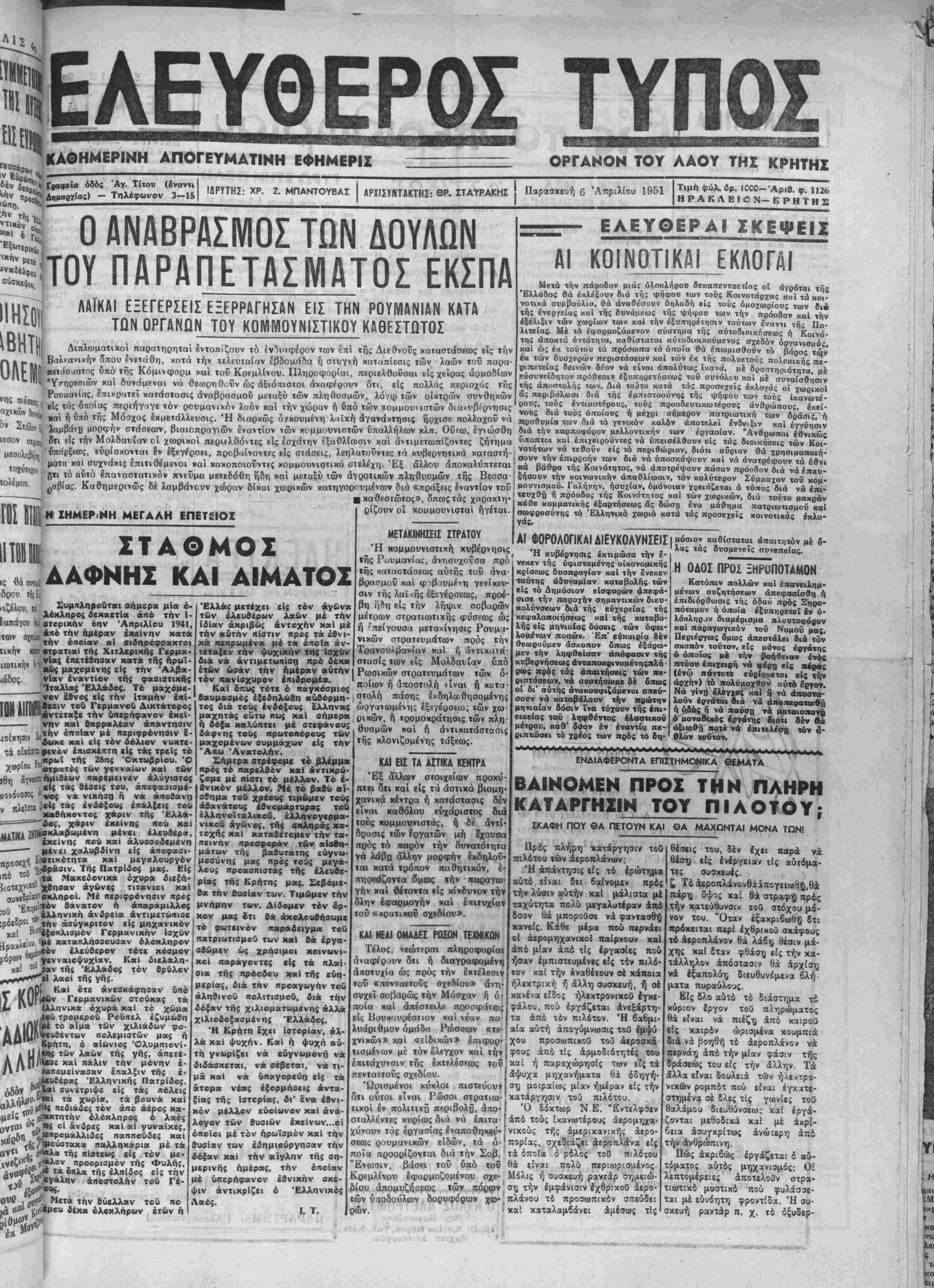ΙΔΡΥΤΗΣ: ΧΡ. Ζ. ΜΠΑΝΤΟΥΒΑ! | ΑΡΧΙΣΥΝΤΑΚΤΗΣ: ©Ρ· ΣΤΑΥΡΑΚΗ! { Παρασχευή 6 Απριλίου 1951