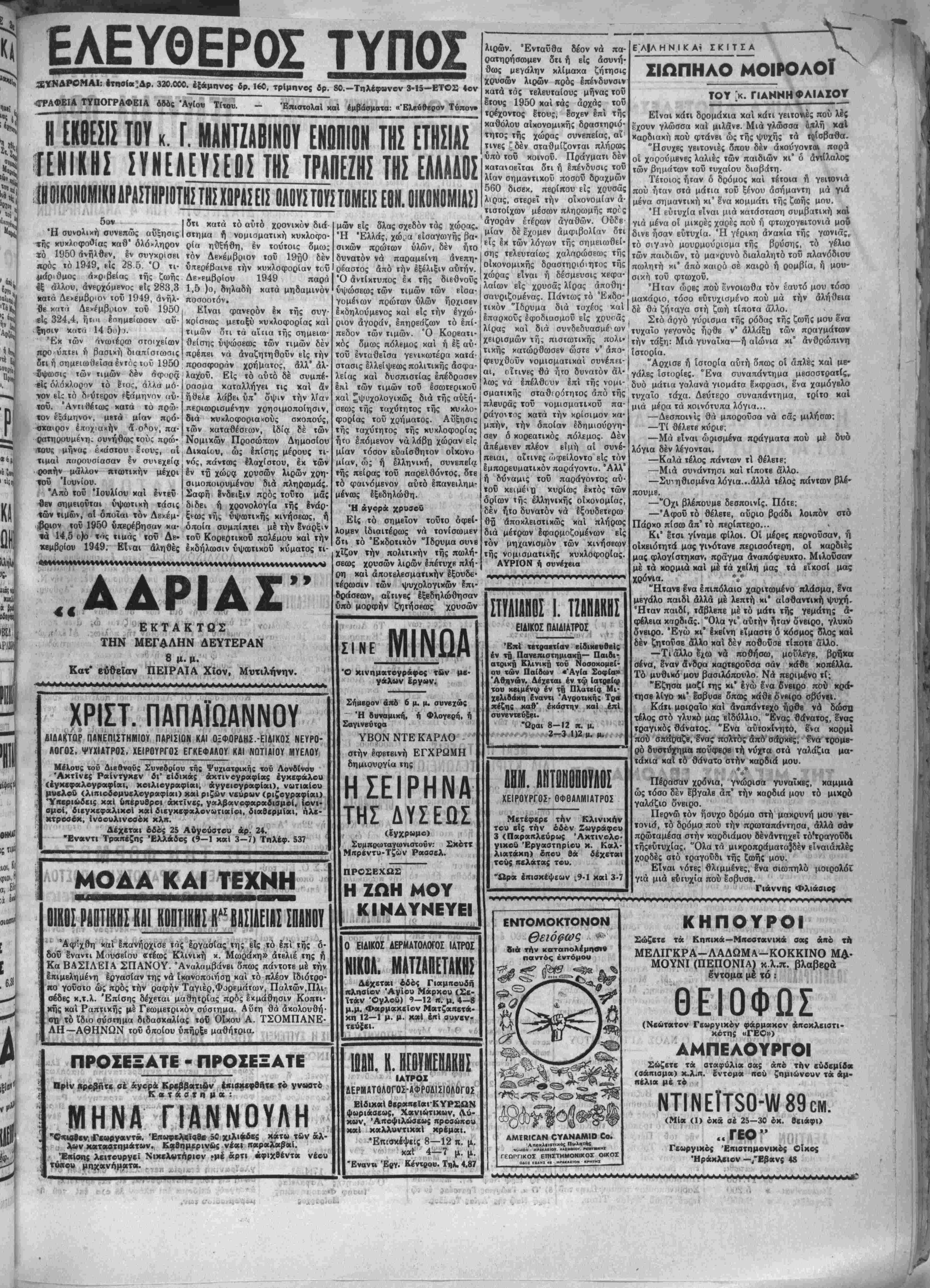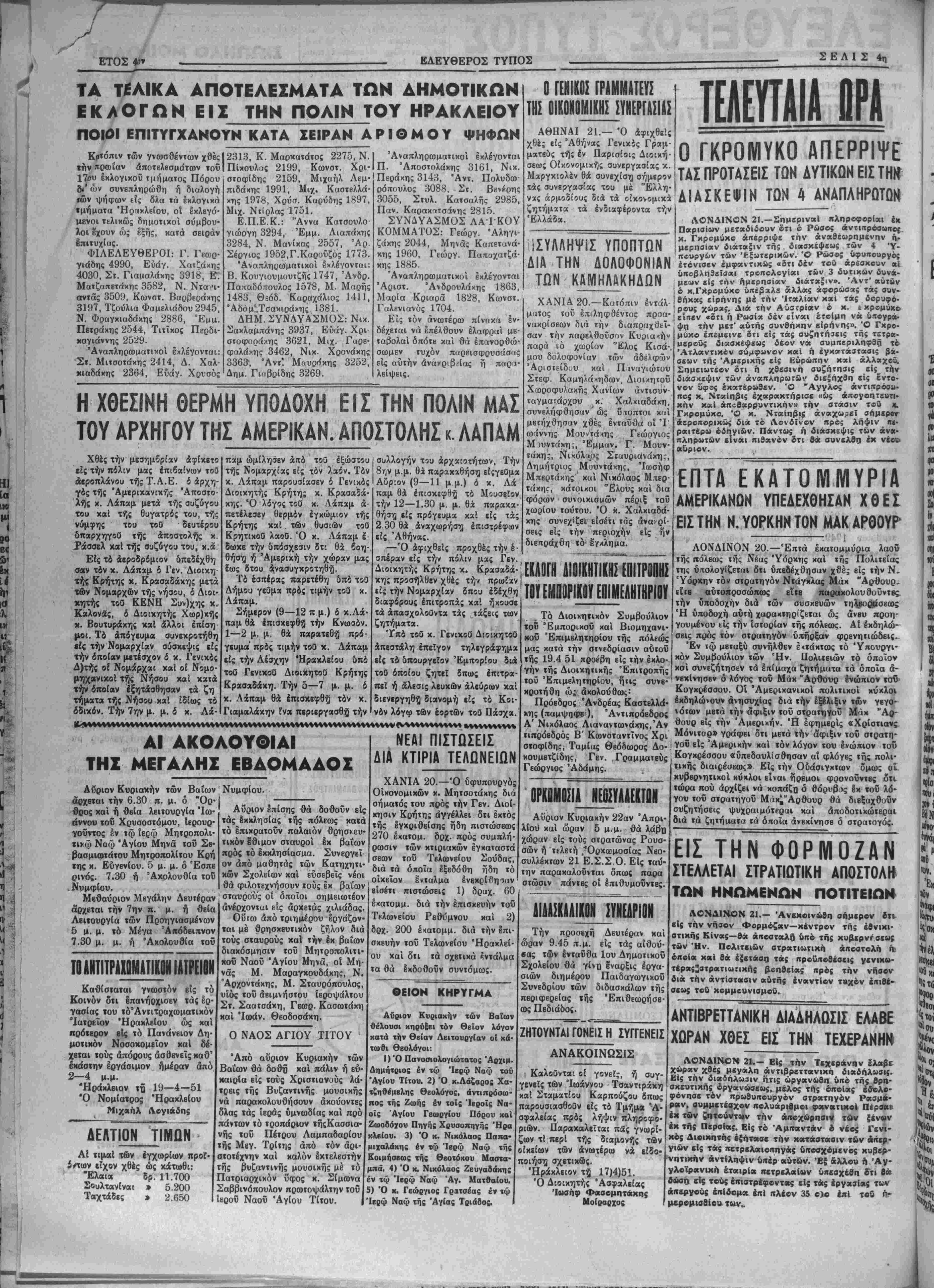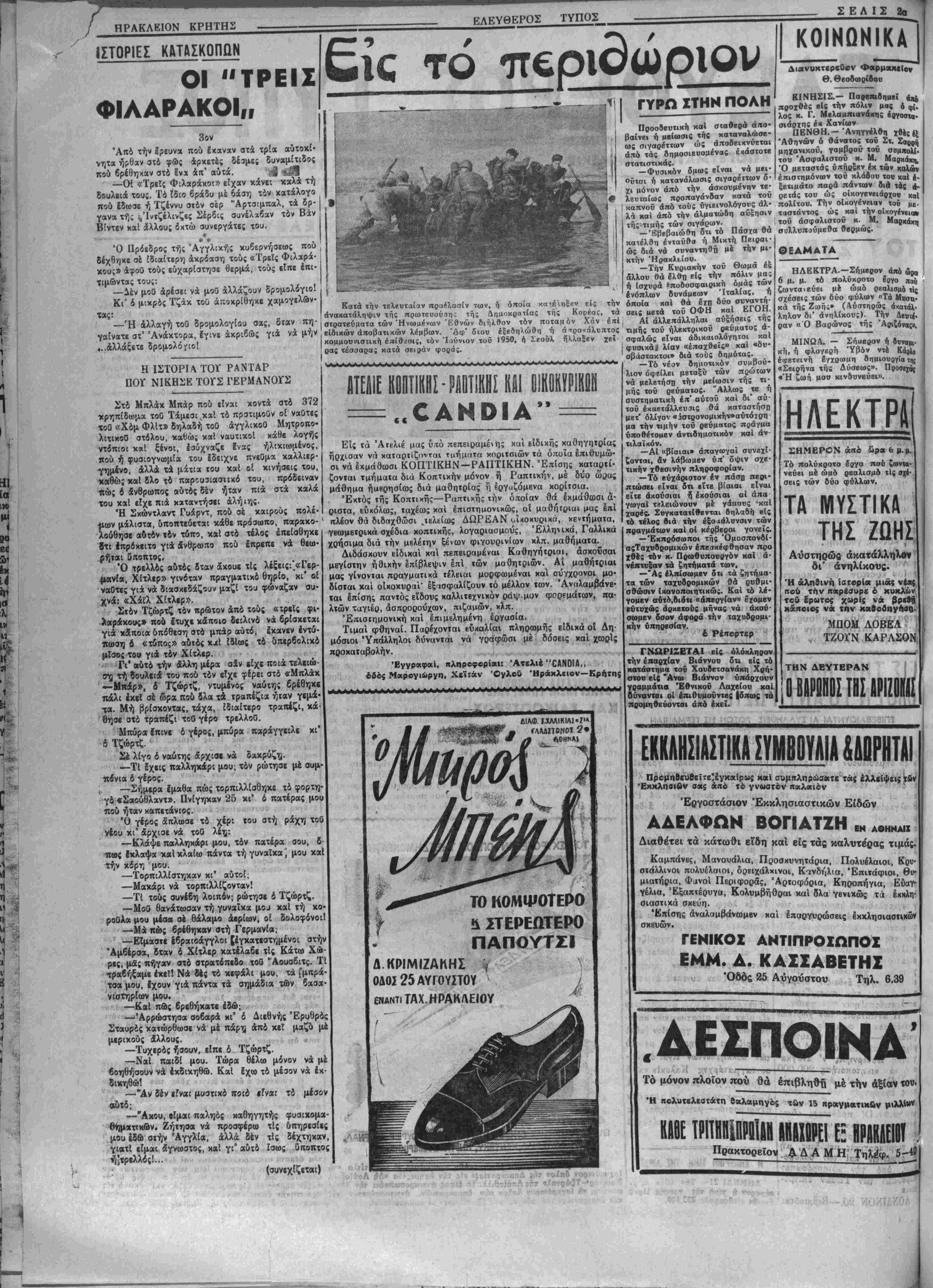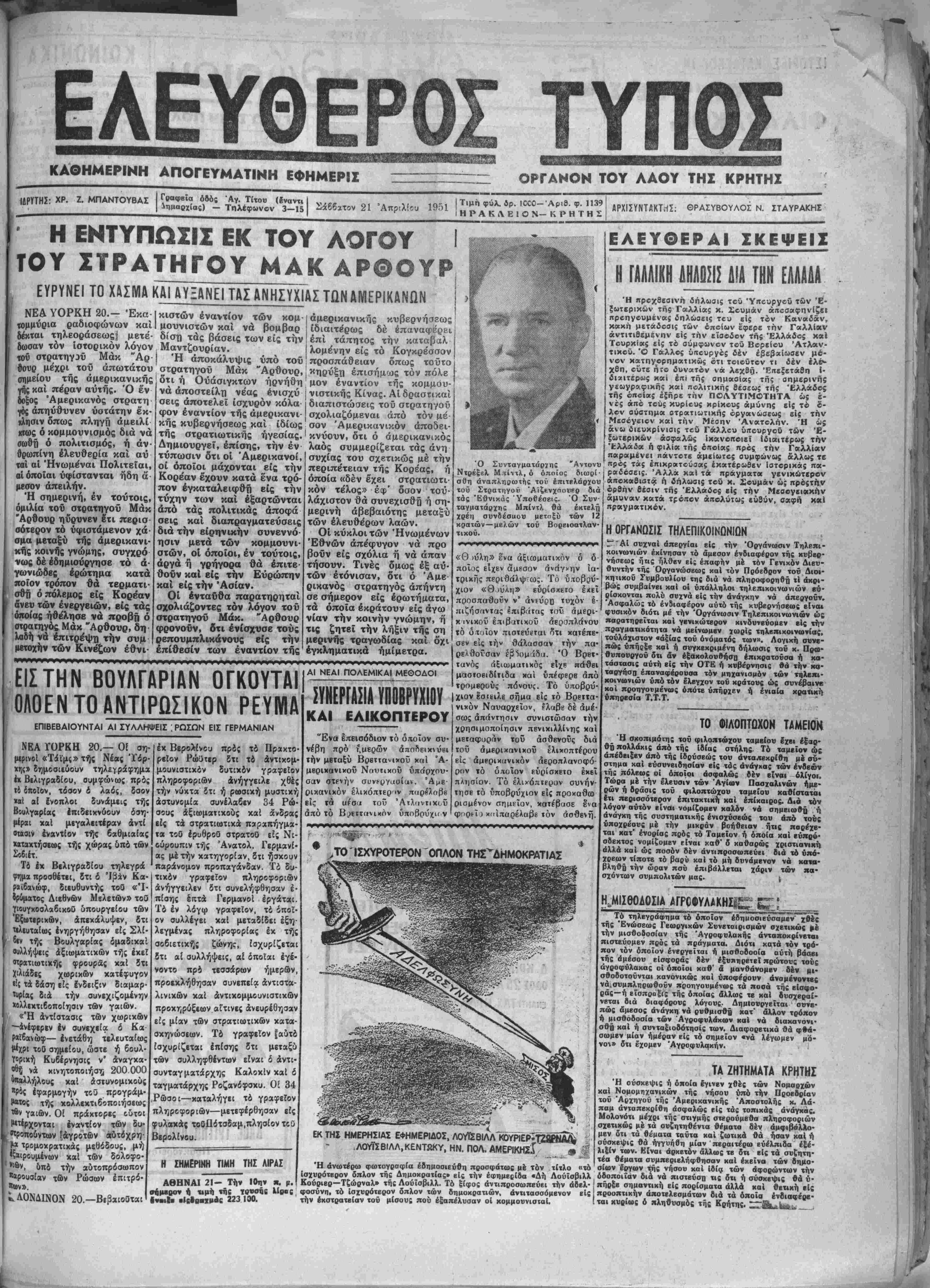 Έν τφ μβΐαξύ συνήλθεν ε<τάκτως τό 'Υπουργι¬ κόν Συμβούλιον των Ήν. Πολιιειών τό οποίον κσί συνεζή"τησε.ν τα έπίμαχα ζητήματα τα όποΐα ά- ΐοϋ Έπιμελητηρίου, ήτις συνε-' νβχ1*τΙσβν δ λόγος τού Μάκ "Αρθουρ ενώπιον τοθ κροτηθη ώ; ακολούθως: Κογκρέσσου. Οί Άμερικανικοί πολιτικοί κυκλοι Πρόεδρο; Ανδρέας Καστελλά- «"δηλώνουν ανησυχίας διά την εξέλιξιν των γβγο- κης(παμψηφει), Άντιπρόβδρο; *·ότων μβτά την άφιξιν τοϋ στρατηγοΰ Μάκ Άρ- Α' Νικόλαος Λιαναντωνάκης,Άν θου β1« ΙΤ"ν Αμερικήν. Ή εφημερίς «Χρίστιανς τιπ'ρόεδρός Β' Κωνσταντίνος Χρι Μόνιταρ» νράφβι δτι μετά την άφιξιν τοΰ στρατη- στοφίδη:, Ταμίας Θβόδωρος Δο-' νοΰ 8.ς_Άμβρικήν καί τόν λόγον τού ενώπιον τοΰ Γεν. Γραμματεύς ^ογκρέσσου «ύπβδαυλίσβησαν αί φλόγες τής πολι· τιχής διαιρέυεως» Είς την Ούάσιγχΐων ομως οί κυββρνηΐιχοί χύχλοι είναι ήρεμοι φρονούντες δτι ΐώρα πού άρχΐζει νά κοπάζη ό θόρυβος έκ τοΰ λό· γου τού στρατηγοΰ Μ(ίκ|,Άρθουρ θά διεξαχθοΰν συζητήσεις ψυχραιμότεραι καί άποδοτικώτεραι κουμβτζίδης, Γεώργιος Άόάμης. ΟΡΧΟΜΟΣΙΑ ΝΕΟ.ΥΑΛΕΚΤΟΝ Αυριον Κυριακήν 22αν Απρι¬ λίου χαί ώραν 5 μ.μ. θά λάβμ χώραν είς τούς στρατώνας Ρουσ- σών ή τελετή ,Όρχοομοσίας Νβο- συλλέκτων 21 Ε.Σ.Σ.Ο. Είς ταύ¬ την παρακαλοϋνται όπως παρα στώσιν πάντες οί επιθυμούντες. ΘΕΙΟΝ ΚΗΡΥΓΜΑ Αύριον Κυριακήν των Βαΐων θέλουσι χηρύξει τόν θείον λόγον κατά την θείαν Λειτουργίαν οί κά τωθι θεολόγοι: 1)Ό Πανοσιολογιώτατος Άρχιμ. Δημήτριος έν τφ Ίβρφ Ναφ τού Άγίου Τίτον. 2) Ό κ.Λάζαροί Χα- τζηθέμελης θεολόγος, άντιπρόσω- πος τής Ζωής έν τοίς Ίεροίς Να- οίς Άγίου Γβωργίου Πόρου χαί Ζωοδόχου Πηγής Χρυσοπηγής Ήρα κλείου. 3) Ό κ. Νικόλαος Παπά- μιχαλάκης έν τω Ίβρφ Ναφ τής Κοιμήσβως τής θεοτόκου Μαστα¬ μπά. 4) Ό κ. Νικόλαος Ζβυγαδάχης έν τφ Ίβρφ Ναφ Αγ. Ματθαίου. 5) Ό χ. Γεώργιος Γρΐτσέας έν τφ Ίερφ Ναφ τής Άγίας Τριάδος. ΔΙΔΑΣΚΑΑΙΚΒΝ ΣΥΝΕΔΡΙΟΝ Την προσέχη Δευτέραν καί ώραν 9.45 π.μ. είς τάς αΐθού· •άς των ενταύθα 1ου Δημοτικόν Σχολείον θά γίν ο έναρξις εργα¬ σιών διημέρον Παιδαγωγικοΰ Συνεδριον των διδασχάλων τής περιφερείας της ως Πεδιάδος. 'Επιθεωρήσβ- ΖΗΤΟΥΝΤΑΙΓΟΝΕΙΣ Η ΣΥΓΓΕΝΕΙΣ ΑΝΑΚΟΙΝΩΣΙΣ Καλοθνται ο{ γονείς, ή αυγ- γενείς των Ιωάννου Τοαντιράκη διά τα ζτιττίμαΐα τα ότοία άνβκίνησε ό στρατογός. ΕΙΣ ΤΗΝ ΦΟΡΜΟΖΑΝ ΣΤΕΑΑΕΤΑΙ ΣΤΡΑΤΙΟΤΙΚΗ ΑΠΟΣΤΟΛΗ ΤΩΝ ΗΝΩΜΕΝΩΝ ΠΟΤ»ΤΕΙΩΝ ΛΟΝΔΙΝΟΝ 21.— Ανεκοινώθη σημερον ότι είς την νησον Φορμοζαν—κέντρον τήί έθνικι- ατικής Κίνας—θά αιτοσταλό ύηό τής κυβϊρν^ σβως των Ήν. Πολιτειών στρατιω.τική αηοοτολή ήι οκοία καί θά έξβτασο τάς πρβϋπβθέσεις γβνικΜ- τέραςΐστρατιωπκής β,βηθίίας πρός την νησον δια την αντίστασιν αυτής εναντίον τν»χόν έπιθί- σεως τοθ κομμουνισμοϋ. ΑΝΤΙΒΡΕΤΤΑΐΙίκΗ ΑΙΑλΗΑΟΣΙΣ ΕΛΑΒΕ ΧΩΡΑΝ ΧΘΕΣ ΕΙΣ ΤΗΝ ΤΕΧΕΡΑΝΗΚ ΛΟΝΔΙΝΟΝ 21.- Είς την Τΐχΐράνην ίλαβε χώραν χθές μβγαλη άντιβρβττανιχη διαδήλωσις. Είς την διαδήλωσιν ήτις ώργανωθη υπό τής βρη- σκευτιχής οργανώσεως, μβλος τής οποίας έδβλβ- ραν, αυμμετέσχον πολυάριθμοι φιχνατικοΐ ρ έχ τδν ζητοΰντ»ιν την αποχώρησιν των ξϊν»ν έκ τής Περσία;. Είς το Αμιτανταν β νβος Γβνι- κός ΔιβΐΝπτής εξήτασα την κατάστασιν των Ακβρ- ί χαί Σταματίου Καρπούζου 8πως [ φόνησβ τόν πρωθυπουργόν στρατηγόν Ρασμϊ- παρουσιασθοθν είς τό Τμήμα Α¬ σφαλείας πρό; λήψιν πληροφο¬ ριών. ΙΙαραχαλεϊται πας γνωρί- ζων τί περί τής διαμονής των οίκείων των ανωτέρω νά ΐίδο· ^^ "'5 τ*5 "«τρελβΜβπηγας Οιτοσχόμβνος κυββρ- ποιήση σχετικώς. νητικήν αντίληψιν ύ«έρ αυτών. Έδ αλλου ή Άν- Ήράκλειον τή 17)4)51. γλβϊραν