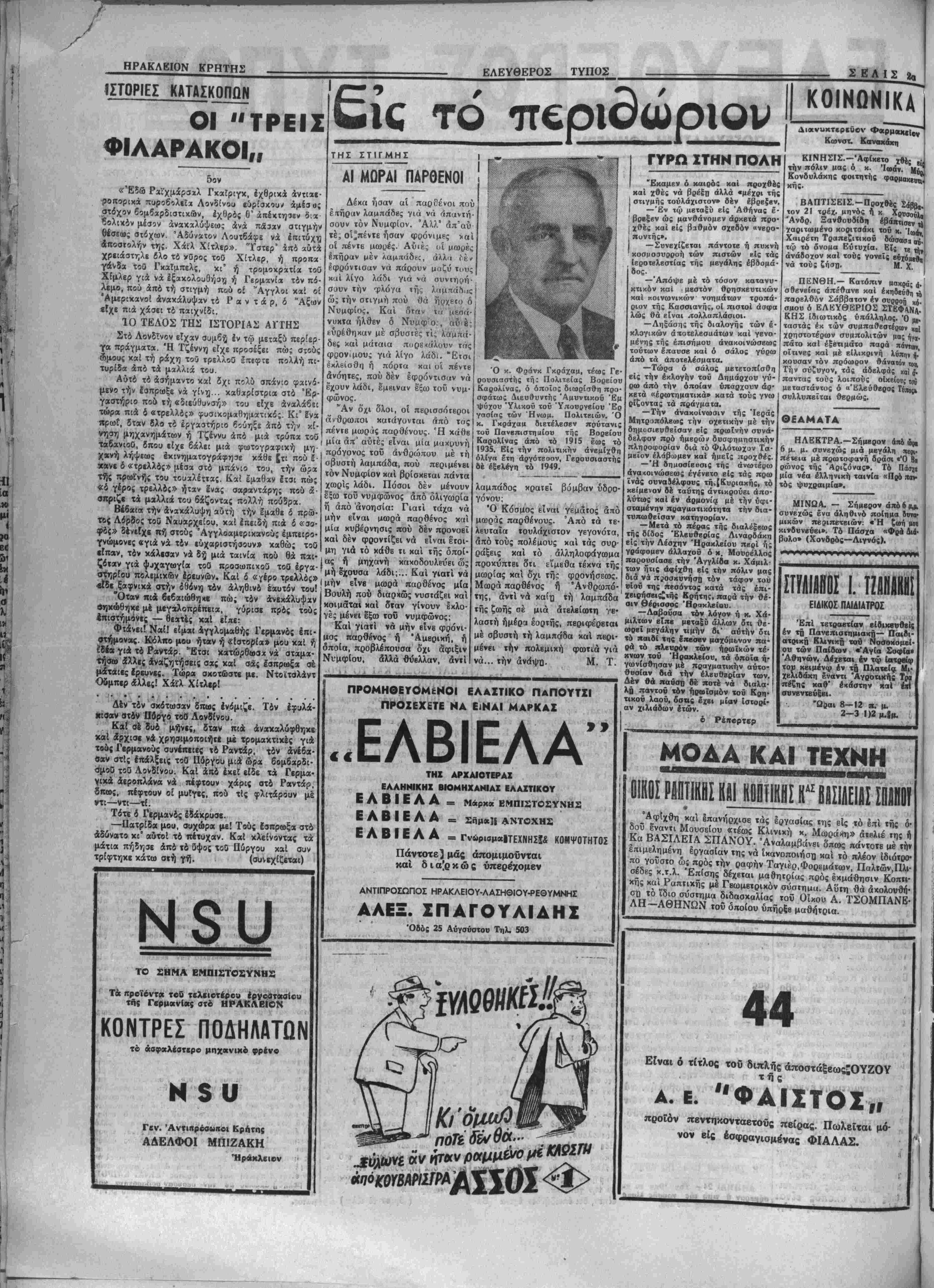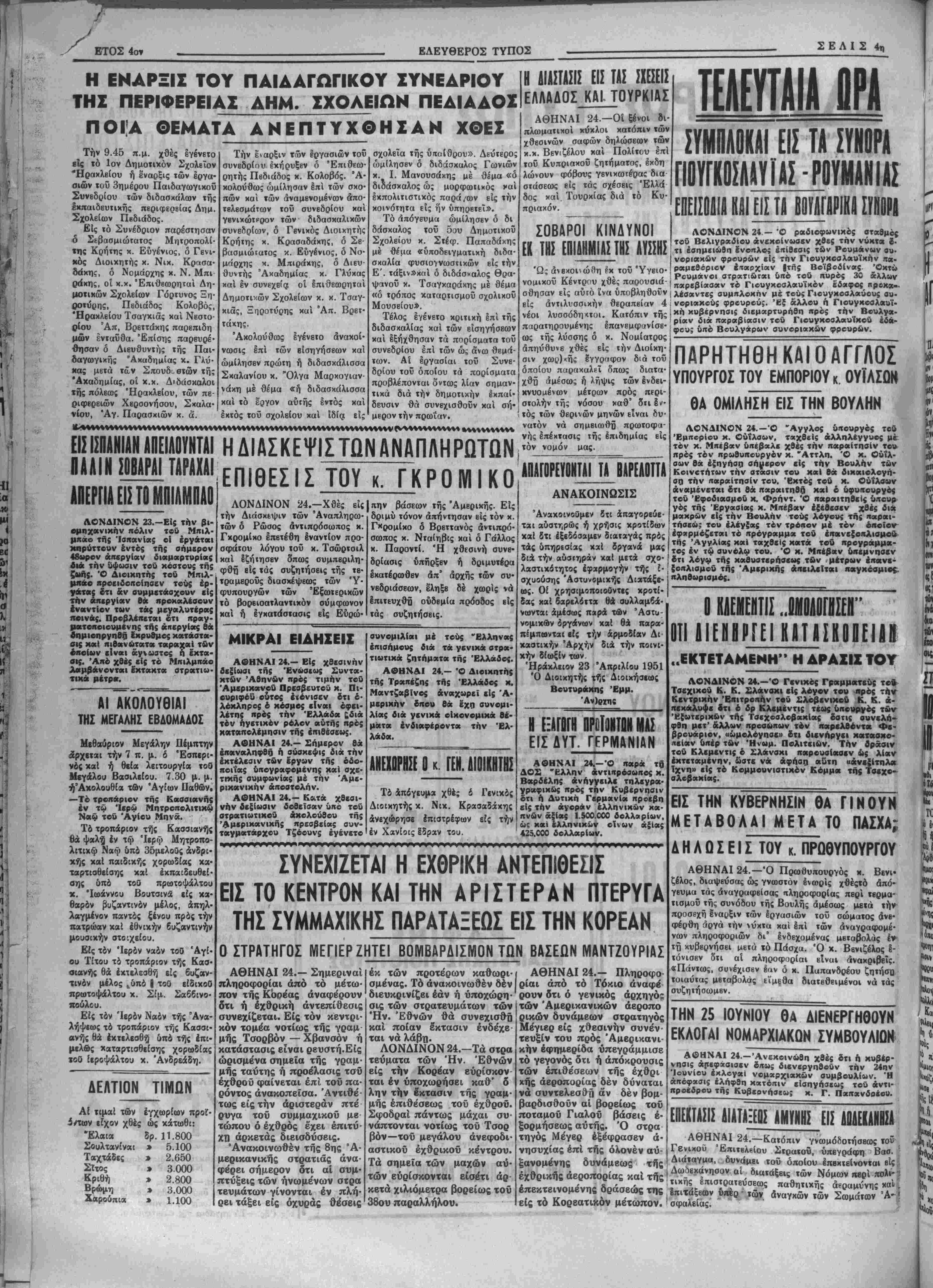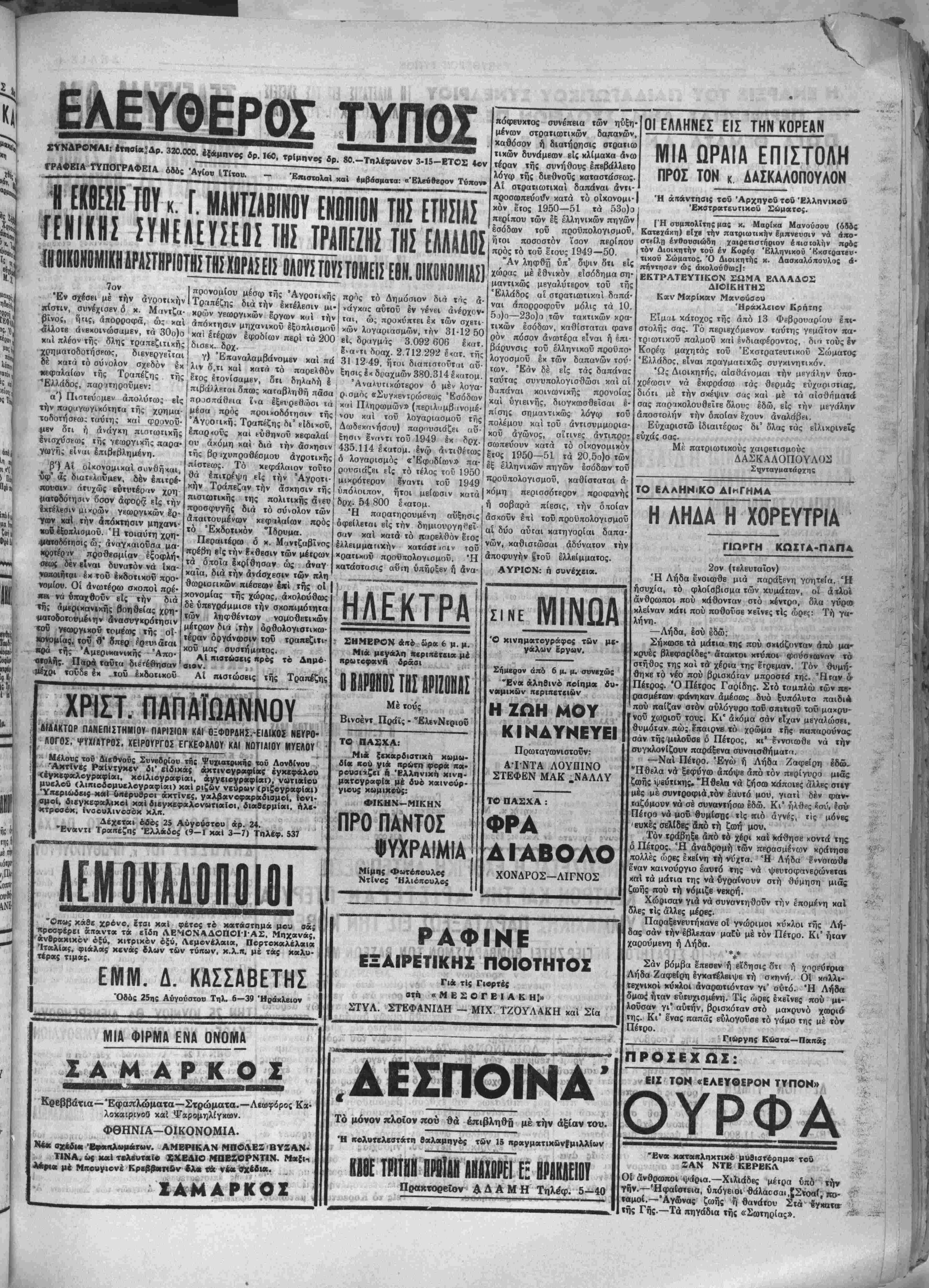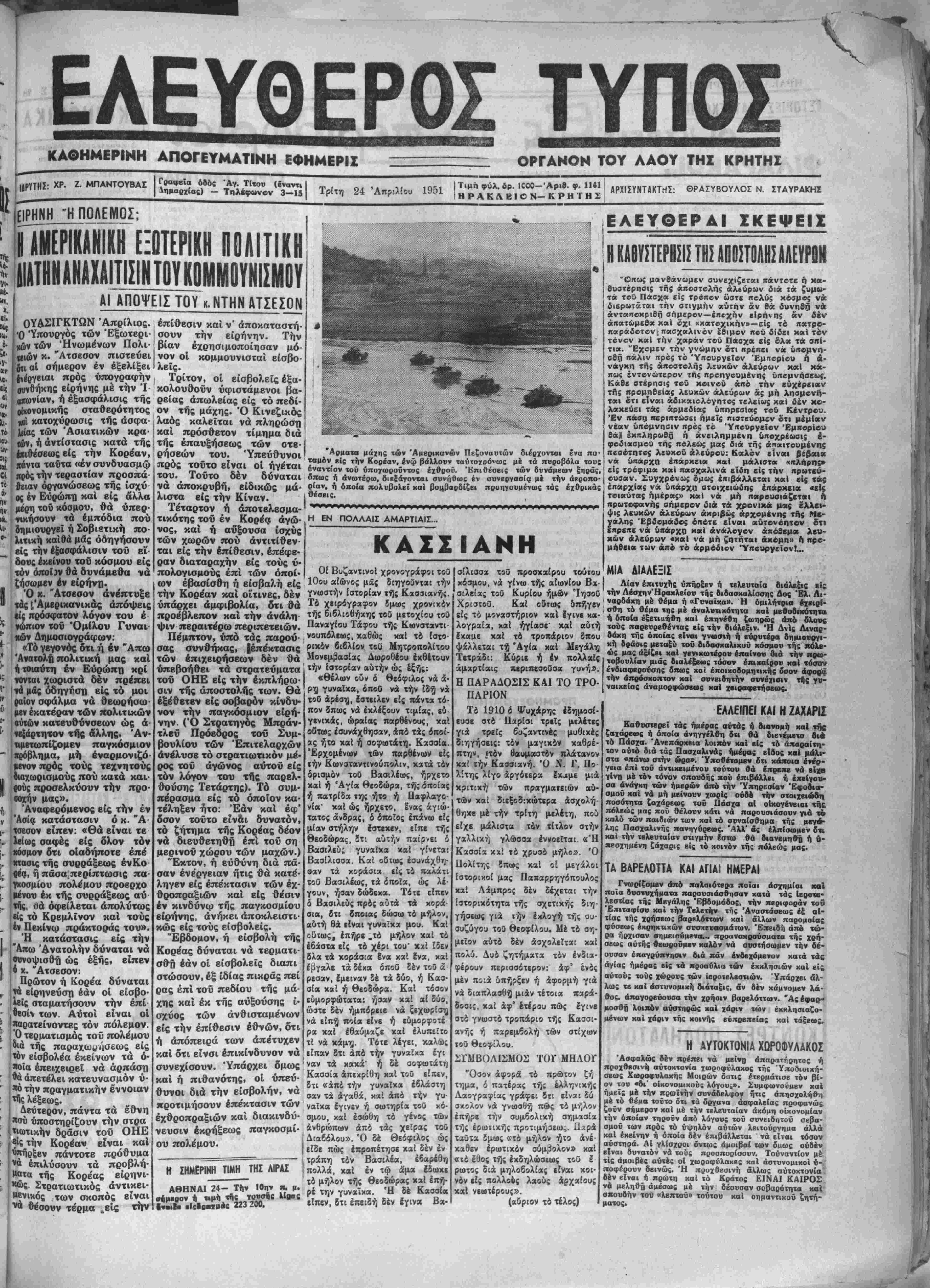 τ«ς υηηρϊ«ΐΛ4 *λι ο^γα»ι* μι*ι, ι τβ{ ^ν τ^ συν6^ω τβυ# ·© χ< Μπίβαν ύπεμνηβεν διά την αθαιηραν καί μετα σχο· (ίτ, χύνν Τη5 καθυοτ«ρήσ·Μς των μέτρβιν έπανε- λαστικότητος εφαρμογήν τής 1· {οπλισμοδ τής 'Αμιριχής απειλεΐται παγκόσμιον. οχυούσης Άστυνομιχής Διατάξε- ] πληβΜρισμος. ως. Οί χρησιμοποιοθντες χροτί-1 ---- '-------------------- δας χαί βαρελδττα θά αυλλαμβά- νωνται άμέσως παρά των Άοτυ- νομικών δργάνων καί θά παρα- πέμπωνχαι είς την αρμοδίαν Δι χαστικήν Αρχήν διά την ποινι· χήν δίωξιν των Ηράκλειον 23 Απριλίου 1951 Ό Διοικητής τής Διοικήσεως Βουτυράχης Έμμ. Άν)ρχης Η ΕΞΑΓΟΓΗ ΠΡϋΙθΝΤΟΝ ΜΑΣ ΕΙΣ ΑΥΤ. ΓΕΡΜΑΝΙΑΝ ΑΘΗΝΑΙ 24.—Ό καρά τή ΔΟΣ "Ελλην άντιπρόοωπβς χ. Βαρδέλης ανήγγειλε τηλ«γρα· γροτφΐΜώς κρός την Κυβερνησιν ότι η Δυτιχή ΓερμκνΙκ προέβη είς την άνοράν έλληνιχών κα¬ πνών άξίας 1.500.000 δολλαρίων, ώς καί έλλπνιχών οΐνων ά{ίας 425.000 δολλαρίων. ΣΥΝΕΧΙΖΕΤΑΙ Η ΕΧθΡΙΚΗ ΑΝΤΕΠΙΘΕΙΙΣ ΕΙΣ ΤΟ ΚΕΝΤΡΟΝ ΚΑΙ ΤΗΝ ΑΡΙΣΤΕΡΑΝ ΠΤΕΡΥΓΑ ΤΗΣ ΣΥΜΜΑΧΙΚΗΣ ΠΑΡΑΤΑΞΕΩΣ ΕΙΣ ΤΗΝ ΚΟΡΕΑΝ Ο ΣΤΡΑΤΗΓΟΣ ΜΕΓΙΕΡ ΖΗΤΕΙ ΒΟΜΒΑΡΔΙΣΜΟΝ ΤΩΝ ΒΑΣΕΩΝ ΜΑΝΤΖΟΥΡΙΑΣ ΑΘΗΝΑΙ 24.- Σημεριναί πληροφορίαι άπό τθ μέτω¬ πον τής Κορέας άναφέρουν δτι ή έχθρική άντεπίθεσις συνεχίζεται. Είς τόν κεντρι¬ κόν τομέα νοτίως τής γραμ μής Τσορβόν — Χβανσον ή κατάστασις είναι ρευστή.Είς ωρισμένα σημεϊα τής γραμ- μής ταύτης ή προέλασις τσΰ έχθροϋ φαίνεται επί τοΰ πα¬ ρόντος άνακοπεΐσα. Αντιθέ¬ τως είς την αριστεράν πτέ ρυγα τοϋ συμμαχικον με τώπου ό εχθράς έχει έπιτύ- χη αρκετάς διεισδύσεις. Ανακοινωθέν τής 8ης °Α- μερικανικής στρατιάς άνα· φέρει σήμερον ότι αί συμ· πτύξεις των ήνωμένων στρα τευμάτων γίνονται έν πλή¬ ρει τάξει είς όχυράς θέσεις έκ των προτέρων καθωρι·ι ΑΘΗΝΑΙ 24.— Πληροφο σμένας. Τό ανακοινωθέν δέν ρίαι άπό τό Τόκιο άναφέ διευκρινίζει εάν ή ύποχώρη ~----*"■ Α ·■"—-Α- λ—.-..·*.. αίς των στρατευματων των Ήν. Εθνών θά συνβχισθό καί ποίαν έκτασιν ένδέχβ ται νά λάβη. ΛΟΝΔΙΝΟΝ 24.—Τα στρα τεύματα των Ήν. "Εθνών είς την Κορβαν Εύρισκον ται έν ύποχωρήσει καθ' δ λην την έκτασιν τής γραμ· μής έπιθε'σβως τοΰ έχθροΰ. Σφοδραί πάντως μαχαι συ· νάπτονται νοτίως τοΰ Τσορ βόν—τού μεγάλον άνεφοδι- αστικοΰ έχθρικοΰ κέντρου. Τα σημεία των μάχω ν αυ¬ τών ευρίσκονται εισέτι άρ κετά χιλιόμετρα βορείως τοΰ 38ου παραλλήλου. ρουν δτι ό γενικάς των Αμερικανικόν άρχηγό: άεροπο ρικών δυνάμεων στρατηγός Μέγιβρ είς χθεσινήν συνέν- τβυξίν τού πρός Άμερικανι κήν έφτιμερίδα ύπεγράμμισε τό γεγονός ότι ή άπόκρουσις των βπιθέσεων τής έχθρι χής άεροπορίας δέν δύναται νά συντελεσθή άν δέν βομ- βαρδισθοΰν αί βορείως τού ποταμοΰ Γιαλοΰ βάσεις έ- ξορμήσεως αυτής. Ό στρα τηγός Μέγερ έξέφρασεν α¬ νησυχίας επί τής όλονέν αΰ- ξανομένης δυνάμεως τής έχθρικής άεροπορίας καί τή"ς είς τό Κορεατΐφαν μέτωπον. Ο Κι,ΕΜΕΗΤΙΣ ΟΤΙ Λ1ΕΜΗΡΓΕ1ΚΛΤΛΣΚΡΠΕΙΙΙΙΙ ΕΚΤΕΤΑΜΕΝΗ" Η ΔΡΑΣΙΣ ΤΟΥ ΛΟΝΔΙΝΟΝ 24.—Ό Γκνιχός Γραμματεύς το* Τοεχιχοΰ Κ. Κ. Σλανσχι αίς λόγον τού ηρός την Κεντρικήν Επιτροπήν τού £λοβ«νιχοδ Κ. Κ. α¬ πεκάλυψε ότι 6 δρ Κλεμκντις τέως ΰπβυργός των ΈίωΤϊρικων τής Τσεχοσλοβακίας έσΐις συνελή¬ φθη μ·τ' αλλων προοωπων τόν κκρελθθντα Φε¬ βρουάριον, αώμολόγηαβ» οτ» διενηργβι χαταβχο- η«ίβιν υπέρ των Ήνωμ. Πολιτΐιών. Την βράοιν τού Κλεμεντις ό Σλάνσχι πκρουσίοτσΐν ώς λίαν έχτιταμένην, ωστβ νά αφήση «ΰτη «άνε{ίτηλ« ΐχνη» «Ις τό Κομμουνιστικήν Κόμμα τής Τβεχο- σλοββιχίας. ΕΙΣ ΤΗΝ ΚΥΒΕΡΝΗΣΙΝ ΘΑ ΓΙΝΟΥΝ ΜΕΤΑΒΟΛΑΙ ΜΕΤΑ ΤΟ ΠΑΣΧΑ; Δ Η Λ Ο Σ ΕΙΣ ΤΟΥ κ. ΠΡΟΘΥΠΟΥΡΓΟΥ ΑΘΗΝΑΙ 24.—Ό Πρω«υ«ουργ