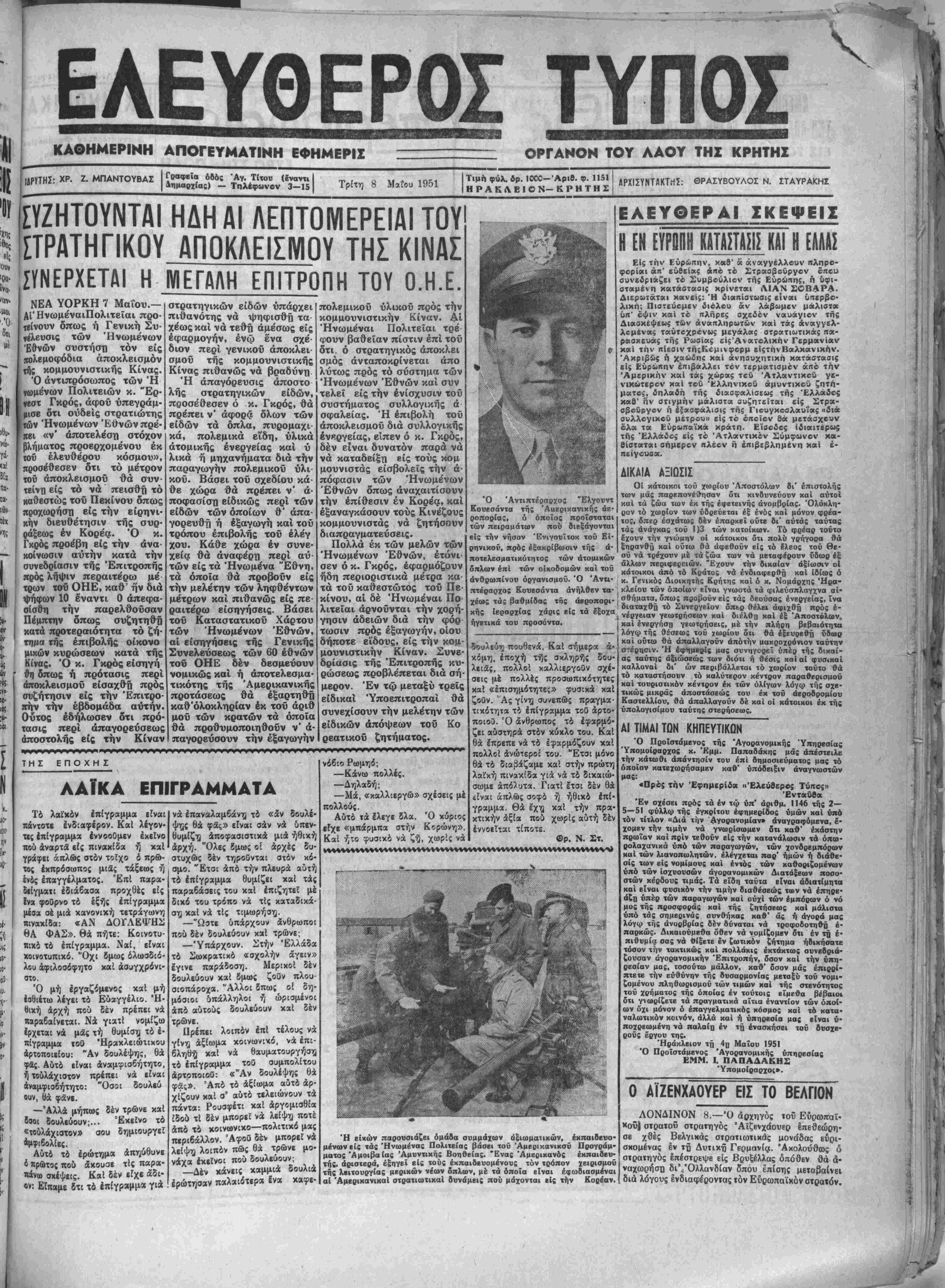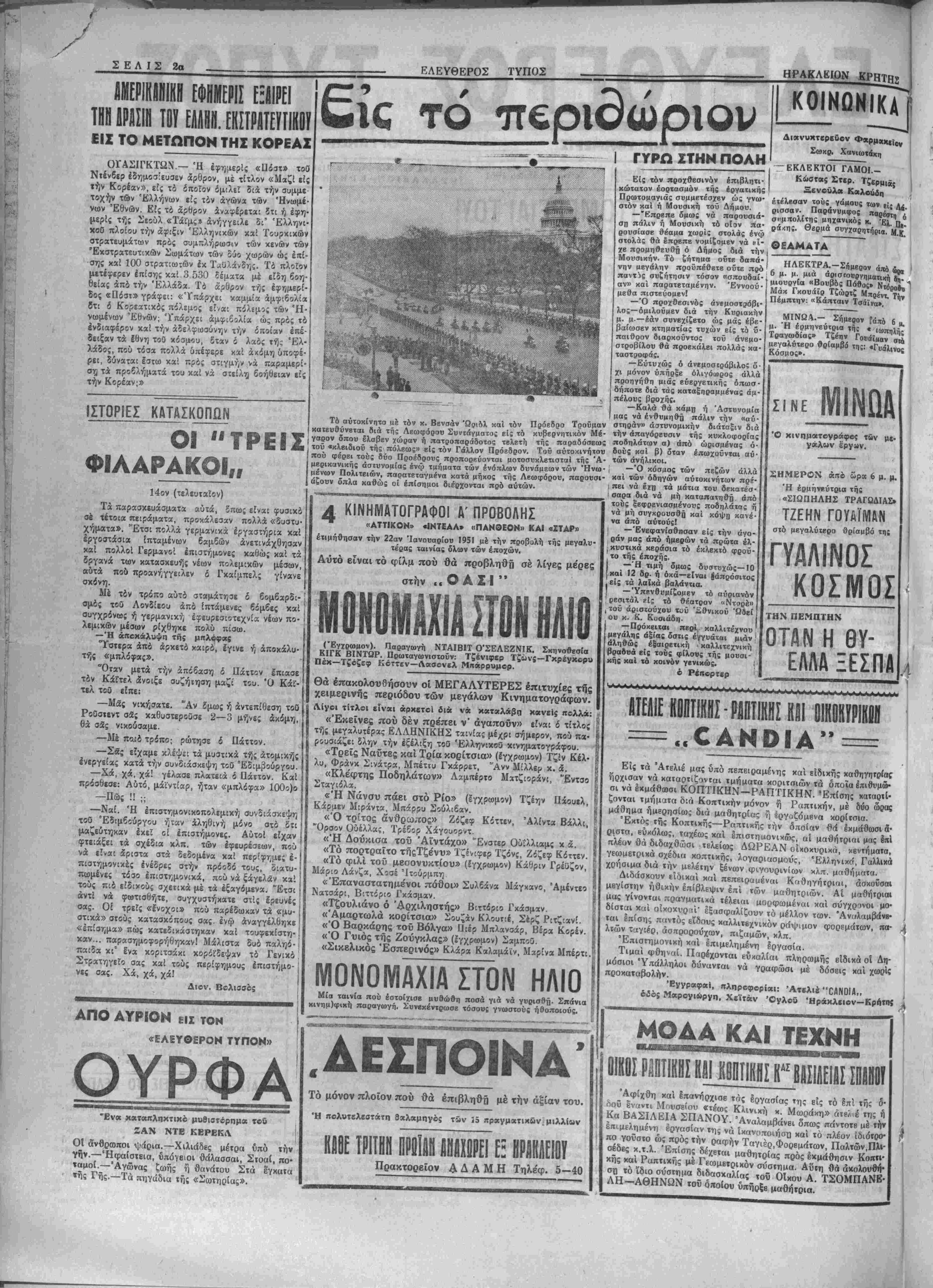 <ρη είς γενικωτέραν συζήτη¬ σιν επί τοϋ πολιτικοΰ θέμα- τος. Πιστεΰεται δτι ή πολι- τική κατάστασις μετά την ουνομιλίαν ταύτην έν άναμο 1»Β «αί τής έπανόδου τής Α. Μ. τοΰ Βασιλέως έκ Πελο- ποννήσου, θά οδηγηθή είς πλήρη διευκρίνισιν. Ό Πρωθυπουργός κ. Σ. Βενιζέλος είς νυκτερινάς δη· λώσεις τού ετόνισεν δτι δέ¬ ον νά τροποποιηθή τό ίσχύ· όν άναλογικόν σύστημα διά νά καταστή δυνατόν μετά τάς εκλογάς, δύο συνεργαζό· μενά κόμματα νά δυνηθούν νά σχηματίσουν ισχυράν καί βιώσιμον κυβέρνησιν. Ό κ. Βενιζέλος ύπενθύ· μισε περαιτέρω δτι μία έ- φαρμογή τού ίσχΰοντος άνα- λογικοΰ συστήματος φυσι¬ κόν είναι νά προκαλέση καί μετά τάς προσεχεϊς έκλο· | γάς κατάστασιν ούχι διάφο■ ρον τής σημερινής, πράγμα τό οποίον όπωσδήποτε πρέ· πει νά έποφευχθή. Ώς αφήκε σαφώς νά έννο ηθη ό κ. Πρωθυπουργός τό Κόμμα των Φιλελευθέ- ρων θά κατβυθύνη τάς ενερ¬ γείας τού προβκλογικώς είς μίαν καθιέρωσιντροποποιη- μένου άναλογικοϋ συστήμα- Τ3ξ «αί δέν θά αποδεχθή την εφαρμογήν τοΰ νυν ίσχύ· όντος άναλογικοϋ συστήμα¬ τος. ι*ν»+»»«>»»ν» νν»ν>ννννννκ <»ννν) ΟΙ ΣΥΛΛΗΦΘΕΝΤΕΣ ΕΝΤΑΥΘΑ ΠΡΟ ΜΗΝΟΝ ΚΟΜΜΟΥΝΙΣΤΑΙ ΛΙΚΑΖΟΝΤΑΙ ^ίΡΙΟΝΕΙΣ ΑΘΗΝΑΣ Αυριον Τετάρτην 9 Μαΐου Θά ίκδικασθή υπό τοθ εκτάκτου στρατοδικείου Αθηνών ή υπό¬ θεσις χατά των συλληφθέντων πρό μηνών ενταύθα συνεργατών τοθ κομμουνιατικοΰ στελέχους Σαρτζέιη, τοθ δποίου 6 σκελετός χαί τό άρχεϊον εϊχε ανευρέθη εν- τός δπογείου κατοφυγίου είς την συνοικΕαν τής πόλεώς μας. Ώς γνωστόν οί κατηγορούμενοι ώς συναρχηγοΐ τοθ Σαρτζέτη ανήρ¬ χοντο είς 32 έκ τούτων τινές άπε· λύθησαν μή προχυψάντων στοι- χείων ένοχής είς βάρος των. Χθές ανεχώρησαν δι' Αθήνας οί κλη- θέντες νά παραστοθν μάρτυρες υπό τοθ εκτάκτου ΣτρατοδικεΕου διά την υπόθεσιν ταύτην. Ο ΣΤΡΑΤΗΓΟΣ ΤΖΟΡΤΖ ΜΑΡΣΑΛ ΑΠΗΝΤΗΣΕΝ ΕΙΣ ΤΑΣ ΑΗΛΩΣΕΙΣ ΤΟΥ ΣΤΡΔΤΗΓΟΥ ΜΑΚ ΑΡ0ΟΥΡ ΕΠΕΚΥΡΟΒΗΣΑΝ ΙΛ ΙΚΑΟΠΚΑ ΛΙΙΟΤΙΛΒΜΛΙΛ Διά τής ύπ' αριθ. 16 άποφά· σεως τοΰ Συμβουλίου Πρωτοδι κων Ηρακλείου Ιπεκυρώθήσαν τα άποτελέσματα τής έχλογής Δή μοτικών Συμβούλων τοΰ Δήμου Ηρακλείου μή έπελθούσης ούδε μιάς μεταβολής είς την σειράν ε¬ πιτυχίας αυτών καί μετά τάς ύ- ποβληθείσας ενστάσεις αΐτινες χαί έξεδικάσθησαν. Έπίσης διά τής ύπ' αριθ. 17 καί 18 άποφά σεων τοϋ Συμβουλίου Πρωτοδι κων Ηρακλείου, έπεκυρώθησαν τα γνωστά αποτελέσματα έχλογής Δημοτιχών Συμβούλων των Δή μων Αρχανών «αί Μοιρών. ΑΙ ΑΡΙΣΤΕΡΟΙ ΒΟΥΛΕΥΤΑΙ ΑΠΟΤΕΛΟΥΝ ΧίΙΡΙΣΤΗΝ ΟΜΑΔΑ ΑΘΗΝΑΙ 7.—ΟΙ άριστεροί βουλευταί |χ.χ. Γρηγοριάδης, Καραμαούνας, Μπιχάκης Σ. χαί Φ. Χατζή μπέης χατέθεσαν είς τό προεδρείον τής Βουλής δή¬ λωσιν ότι άποτΕλοΰν ανεξάρτη¬ τον όμάδα άριστερών αηλελευ· θέρων, υπό τόν τίτλον «Κορυ- σχάδες», δπου, ώς γνωστόν, ήτο κατά την έλασοκρατίαν τ) εδρα της Π.Ε.Ε.Α. ΤΑ ΕΠΙΒΛΑΒΗ ΒΗΡΑΜΑΤΑ Τό Υπουργείον Γεωργίας προΐκήρυξϊ τάς κάτωθι άμοιβάς διά την εξόντωσιν των ακολού¬ θων έπιβλαβων θηραμάτων διά την κυνηγβτικήν περίοδον 1950 —51. ΔΓ έκαστον λύκον δραχ. 125 χιλ. ΔΓ έκαστον τσακάλι δρχ. 100 χιλ. ΔΓ εκάστην άλω- πβκα δρ. 75 χιλ. ΔΓ εκάστην τρβχτιν (άσγόν) δρ. 75 χιλ. καί δι εκαστο κορακοΐιδές δραχ. 3 χιλιάδας,] - ν * γρΐφία τού ί ΛΟΝΔΙΝΟΝ 8.—Χθές ενώ πιον των γερουσιαστικών έπιτρο πών επι των εξωτερικών καί των Ινόπλων δυνάμεων ό στρα τηγός Μαρσάλ, Άμερικανός ύ- πουργός {τής Αμύνης απήντησεν διά μακρών είς τόν Μάκ "Αρ- θουρ άνασχευάσας την καΐάθε· σιν τού πρό των ίδίων επιτρο¬ πών καί χαταδείξας τό άναχό- λουθον χαί επιζήμιον τής δρά¬ σεώς τού είς την Άπω Άνατο- τολήν. Ό σΐ