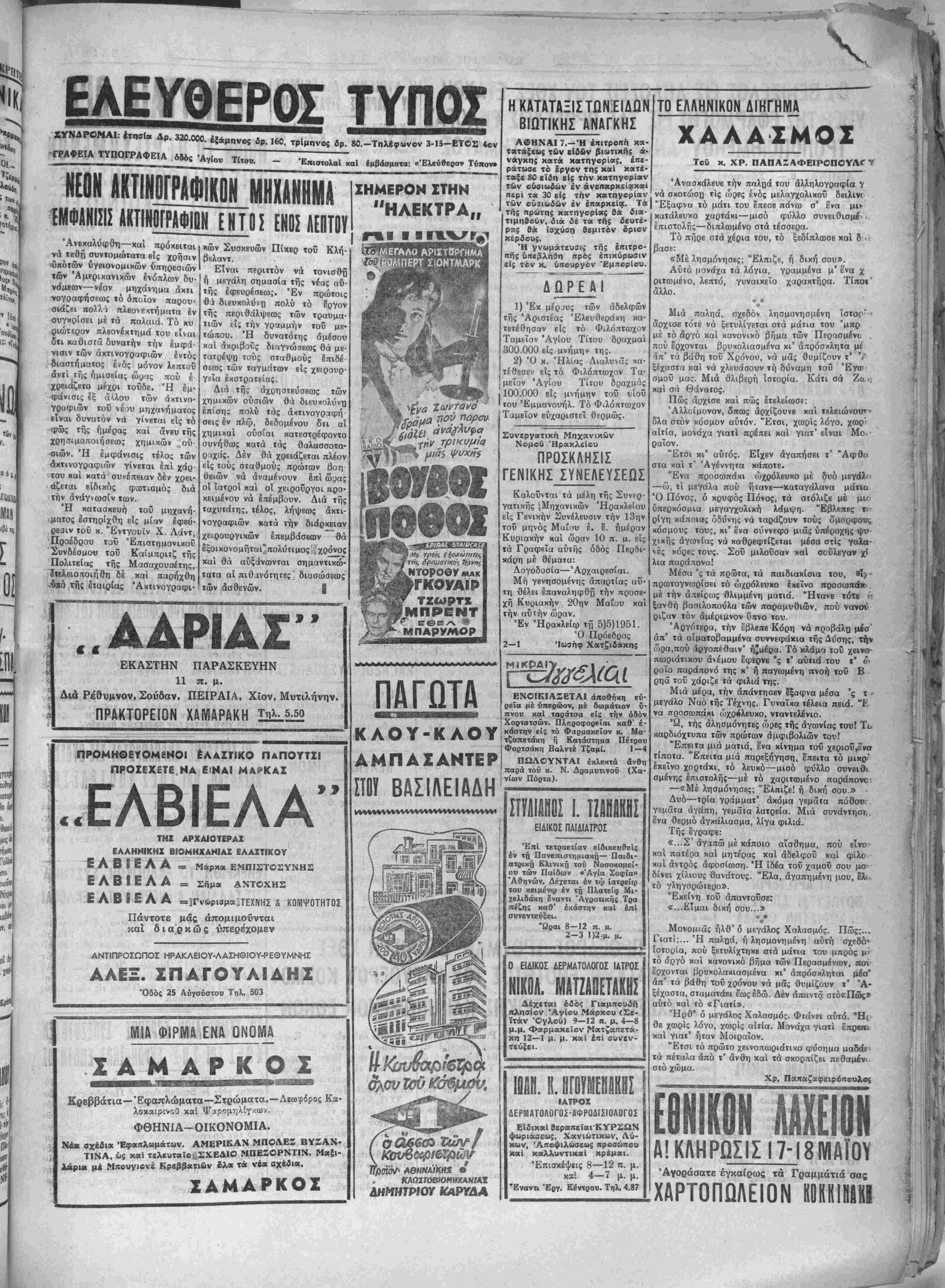 <5κτινογραφιών γίνεται επί χάρ¬ του καί κατά συνέπειαν δέν χρει· άζεται ε'ιδικός φαπισμό; διά την ανάγνωσιν των. Ή κατασκευή τοΰ μηχανή- ματος εστηρίχθη είς μίαν εφεύ¬ ρεσιν τοΰ κ. "Εντγουϊν Χ. Λάντ, 'Προέδρου τοϋ 'Επιστημονικοϋ 'Συνδέσμου Γθϋ Καίμπριτζ τής Πολιτείας τής Μασαχουσέτης, ίκΚειοιτοιήθη δέ καΐ παρηχθη ΛΟ τής εταιρίας Άχτινογραφι- κων Συσκευών Πίκερ τού Κλη- βελαντ. Είναι περιττόν νά τονισθή ή μεγάλη σημασία τής νέας αυ¬ τής εφευρέσεως. Έν πρώτοις ■θάί διευκολύνη πολύ τό έργον τής περιθάλψεως των τραυμα- τιών εις την γραμμήν τοϋ με- τώπου. Ή δυνατότης άμέσου καί άκριβοϋς διαγνώσεως θά με¬ τατρέψη τού; σταθμούς §πιδέ σεοος των ταγμάτων είς χειρουρ- γε,ΐα εκστρατείας. Διά τής άχρηστεύσεως των χημικών ούσιών θά διευκολύνη έπίσης πολύ τάς άκτινογραφή- σεις έν πλώ, δεδομένου ότι αί χημικαί οΰσίαι κατεστρέφοντο συνήθως κατά τάς θαλασσοτα· ραχάς. Δέν θά χρειάζεται πλέον είς τούς σταθμούς πρώτων βοη θειών νά άναμένουν επί ώρας οί ϊατροί καί οί χειροΰργοι προ- κειμένου νά έπέμβουν. Διά τής ταχυτάτης, τέλος, λήψεως άκτι- νογραφιών κατά την διάρκειαν χειρουργικών Ιπεμβάσεοον θά έξοιχονομήται'πολύτιμος , χρόνο; καί 6ά αύξάνοονΐαι σημαντικώ¬ τατα αί πιθανότητες διασώσεως των ασθενών. Ι ,ΔΔΡΙΑΣ ΕΚΑΣΤΗΝ ΠΑΡΑΣΚΕΥΗΝ 11 π. μ. Διά Ρέθυμνον, Σούδαν, ΠΕΙΡΑΙΑ, Χΐον, Μυτιλήνην. ΠΡΑΚΤΟΡΕΙΟΝ ΧΑΜΑΡΑΚΗ Τηλ_5_5ο ΠΡΟΜΗΟΕΥΟΜ6ΝΟΙ ΕΛΑΣΤΙΚΟ ΠαΠΟΥΤΖΙ ΠΡΟΙΕΧΕΤΕ ΝΑ ΕιΝαΙ ΜΛΡΚΑΣ €€ ΕΛΒΙΕΛΑ" ...'■,; ΤΗΧ ΑΡΧΑΙΟΤΕΡΑΧ ΕΑΑΗΝΙΚΗΖ ΒΙΟΜΗΧΑΝΙΑΣ ΕΑΑΣΤΙΚΟΥ ΕΛΒΙΕΛΑ — Μάρκος ΕΜΠΙΣΤΟΣΥΝΗΝ ΕΛΒΙΕΛΑ = 2ήμα ΑΝΤΟΧΗ2 ΕΛΒΙΕΛΑ =ίΓνώρισμα;ΤΕΧΝΗΣ & ΚΟΜΨΟΤΗΤΟΣ Πάντοτε μάς άπομιμοΰνται καί διαρκώς ύπερέχομεν ν-· »·· * ΑΝΤΙΠΡΟΣΩΠΟΝ ΗΡΑΚΛΕΙΟΥ-ΛΑΣΗΘΙΟΥ-Ρ Ε©ΥΜΝΗΣ ΑΛΕΞ. ΣΠΑΓΟΥΛΙΔΗΣ Όδός 25 Αύγσύστου Τηλ. 503 | , , ΜΙΑ ΦΙΡΜΑ ΕΝΑ ΟΝΟΜΑ Σ Α Μ ΑΡ Κ Ο Σ Κρεββάτια—'Εφαπλώματα—Στρώματα.—ΛεωφίροςΚα- λοκαιρινου καί Ψαρομηλίγκων. Λ , ΦΘΗΝΙΑ-ΟΙΚΟΝΟΜΙΑ. Κ*α οχέδια Έΐ}>««λ«μάτ«ν. ΑΜΕΡΙΚΑΝ ΜΠΟΛΕΖ ΒΥΖΑΝ-