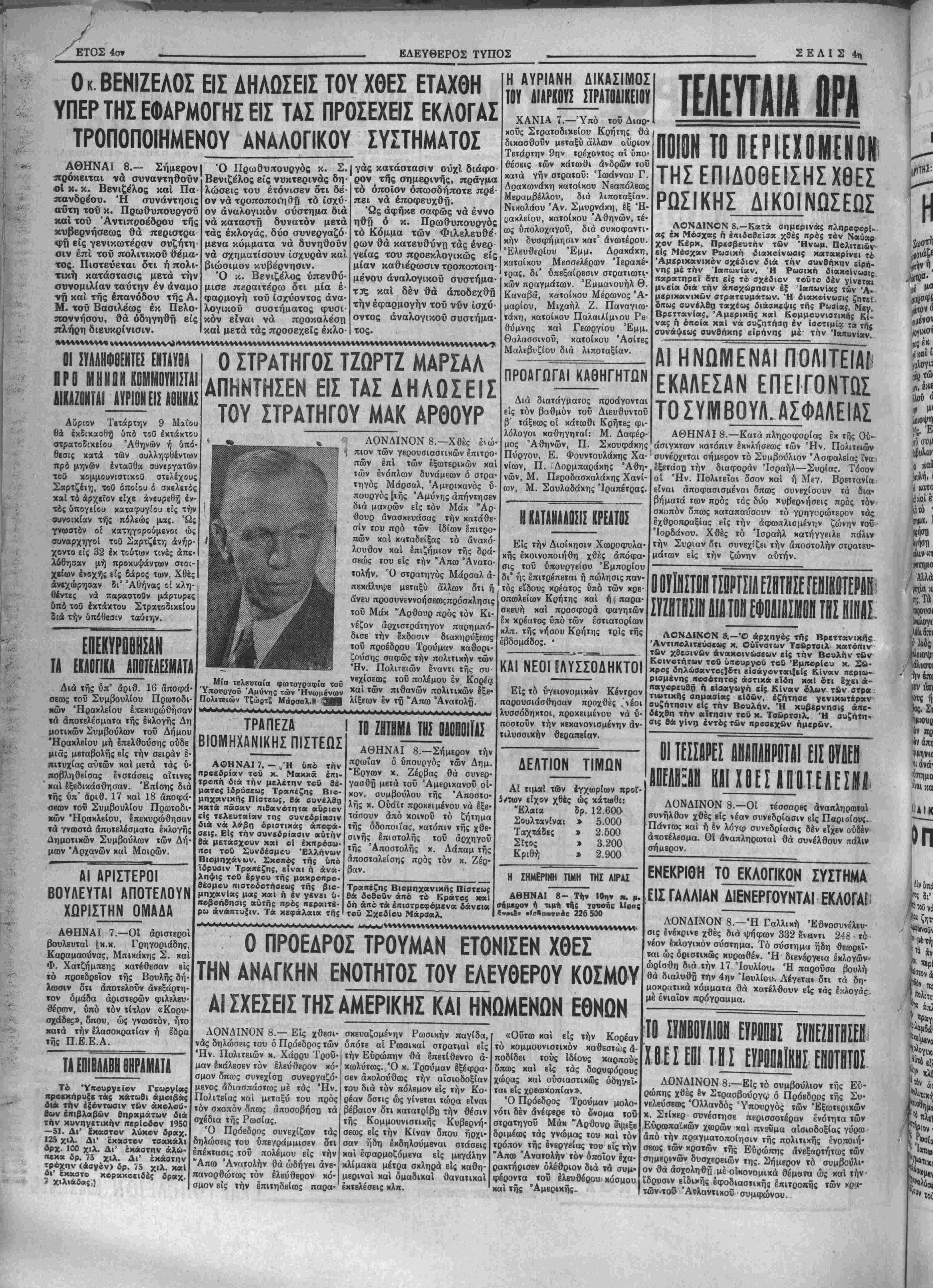 *«·ι|. ■Ι£·αατΐ<ας 226 500 Ο ΠΡΟΕΔΡΟΣ ΤΡΟΥΜΑΝ ΕΤΟΝΙΣΕΝ ΧΘΕΣ ΤΗΝ ΑΝΑΓΚΗΝ ΕΝΟΤΗΤΟΣ ΤΟΥ ΕΛΕΥΘΕΡΟΥ ΚΟΣΜΟΥ ΑΙ ΣΧΕΣΕΙ! ΤΗΣ ΑΜΕΡΙΚΗΣ ΚΑΙ ΗΝΩΜΕΝΟΝ ΕΘΝΩΝ ΛΟΝΔΙΝΟΝ 8.— Είς χθεσι¬ νάς δηλώσεις τού ό Πρόεδρος των Ήν. Πολιτειών κ. Χάρρυ Τροΰ- μαν εκάλεσεν τόν ελεύθερον κό¬ σμον όπως συνεχίση, συνεργαζό· μενος άδιασπάστως μέ τάς Ήν. Πολιτείας καί μεταξύ τού πρός τόν σκοπόν όπως αποσοβήθη τα σχέδια τής Ρωσίας. Ό Πρόβδρος συνεχίζων τάς δηλώσΒΐς τού ύπεγράμμισεν δτι επέκτασις τοΰ πολέμου είς την Απω Ανατολήν θά ωδήγει άνβ- πανορθώτως τόν ελεύθερον κό¬ σμον είς (ήν επιτηδείαν παρα- σκευαζομένην Ρωσικήν παγίδα, όπότε αί Ρωσικαί στρατιαί είς την Ευρώπην θά έπετίθεντο ά- χωλύτως. Ό χ. Τρούμαν έξέφρα* σεν ακολούθως την αισιοδοξίαν τού διά τόν πόλεμον είς την Κο- ρέαν όστις ώς γίνεται τώρα είναι βέβαιον ότι χατατρίβτ] την θέσιν τής Κομμουνιστΐκής Κυβερνή¬ σεως είς την Κίναν δπου ήρχι¬ σαν ήδη έχδηλούμβναι στάσεις καί έφαρμοζόμενα είς μεγάλην κλίμακα μέτρα σχληρά είς χαθη- μεριναί καί δμαδικαί θανατικαί έκτελέσεις χλπ. «Οί5τω «αι είς την Κορέαν τό κομμουνιστιχόν καβεστώς α¬ ποδίδει τούς ίδίους καρπούς δπως καί είς τάς δορυφόρους χώρας καί ούσιαστικώς οδηγεΐ- ΐαι είς χρεωκοπίαν». Ό Πρόεδρος Τρούμαν μολο¬ νότι δέν άνέφερε τό δ*ομα τοΰ στρατηγοΰ Μάκ Άρθουρ Ιψ,εξε δριμέως τάς γνώμας τού καί τόν τρόπον της ενεργείας τού είς την "Απω Ανατολήν τόν οποίον βχα- ραχΐήρισβν δλέθριον διά τα συμ· φέροντα τοΰ ελβυθέρρυι χόσμου χαι τής Άμεριχής. ΟΙ ΤΕΙΙ1ΡΕΣΙΗΑΗΛΗΡΙΙΤΑΙ ΕΙΣ ΙΙΥ1ΕΙΙ ΙΙΙΕΐΈΙΗ ΚΛΙ ΧΟΕΣ ΑΠαΤΕΑΕΣΐ¥Λ. ΛΟΝΔΙΝΟΝ 8.—Οί τέσσαρβς άναπληρωταί συνήλθον χθές είς νέαν συνεδρίασιν είς Παρισίους. Πάντως καί ή έν λόγω συνβδρίαστς δέν «ϊχεν ουδέν άιοτέλεσμα. ΟΙ άναπληρωταί θά συνέλθουν πάλιν σήμερον. ΕΝΕΚΡΙΘΗ ΤΟ ΕΚΑΟΓΙΚΟΝ ΣΥΣΤΗΜΑ ΕΙΣ ΓΑΛΛΙΑΝ Α1ΕΝΕΡΓ0ΥΝΤΑΙ ΕΚΛΟΓΑΙ; ΛΟΝΔΙΝΟΝ 8.—Ή Γαλλική 'Εθνοσυνέλβυ- σις ενέκρινε χθές διά ψήφων 332 ένβνΐι 248 τό νέον Ικλογιχόν σύστημα. Τό σύστημα ήδη θεοορβΐ- τα ι ώς οριστικώς χυρωθέν. Ή διενέρνεια έκλογών ωρίσθη διά την 17 Ιουλίου. Έ παροΰσα βουλή θά διαλυθή την 4ην Ιουλίου·. Λέγβτα» δτι τα δη· μοκρατιχά «όμματα θά χατέλθουν είς τάς Εκλογάς-, μέ ενιαίον πρόγραμμα. ΤΟ ΧΟΕΣ ΕΠΙ Τ Β Σ ι ΛΟΝΔΙΝΟΝ 8.—Είς τό συμβούλιον τής Εύ- ρωπης χδες έν Σΐραοβούργφ ό Πρόεδρρς τής Συ¬ νελεύσεως Ολλανδός Ύπουργός των Εξωτερικών κ. Σΐίκερ συνέστησε περισσοτέραν ενόιητα των Ευρωπαϊκών χωρών καί «νϊδμα αίσιοδοξίας γύρω ■ άπο την πραγματοποίησιν τής πολιτικής ένοποιή"· σεως των κρατών τής Εύρώπης ανεξαρτήτως των ση-μϊρινων δυσχερβιών της. Σήμερον τό συμβούλι¬ ον θα άσχοληθή μέ οϊκονομικά θέματα ώς χαΐ την ίδρυσιν ειδιχης εφοδιαστικής έπιτροιιης των χρα- των'Τον Ατλαντικοϋ σύμφωνον. Κ