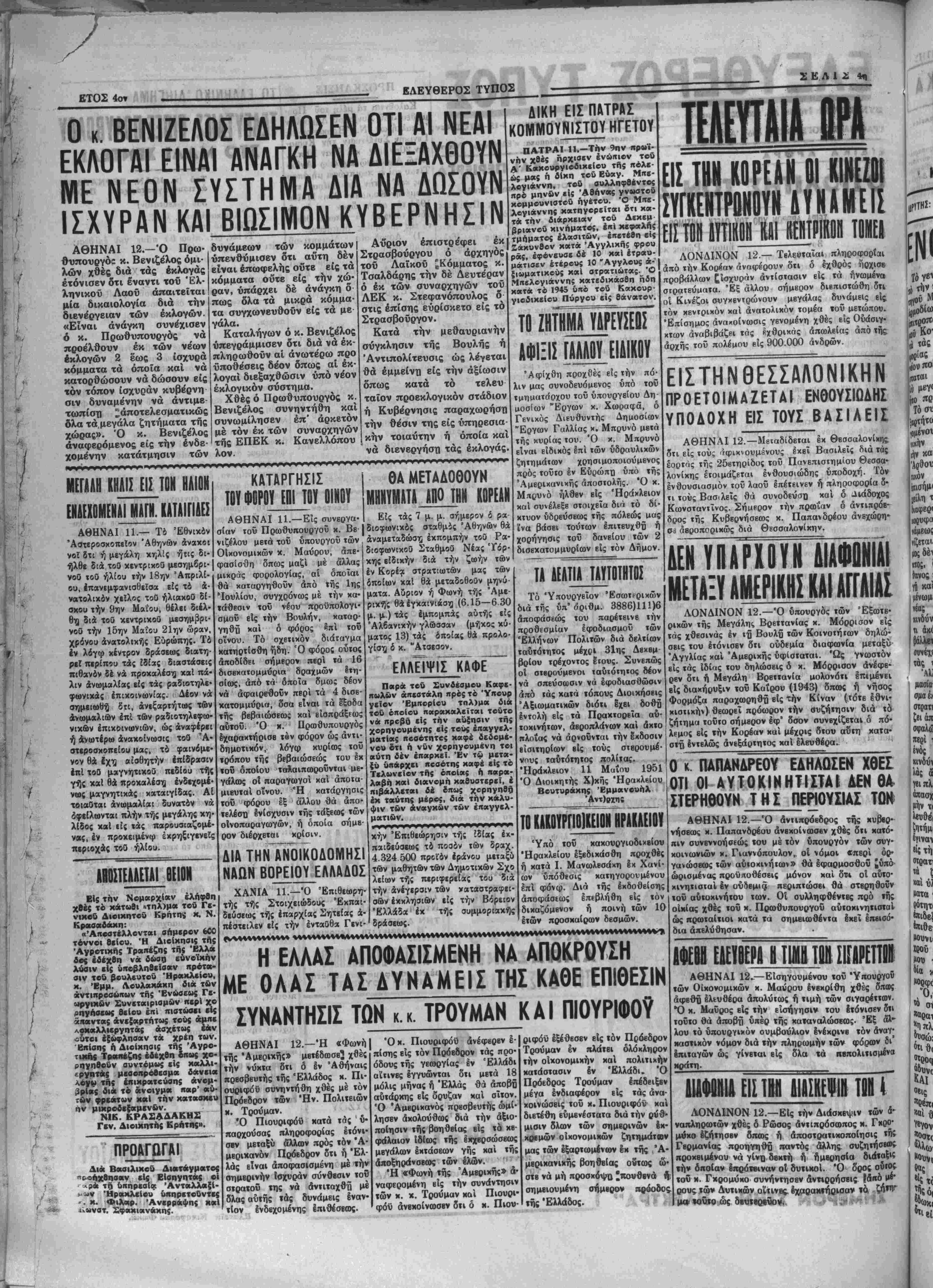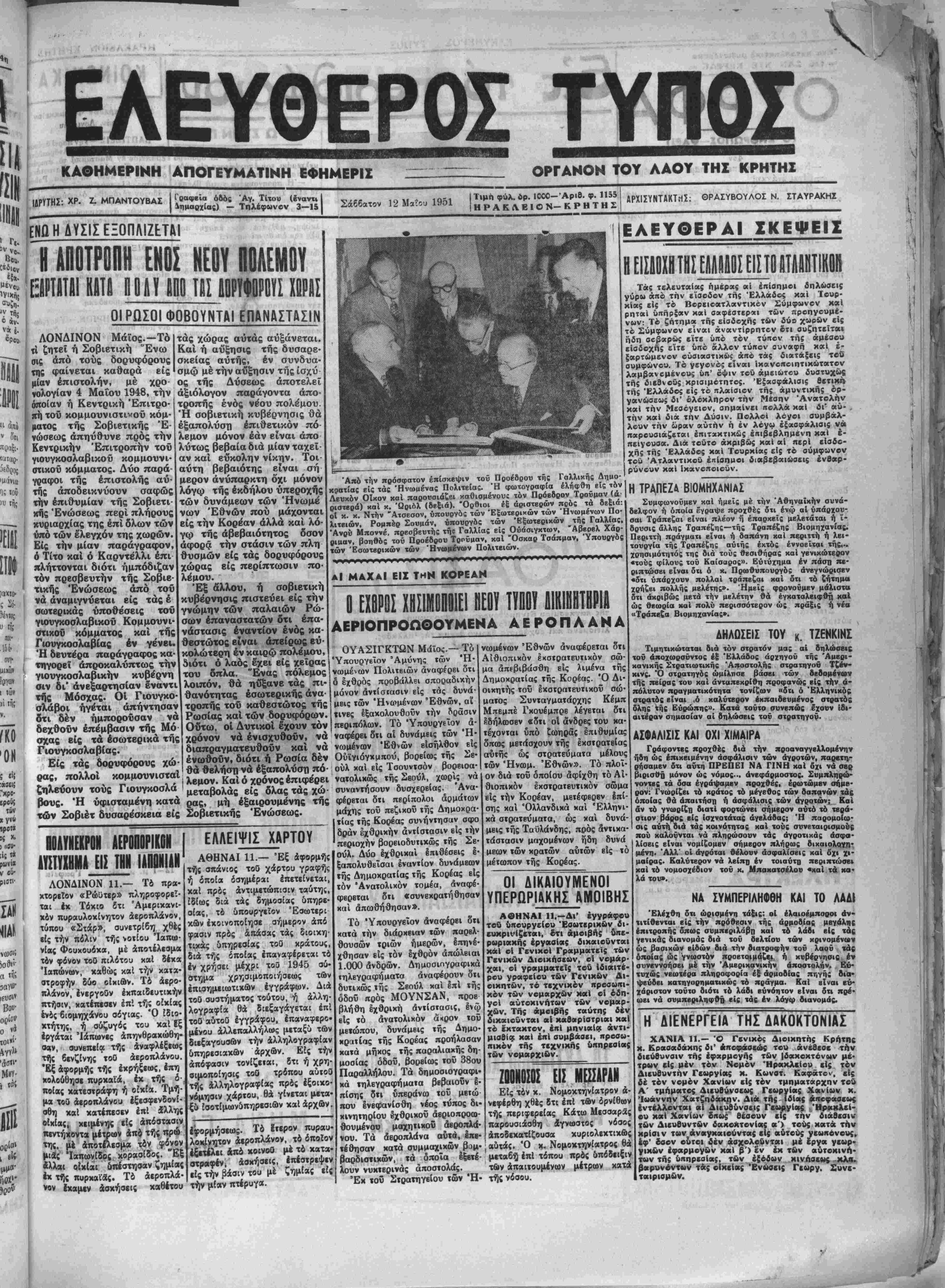 λ ά. <·. /«? · η'__ί____?__!._. ΤΎ _ί_β_ _ ____ 'Ρ____*_____ 5». __1_____ _ί Ι "ι _ _ . τής *Αμβρ.χής» την νύκτα δτι μετέδωσε^ χθές δ έν Αθήναις πρβσβευτής «ής Ελλάδος κ. Πι· ουριφόϋ συνηνττίθη χθές μέ τόν Πρόεδρον των Ήν. Πολιτειών Μ. Τρούμαν. Ό Πιουριφόϋ κατά τάς υ¬ παρχούσας πληροφορίας έτόνι· σεν μεταξύ άλλων πρός τόν Α¬ μερικανόν Πρόεδρον ότι ή Ελ¬ λάς είναι άποφασισμένη μέ την σημερινήν Ισχυράν σύνθεσιν τοΰ στρατοΰ της νά αντιταχθή μέ όλας αυτής «άς δυνάμεις εναν¬ τίον ενδεχομένης έηιθέσβως. πίσης είς τόν Πρόεδρον τάς προ όδους τής γεωργίας εν Ελλάδι αΐτινες εγγυώνται δτι μετά 18 μόλις μήνας ή Ελλάς θά άποβΐ) αύτάρκης βίς ορυζαν καί σΐτον. Ό Άμερικανός πρβσβευττις ωμί¬ λησεν ακολούθως διά την άξιο- ποίησιν τής βοηθείας εις το κε¬ φάλαιον Ιδίως τής έχχερσώσεως μεγάλων έκτάοεων γής καί τής άποξηράνσβως των έλων. Ή «Φωνή τής Άμερικής» α¬ ναφερομένη βίς την συνάντησιν των μ. χ. Τρούμαν καί Πιουρι· φόϋ άνβκοίνωσβν δτι δ ν. Πιου- Τρούμαν έν πλάτβι ολόκληρον την οικονομικήν χαί πολιτικήν κατάστασιν έν Ελλάδι. Ό Πρόεδρος Τρούμαν έπέδβιξεν μέγα ενδιαφέρον είς τάς άνα- κοινώσεις τοΰ χ. Πιουριφόν χαί διετέθη ενμβνέστατα διά την ρύθ¬ μισιν δλων των σημβρινών |χ- χρεμων οίχονομικών ζητημάτον μας των βξαρτωμένων Ικ της Ά- μερικανικής βοηθείας όντως ώ- ότε νά μή προσχόψο * σημειουμένη σήμερον «ής Ελλάδος. $ ' ήρχισε προβάλλων ^Ισχυράν αντίστασιν είς τα ήνωμένα στρατεύματα. Έξ άλλου σήμερον διβπιστώθη δτι οί Κινέζοι συγχεντρώνουν μεγάλας δυνάμεις βΐς τόν κεντρικόν καί άνατολικόν τομέα «ου μετώπου. 'Επίσημος ανακοίνωσις γενομένη χθές είς Ούάσιγ· χτων άναβιβάζει τάς κχθρικάς απωλείας άπό τής άρχής τοϋ πολέμου βίς 900.000 άνδρών. ΕΙΣΤΗΝΘΕΣΣΑΛΟΝΙΚΗΝ ΠΡΟΕΤΟΙΜΛΖΕΤΛΙ ΕΝΘΟΥΣΙΟΑΗΣ ΥΠΟΑΟΧΗ ΕΙΣ ΤΟΥΣ ΒΑΣΙΛΕΙΣ ΑΘΗΝΑΙ 12.— Μβταδίδεται έκ θβσσαλονίΗτις δτι είς τούς άφικνουμδνους έκβΐ Βασιλείς διά τάς εορτός τής 25ετηρίδος τού Πανεπιστημίου θεσσα¬ λονίκης έτοιμάζεται ενθουσιώδης ύποδοχή. Τόν ενθουσιασμόν τού λαοϋ έπέτεινεν ή πληροφορία δ- τι τούς Βασιλείς θά συνοδεΰσχ) καί δ Διάδοχος Κωνσταντίνος. Σήμερον την πρωΐαν δ άντιπρόβ- δρος τής Κυβερνήσεως κ. Παπανδρέου ανεχώρη¬ σε άεροπορικώς διά Θεσσαλονίκην. ΔΕΝ ΥΠΑΡΧΟΥΗ ΔΙΑΦΟΝΙΑ. ΜΕΤΑΞΥ ΑΜΕΡΙΚΗΣ ΚΑΙ ΑΓΓΛΙΑΣ ΛΟΝΔΙΝΟΝ 12.—Ό ΰπουργός των Έξωτβ· ρικών τής Μεγάλης Βρεττανίας κ. Μόρρισον είς τάς χθεσινάς έν ιχι Βουλϋ των Κοινοτήτων δηλώ· σεις τού ετόνισεν δτι ούδεμία διαφωνία μεταξύ "Αγγλίας χαί Άμερικής υφίσταται. Ώς γνωστόν είς τάς Ιδίας τού δηλώσεις δ κ. Μόρρισον ανέφε¬ ρεν ότι ή Μβγάλη Βρβττανία μολονότι έπιμένει είς διακήρυξιν τοΰ Καΐρου (1943) δπως ή νήσος Φορμόζα παραχωρηθτ] είς την Κίναν (τόΐε Ιθνι- κιστικήν) θεωρεΐ πρόωρον την συζήτησιν διά τό ζήτημα τουτο σήμερον έφ' δσον ουνεχίζεται δ πό* λεμος είς την Κορβαν καί μέχρις (Ίτου αυτή κατα¬ στή εντελώς άνεξάρτητος χαί ελευθέρα. Ο κ ΠΑΠΑΚΔΡΕΟΥ ΕΔΗΛΩΣΕΝ ΧΘΕΙ ΟΤΙ ΟΙ Α Υ Τ Ο ΚΙΝ Η ΤΙΣΤΔΙ ΔΕΝ ΘΑ ΣΤΕΡΗ60ΥΝ ΤΗΣ ΠΕΡΙΟΥΣΙΑΣ ΤΟ» ΑΘΗΝΑΙ 12.—Ό δντιπρόεδρος τής ι____ νήσεως χ. Παπανδρέου ανεκοίνωσεν χθές δτι κατό¬ πιν συνεννοήσεως «ου μέ τόν υπουργόν «ών συγ- χοινωνκόν χ. Γιαννόπουλον, οί νόμοι «περί ορ¬ γανώσεως των αύτοκινήιων» θά Ιφαρμοσθοΰ ^ύπό ωρισμένας προϋ/τ.οθέσΕΐς μόνον χαί δτ* οί αύτο- χινητισταί έν ούοεμια περιπτώσει θά στερηθονν «ου αυτοκίνητον των. Οί συλληφθέντες πρό »ης οικίας χθές «ου χ. Πρωθυπουργόν αύΐοκινητισταί ως πρωιαίτιοι χατά «α σημειωθέντα έκεΐ έπβισό· δια άπελύθησαν. ΕΐίΊΟΕΡΙ Η ΤΙΜΗ ΐΒίΊ