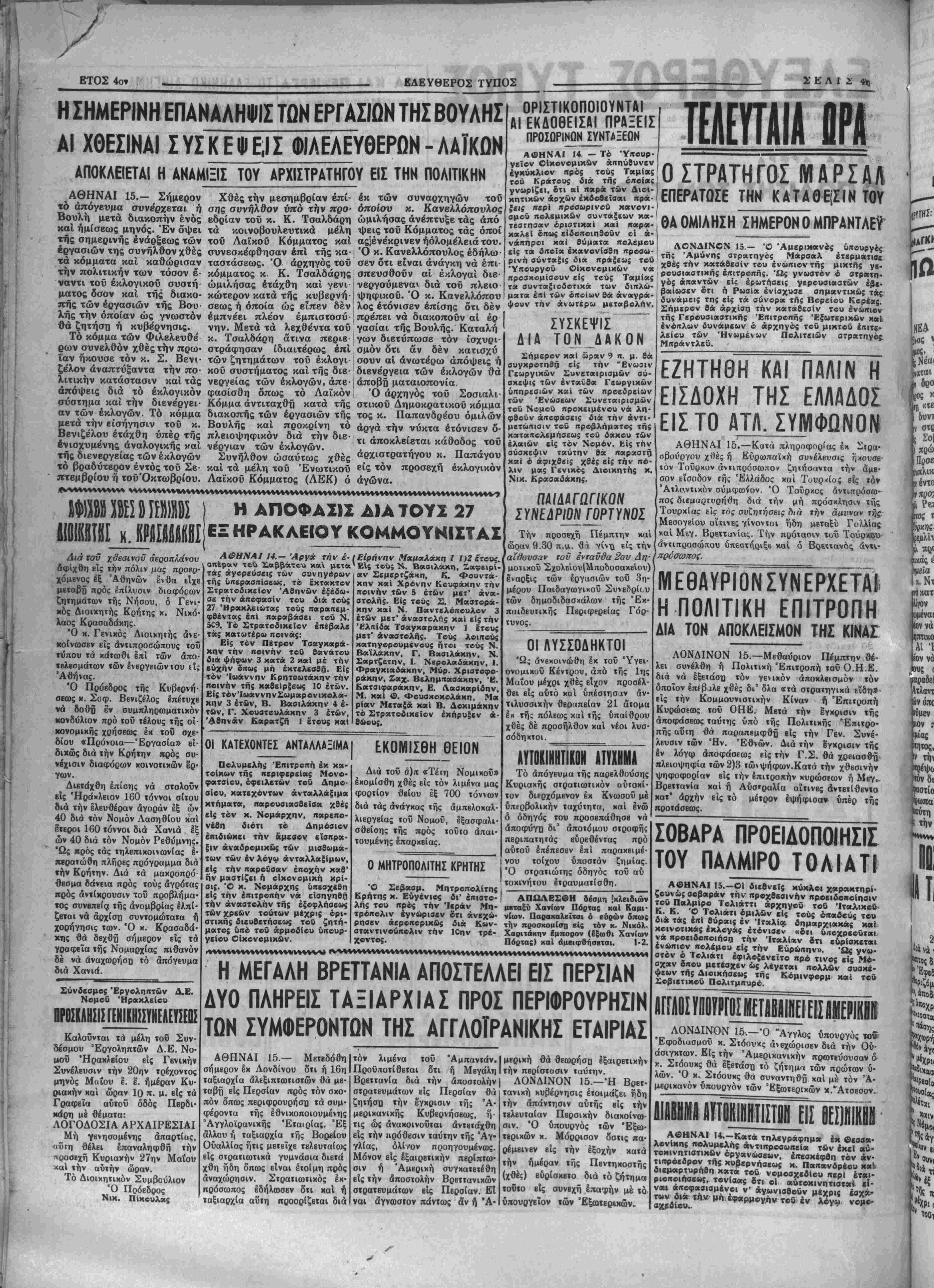 ?·- Στ°°υΐ<« 3α §ξβΤίίσΐ[1 Ιό Μττ»μ των πρώτων ΰ· λων. Ο κ.Στόουκς θα συναντηθή χαί μβ τόν Ά· μεριχανον υπουργόν των Εξωτερικών χ."ΑτσΕσον. ΜΜ ΙϊϋΐΙΣΙΙΙΙ ΕΙΣ ΗΕΙΙΗΙΚΙΙ λονίκης πολυμελής οιντιπροσωπεία των έχεΐ αύ τοκινητιστικων οργ«νώσβΜν> έ—αΗίφ&η^ξΙ £