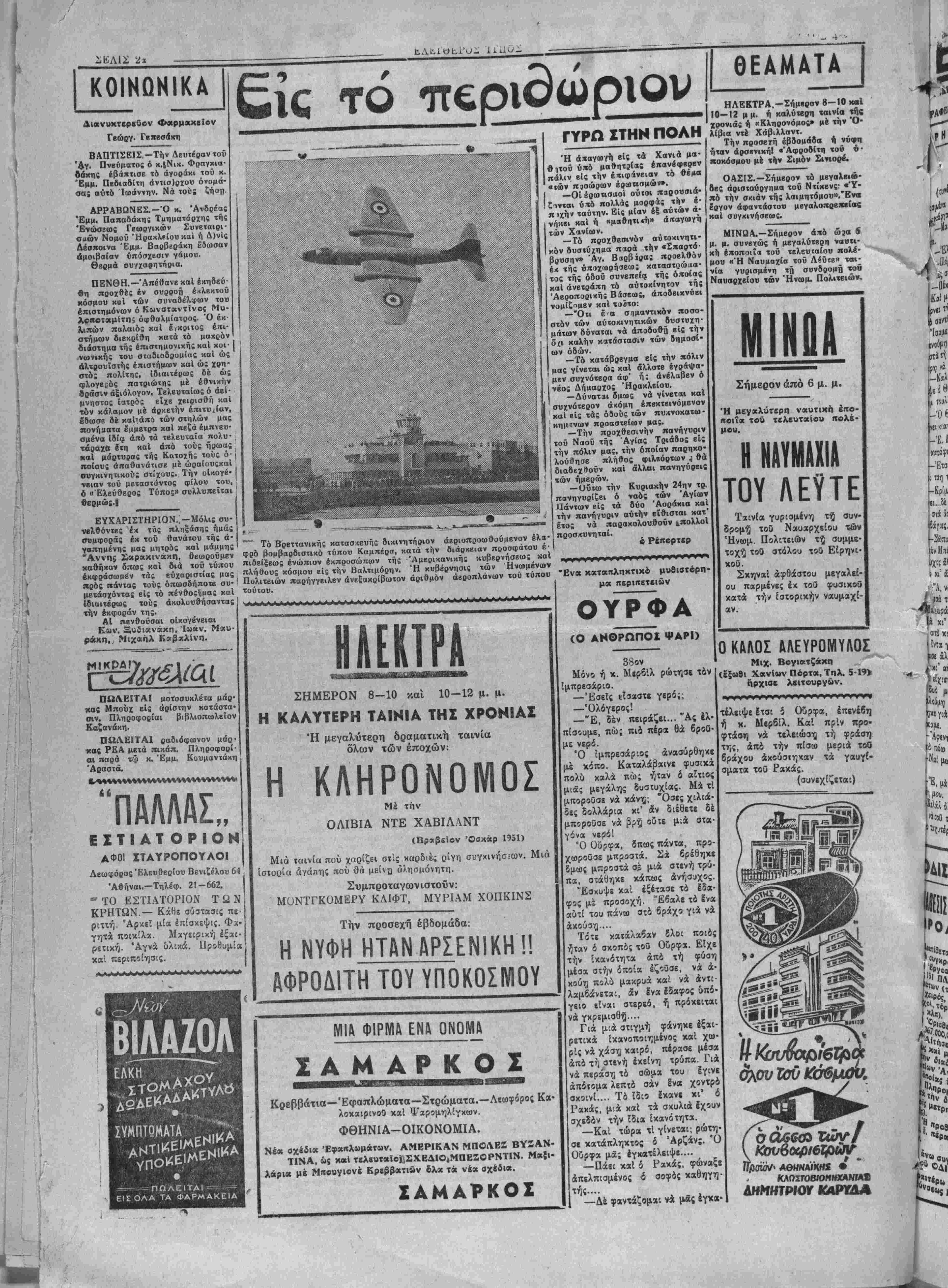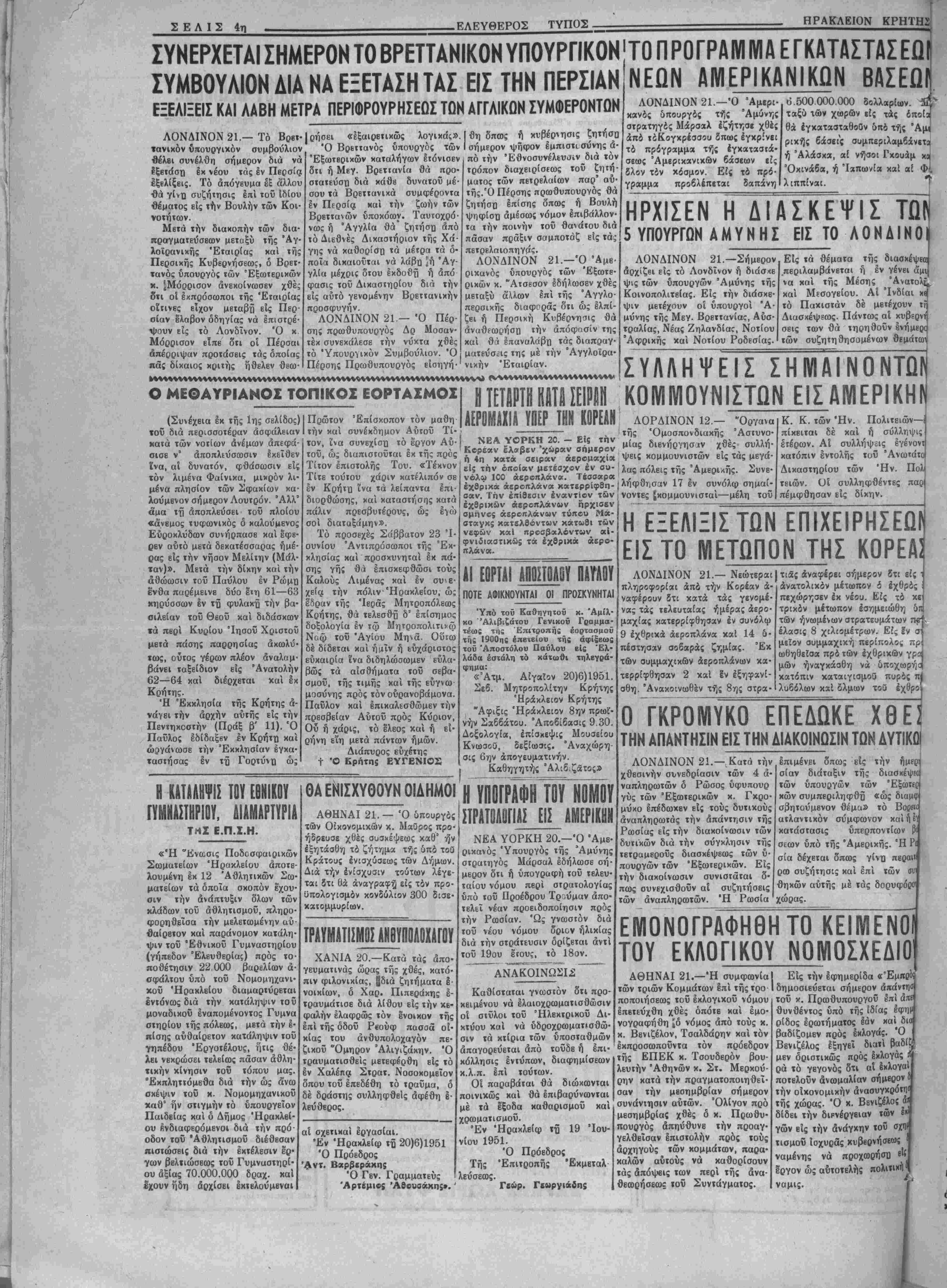 σβητούμενον θέμα» τό Βορ«<| ατλαντικόν σύμφωνον καίήίΐ| κατάστασις ύπερποντίων σεων υπό τής Άμερικής. "Η Ρ(( σία δέχεται όπως γίνη περαιιΙ ρω συζήτησις καί επί των ου θηκών αυτής μέ τάς δορυφόβ χώρας. ΕΜΟΝΟΓΡΑΦΗΘΗΤΟ ΚΕΙΜΕΝΟΙ ΤΟΥ ΕΚΛΟΓΙΚΟΥ Ν01Υ1ΟΣΧΕΔΙΟ) ΑΘΗΝΑΙ 21.—"Η συμφωνίαι Είς την εφημερίδα «Έμίΐβθ!| των τριών Κομμάτων επί τήςτρο Ι δημοσιεύεται σήμερον άπάντηο ποποιήσεως τοΰ έκλογικοΰ νόμου επετεύχθη χθές όπόΐε καί έμο- ογραφήθη [6 νόμος άπό τούς κ. κ. Βενιζέλον, Τσαλδάρην καί τόν άπαγορεύεται άπό τοΰδε ή επι- εκπροσωποΰντα τόν πρόεδρον κόλλησις έντύπων, διαφημίσεων τήί ΕΠΕΚ κ. Τσουδερόν βου- λευτήν "Αθηνών κ. Στ. Μερκού- ρην κατά την πραγματοποιηθεΐ- σαν την μεσημβρίαν σήμερον συνάντησιν αυτών. Όλίνον πρό μεσημβρίας χθές δ κ. Πςωθυ- τΐουργός άπηύθυνβ την προαγ- γελθεΐσαν επιστολήν πρός τούς άρχηγούς των κομμάτων, παρα- καλών αύτούς νά χαθορίσουν τάς άπόψβις των περί τής ανα¬ θεωρήσεως τοΰ Συντάγματος. κ.λ.π. επί τούτων. Οί παραβάται θά διώκωνται ποινικώς καί θά επιβαρύνωνΐαι μέ τα έξοδα χαθαρισμοΰ καί χρωματισμοΰ. Έν Ήρακλείφ τή 19 Ίου- ίου 1951. Ό Πρόεδρος Τής Έπιτροπής Έκμεταλ λεύσεως. Γεώρ. Γεωργιάδης τοϋ κ. Πρωθυπουργοΰ επί ι θυνθέντος υπό τής Ιδίας έφημ ρίδος ερωτήμαΐος εάν καί δια βαδίζομεν πρός εκλογάς. Ό Βενιζέλος Ιξηγεΐ διατί βαδίί μέν οριστικώς πρός εκλογάς Λ ρά τό γεγονός δτι αί εκλογαί ποτελοΰν ανωμαλίαν σήμερον την οικονομικήν άνασυγχρότηι τής χώρας. Ό κ. Βενιζέλος αι δίδει την διπνέργβιαν των ί* γών είς την ανάγκην τοΰ σχηΐ τισμοϋ Ισχυράς κυβερνήσεως ναμένης νά προχώρει! Ιργον ώς αΰτοτελίις ναμις.