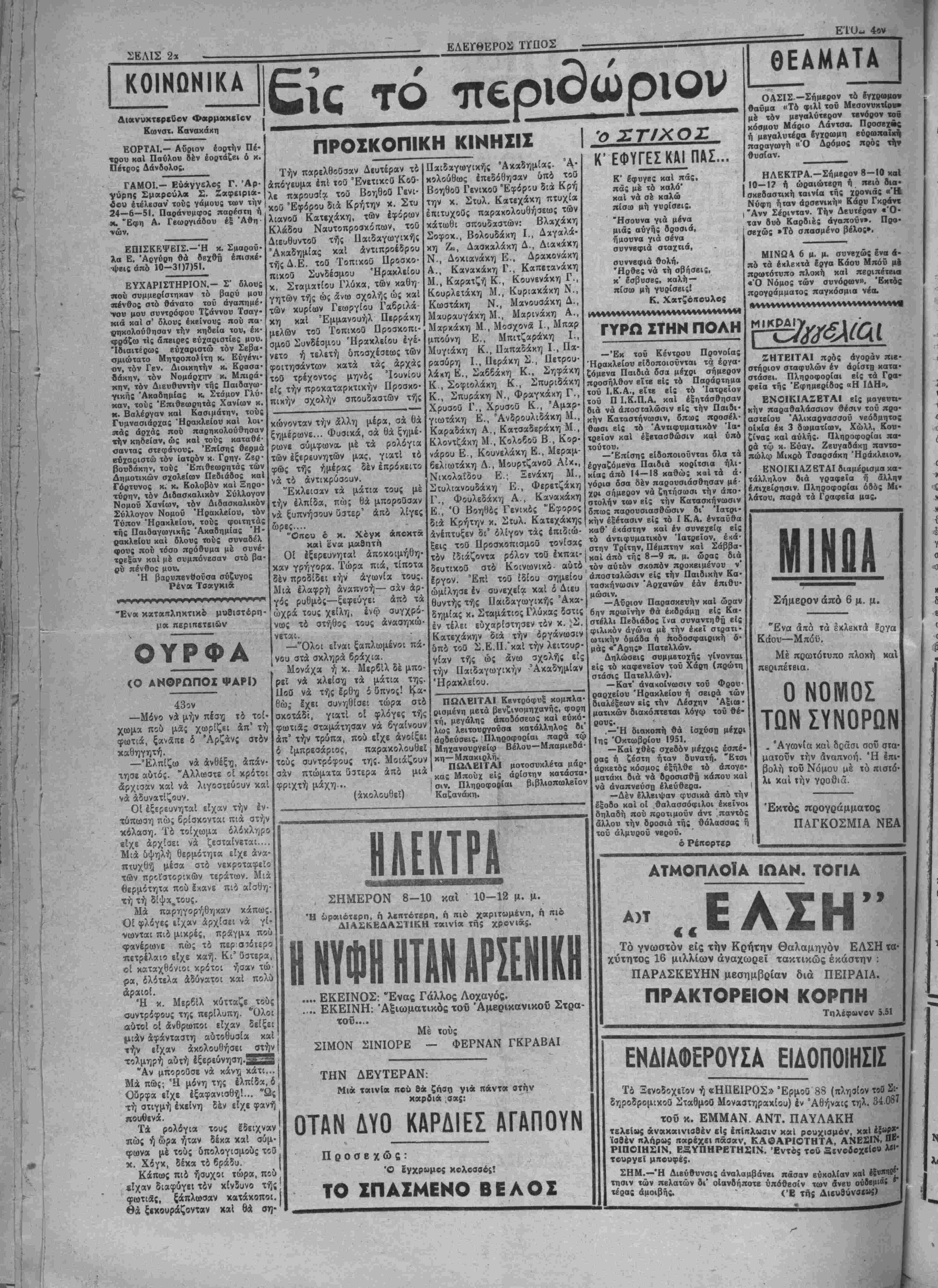 <ϊπό τούς Βρεττανούς. Ό έθνι· νισμός έστρεψΒ την ορμήν τού χατά τής κατά τό πλείστον φαν· ταστικής άηειλής τοΰ Δυτικοΰ ϊμπεριαλισμοΰ. Τοιουτοτρόπως σήμερον οί Πέοσαι έλαβον την υπόσχεσιν τής άνεξαριησίας άπό τόν ϊμπεριαλισμόν αυτόν Χαί την ίπόυχεσιν ανευ πρυηγυυμέ· νού εύημερίας, συμφώνως πρός τάς δηλώσΒΐς ενός εκ των ήγβ- (ών των. Έκτός τής περιπτώ- σεως θαύματος, καί επί ιη υπο· θέσει ότι θά έξακολουθήσουν άκολουθοΰνΐες την παρούσαν τακτικήν των, έκεΐνο τό οποίον είναι βέβαιον, είναι ότι θά έ- ξασφαλίσουν άναρχίαν, χρεωκο¬ πίαν καί την επιβολήν τοϋ άλη- θώς καταπιεστικοΰ ίμπεριαλι- σμοϋ τοϋ Σοβιεπκοϋ κομμουνι¬ σμόν. Τό στοιχείον τής παραφροσύ- νης είς την όλην αυτήν κατάστα¬ σιν, καθίσταται Ιτι μεγαλύτε¬ ρον οταν σκεφθή κανείς δτι τό διχαίωμα εθνιχοποιήσεως δέν είναι έκεΐνο πού αποτελεί ΐό άν-1 «κείμενον τής διβνέξεως. Οί Άγ¬ γλοι ηδη παρεδέχθησαν την έθ*ι· είδε άναγνωριζομένην. Δέν εχει παρά νά σταθϋ βκϊΐ καί θά έ'χτ] κερδΐσει μεγάλην νίκην. Τό νά εξακολουθή νά καταδιώκχ) τόν ήττηθέντα Ιχθρόν, Ινω μία άλ· λη Ιχθρική δύναμις προχώρει πρός τα χάΐω, αποτελεί αύτο- κτονίαν. Οί Βοεττανοί ένεργοΰν μέ παραδειγματιχήν υπομονήν καϊ ψυχραιμίαν. "Οπως ανήγγειλεν Ύπουργός των "Εξωτερικών Μόρισσον τό προσωπικόν τή Άγγλο-Περσικτϊς ειαιρείας Ο συνεχίση τάς εργασίας τού εφ' όσον τοϋ επιτρέπεται τοΰ ϊο, καί ή Μεγάλη Βρεττανίι θά προσφύγη καί πάλιν είς τ διεθνές δικαστήριον τής Χάγης Ή κατάστασις δύναται άχόμτ] νά σωθχΐ.Ή προχθεσινή άνάληψι κατοχής επί των Ιγκαταστάσεων φέρει την Περσίαν είς τό χεΐ λος τής καταστροφάς, ΰπάρχε δμως καιρός πρό; έντιμον υπο χώρησιν. Διακινδυνεύει μέγα λα πράγματα, μεγαλύτερα άκό μη καί άπό τό πολύτιμον πετρέ λαιον τό οποίον πιθανώς τώρα νά χαθή τόσον διά την Δύσιν δσον καί διά την "Ανατολήν Ζώμεν εις ενα εκρηχτικόν κό σμόν καί ουδείς δφελεΐται, εϊτ κράτος, είτε λαός, περιφέρων άνημμένην δάδα. ("Αρθρον των «Τάϊμς της Νίας Υόρκης)» ΙΧΟΛΙΚΑΙ ΠΡΟΟΔΟΙ 1ΠΡΟΧΒΕΣΙΜΗ ΚΛΛΛ1ΤΕΧΠΙΚΗ ΕΜΦΛΙΙΙ1ΙΪ ΤΗΣ ΧΟΡΟΔΙΑΣ ΤΟΥ 2ου ΔΗΜΟΤ. ΣΧΟΛΕΙΟΥ ΗΡΑΚΛΕΙΟΥ ΤΡΑΓΟΥΔΙ ΚΔΙ ΑΠΑΓΓΕΛΙΑ Την 11 30 π. μ. τής προχθές είς τί Κινηματοθέατρον «Μινώα» παρουσία έκλεκΐοθ γενικώς κό- ομού εγένετο ή προαγγελθείσα Καλλιτεχνική Εμφάνισις τής Μαθητικί)ς χορωδίας τοθ Β' Δη- μοτιχοθ Σχολείου Ηρακλείου (Μποδοσάκειον) τής περιφερείας Γόρτυνος. Ή σχολική αυτή έορτή ή ίποία ώς χαί χθές έγράψαμεν εσημείωσεν εξαιρετικήν επιτυ¬ χίαν ώργανώθη πρωτοβουλία τοθ ΈπιθβωρητοΟ τής Δημοτικάς Έκπαιδεύαεως περιφερείας Γόρ¬ τυνος χ. Ήλία Ξηροτύρη, πεπει¬ ραμένον συν τοίς άλλοις χαί κα· λοθ μουσιχοθ, έτελεσε δέ δπδ την διεύθυνσιν χαί την ίλην άρ· ι τ(αν καθοδήγησιν τής διδασκα- Ιλίσσης δεσποινίδος Κατίνας Πα>