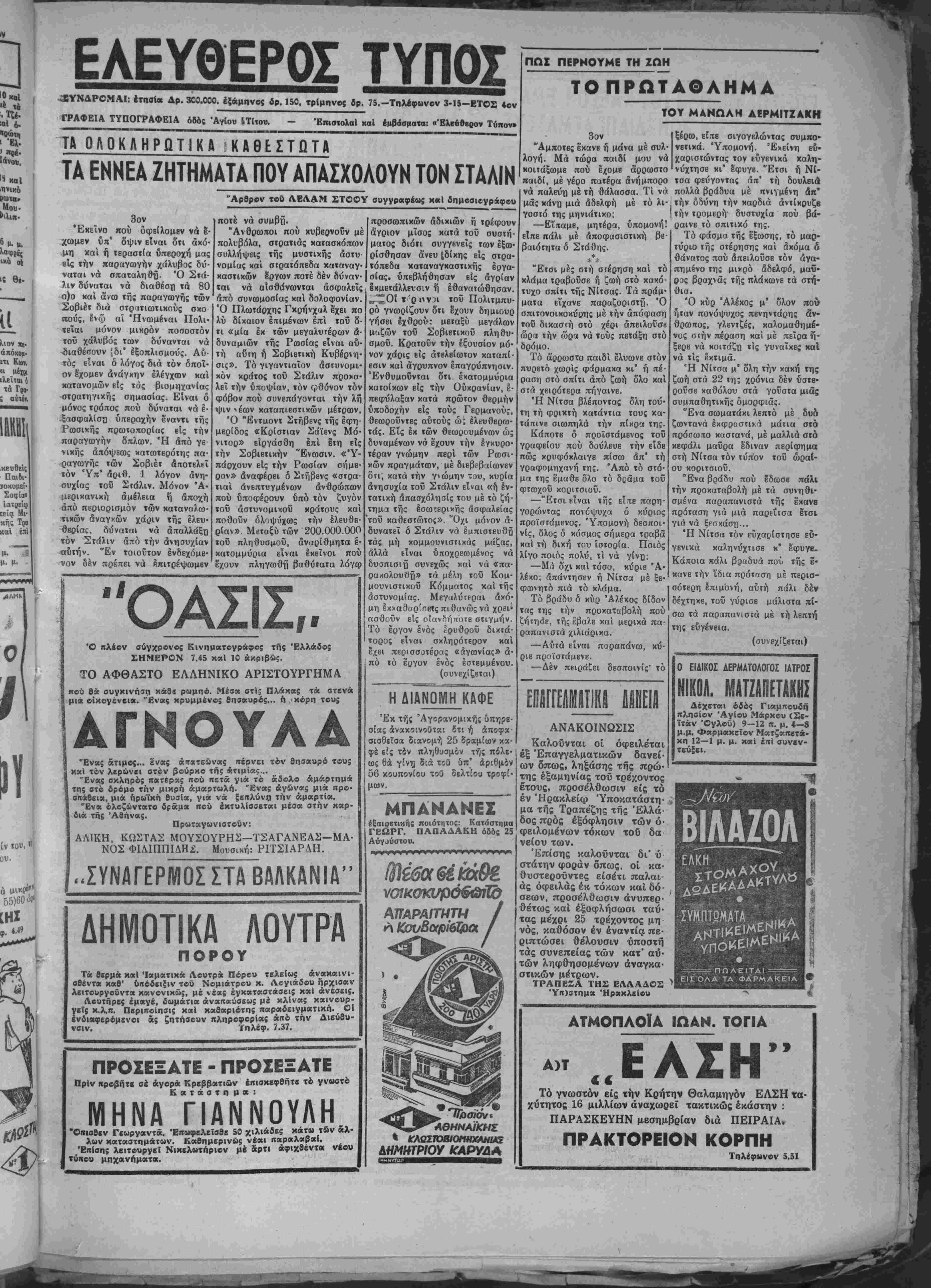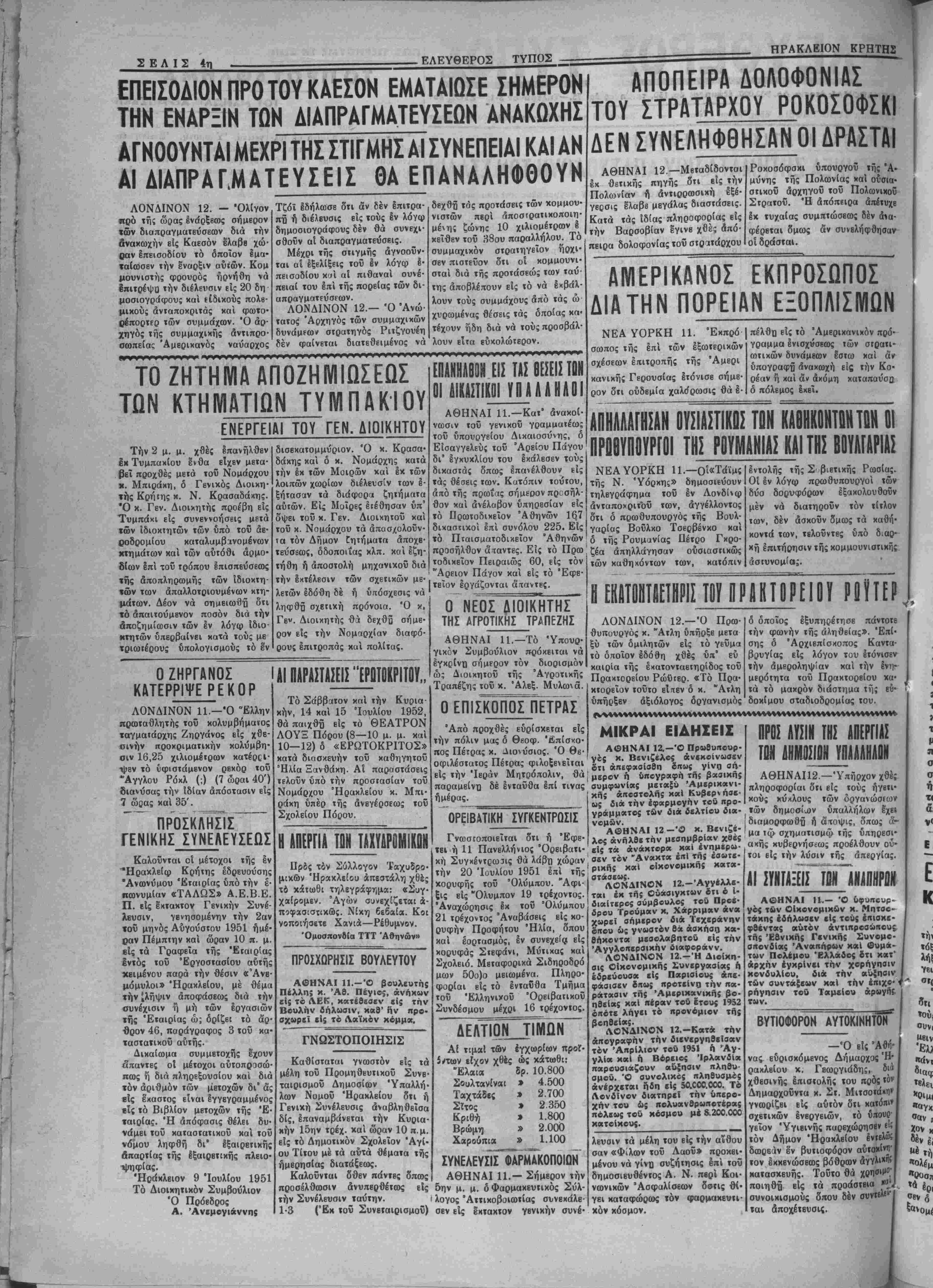 ται πολιτικόν συμβούλιον '*9*ούν «ι «λλαι άιτεργιοιι. "Ας μη σ«ρη8ώμΒν τα η*γτ<» χ«1 ίίι έν "ι ό σΓοαττινόε ριτί οί) ' ? κεφάλαιον των μετχφορων εκ τβυ οποιου έξαρταΓαι θά ασκήση τα καθήκονταΐ --------------------------- τοΰ ανωτάτου σιρατιωτικοΰ Η ΑΡΔΕΥΣΙΣ ΠΙΣΚΟΚΕΦΛΛΟΥ ΟΙ ΚΥΝΕΣ διοικητοΰ. Αί Ηνωμεναι Πολιτειαι θά άποτβλέσουν βεβαίως την κυριώτερον δΰ αοί «υτίι ναμιν τής συμμαχίας καί θά προσφέρουν στρατόν ξηράς, άεροποοίας καί ναυτικοΰ είς πολύ μεγαλυτέραν κλίμακα άπό τάς άλλας χώρας. ηαηατολικη κρητη ΑΙ ΠΡΟΟΔΟΙ ΕΙΣ ΤΗΝ ΙΕΡΑΠΕΤΡΑΝ ΙΕΡΑΠΕΤΡΑ Ίούνιος (τού ανταποκριταί»" μας) —Χαρά ΘεοΟ «Ιναι αυτήν την εποχήν ή πόλ:ς τί)ς Ιεραπέτρας πού αποτελεί διά την ανατολικήν Κρήτην κάτι τό Ουγκεντρωμένο είς γραφι^ότητα, πρόοδον, φιλοξενίαν καί τάσιν πρός βελτιωμένην καί πλουσίαν Παραγωγήν. Έκείνο πού προσέ- χ«ι αυτήν την εποχήν 6 ταξιδΐώ της καί περαοτικίς είς την Ίερά· πετραν είναι ή συναίσθησις είς 8· λους άπβ την Δημοτικήν της Αρ¬ χήν μέχρι καί τοθ τελευταίου πό λίτου ότι ή Ιεραπέτρα πρέπει νά αναγεννηθή καί νά έξωραίσθή ώ; πόλις πρό παντός. "Ετσι είς την Ίεράπετραν σημειώνεται αυ¬ τήν την εποχήν ϊνας ζωηρός οί- δ δργασμός. Δέν λείπουν αί νέαι οίκοδομχί πού την συμ· πληρώνουν καί τής δίνουν νέαν ζωήν Οστερα άπό δσα υπέφερεν τελευταίως άπό τούς σεισμοός. 'Η Ιεραπέτρα παρουσιάζεται σήμε¬ ρον μέ ΐΐολλέ; ώμορφιέ;. Τα έκ- λεκτά προϊόντα τής επαρχίας της τό λάδι, ή φίνα ντομάτα καί τα αλλα έχλεκτά κηπευτικά της, ή σταφίδα καί τό χαροΰπι δέν εί¬ ναι σήμερον ιά μόνα σΐολίδΐα της καί α! σταθεραί βάσεις τής οίκανομικής της ζωής. Είναι καί τα σπίτια της καί γενικά ή τά¬ σις αυτή"; πρός την πρόοδον διά την οποίαν άξίζει κάθε ϊπαινος στάς τοπικάς αρχάς στούς προο- δευτικούς καί φιλοπόνους κ»το£· κους της καί σέ κάθε άτομικώ; Ίεραπετρίτη πού είς τόν στενόν κύκλον τού άποβαίνει πχντοθπα- ράγων προόδου. "Ετσι είς τό έγ γίις μέλλον ή Ιεραπέτρα θά εί¬ ναι δχι μόνον τόπος έκλεκτής πά ραγωγής άλλά καί άληθινόν κέν τρον τουριαμοϋ τής Κρήτης. το διά την παράδοσίν το5 όφειλο μένου ποσοστοθ διά τό ?:ος 1950 χαί ουχί διά τό τρέχον έτος. Την επομένην ό Γραμματεύς ευρέθη Ινεχρός. 'Η Κρατική Άσφάλεια ΓΕΝΙΚΟΣ ΕΞΟΡΑΪΓΜΟΣ ΚΑΙ ΤΑΣΙΣ ΠΡΟΣ ΑΝΑΜΙΞΙΝ ««^έφθασεν άμέσω; επί τόπου, περιεκύκλωσε τό χωρίον χαί 6 πέβαλε τούς χωριχού; είς έξαντλη τιχήν ανάκρισιν. Τέλος, συνέ- λαβε δύο οίχογένειες διότι προ· σέφεραν δήθεν φιλοξενίαν είς Ινα άτομον τό Οποίον έκτοτε έξηφα νίσθη. Μετά την αναχώρησιν των ά- στυνομικών οί κάτοικοι κατηυθύν· θησαν έν σώματι είς τα γραφεϊα τοθ Κόμματος κ»ί εζήτησαν άϋό τόν βοηθόν τοθ πρώην γραμμα- τέως νά διαγράψη «μαζικώς» 8- λους τούς χωρικούς άπό την «ά γροτικήν κολλεκτίβαν». Κατ' αρ¬ χάς ό βοηθός προσεπάθησε νά μεταπείση τούς χωρικούς. Άλλ' ή άπειλητική στάσις των τελευ· ταίων χαί τό πρόσφατον άτυχη- μα τοθ τέως προισταμένου τού τόν έκαναν νά μεταβάλη γνώμην καί νά Μάς γράφουν άη5 την αν Σητείας καί μης ερωτούν ή ύπ αριθ. 180)285 παράγρ. ρχ διατί 2925 "Υπό των όργάνων Άγροφυλα- κης κατεμηνύθησαν προχθές διά- φοροι χάτοχοι χυνών διότι είχον τή; 27ης Ίανουαρίου απόφασις τού αφήση τούτου; νά περιφέρωνται ά- 'Υπονργείου Γβωργία: δέν εκτελεί- | νβυ φιμώτρων. Άποροϋμβν μά την ται. Ή απόφασις αΰΐη, ή όποία αλήθειαν πώς ΰστερα άπό τόσα έρρίφθη εί: τον χάλαθον των ά· | γεγονότα κι1 μάλιστα φριχιαστικά χρήσΐων υπό τής οίχείας έπιτρο-1 γύριο άπό την έπιδημίαν τής λύσ- πής άφορά την άιδβυσιν των κτη- ιιατικών περιφερ