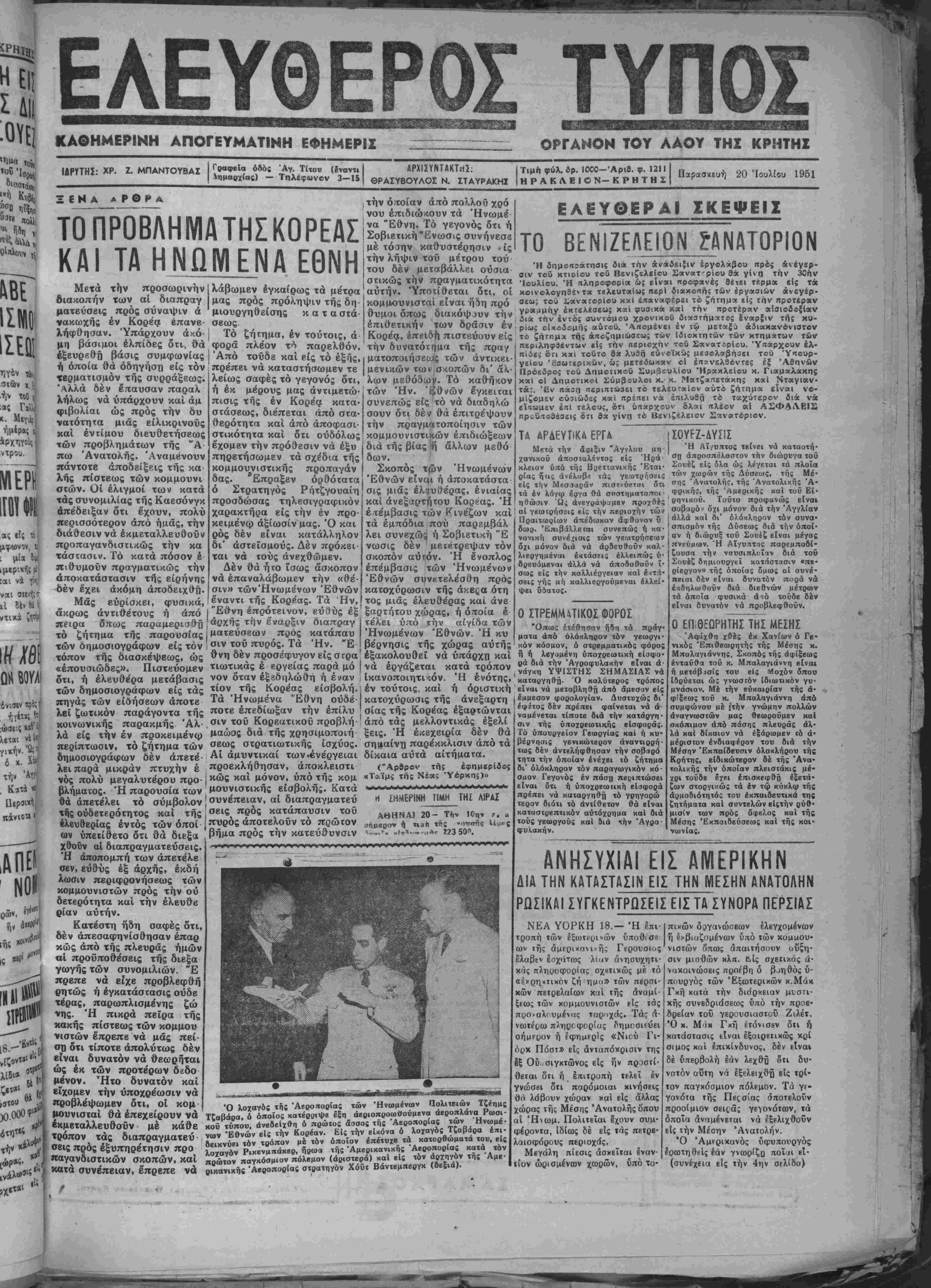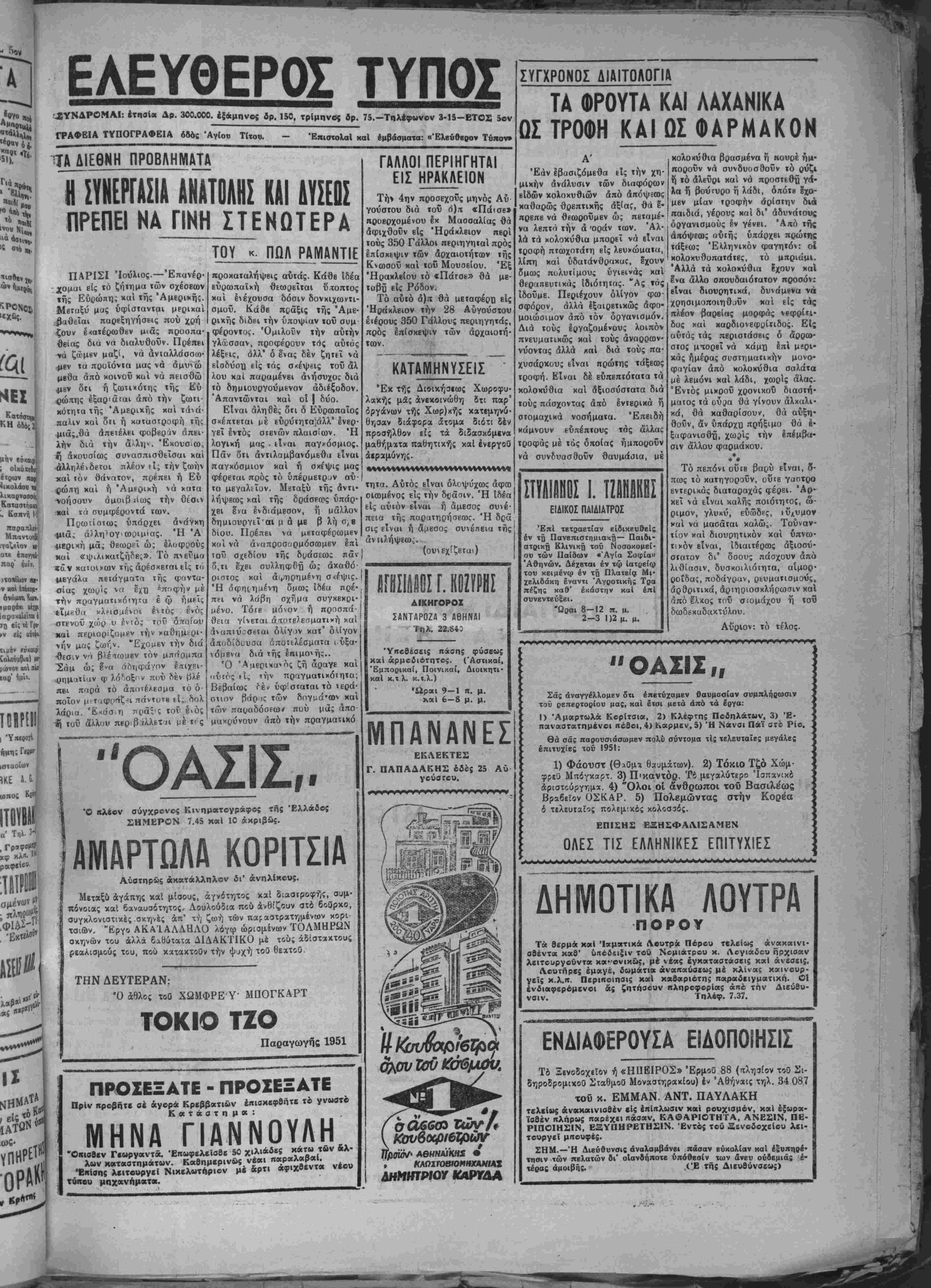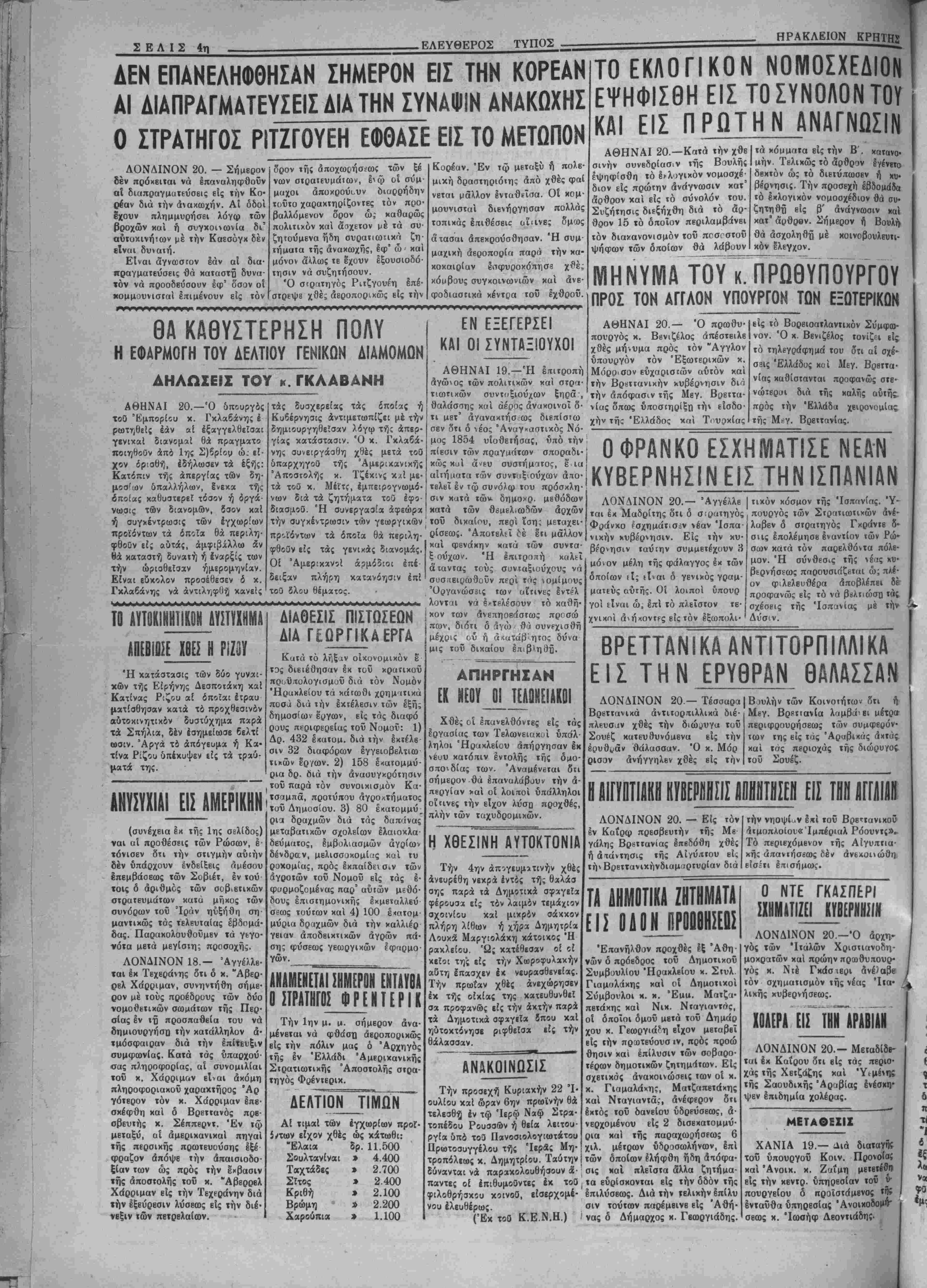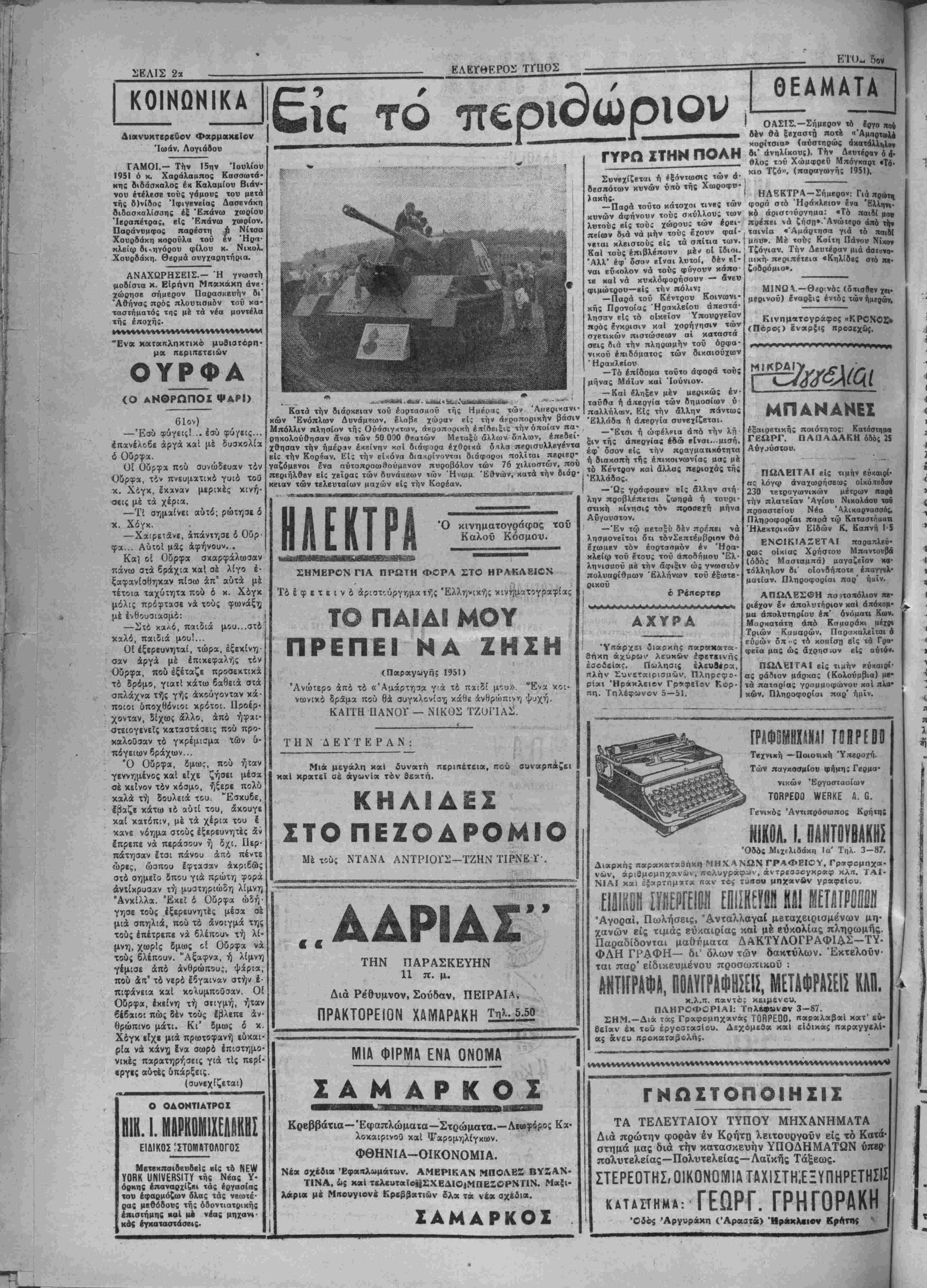 τΐχών έργων. 2) 158 ε<αιομμύ- ρια δρ. διά την άνασυγχρότησιν τοϋ παρά τόν συνοικισμόν Κα¬ τσαμπά, προτύΐτου άγροχτήματος τοΰ Δημοσίου. 3) 80 εκατομμύ_ ρια δραχμών διά τάς δαπάνας μεταβατικών σχολείων έλαιοκλα- δεύματος, εμβολιασμόν άγρίων δένδραν, μελισσοχομίας χαί τυ ροχομίας, πρός έκπαίδεισιν των άγροτών τοϋ Νομοΰ είς τάς I- φαρμοζομένας παρ' αυτών μεθό· δούς Ιπισιημονιχής έκμβταλλεύ σεως τούτων χαί 4) 100 !<ατομ- μύρια δραχμών διά την καλλιέρ γβιαν άντοδβικτικών άγρών πά¬ σης φύσεως γεωργιχών έφαρμο- γών. ΑΝΑΜΙνΕΤΛΙ ΣΗΜΕΡΟΝ ΕΝΤΑΫΟΑ Ο ΣΙΡΑΤΗΤΟΠΐΡΕ Ν Τ Ε ΡΙΚ Την Ιην μ. μ. σημερον άνα- μένεΐαι νά φθάση άεροπορικώς είς την πόλιν μας ό Άρχηγός τής εν Ελλάδι Άμερικανικής Σιρατιωτιχής Άποστολής στρα- τηγός Φρένιερικ. ΔΕΛΤΊΟΝ ΤΙΜίΪΝ Αί τιμαί των εγχωρίων προϊ «όν είχον χθές ώς κάτωθι: "Ελαια δρ. 11.500 Σουλτανίναι » 4.400 Ταχτάδες » 2.700 ΣΤτος ^ 2.400 Κριθή » 2.100 Βρώμη » 2.200 Χαρούπια » 1.100 ΑΘΗΝΑΙ 19.—Ή επιτροπή αγώνος των πολιτικών καί στρα¬ τιωτικών συντοξιούχων ξηρά"·, θαλάσσης καί αέρος ανακοινοί ό¬ τι μετ5 άγανακτήσ-ως διβπίστω σεν ότι δ νέος Άναγ»αατικός Νό- μος 1854 υϊοθεΐήσας, υπό την πίεσιν των πραγμάτων σποραδι· κώς κυί άνευ συστήμιτος, έ ιιι αίτήματα των συνταξιούχων ά/ιο' τελκΐ έν τφ συνόλφ τού πρόσκλη¬ σιν καΐά των. δημοχρ. μεθόδων κατά των θίμελιωδών άρχών τοΰ δικαίου, περί ΐση; μεταχει- ρίσεως. ΆποτελΕΪ 6έ ετι μάλλον χαί φενάκην κατά των συντα· ξ ούχων. Ή έπιιροπή κάλι:" άταντας τούς συνταξιυύχους νά συσ/ΐειρωθοϋν περί τάς νομίμους Όργανώσδΐς «ών αΐτινες έντέλ λοντ'«ι νά ε^ΤΗλέσουν τό καθή¬ κον των δνεπηοεάσιως πρόσω πων, διότι δ αγώ ■ θά συνεχισθή μέχρις ού ή ά<ατάβ:ητος δύνα μις τοϋ δικαίου ε ΜΗΝΥΜΑ ΤΟΥ κ. ΠΡΩΘΥΠΟΥΡΓΟΥ ΠΡΟΣ ΤΟΝ ΑΓΓΛΟΝ ΥΠΟΥΡΓΟΝ ΤΟΝ ΕΞΩΤΕΡΙΚΟΝ ΑΘΗΝΑΙ 20.— Ό πρωθυ· πουργός κ. Βενιζελος απέστειλε χθές μή-.υμα πρός τόν Άγγλον υπουργόν τόν Εξωτερικών κ. Μόρρισον ευχαριστών αυτόν καί την ΒρΗΐτανιχήν κυβέρνησιν διά την απόφασιν τής Μεγ. Βρεττα¬ νίας όπως υποστηρίξη την είσδο- χήν τής Ελλάδος καί Τουοκίας «ίς τό Βορβιοατλαντιχόν Σύμφω¬ νον. Ό κ. Βενιζέλος τονίζη είς τό τηλεγράφημά τού ότι αί σχέ- σβις "Ελλάδος χοί Μεγ. ΒρΒττα· νίας καθίστανται προφανώς στβ- νώΐεροι διά τής χαλής αυτής πρός την Έλλάδα χειρονομΐας τής Μ»=ν. Βρεττανίας. Ο ΦΡΑΝΚΟ ΕΣΧΗΜΑΤΙΣΕ ΝΕΑΝ ΚΥΒΕΡΝΗΣΙΝ ΕΙΣ ΤΗΝ ΙΣΠΑΝΙΑΝ ΑΠΗΡΓΗΣΑΝ ΕΚ «Ε0ΥΟ[ Χΰές οί επανελθόντες εις τάς εργασίας των Τβλωνειακοί ύπάλ ληλοι Ηρακλείου απήργησαν έκ νευυ κατόπιν έντολής τής δμο σπονδίας των. Άναμένβται δτι σήμερον θά έπαναλάβιουν την α¬ περγίαν *αί οί λοιποί ύπάλληλοι οΐτινες την είχον λύση προχθές, πλήν των ταχυδρομιχών. Η ΧΘΕΣΙΝΗ ΑΥΤΟΚΤΟΝΙΑ Την 4ην απογευματινήν χθές ανευρέθη νεκρά έντός τής θαλάσ σης παρά τα Δημοτικά σφαγεΐα φέρουσα είς τβν λαιμόν τεμάχιον σχοινίου καί μικρόν σάκκον πλήρη λ£θων ή χήρα Δημητρία Λουκά Μαργιολάκη κάτοικος Ή ρακλείου. Ώς κατέθεσεν οί οί κεΐοι της είς την Χωροφυλακήν αδτη έπασχεν έκ νευρασθενείας. Την πρωΐαν χθές ανεχώρησεν έκ τής οικίας της κατευθυνθεΐ σα προφανώς είς την άκτήν παρά τα Δημοτικά σφαγιΐα δπου καί ηυτοκτόνησε ριφθεΐσα είς την θάλασσαν. ΑΝΑΚΟΙΝΩΣΙΣ Την προσέχη Κυριακήν 22 Ι¬ ουλίου καί ώραν 6ην πρωϊνήν θά τελεσθή έν τφ Ίερφ Ναώ Στρα- τοπέδου Ρουσσών ή θεία λειτου- ργία 5πό τοα Πανοσιολογιωτάτου Πρωτοσυγγέλου τής Ίερ*ς Μη¬ τροπόλεως κ. Δημητρίου. Ταύτην | δύνανταινά παρακολουθήαουν &■ πάντες οί επιθυμούντες έκ τοθ ( φιλοθρήσκου κοινοθ, ίίσερχομέ- νού έλευθέρως. (Έ