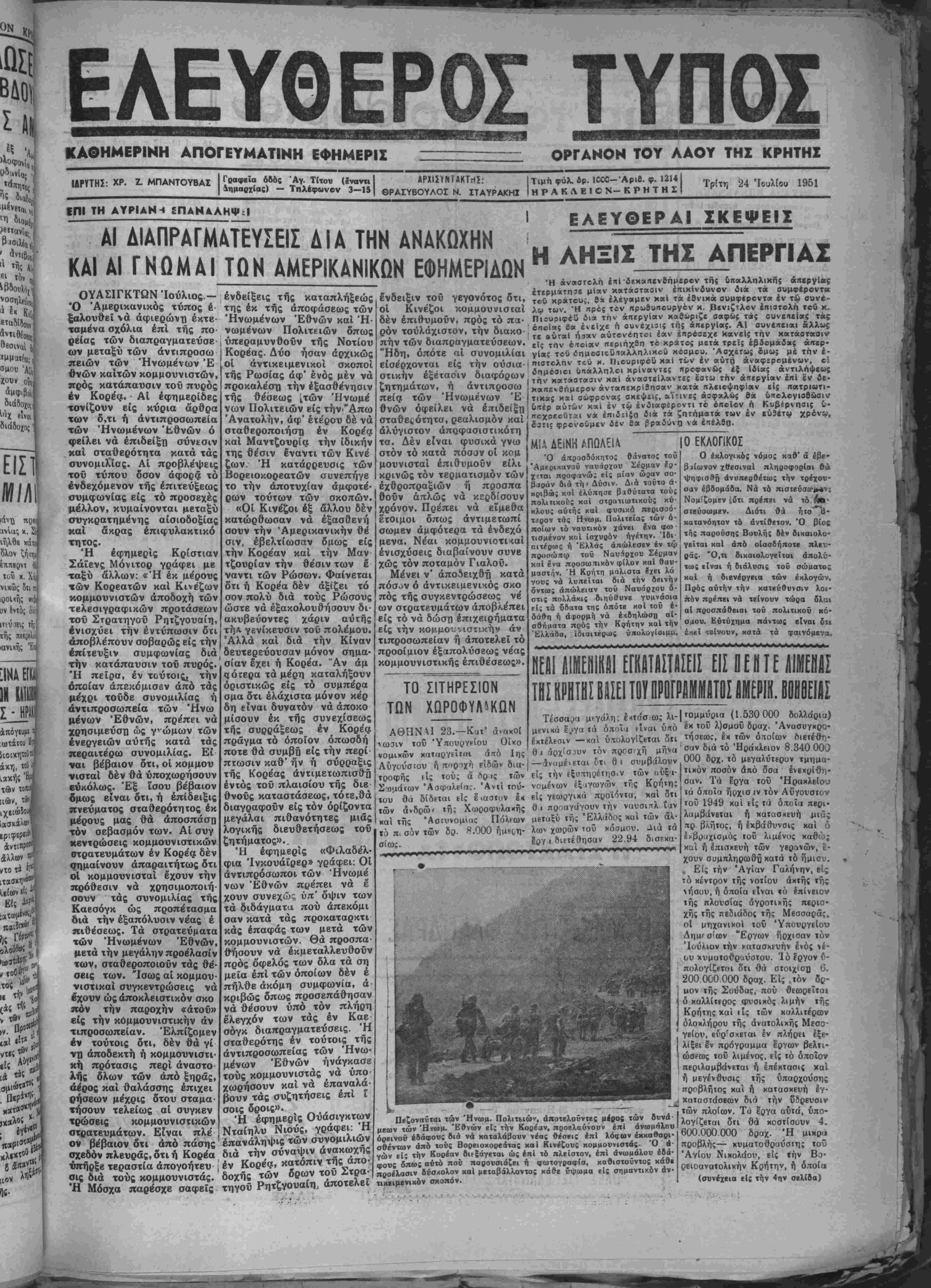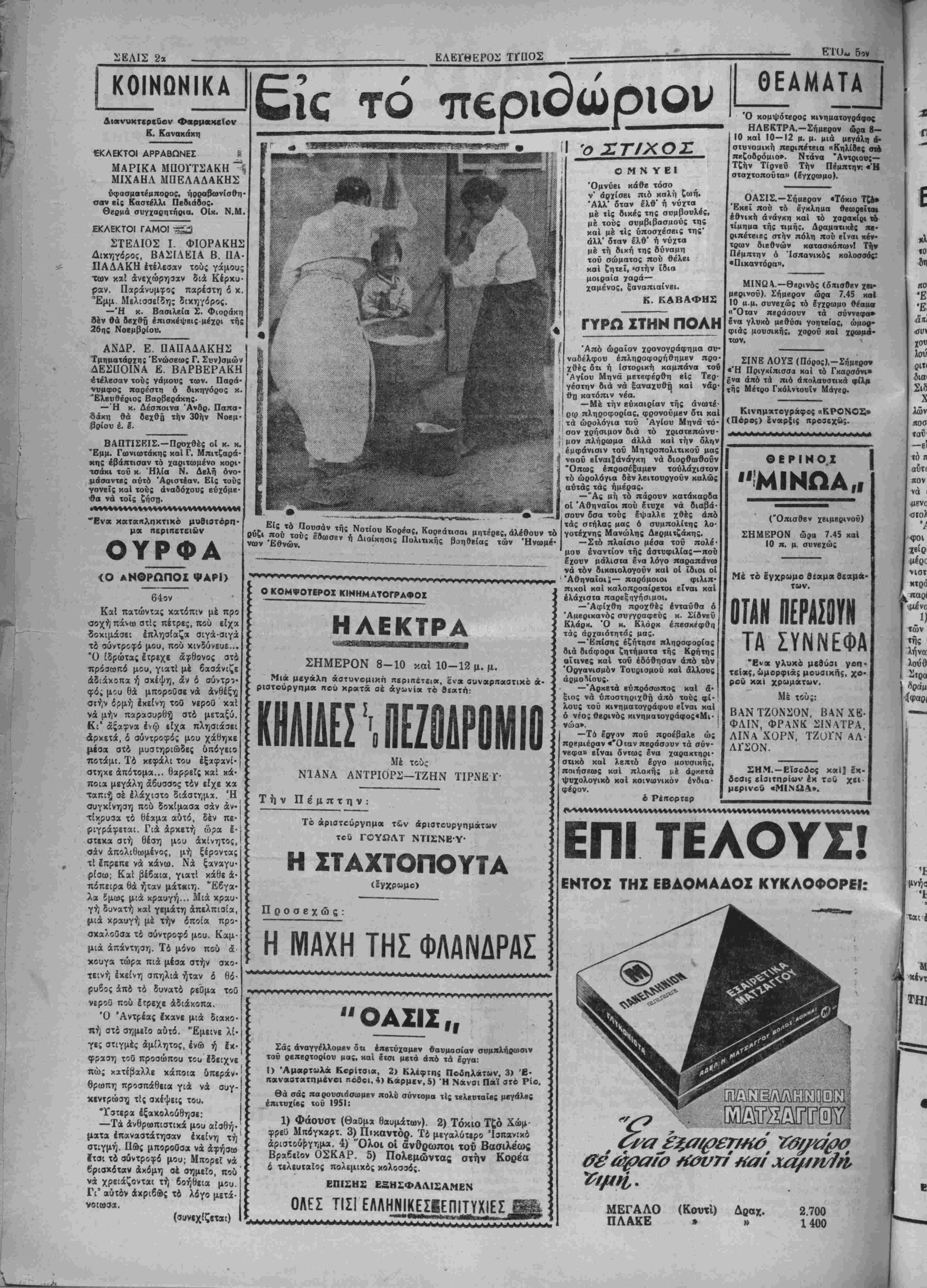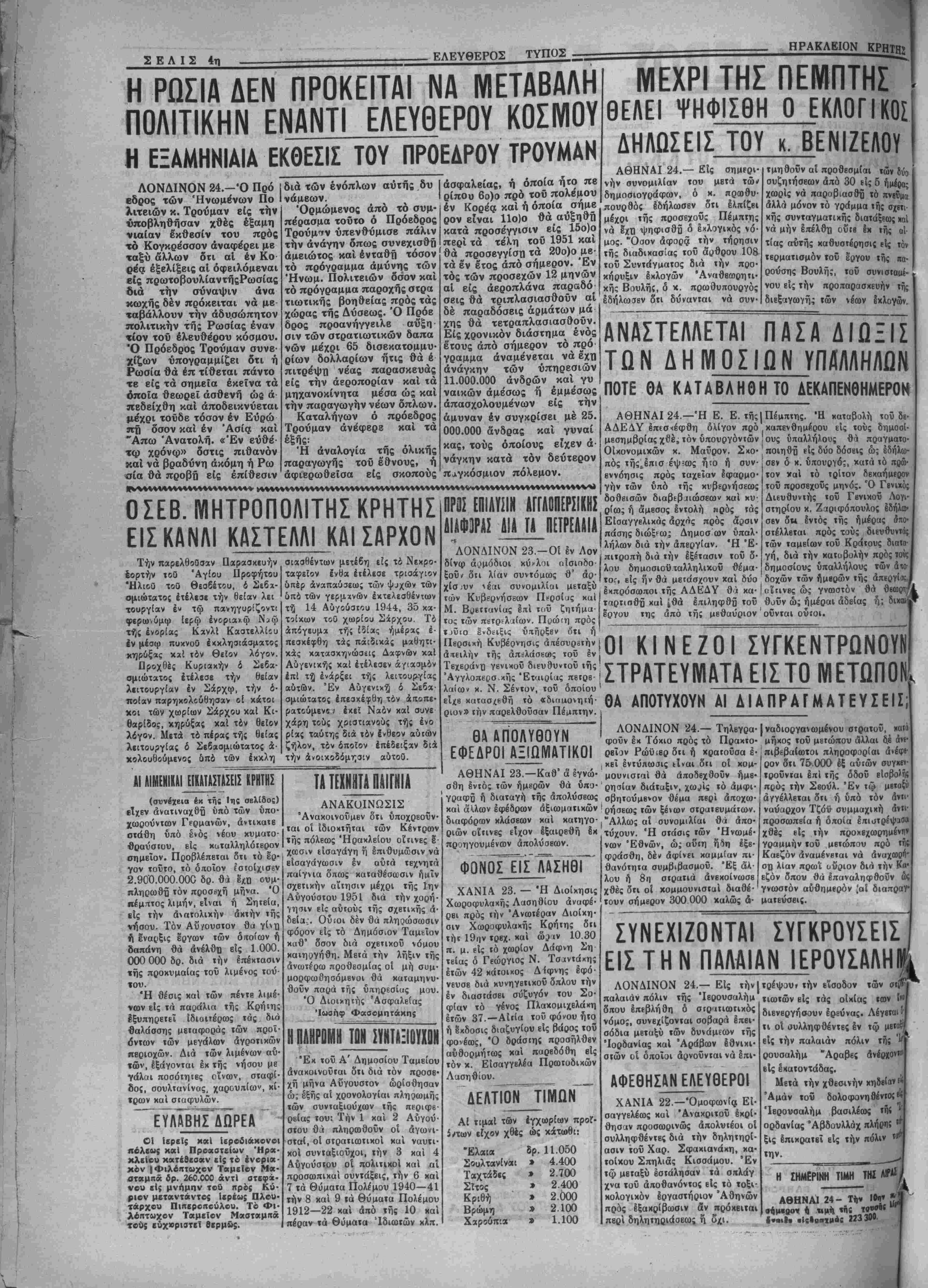 <οία θά προβή είς επίθεσιν διά των ένόπλων αυτής δυ Ι ασφαλείας, ή όποία ήτο πε νάμεων. Όρμώμενος άπό τό συμ- πέρασμα τουτο ό Πρόβδρος Τρούμ^ν ΰπενθύμισε πάλιν την άνάγην δπως συνεχισθή άμειώτος καί ένταθή τόσον τό πρόγραμμα αμύνης των Ήνωμ. Πολιτειών όσον καί τό πρόγραμμα παροχής στρα τιωτικής βοηθείας πρός τάς χώρας τής Λύσεως. Ό Πρόε Ορος προανήγγειλβ αΰξη σιν των στρατιωτικών δαπα νών μβχρι 65 δισεκατομμυ- ρίων δολλαρίων ήτις θά έ πιτρέψΐ) νέας παρασκευάς είς την άεροπορίαν καί τα μηχανοκίνητα μέσα ώ; καί την παραγωγήν νέων δπλων. Καταλήγων ό πρόεδρος Τρούμαν άνέφερβ καί τα εξής: Ή άναλογία τής όλικής παραγωγής τοΰ έθνους, ή άφιερωθεΐσα είς σκοπούς Ι ρίπου 6ο)ο πρό τού πολέμου έν Κορέα καί ή όποία σήμβ ρον είναι 11ο)ο θά αυξηθή κατά προσέγγισιν βίς 15ο)ο περί τα τέλη τοΰ 1951 καί θά προσβγγίση τα 20ο)ο μβ· τα έν έτος άπό σήμερον. Έν τος των προσεχών 12 μηνών αί είς άεροπλάνα παραδό σεις θά τριπλασιασθοΰν αί δέ παραδόσβις άρμάτων μά χης θά τετραπλασιασθοΰν. Είς χρονικόν διάστημα ενός έτους άπό σήμερον τό πρό· γραμμα άναμένεται νά έχη ανάγκην των ύπηρεσιών 11.000.000 άνδρων καί γυ ναικών άμέσως ή έμμέσως άπασχολουμένων είς την άμυναν έν συγκρίσει μέ 25. 000.000 άνδρας «αί γυναί κάς, τούς όποίους είχεν α¬ νάγκην κατά τόν δεύτερον παγκόσμιον πόλεμον. ΜΕΧΡΙ ΤΗΣ ΠΕΜΠΤΗΣ ΘΕΛΕΙ ΨΗΦΙΣΘΗ Ο ΕΚΛΟΓΙΚΟΙ ΔΗΛΩΣΕΙΣ ΤΟΥ κ. ΒΕΝΙΖΕΛΟΥ ΑΘΗΝΑΙ 24.— Είς σημρρ.- νήν συνομιλίαν τού μετά τώ* δημοσιογράφων, ό κ. πραοθυ· πουρθός εδήλωσεν δΐι ελπίζβι μέχοι τής προσεχούς Πέμπιης νά εχχ) ψηφισθή ό έχλογικός νό· μος. Όαον άφορςί την τήρησιν της διαδιχασίας τοΰ δρθρου 10& τοΰ Συντάγματος διά την προ¬ κήρυξιν Ικλογών κης Βουλής, δ κ. Άναθβωρητι πρωθ'υπουργός εδήλωσεν δτι δύνανται νά συν τμηθοϋν αί προθεσμίαι των δν» συζηιήσεων άπό 30 Είς 5 ήμίρα- χωρίς νά παραβιασθΐ τό πνβνμα <5λλά μόνον τό γράμμα ιής σχετι- κης συνΐαγματικής διατάξεως χαί νά μην επέλθη οΰΐβ Ικ ιής α1· τίας αΰτίίς καθυστέρησις είς τόν τερματισμόν τοϋ εογου τής πα¬ ρούσης Βουλής, ΐοϋ συνισιαμί· νού είς την προπαρασκευήν τής διεξαγωγή; των νέων Ιχλονων. ΟΣΕΒ. ΜΗΤΡΟΠΟΛΙΤΗΣ ΚΡΗΤΗΣ ΕΙΣ ΚΑΝΛΙ ΚΑΣΤΕΛΛΙ ΚΑΙ ΣΑΡΧΟΝ Την παρελθούσαν Παρασκευήν εορτήν τοϋ Άγ£ου Προφήτου ΉλιοΟ τοθ θεσβέτου, δ 2εβα- σμιώτατος έτελεσε την θείαν λει χουργίαν έ« τψ πανηγυρίζοντι φερωνύμψ ίερω ένοριαχψ Ν^ω τής ένορίας Κανλί Καστελλίου έν μέσψ πυχνοθ έκκλησιάσματος χηρύξας καί τόν Θείον λόγον. Προχθές Κυριακήν δ Σεβα- σμιώτατος έτελεσε την θείαν λειτουργίαν έν Σάρχφ, την ο¬ ποίαν παρηκολούθησαν οί κάτοι κοι των χωρίων Σάρχου καί Κι· θαρίδος, χηρύξας καί τόν θείον λόγον. Μετά τό πέρας τής θείας λειτουργίαν ό Σεδασμιώτατος ά- χολουθούμενος υπό των έκκλη σιασθέντων μετέβη είς τό Νεκρο¬ ταφείον ένθα έτελεσε τρισάγιον υπέρ αναπαύσεως των ψοχών των υπό των γερμχνών έχτελεσθένιων τή 14 Αυγούστου 1944, 35 κα· τοίκων τοθ χωρίου Σάρχου. Τό άπόγευμα τής ιδίας ημέρας ε¬ πεσκέφθη τάς πάιδικάς μαθητι- κάς κατασχηνώσεις Δαφνών καί Αΰγενικής καί ετέλεσεν άγιασμόν επί τ^ ενάρξει τής λειτουρ-γίας αυτών. Έν Αύγενιχ^ δ Σ,εβα- σμιώτατος επεσκέφθη τόν άιτοπε- ρατούμενΐ ι έκεϊ Ναόν καί συνε χαρή τούς χριστιανούς τής ένο ρίας ταύτης διά τόν ίνθεον αυτών ζήλον, τόν οποίον επέδειξαν διά την άνοικοδόμησιν αύτοθ. ΑΙ ΑΙΜΕΗ1ΚΑΙ^ΙΚΑΤΑ2ΤΑΣΕΙΣ ΚΡΗΤΗΣ (συνέχεια έκ τής Ιης σελίδος) βΐχεν άνατιναχθΉ υπό των υπο· χωρούντων Γερμανών, άντικαιε στάθη υπό ενός νέου κυματο¬ θραύστου, είς καταλληλότερον ση