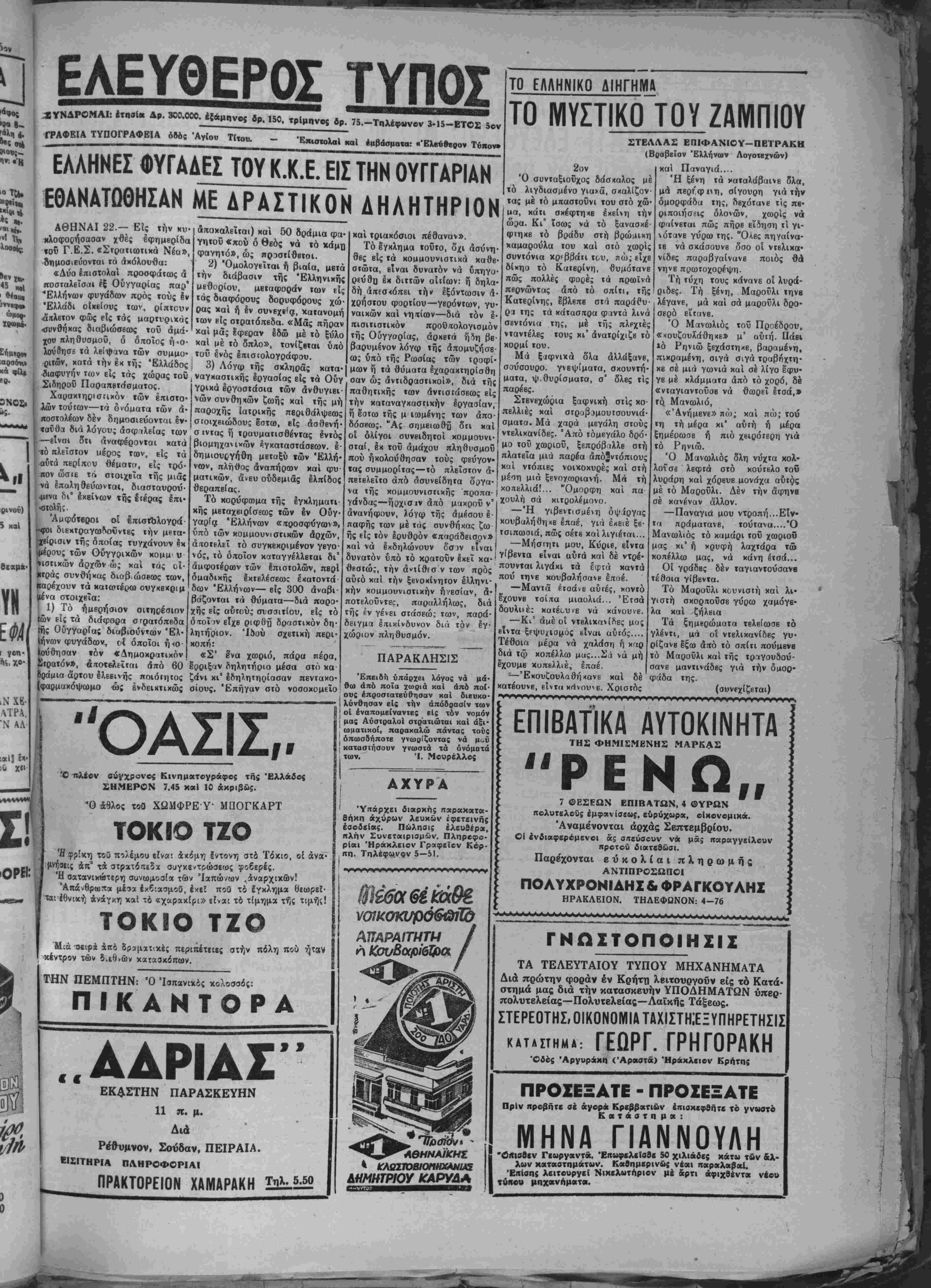 χατέουνε, είντ(« χ<ίνου*β. Χρισΐός νηνβ πρωτοχορέψη. Τή τύχη τους χάνανε οί λυρά- ριδες. Τή ξένη, Μαροΰλι τηνέ λέγανε, μά καί σά μαροϋλι δρο- σερό εΐτανε. Ό Μανωλιός τοΰ Πρόεδρον, «χουζουλάθηχε» μ' αύιή. Πάβι ιό Ρηνιώ ξεχάστηχε, βαραμένη, πιχραμένη, σιγά σιγά τραβήχτη· κε σέ μιά γωνιά καί σέ λίγο έφυ* γε μέ χλάμματα άπό τό χορό, δέ «νταγιαντοϋσε νά θωρεί ετσά,» τό. Μανωλιό, «Άνήμενε» «ώ,· καί πώ; τού τη τή μερά χι' αυτή ή μερά ξημέοωσε ί) πιό χβιρόιερη γιά τό Ρηνιώ. Ό Μανωλιός δλη νύχτα κολ- λοίσΒ λεφτά στό κούτελο τοΰ λυράρη καί χόρευε μονάχα αύτφς μέ τό Μαροϋλι. Δέν την άφηνβ σέ κανεναν άλλον. — Παναγιΰ μου ντροπή...Είν¬ τα πράματανε, ΐούΐανα....Ό Μανωλιός ΐό χαμάρι τοϋ χωρίου μας χι' ή χρυφή λαχτάρα τα» κοπέλλω μας, νά κάνη ετσά... Οί γράδες δέν ταγιανΐούσανβ τέθοια γίβεντα. Τό Μαροϋλι κουνισιή καί λι· γιστή σκορΐτοΰσε γύρω χαμόγε- λα καί ζήλεια Τα ξημερώματα τελείωοε τό γλέντι, μά οί ντελικανίδες γυ· ρίζανβ εξω άπό τό σπίτι πούμβνβ τό Μαροΰλι χαί τής τρ.ιγουδού- σανε μαντινάδβς γιά την όμορ- φάδα της. (συνεχίζεται) ΕΠΙΒΑΤΙΚΑ ΑΥΤΟΚΙΝΗΤΑ ΤΗΣ ΦΗΝΙΣΜΒΝΗΣ ΜΑΡΚΑΣ ΡΕΝΩ 7 &ΕΣΕΩΝ ΕΠΙΒΑΤΩΝ, 4 ΘΥΡΑΝ πολυτελοΰς έμφανίσϊως, εύρόχωρα, οίκονομικά. Αναμένονται αρχάς Σβπτεμβρίου. ΟΙ ένδιαφβρέμενοι άς σηβύσουν νά μά; παραγγείλουν προτοϋ διατίθώσι. Παρε'χονται ευκολίαι πληρωμής. ΑΝΤΙΠΡΟΣΩΠΟΙ ΠΟΛΥΧΡΟΝΙΔΗΣ &ΦΡ Α ΓΚΟΥΛΗΣ ΗΡΑΚΛΕΙΟΝ. ΤΗΛΕΦΩΝΟΝ: 4-76 ΓΝΩΣΤΟΠΟΙΗΣΙΣ ΤΑ ΤΕΛΕΥΤΑΙΟΥ ΤΥΠΟΥ ΜΗΧΑΝΗΜΑΤΑ Διά πρώτην φοράν έν Κρήτχι λειτουργοΰν είς τό Κατά· στημά μας διά την κατασκευήν ΥΠΟΔΗΜΑΤΩΝ ύπερ- πολυτελείας—Πολυτελείας—Ααϊκής Τάξεως. ΣΤΕΡΕΟΤΗΣ, ΟΙΚΟΝΟΜΙΑ ΤΑΧΙΣΤΗΙΕΞΥΠΗΡΕΤΗΣΙΣ ΓΕΩΡΓ. ΓΡΗΓΟΡΑΚΗ Όδος Άργυράκπ ('Αρβτστά) Ήράκλβιον Κρήτης ΠΡΟΣΕΞΑΤΕ - ΠΡΟΣΕΞΑΤΕ ΠρΙν προβή τί σέ άγβρά Κρεββατιών επισκεφθή τβ τό γνα»τ6 Κκτάατημχ: ΜΗΝΑ ΠΑΝΝΟΥΛΗ Όηισβεν Γιωρν«ντά. Έκ«φιλ(Ισ9ε 50 χιλιάίβς κάτω των &λ- λων κ«τ«οτημάτ«ν. Καθημερινώς νέαι παραλαβαί. Έιτίαης λβιτβυργεϊ ΝιχβλΜτήριον μέ άρτι άφΐχθέντ» νέου τύηο» μηχ«νπμ«ται.