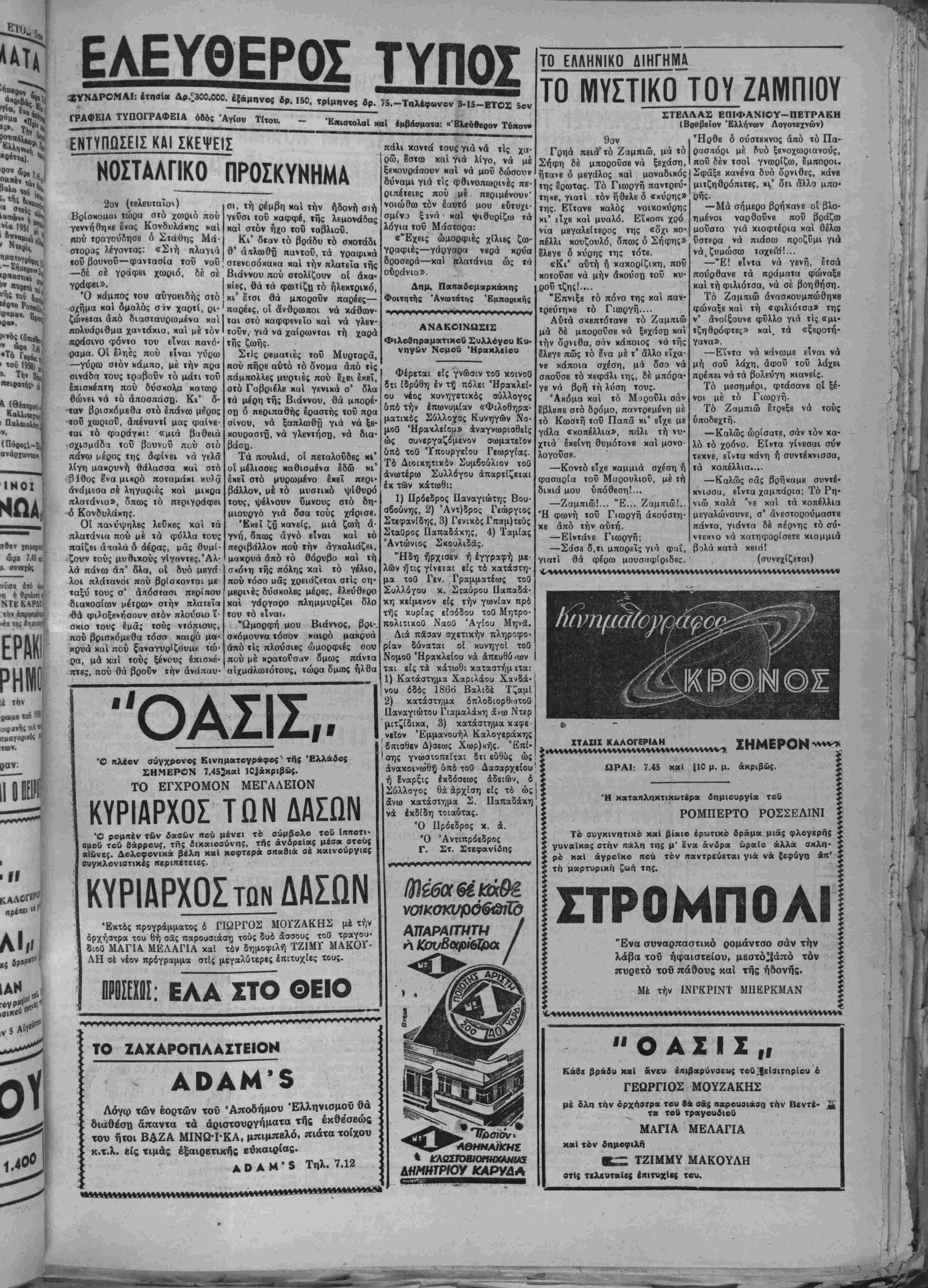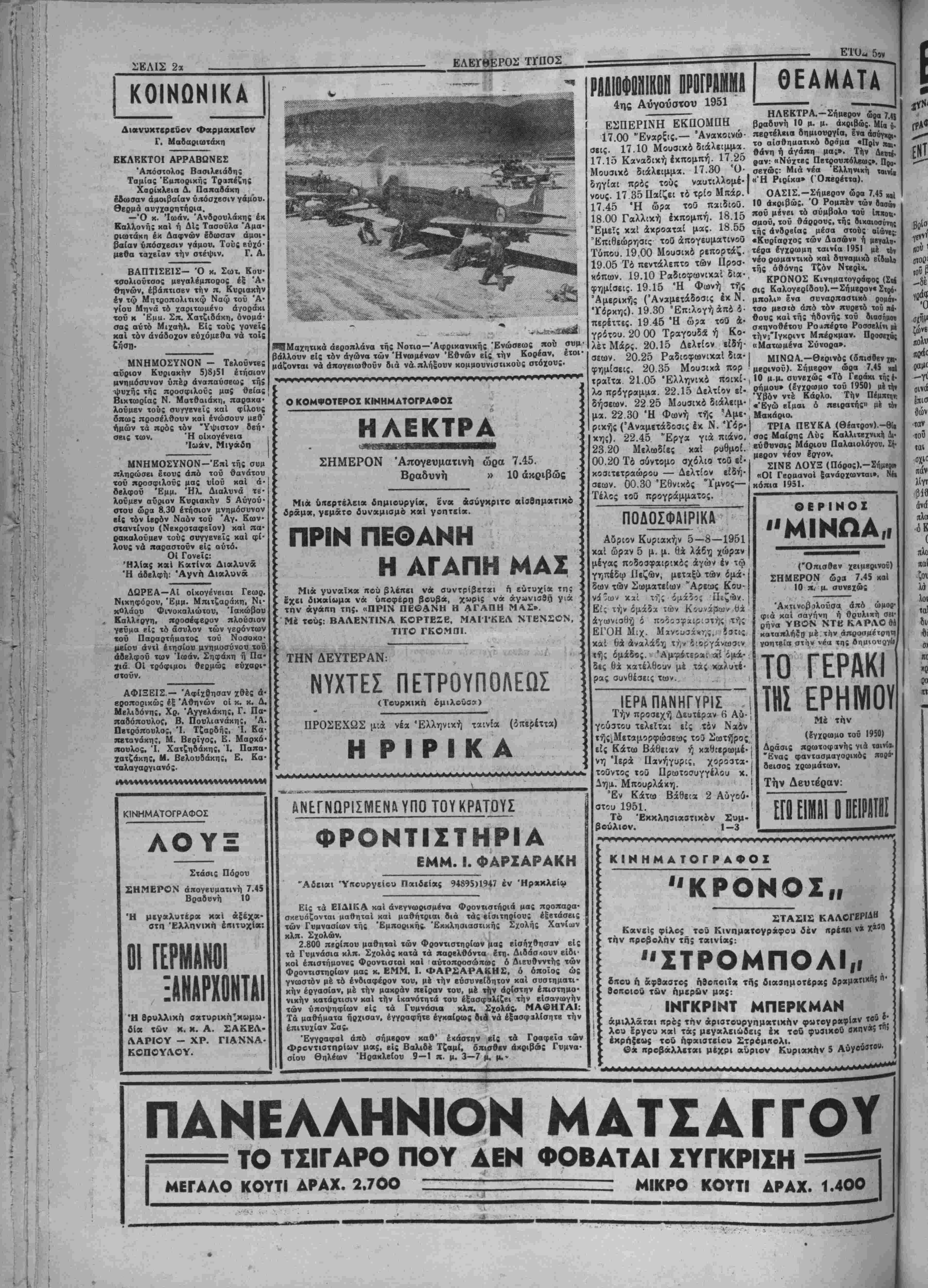 ω, εχοντας Λο,σοίι Λ Χαν©νικα1 «δβιοιι ». ήτβι εν» μήν<* πρβ των έχλο- δοθβϊσαι βΐς υπαλλήλβυς καί ■ γών οομφωνω^ τω σταπίτου, κατά την περίοδον τής κατοχί)ς. 'Η έκδίκαοις τής υποθέσεως ανεβλήθη. ΑΣΚΗΣΙΣ ΠΡΑΓΜΑΤΙΚΟΝ ΑΝΑΚΟΙΝΩΣΙΣ Γνωσΐοποιεΐται διι άπο 6— 10 τρέχ. μηνός θέλουσιν Ι«ελβ- σθή άσκήσεις μετά πραγμα1·* κων πυρών είς την περιοχήν «Κακοΰ Όρον.». Πάσα χυκλο- φορία ϊδιωτών έντός τής πβοιο- χής άπαγορΕύβΐαι απολύτως. Ή περιοχή θά εχτ] ΙπισημανθΉ δν' §ρυθρών σημαιών. Ό Διοικητής της μονάδος ΠΟΤΕ ΑΡΧΙΖΟΥΝ^ ΤΑ ΜΑΘΗΜΑΤΑ ΕΙΣ ΤΑ ΣΧΟΛΕΙΑ ΑΘΗΝΑΙ 4.— Δι' απόψε¬ ως τοΰ ύπουργοϋ τής Πιηδβίαί. αι εγγραςραί είς τα σχολβΐα της στοιχειώδους Ικπαιδεύσϊω; αί- χονται την ΙΟίΐν Σεπτεμβρίου, «ά δέ μαθηματα την 21ην ίδίσν- Είς την Μέσην εκπαίδευσιν αί εγγραφαί άρχονται την 10η» Σβπτεμβρίου καί τα την 1*ιν Όκτοοβρίονι.