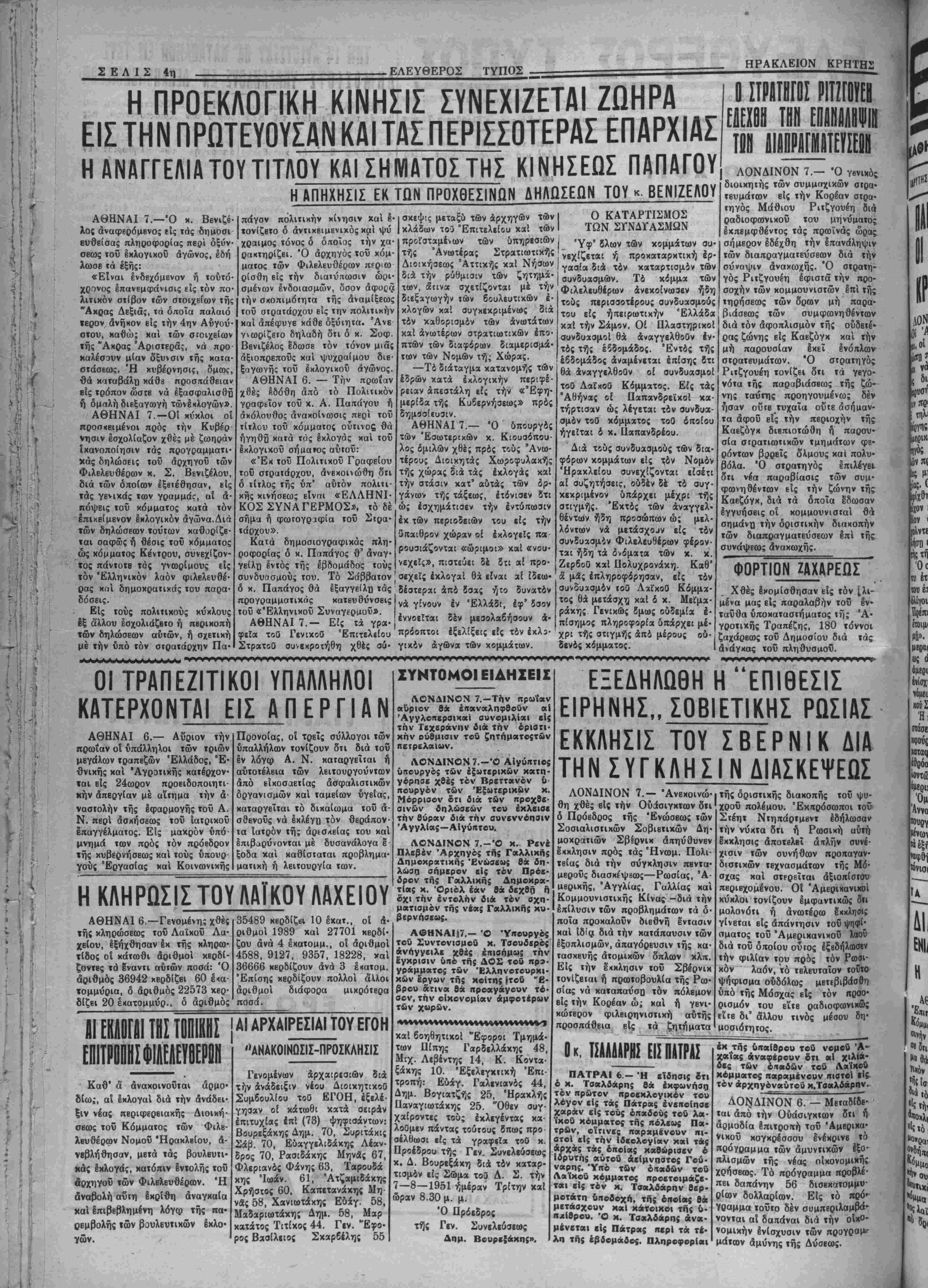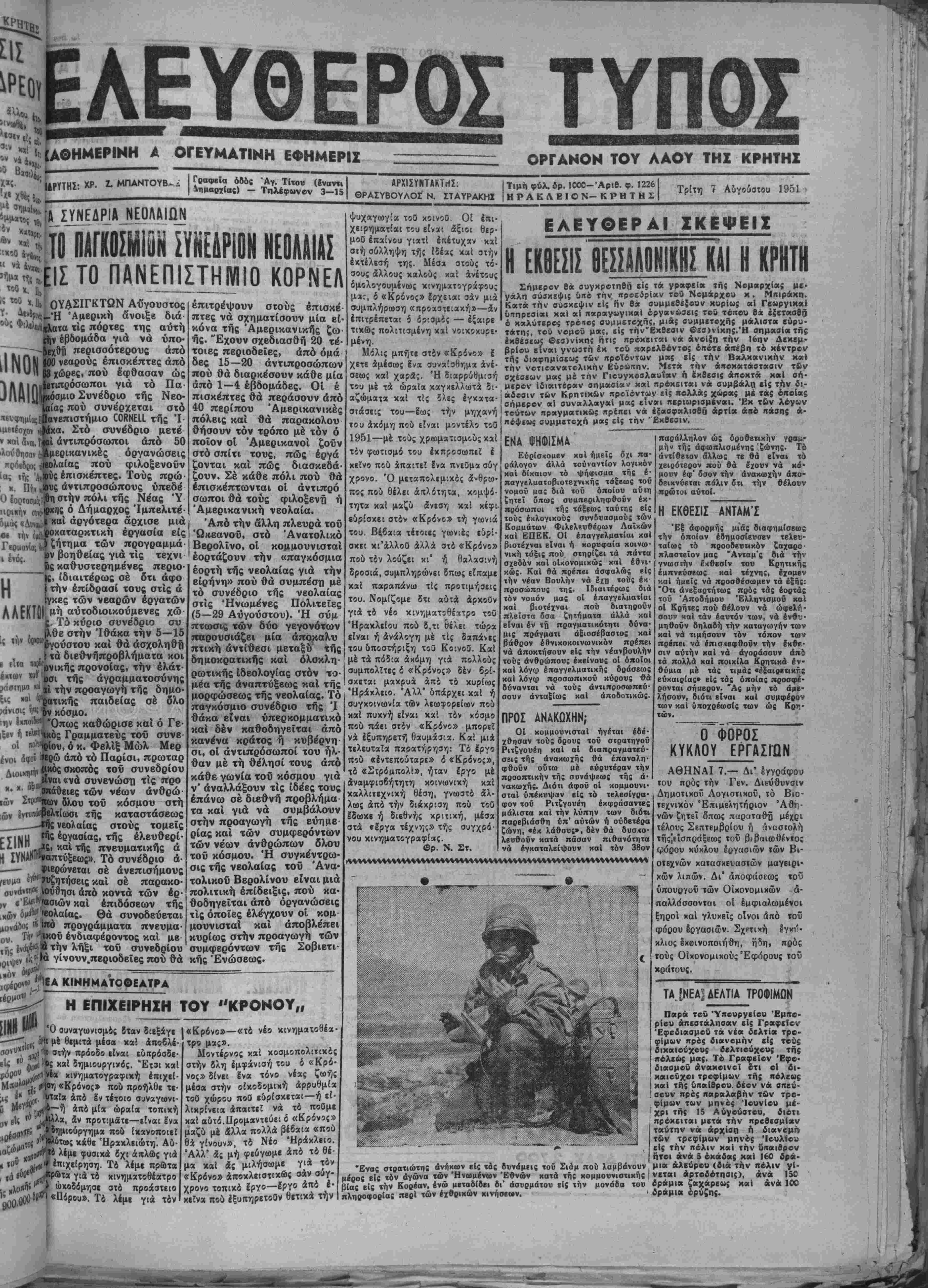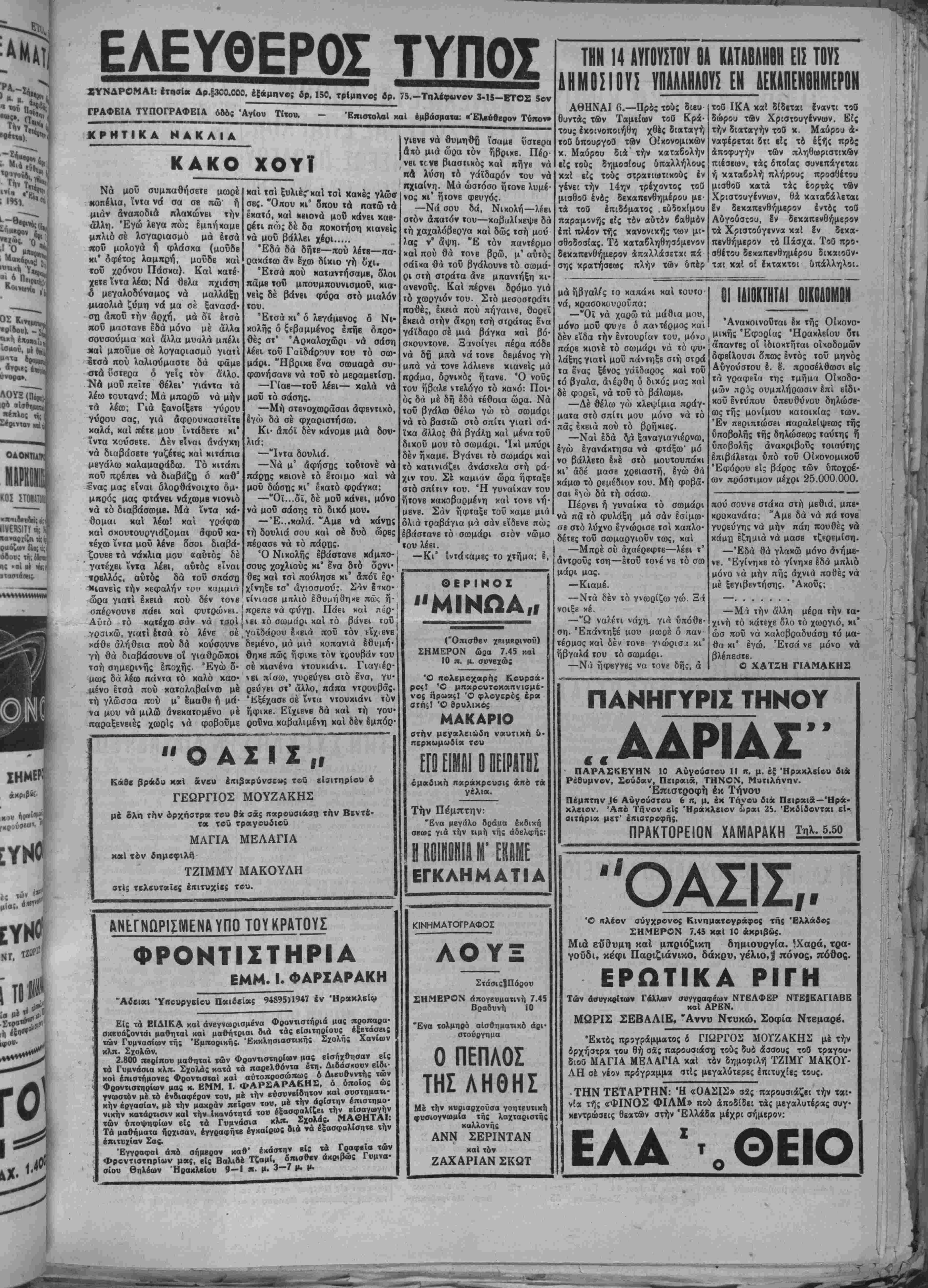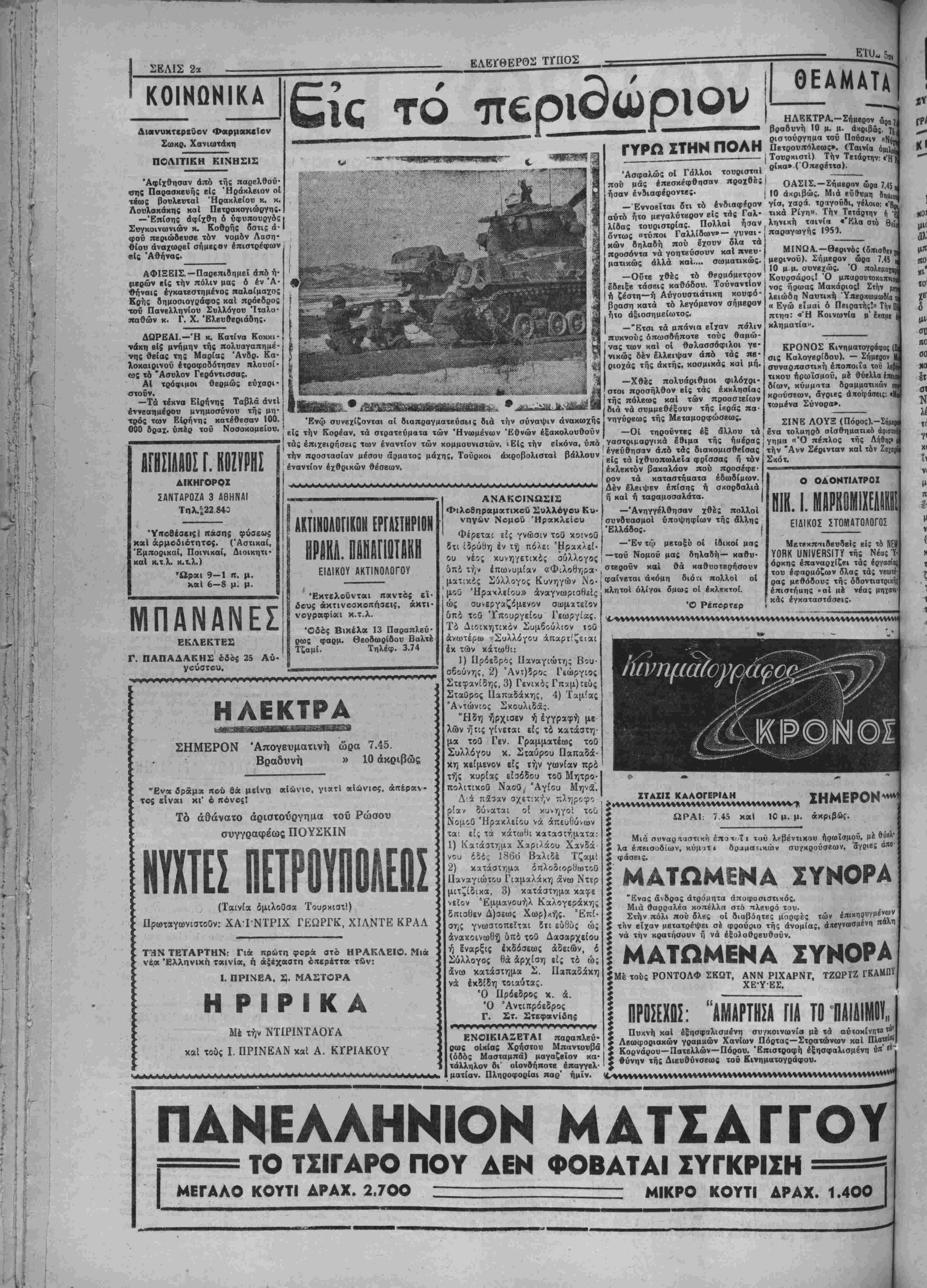ουν<*νΐη»ί.νονθησι άπό κοντά των έρ· ,ν «Έ*ΐ*ίασιών καί έπιδόσβων τής ικών όμιΡΐβολαίας. Θά συνοδβύεται * ά Ι'!)Λ0 προγράμματα πνβυμα ου. Τή* ^Κκοΰ ένδιαφέροντος καί μβ »ήί ,οιψίν ι χον έπιτρέψουν στούς έπισκβ πτβς νά σχηματίσουν μία εί- κόνα τής Άμερικανικής ζω ής. "Εχουν σχβδιασθή 20 τέ- τοιες περιοδεΐβς, άπό όμά δβς 15—20 αντιπρόσωπον πού θά διαρκέσουν κάθε μία άπό 1-4 έβδομάδβς. Οί έ πισκέπτβς θά περάσουν άπό 40 περίπου Άμερικανικές πόλεις καί θά παρακολου θήσουν τόν τρόπο μέ τόν ό ποίον οί 'Αμερικανοί ζοΰν στό σπίτι τους, πώς έργά ζονται καί πώς διασκβδά· ζουν. Σέ κάθβ πόλι πού θά επισκέπτωνται οί άντιπρό σωποι θά τούς φιλοξενη ή Άμερικανική νεολαία. Άπό την αλλη πλευρά τοΰ Ώκεανοϋ, στό Άνατολικό Ββρολΐνο, οί κομμουνισταί έορτάζουν την «παγκόσμια έορτή τής νεολαίας νιά την ειρήνη» πού θά συμπέση μέ τό συνέδριο τής νεολαίας στίς Ήνωμένες Πολιτεΐες (5—29 Αύγοΰστου). Ή συμ πτωσις των δύο γεγονότων παρουσιάζει μία άποκαλυ πτική άντίθβσι μεταξύ τής δημοκρατικής καί όλοκλη- ρωτικής ίδεολογίας στόν το· μέα τής άναπτύξβως καί τής μορφώσεως τής νεολαίας. Τό παγκόσμιο συνέδριο τής Ί θάκα είναι ύπερκομματικό καί δέν καθοδηγεΐται άπό κανένα κράτος ή κυβέρνη σι, οί άντιπρόσωποι τού ηλ· θαν μέ τή θέλησί τους άπό κάθε γωνία τοΰ κόσμου γιά ν' άναλλάξουν τίς ίδεες τους επάνω σέ διεθνή προβλήμα ψυχαγωγία τοθ κοινοθ ΟΕ επι¬ χειρηματίαι τού είναι αξιοί θερ· μοθ έπαίνου γιατί Ιπέτυχαν καί σιή σύλληψη τής ίδέας καί στήν εκτελέση της. Μέσα στούς τί- σους άλλους καλούς χαί ανέτους ίμολογουμένως χινηματογράφους μας, δ «Κρόνος» ϊρχειαι σάν μιά συμπληρώση «προχστειακή»—5ν έπιτρέπεται δ ίρισμός — εξαιρε λέ ΕΑΕΥΟΕΡΑΙ ΣΚΕΨΕΙΣ Η ΕΚΘΕΣΙΣ ΘΕΣΣΑΛΟΝΙΚΗΣ ΚΑΙ Η ΚΡΗΤΗ Σήμερον θά συγκρβτηθη ■!$ τα γραφϊϊα τής Νομαρχίας με· γάλη σύακεψις ΰηό την προείρίαν τού Νομάρχου κ. Μτνιράκη. Κατά την σύσκεψιν είς ην θά συμμεθέ{ουν κυρίω; αί Γεωργικαΐ υπηρεσίαι καί αί παραγωγικαΐ όργανωσει; τοθ τόπου θά έ$ετκσθ5 • έ καλύτερο; τράτος συμμετοχήν μιάς αυμμετοχής μάλιστα εΰρυ- τικως πολιτισμενη καί νοικοκυρε- τάτη;, τού νβμοΰ μ«ς, είς τήν'Εκβεσιν @εσ)ν(κης.Ή σημασίατής εκθέβεως ©£σ)νίκης ήτις κροκειται νά ανοίξη την Ιέην Δεκβμ- βρίον» είναι γνωοτη έκ τοϋ παρίλθοντος όπότβ άπέβπ τό κέντρον τής διαφημίσεως των προϊόντων μας εί; την Βαλκανικήν καί την νοτιοανχτολικήν Ευρώπην. Μίτά την αποκατάστασιν των σεως καί χαρδ;. Ή διαρρύθμΐαή σχέσεων μας μέ την Γιουγκοσλαυία^ ή έχθεσις άποκτά καΐ σή· τού μέ τα ώραία καγχελλωτά δ;· μβρβν ίδιαιτέραν σημασίαν παί πρόκειται νά συμβάλη είς την δι- αζωματα καί τίς ίλες στάσεις τού—£ω; την ς μένη. Μόλις μπήτε ατδν «Κρόνο» | χετε άμέσως Ινα συναίσθημα άνέ τα καί γιά νά στήν προαγωγή ί μ συμβάλου τής εΰημε ό ρίας καϊ των συμφερόντω των νέων άνθρώπων δλοτ τοΰ κόσμου. Ή συγκέντρω σις τής νεολαίας τοΰ Άνα· τολικοΰ Βερολίνου είναι μιά πολιτική έπίδβιξις, πού κα· θοδηγεΐται άπό όργανώσεις τίς οποίες έλέγχουν οί κομ μουνισταί καί αποβλέπει κυρίως στήν προαγωγή των συνεδρίου συμφερόντων τής Σοβιβτι- γίνουν,,περιοδβίβς πού θά κης "Ενώσεως. «μ,*ΊΕΑ ΚΙΝΗΜΑΤΟΘΕΑΤΡΑ Η ΕΠΙΧΕΙΡΗΣΗ ΤΟΥ "ΚΡΟΝΟΥ,, Ό ουναγωνισμός δταν διεξάγε Ι «Κρόνο»—«το νέο κινημακοθέα μέ θεμιτά μίσα χαί άποδλέ- σΐήν πρόοδο είναι εύηρόσδε καί δημιουργικός. Έτοι καί κινηματογραφιχή έπιχεί «Κρόνος» πού προήλθε τε1 ?ν τέτοιο ουναγωνι μία ώραία τοπική . άν προτιμδτε—είναι Ινα ϊημιούργημα πού ίχανοποιεΐ ΐ ,ί#* λ*1« φυσιχά ίχ