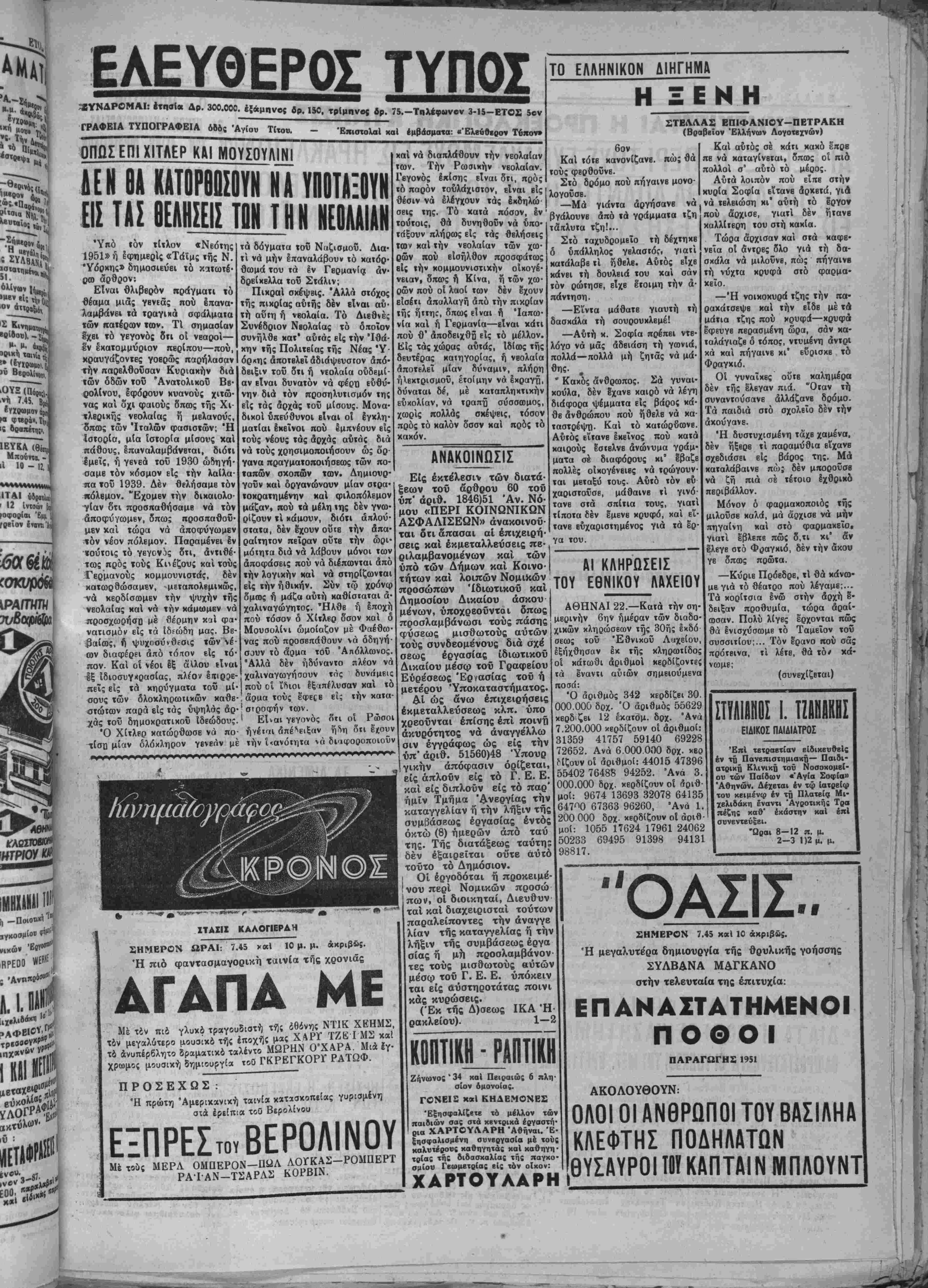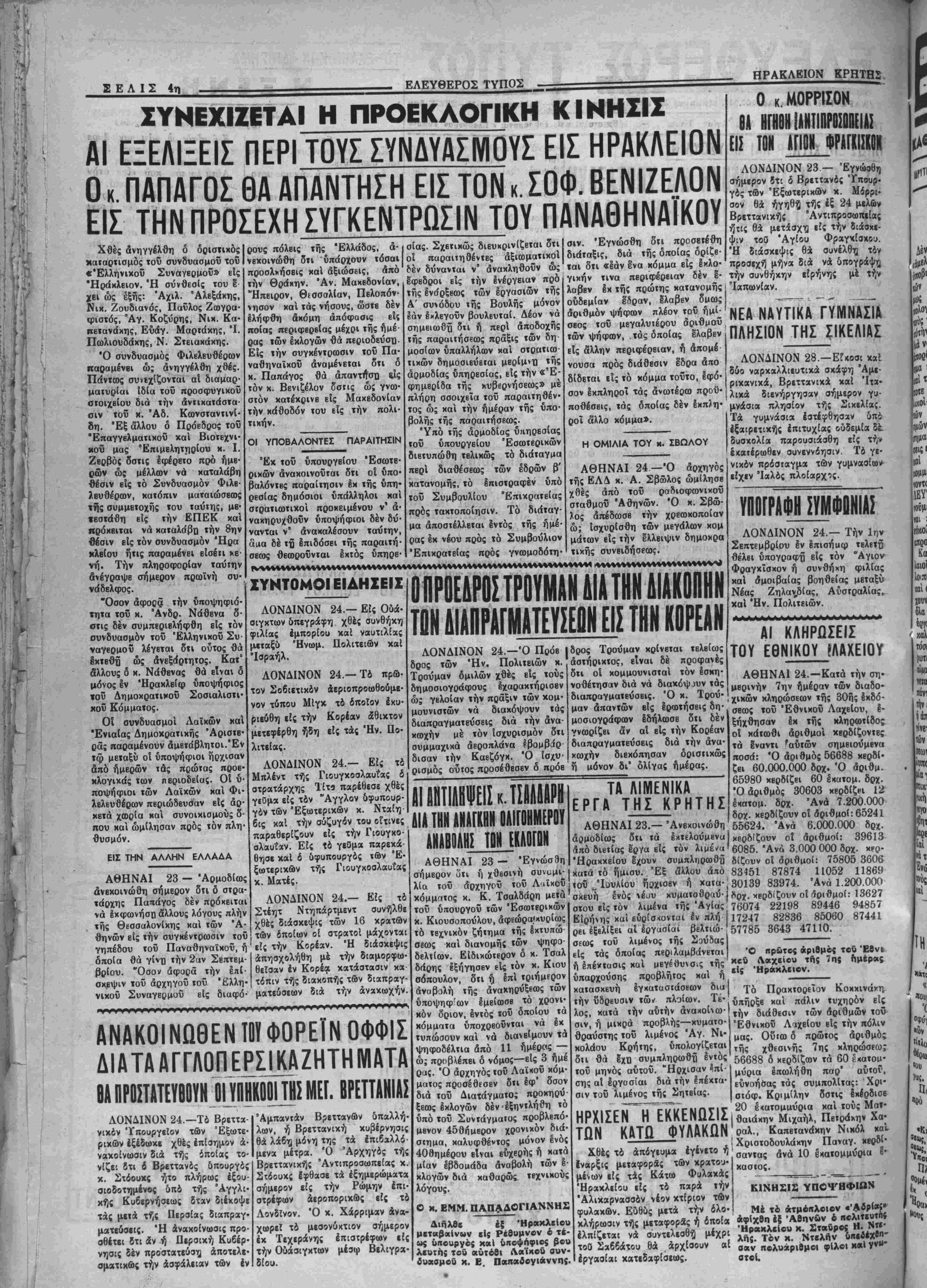 λία τοΰ αρχηγόν τοΰ Λ<»ΐχοϋ | <οϋ "Ιουλίου ήρχισεν ή χατα·| 30139 κόμμ<ΐτος κ. Κ. Τσαλδάρη μετά τοΰ νπουργοΰ των Έσωτεριχών κ. Κιουσοπούλου, άφεώρα'χυοίως τό τεχνικόν ζήτημα τής Ιχτυπώ σεως χαί διανομής των ψηφο δελτίων. Είδιχώτερον δ κ. Τσαλ δάρης εξήγησεν είς τόν χ. Κιου σόπουλον, ότι ή επί τριήμΕρον άναβολή τής άναχηρύξεως των ύτιοψηφ'ων έμείωσε τό χρονι¬ κόν όριον, έντός τοΰ δποίον τα κόμματα ύποχρεοΰνται νά έχ^ τνπώσουν καί νά διανείμουν χά ψηφοδέλτια άπό 11 ήμέρος — ώ; προβλέπει δ νόμος—είς 3 {μέ ρας. Ό άρχηγός τοΰ Λαϊχοΰ χόμ- ματος προσέθεσεν διι έφ' δσον διά τοΰ Διατάγματο; προχηρύ- ξεως Ιχλογών δένΊξηντλήθη τό ΰίτό τοΰ Συντάγμαίος προβλεπό¬ μενον 45θήμερον χρονικόν διά- σιημα, καλυφθέντος μόνον ενός 22198 89446 82836 85060 3643 47110. 94857 87441 υηνΐΓΓΐΤΐΤ ΗΡΧΙ2.-Ν Π ΤΩΝ ΚΑΤΩ ΦΥΛΑΚίΙΝ Χθές τό άπόγευμα εγένετο ή έναρξις μεταφοράν των κρατού¬ μενοι είς τάς Κάτω Φυλακάς "Ηρακλείου είς τό παρά την Άλικαρνασσόν νέον χτίριον των φυλακών. Ευθύς μετά την δλο· κλήρωσιν τής μεταφορδς ή δποία έλπίζεται νά συντελεσθή μ.έχρι τοθ Σαββάτου θά άρχίσουν αί εργασίαι κατεδχφίσεως. Ό πρώτος &ριθμθ( τοΰ "Είν» Λαχβίου της 7η; ημέρας ■Ις Ηράκλειον. Τό Πρακτορείον Κοκκινάνη ι υπήρξε χαί πάλιν τυχήρον είς ' την διάθεσιν των αριθμών τοΰ Έθνιχοϋ Λαχείου είς την πόλιν μας. Οΰιω δ πρώτος άριθμό; τής χθεσινής 7ης κληρώσεως 56688 δ κερδΐζων τα 60 έκατομ· μύρια Ιπωλήθη παρ' αύτοι1, εΰνοήσας τάς συμπολίτας: Χοι- στόφ. Κριμίλην δστις εκέρδισε 20 έχατομμνρια χαί τούς Ματ- θαιάκην Μιχαήλ, Πετράχην Χά- ραλ., Καπετανάχην Νικόλ χαΐ Χριστοδουλάχην Παναγ, κερδί- σαντας άνά 10 Ικατομμύρια έ¬ καστος. ΚΙΝΗΣΙΣ; ΥΠΟΨΗΦΙΟΝ Μέ τβ άτμέκλοιον «Άδρ1«ί» άφίχθπ έ{ Αθηνών 6 σαν πβλυάριθμοΐ φίλβι κ*· ΥνΜ* στβί.